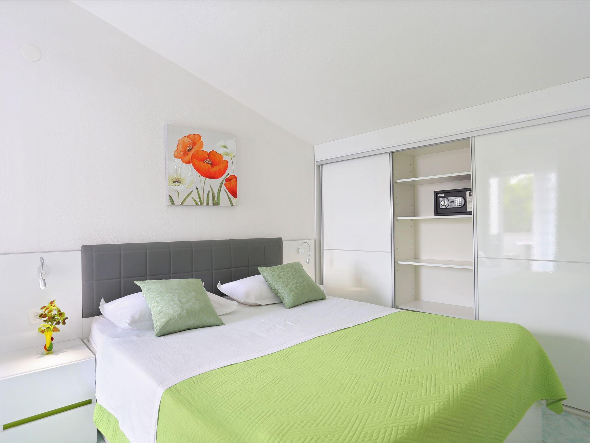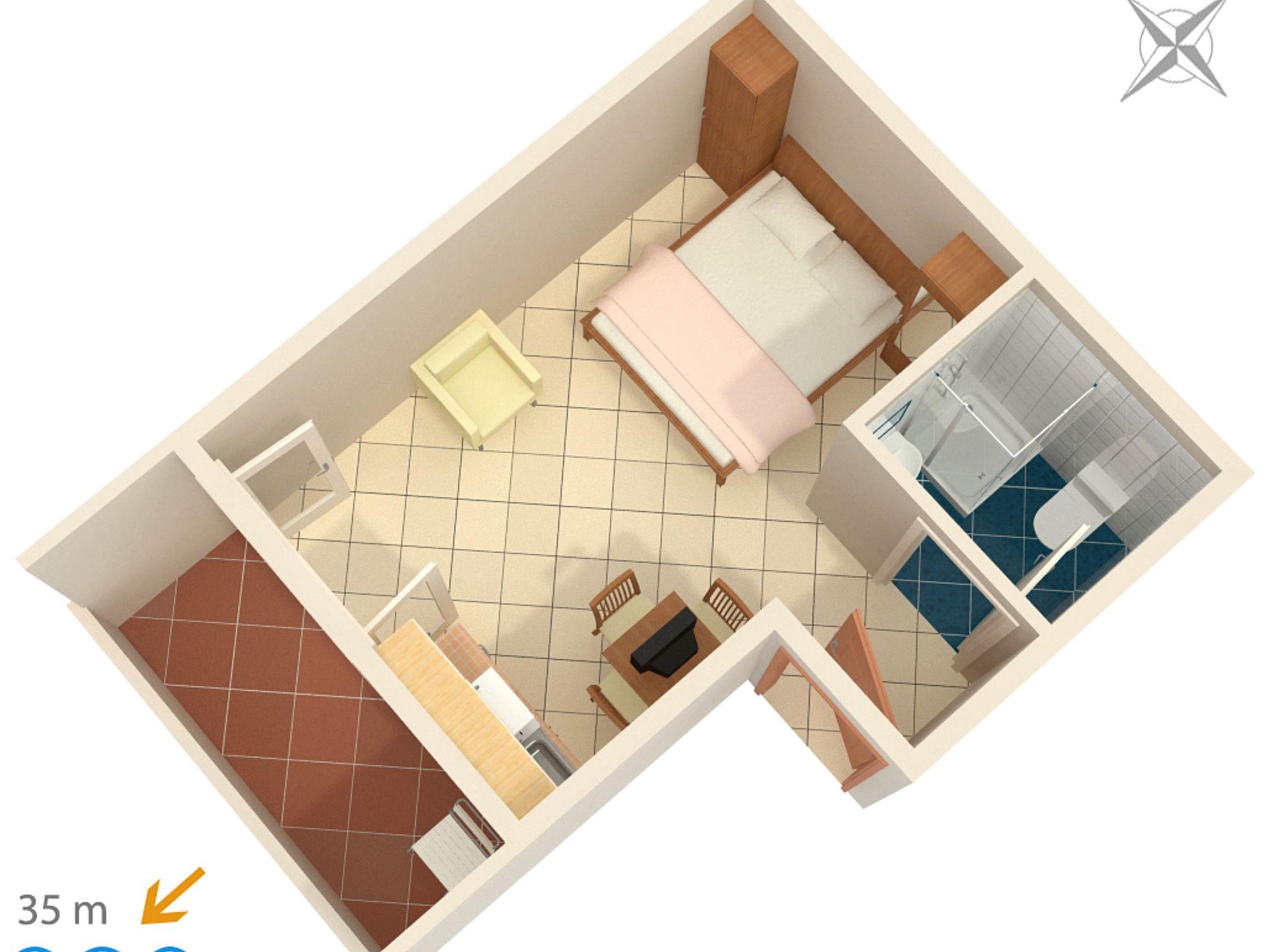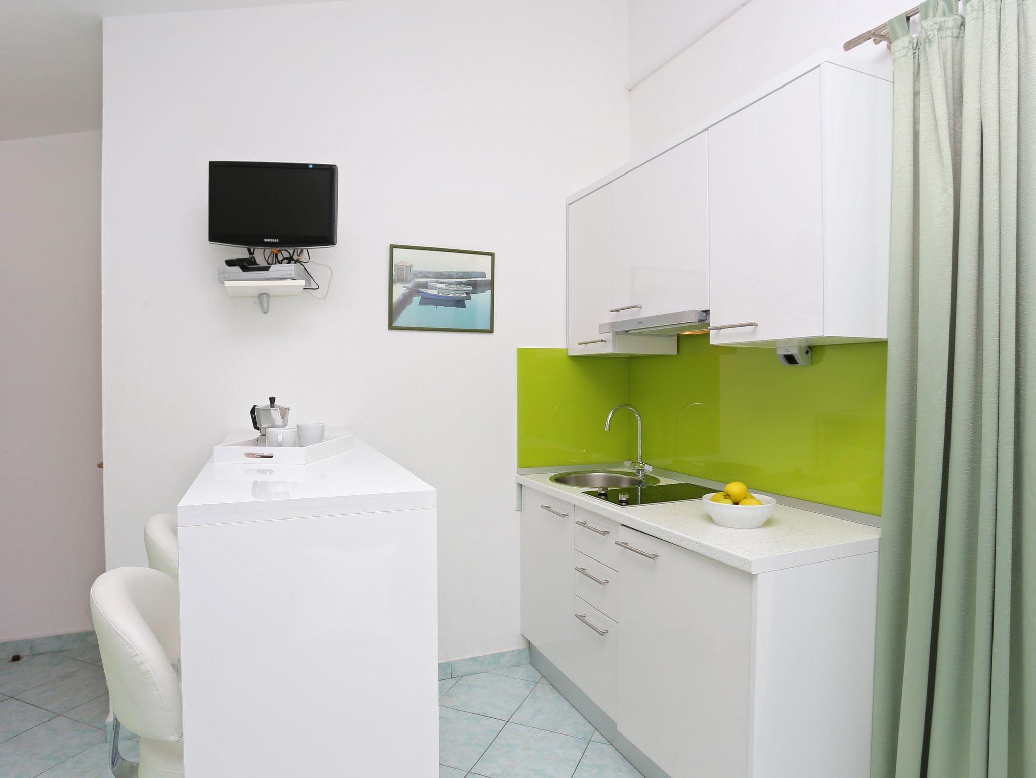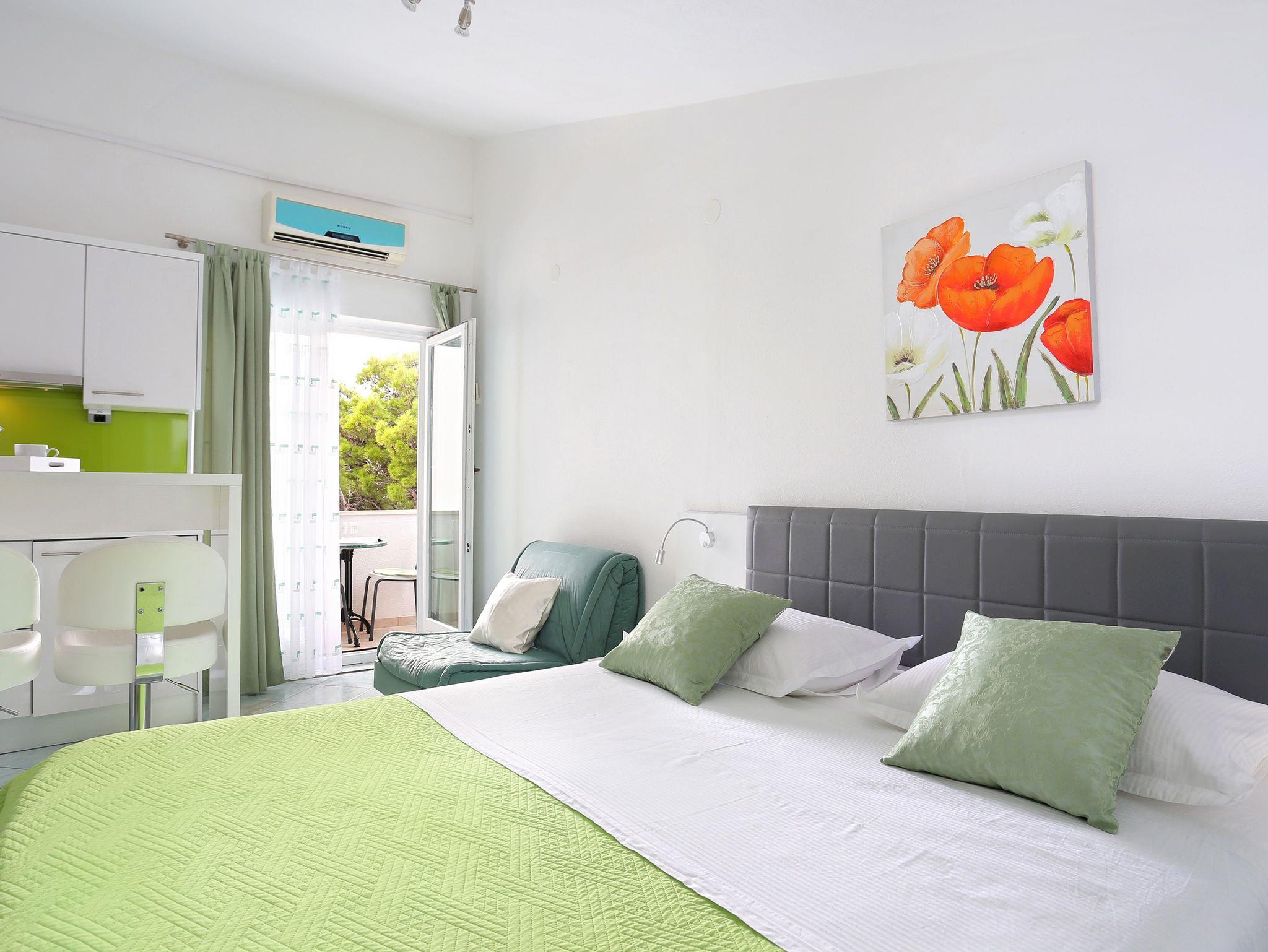 Studio bietet Platz für 3 Gäste. Die Betten sind in Schlafzimmern, die es 1 gibt, innerhalb einer Gesamtfläche von 17m2, angeordnet. Die Gäste haben einen eigenen Balkon zur Verfügung, auf der sie in warmen Sommernächten genießen können. Das Studio-Apartment bietet Meerblick. Es ist erlaubt, Speisen auf dem Gemeinschafts-Grill vorzubereiten. IM PREIS INBEGRIFFEN: Kurtaxe, Endreinigung, Parkplatz, Internet, Kinderbett, Bügeleisen, Bügelbrett, Föhn, Sonnenschirm. VERBINDLICHE ZUSÄTZLICHE KOSTEN: Aufzahlung für Kurzaufenthalte (prozentualer Zuschlag pro Nächtigungsanzahl: 30% - 1, 20% - 2, 10% - 3). UNVERBINDLICHE ZUSÄTZLICHE KOSTEN: Klimatisierung (0,50 € pro Stunde), Wäschewaschen (5,00 € Waschen). Die Verfügbarkeit zusätzlicher Dienstleistungen in Ihrem reservierten Termin und die Preise derselben (falls nicht aufgeführt) müssen im Voraus überprüft werden. Zusätzliche Dienstleistungen die in der Zahlungsaufforderung nicht aufgeführt sind werden direkt beim Vermieter bezahlt, angenommen der Gast nutzt auch diese. Ermäßigung auf den Grundpreis: Gratistag 28=25 (bei einem Aufenthalt von 28 oder mehr Tagen erhalten Sie 3 kostenlose Tage für den Aufenthalt bis 31.12.26).