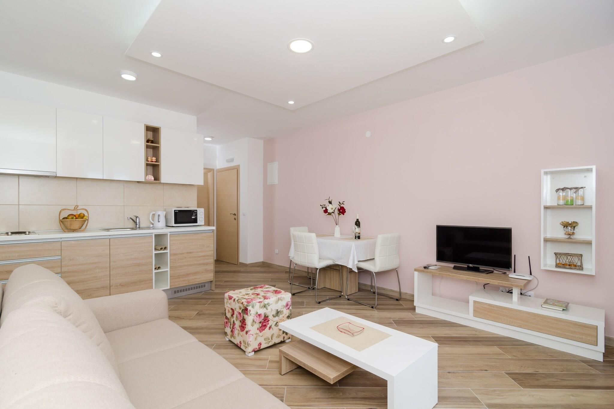 Apartments Marmo er beliggende i Mlini, et roligt lille sted i Dubrovnik-regionen, kun 20 minutters kørsel fra Dubrovniks gamle bydel. Ejendommen tilbyder fire enheder med aircondition, gratis WiFi og rummelige balkoner med betagende udsigt over Adriaterhavet. Denne moderne lejlighed med 1 soveværelse kan komfortabelt rumme op til fire personer. Den har WiFi, aircondition og fladskærms-kabel-tv. Køkkenet er fuldt udstyret og kommer med spiseplads kombineret med stue. Badeværelset har en brusekabine og en hårtørrer.Møbleret balkon med en betagende udsigt over Adriaterhavet er til gæsternes rådighed.Barneseng er tilgængelig efter anmodning.Det nærmeste busstoppested ligger 350 meter fra ejendommen.Denne beliggenhed er perfekt for gæster, som elsker at nyde solen og havet, være tæt på Dubrovnik, men langt nok til at undgå folkemængderne og bevare deres fred og privatliv. Lejligheden ligger kun 15 minutters gang fra den nærmeste strand. Forskellige restauranter, barer og butikker kan findes på strandpromenaden, ideel for dem, der nyder naturen og lange gåture. Købmand og bageri kan nås inden for 500 meters rækkevidde. Den gamle bydel i Cavtat ligger 15 minutters kørsel derfra.Dubrovnik Lufthavn ligger 16 km derfra, mens busstationen og færgehavnen, der forbinder fastlandet med forskellige dalmatiske øer, ligger 12 km derfra.