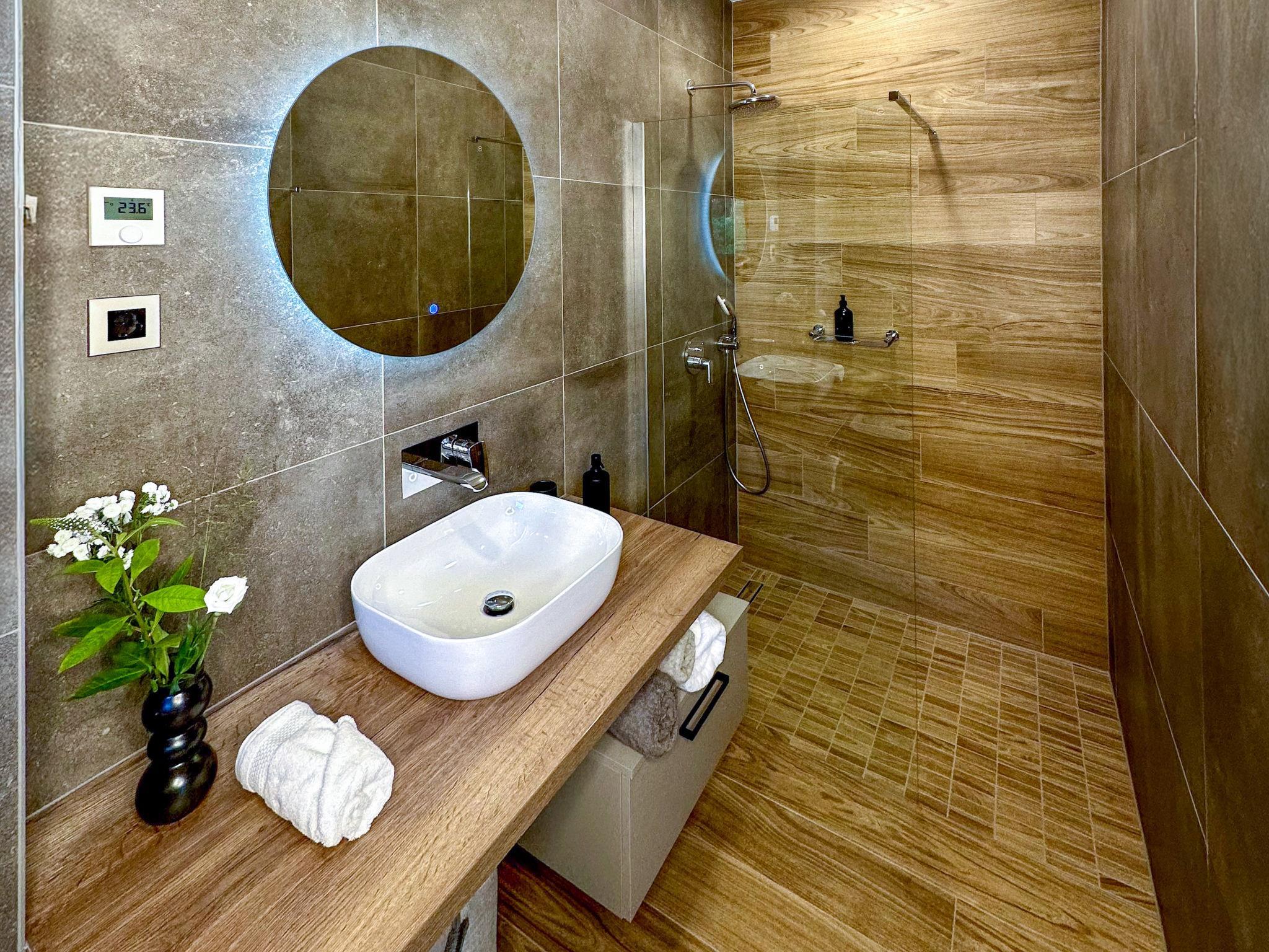5-room villa 190 m2 on 2 levels, south facing position. Beautiful and modern furnishings: living/dining room 50 m2 with panoramic window with satellite TV. Exit to the terrace, to the swimming pool. Luggage room. Open kitchen (oven, dishwasher, 2 induction hot plates, kettle, microwave, freezer). Sep. WC. Upper floor: 3 rooms, each room with 1 french bed (180 cm, length 200 cm), shower/WC. Exit to the balcony. 1 room with 1 french bed (180 cm, length 200 cm), shower/WC and satellite TV. Exit to the balcony. Floor heating. Balcony 26 m2, terrace 50 m2. Terrace furniture, balcony furniture, electric barbecue, deck chairs (5), covered balcony. Beautiful panoramic view of the resort. Facilities: safe, hair dryer. Internet (WiFi, free). Please note: non-smoking house. Smoke alarm, fire extinguisher.
