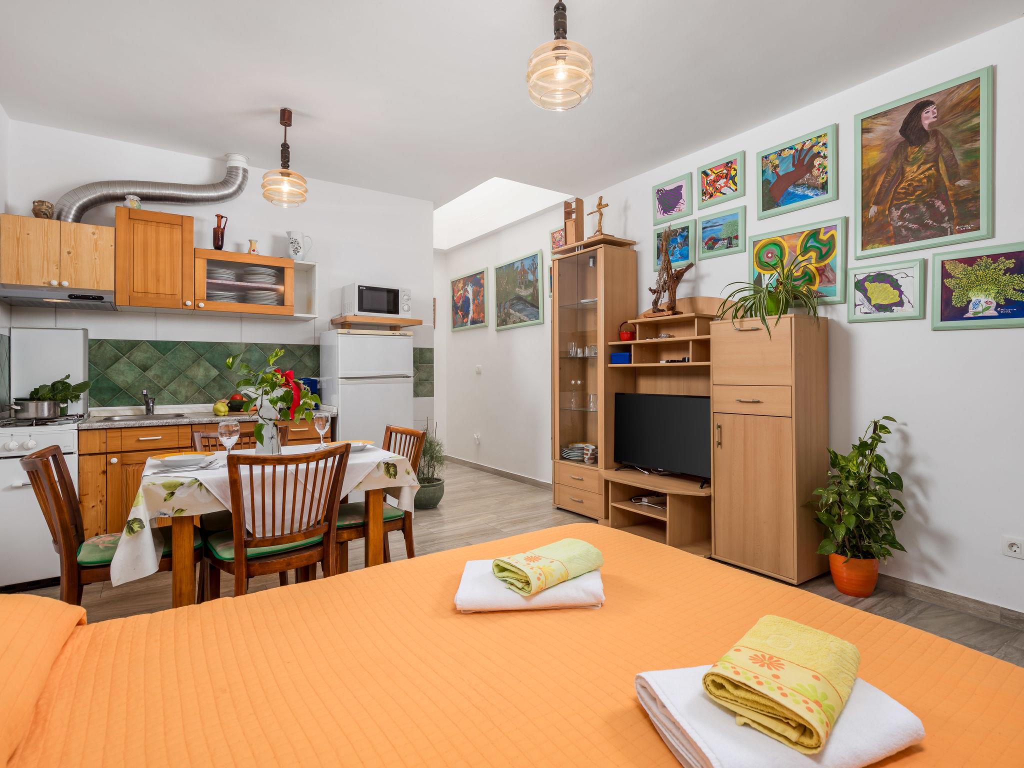 "Sandalj", 1-room apartment 25 m2 on 1st floor. Studio with 1 french bed (160 cm), dining table, satellite TV and air conditioning. Exit to the terrace. Open kitchen (2 gas rings, microwave, electric coffee machine). Bath/WC. Terrace 20 m2 partly roofed. Terrace furniture. Facilities: Internet (WiFi, free). Please note: non-smokers only. Private entrance.
