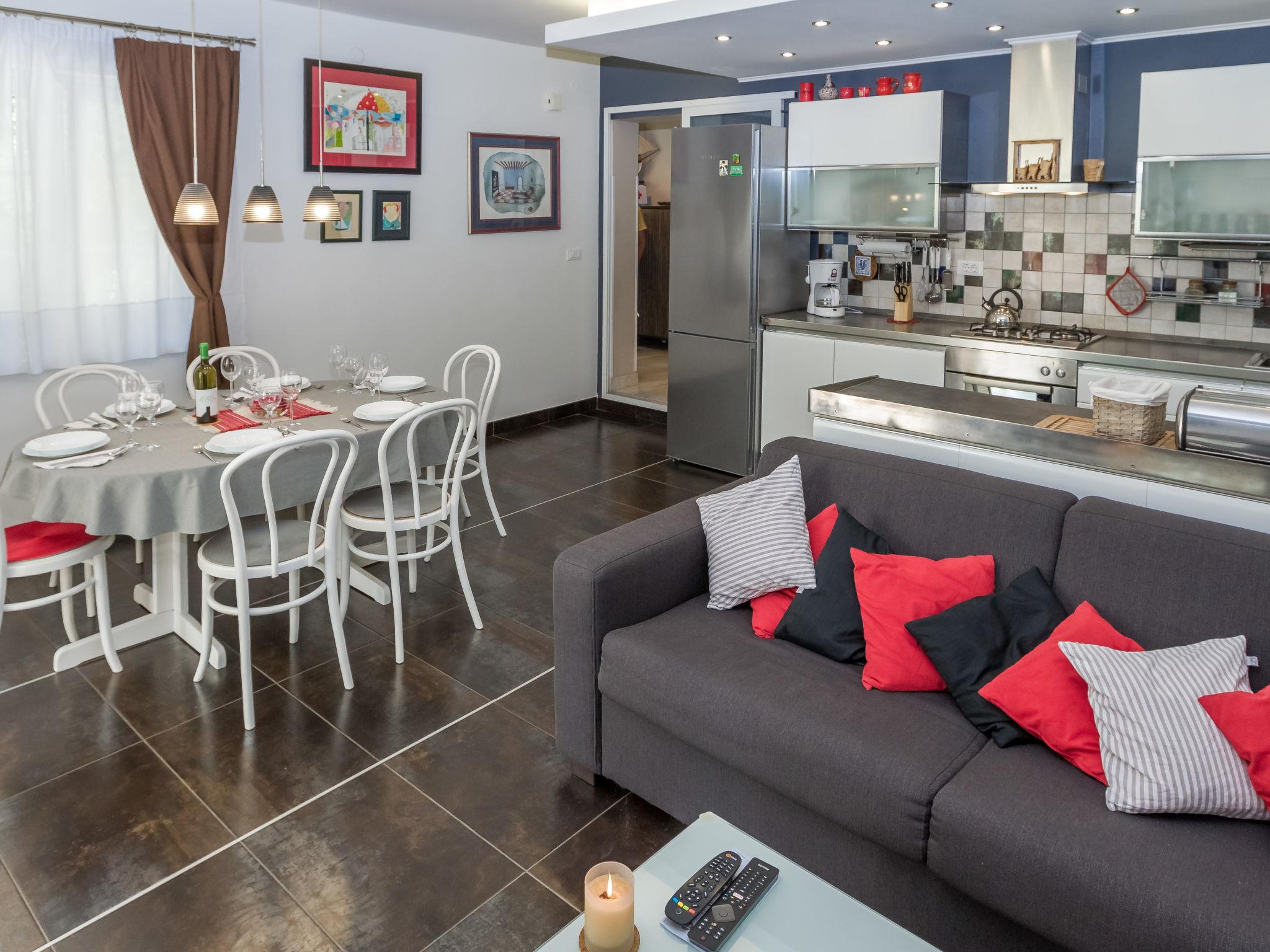 3-room house 80 m2, south-west facing position. Beautiful and cosy furnishings: living/dining room with 1 double sofabed, satellite TV and air conditioning. Exit to the terrace. 1 room with 1 double bed and shower/WC. 1 room with 2 beds and shower/WC. Open kitchen (4 hot plates, oven, dishwasher, freezer, electric coffee machine). Air-conditioning (extra). Terrace 30 m2, roofed. Terrace furniture, deck chairs. View of the sea. Facilities: baby cot. Internet (WiFi, free).