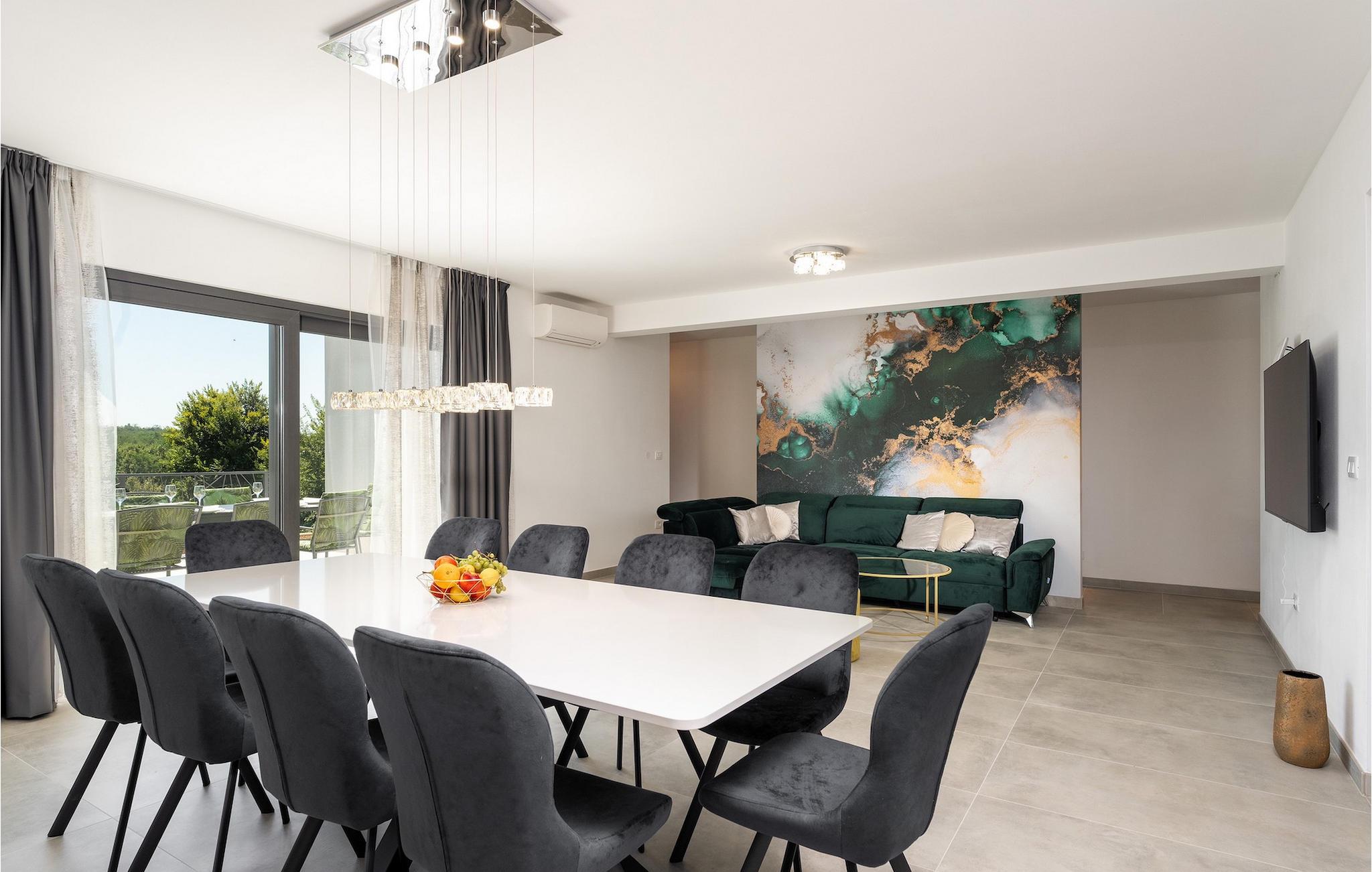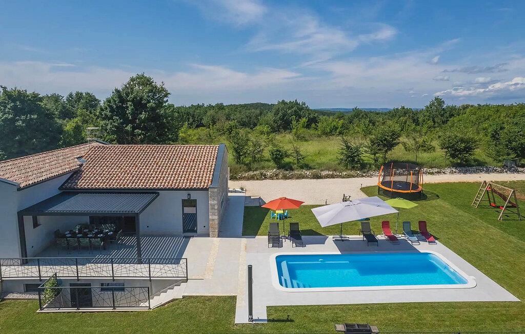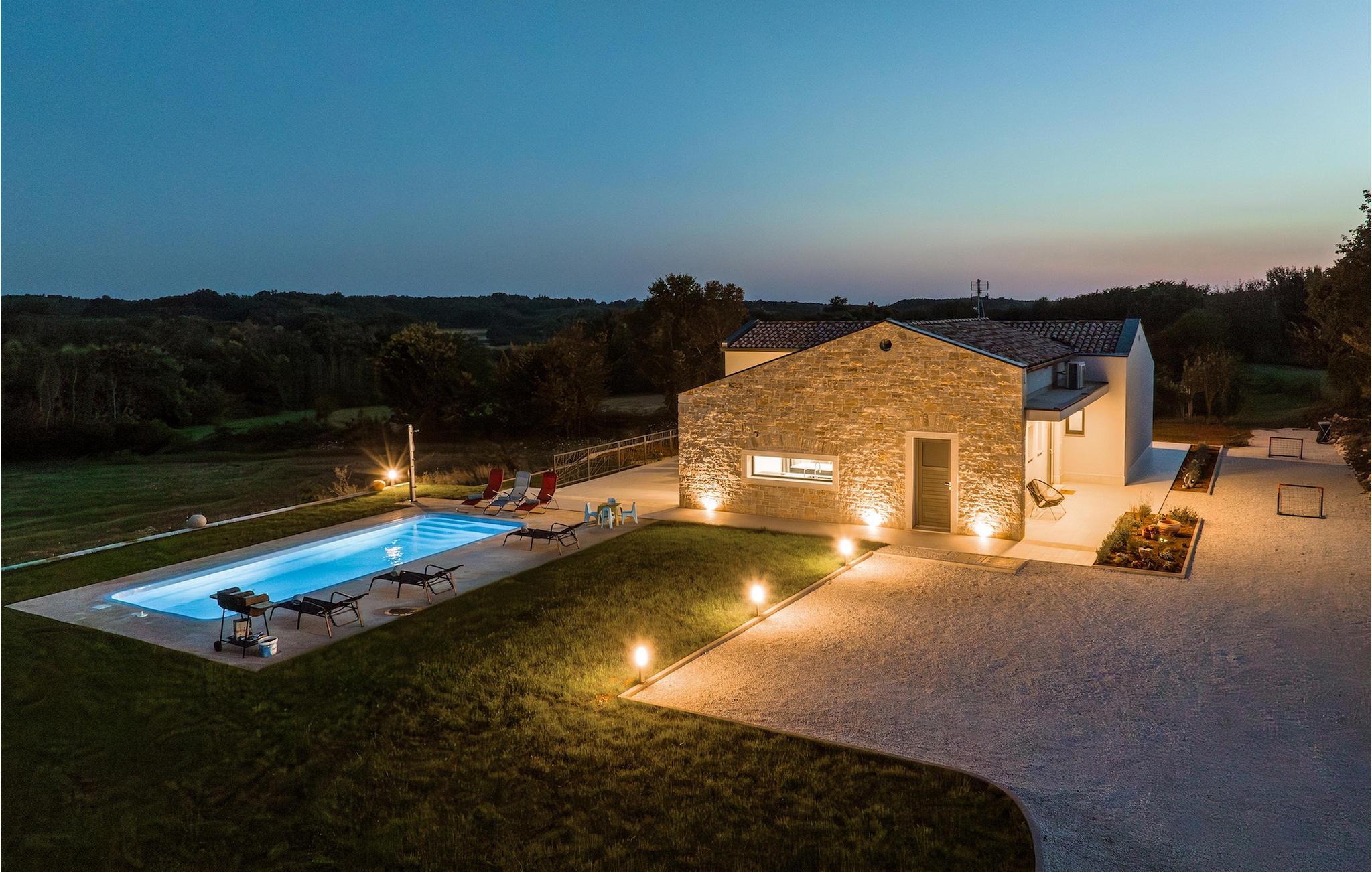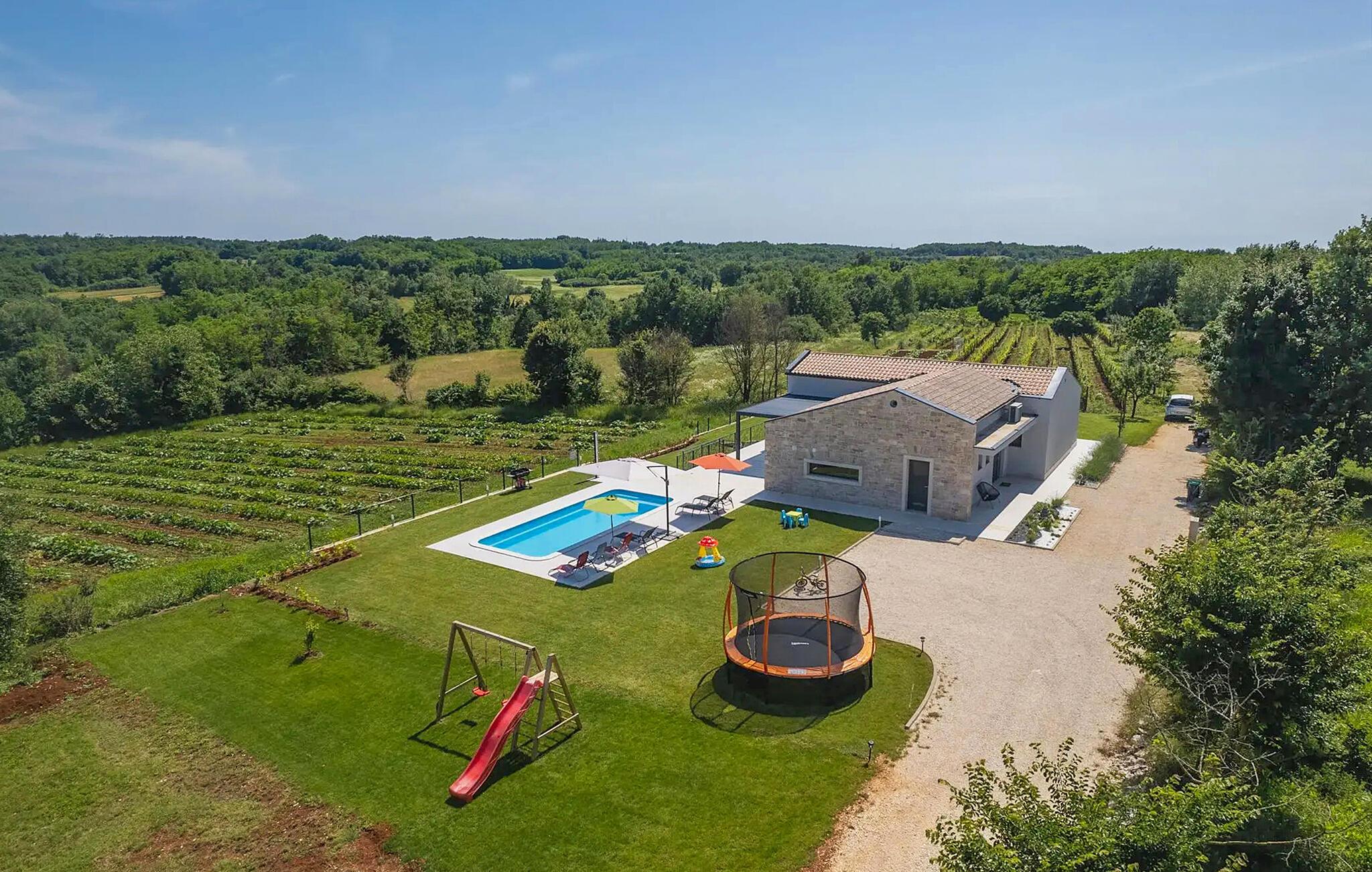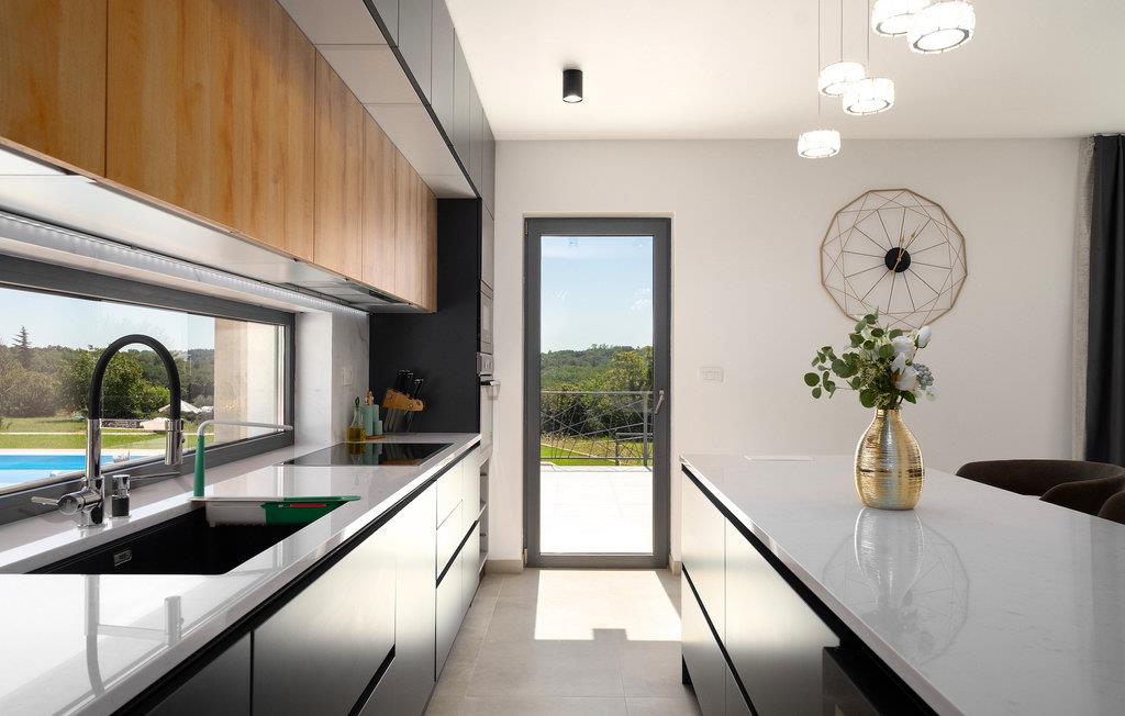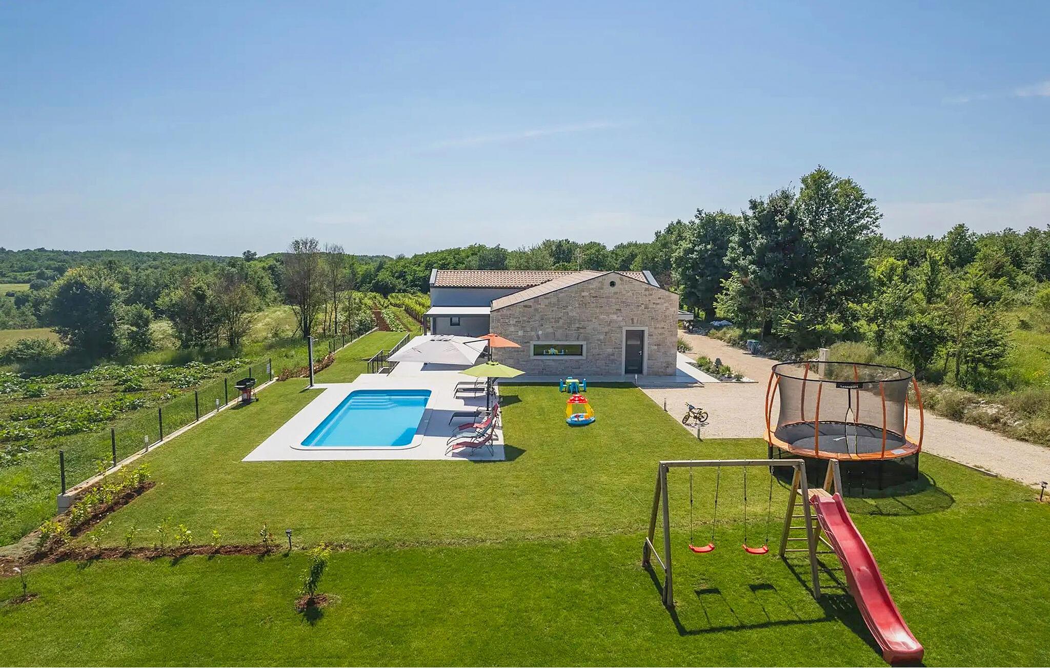 Villa Levak er den perfekte villa til en flugt fra byens stress og jag til landlige omgivelser og en afslappende ferie med familie og venner. Villaens udendørsområde vil fortrylle dig med grønne områder og en vidunderlig swimmingpool med liggestole, perfekt til afslapning og forfriskning i varmen. Villaen tilbyder også udendørs underholdning for alle aldre. Del op i hold og spil minifodbold, mens de yngste gæster vil blive glade for børnenes legeplads med gynger. Hvis du kan lide at udforske naturen på egen hånd, er der også en cykel i villaen, og du kan tage ud på de omkringliggende cykelstier. Benyt tilbuddet af indenlandske produkter fra OPG Šegala og tilbered specialiteter på grillen med dem til hele familien. Samles ved det udendørs spisebord og nyd smagen af det traditionelle istriske køkken beriget med økologisk dyrkede ingredienser. Dette smukke moderne en-etagers hus har 4 soveværelser, et fuldt udstyret køkken med en 10-sæders spisestue, en hyggelig stue og 3 badeværelser. Et soveværelse har tre senge, og de resterende tre værelser er udstyret med dobbeltsenge og aircondition. Nyd din morgenkaffe ved et charmerende udendørsbord med en smuk udsigt over det grønne og poolen. Hvis du sætter pris på den økologiske livsstil, afsondrethed og et landligt miljø, så genskab forbindelsen til naturen i denne villa i hjertet af Istrien. Slap af din sjæl og krop med dine kære under din ferie på Villa Levak. Villa Levak ligger i det centrale Istrien nær Pazin. Pazin er en by, der værner om en lang tradition og er Istriens turistcentrum. Byens centrale træk er middelalderfæstningen Pazinski Slot, som ligger over Pazin-grotten. Naturelskere vil bestemt ikke blive efterladt ligeglade af Pazinska jama. Opdag selv, hvorfor disse to attraktioner tjente som inspiration til adskillige litterære værker af Jules Verne, Vladimir Nazor og Dante. Udforsk dette landskab på pædagogiske vandrestier, og adrenalinjunkier kan forvente en zip-line. Gå ikke glip af at udforske det gastronomiske udbud af traditionelle istriske retter i hele det centrale Istrien, og tilbered de afprøvede specialiteter i villaen, hvor du kan få lokale landbrugsprodukter. Nyd de smukke strande på Istriens vestkyst og besøg turistcentre, der skiller sig ud for deres rige kulturelle arv, såsom Porec og Rovinj.