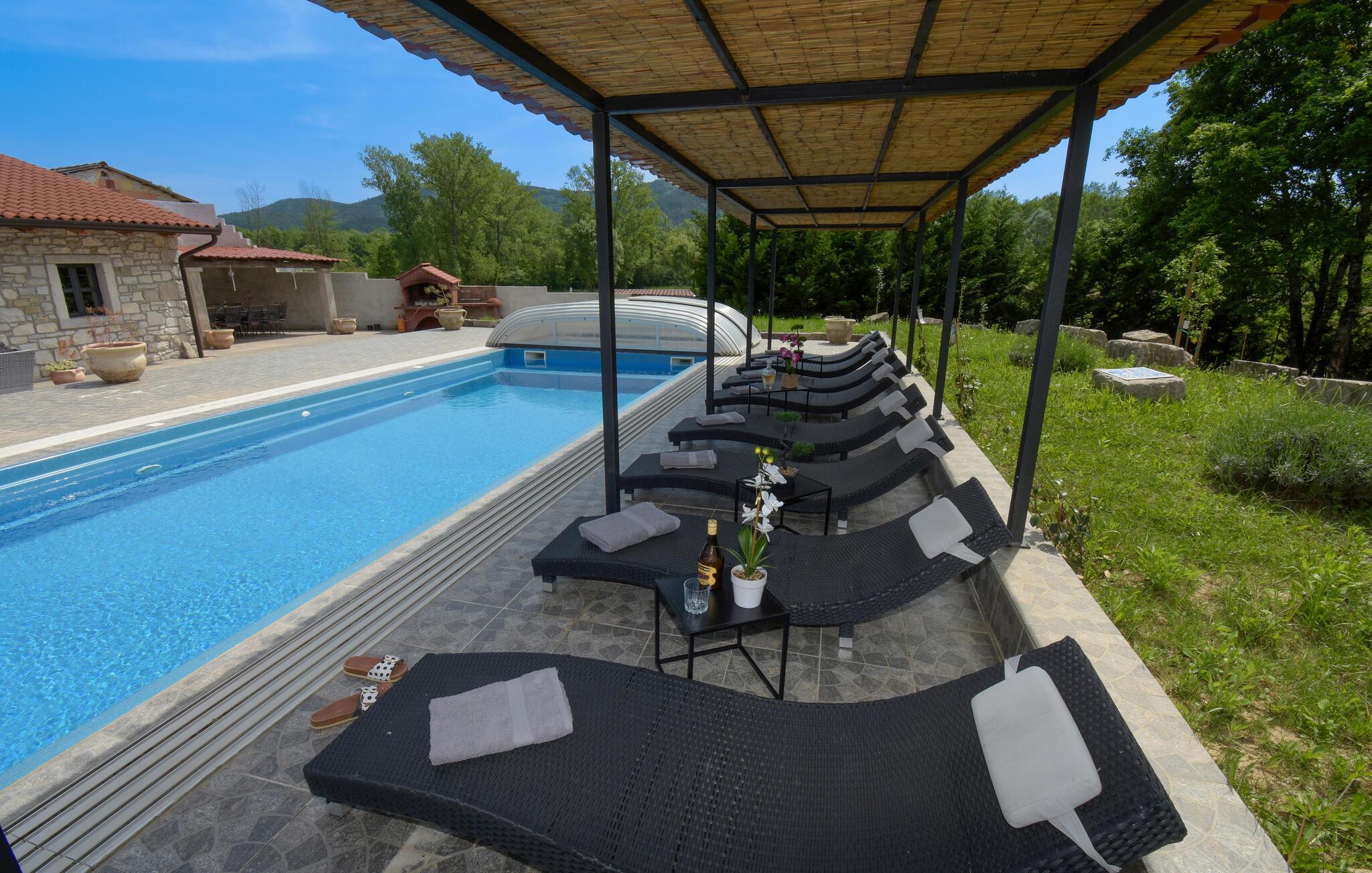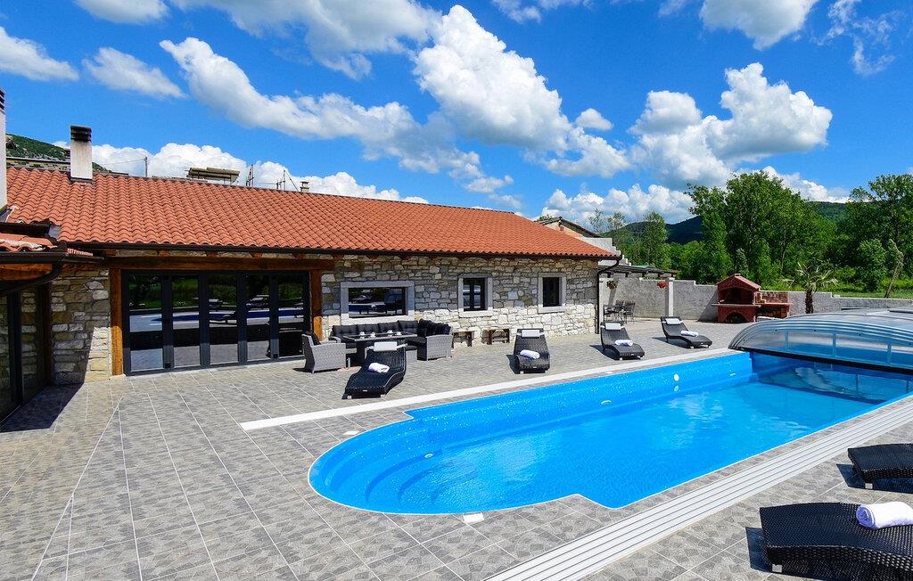 På den store ejendom er der en rummelig terrasse med privat pool, som kan overdækkes og opvarmes i de koldere måneder. Udenfor er der også et opholdsområde og en stengrill til din rådighed, men det særlige ved denne villa er selvfølgelig en stor have, hvor du kan nyde den betagende udsigt over eventyrnaturen.