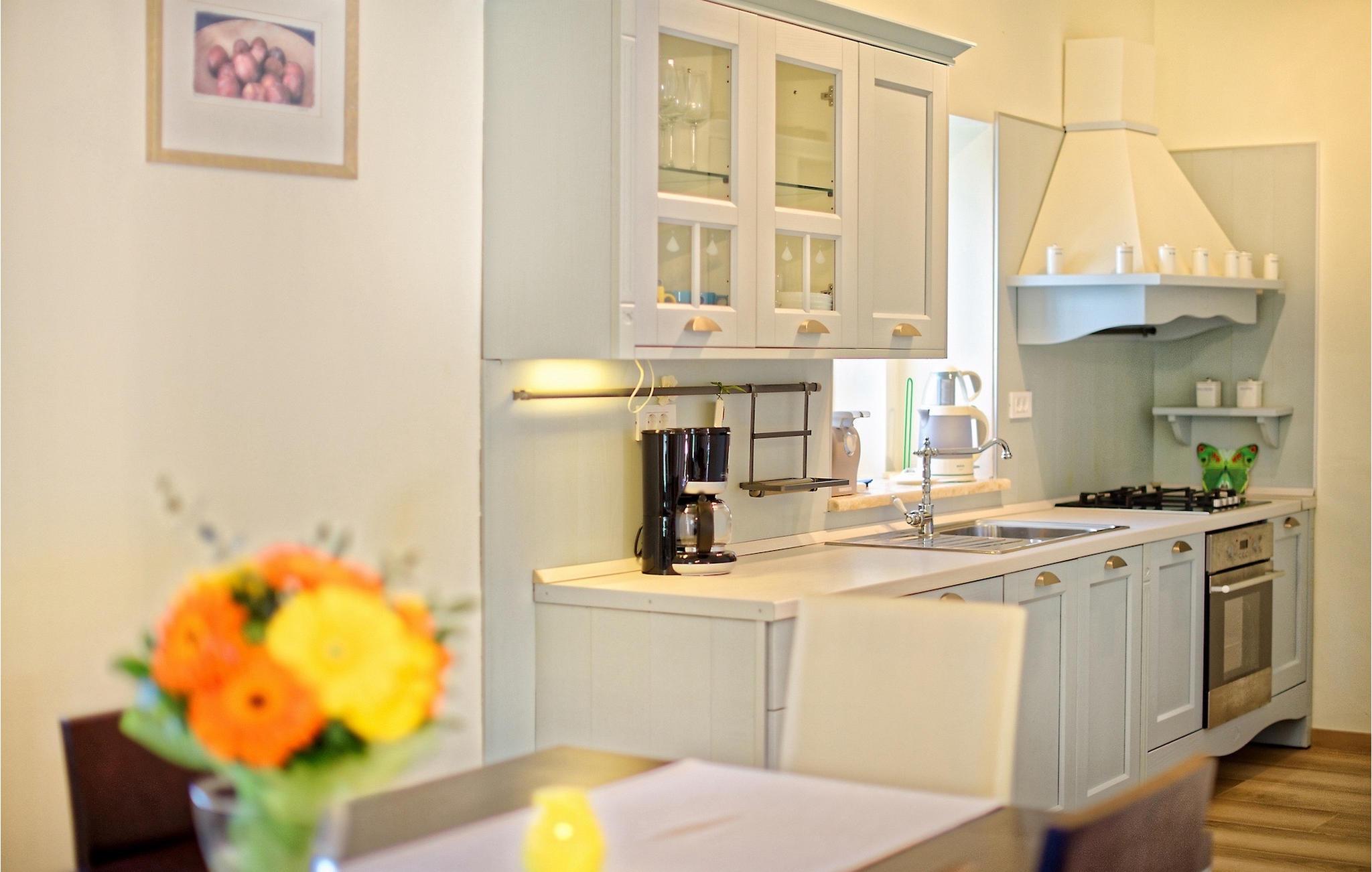 Im Erdgeschoss der Villa erwartet Sie ein gemütliches Wohnzimmer mit TV und Kamin, das zum Zurücklehnen und Entspannen einlädt. Daran schließt sich eine schöne, komplett ausgestattete Küche mit Essbereich an, in der Sie köstliche Mahlzeiten für Ihre Liebsten zubereiten und morgens eine Tasse Kaffee genießen können.