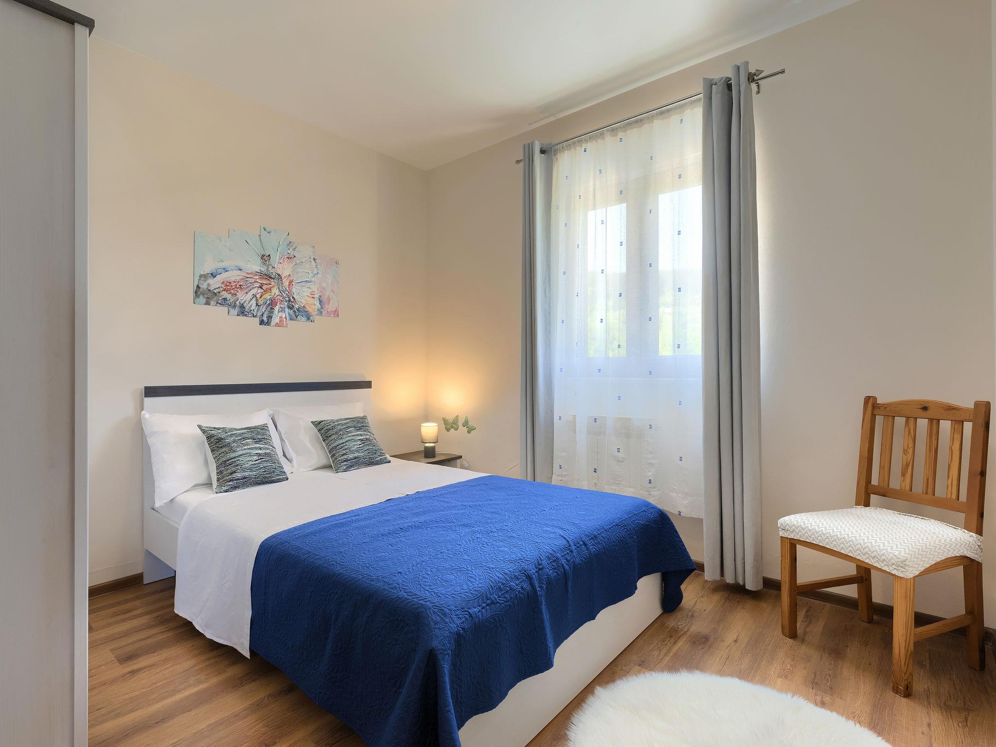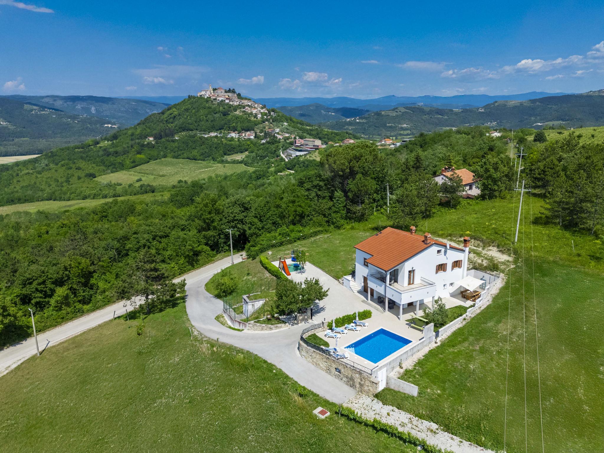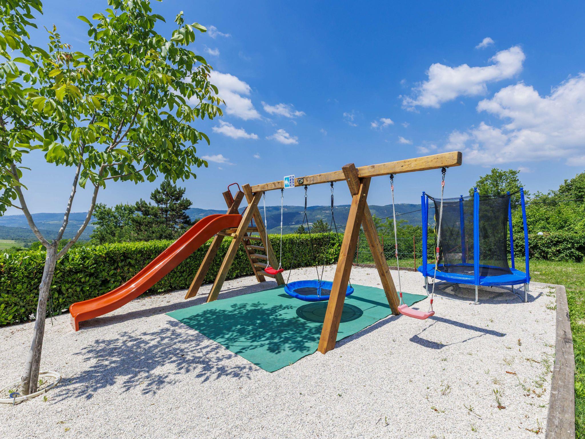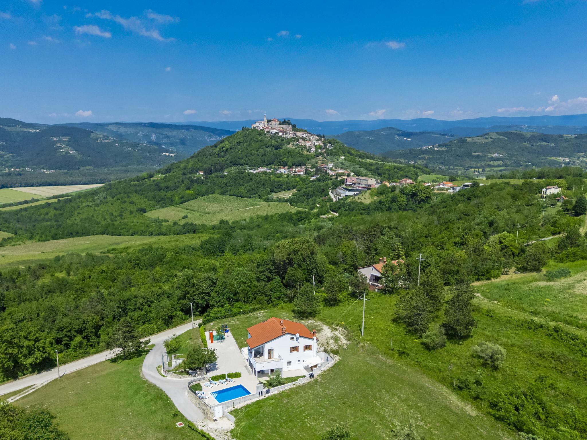 Single-family house "Montebello". In the hamlet Kranceti 2 km from the centre of Motovun, in a quiet, sunny position, 26 km from the sea. Private: property 1'000 m2, garden with lawn, swimming pool angular (7 x 4 m, 33 m2, depth 150 cm, seasonal availability: 01.May. - 30.Sep.) with internal staircase. Outdoor shower, terrace (20 m2), garden furniture, barbecue. In the house: internet access, washing machine. Parking (for 2 cars) at the house on the premises. Shop 2.5 km, restaurant 2.5 km, bus stop 1.1 km, pebble beach 26 km. Walking paths from the house 2.5 km, cycle lane 2.5 km. Nearby attractions: Aquapark 23 km. The owner does not accept any youth groups. Ground floor is closed and not occupied.