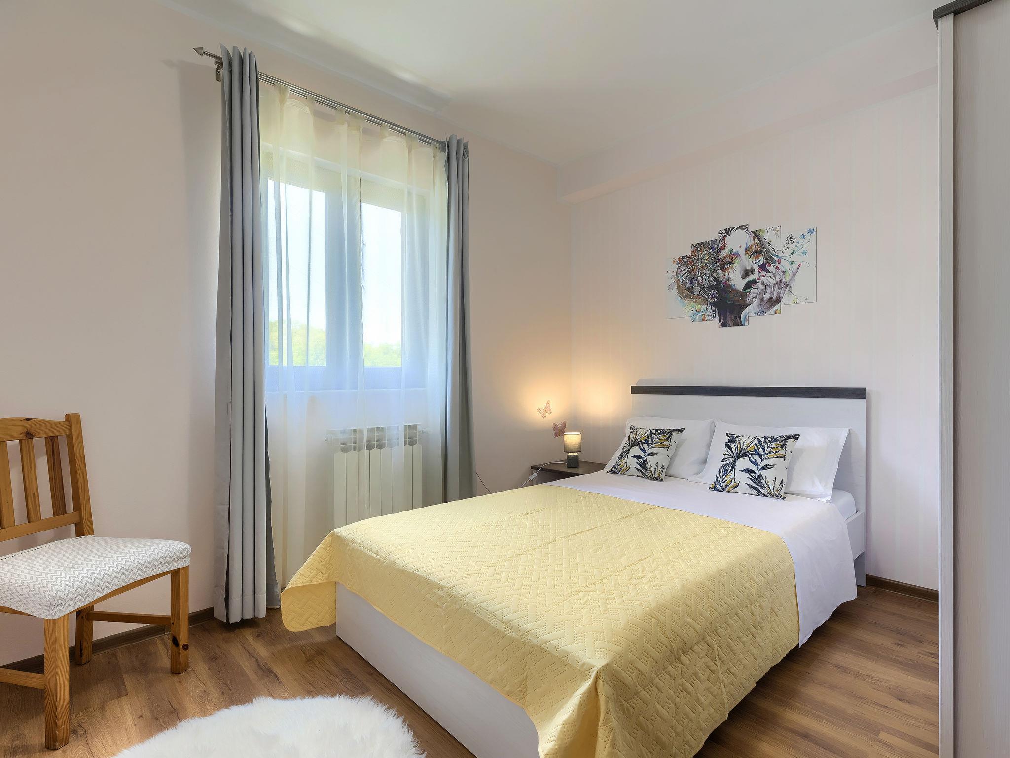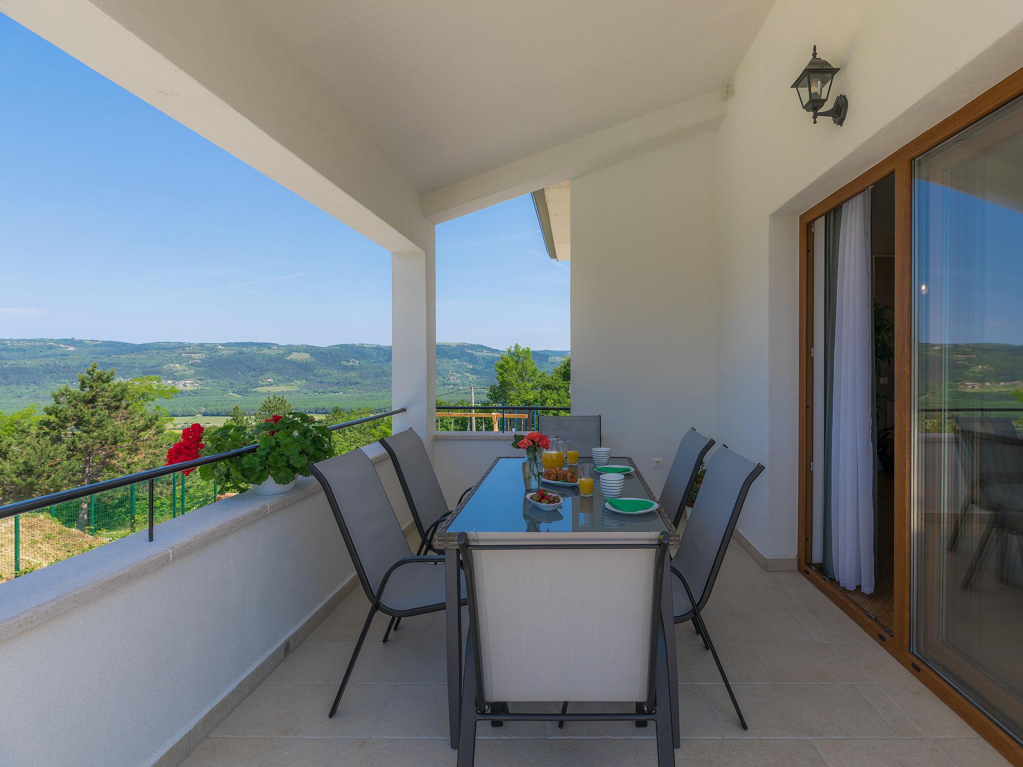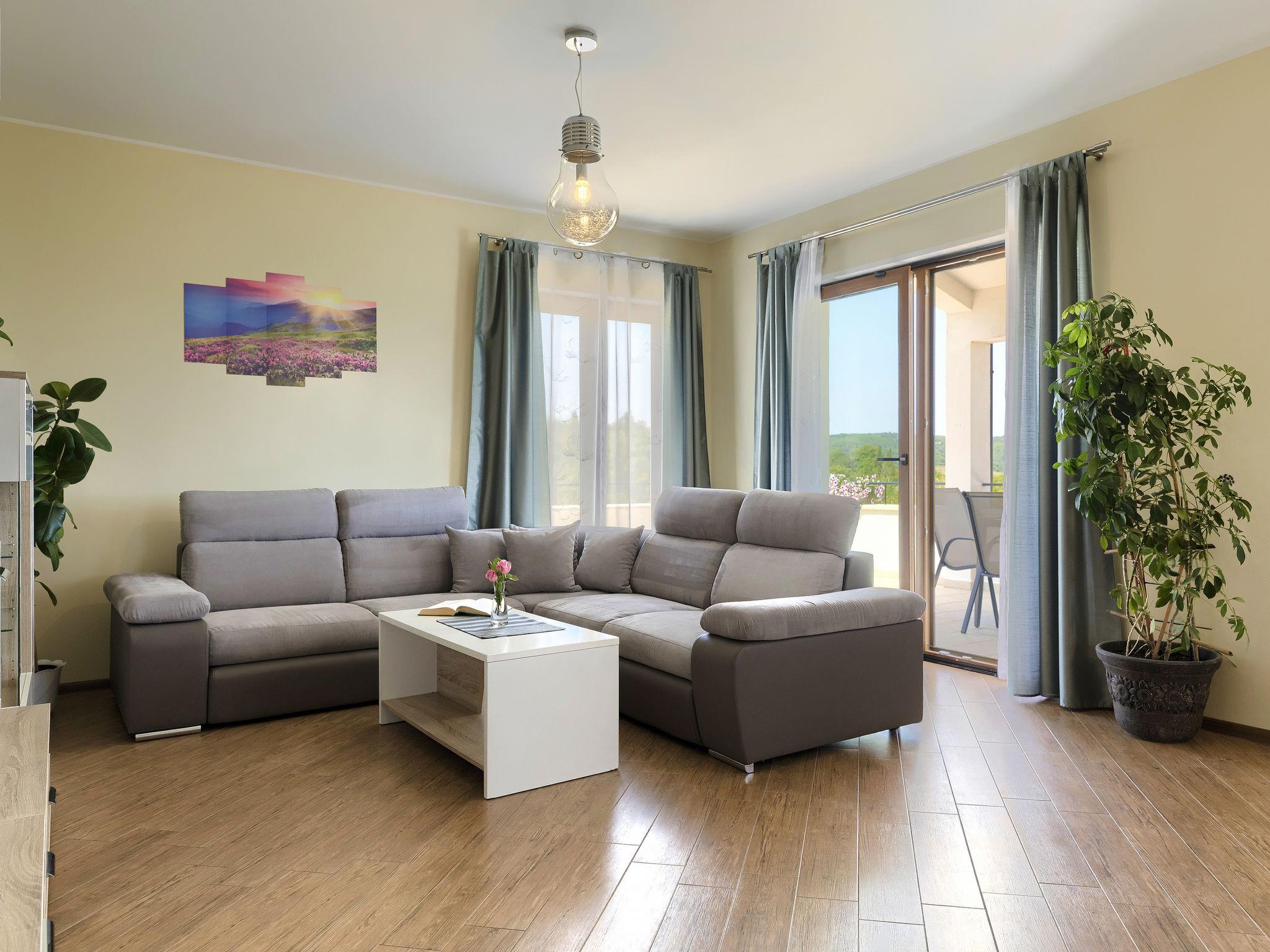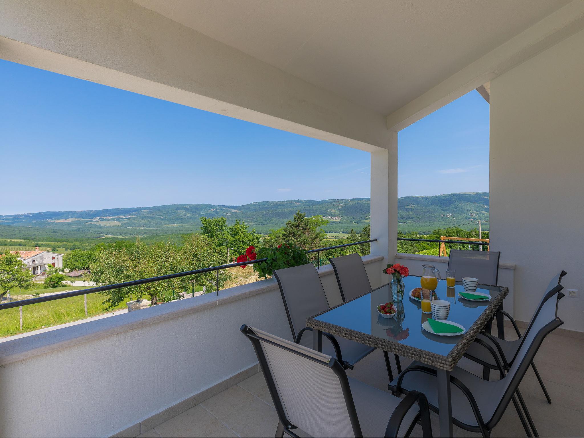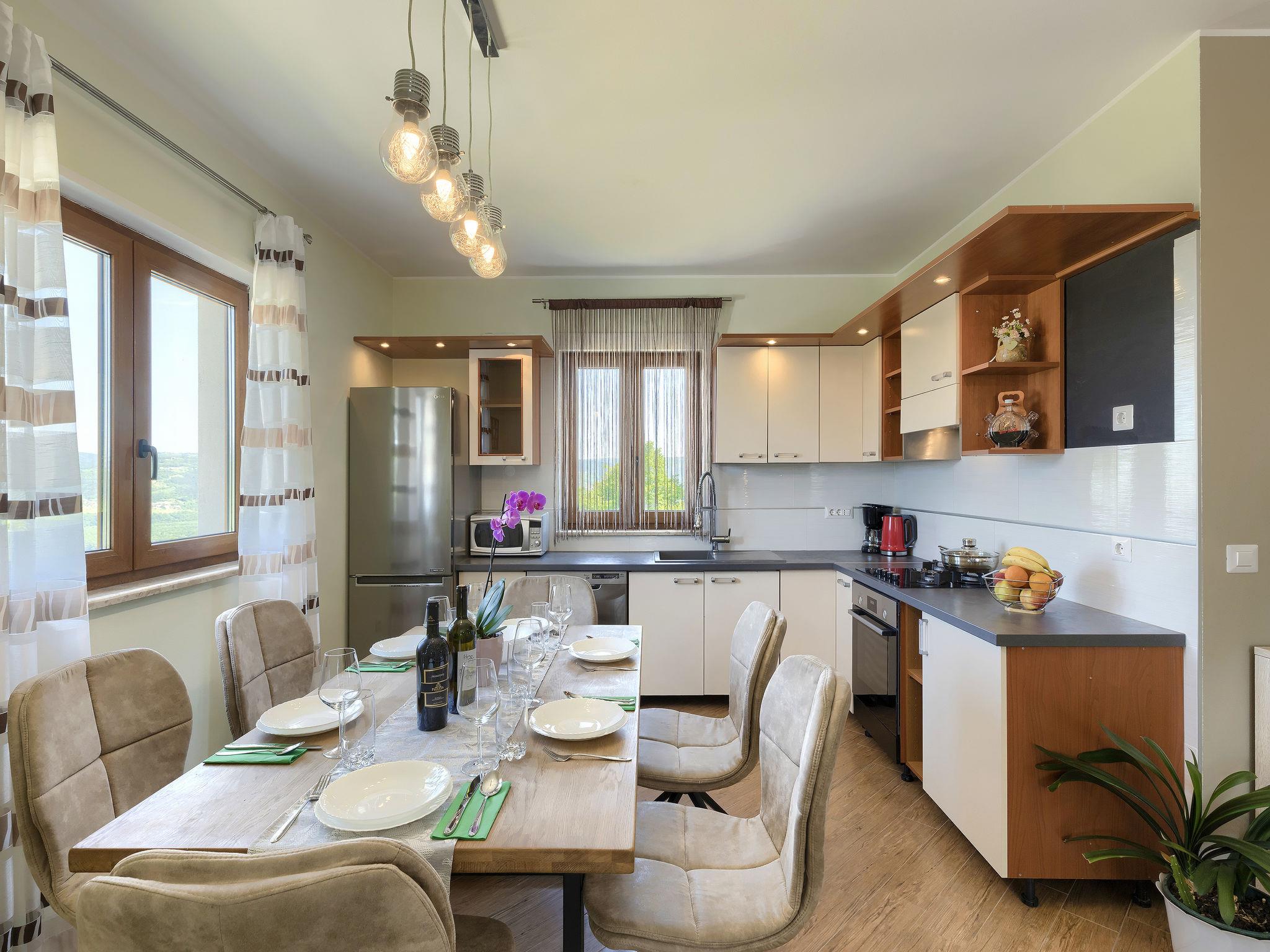 Single-family house "Montebello". In the hamlet Kranceti 2 km from the centre of Motovun, in a quiet, sunny position, 26 km from the sea. Private: property 1'000 m2, garden with lawn, swimming pool angular (7 x 4 m, 33 m2, depth 150 cm, seasonal availability: 01.May. - 30.Sep.) with internal staircase. Outdoor shower, terrace (20 m2), garden furniture, barbecue. In the house: internet access, washing machine. Parking (for 2 cars) at the house on the premises. Shop 2.5 km, restaurant 2.5 km, bus stop 1.1 km, pebble beach 26 km. Walking paths from the house 2.5 km, cycle lane 2.5 km. Nearby attractions: Aquapark 23 km. The owner does not accept any youth groups. Ground floor is closed and not occupied.