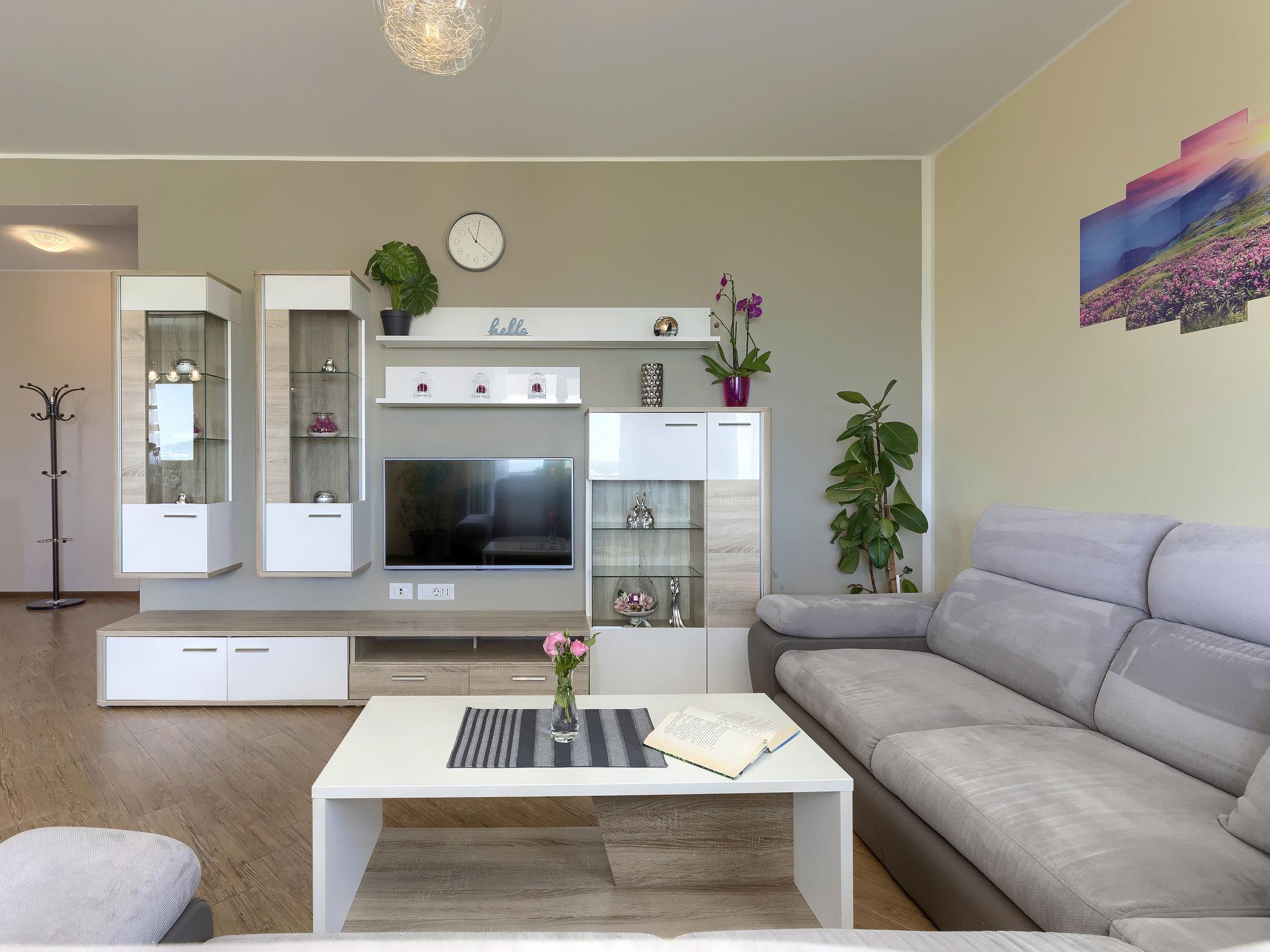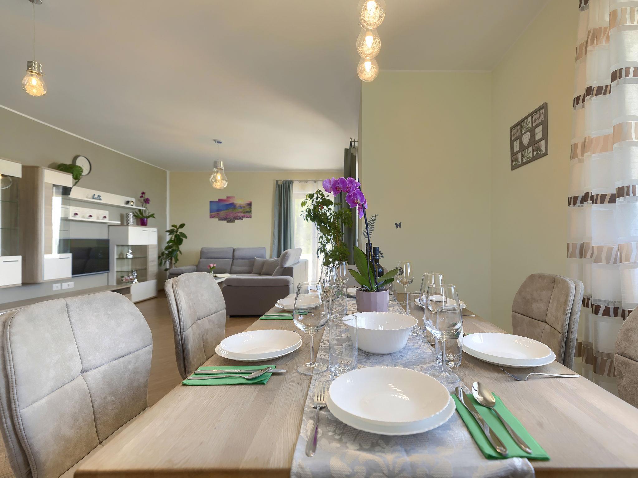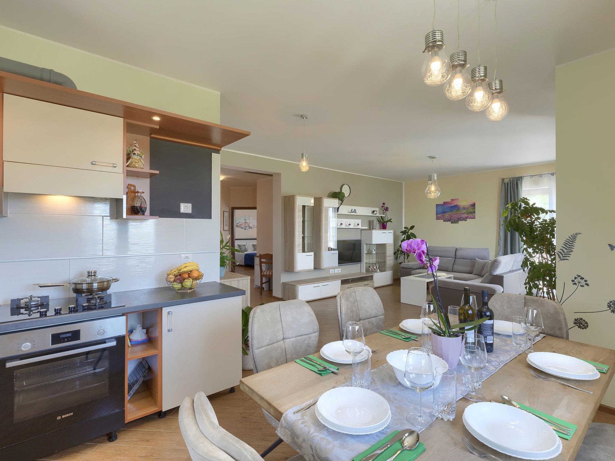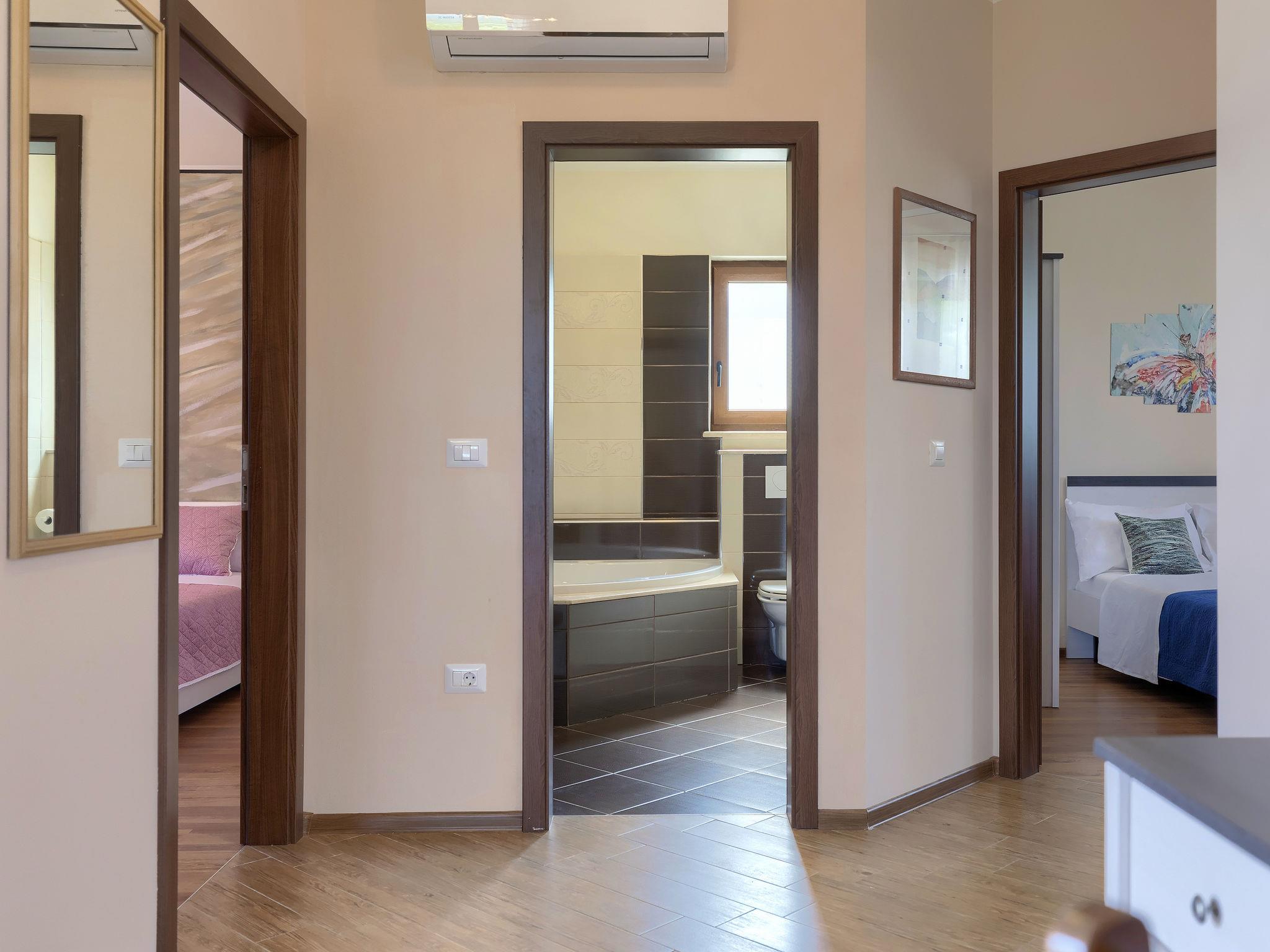 Single-family house "Montebello". In the hamlet Kranceti 2 km from the centre of Motovun, in a quiet, sunny position, 26 km from the sea. Private: property 1'000 m2, garden with lawn, swimming pool angular (7 x 4 m, 33 m2, depth 150 cm, seasonal availability: 01.May. - 30.Sep.) with internal staircase. Outdoor shower, terrace (20 m2), garden furniture, barbecue. In the house: internet access, washing machine. Parking (for 2 cars) at the house on the premises. Shop 2.5 km, restaurant 2.5 km, bus stop 1.1 km, pebble beach 26 km. Walking paths from the house 2.5 km, cycle lane 2.5 km. Nearby attractions: Aquapark 23 km. The owner does not accept any youth groups. Ground floor is closed and not occupied.