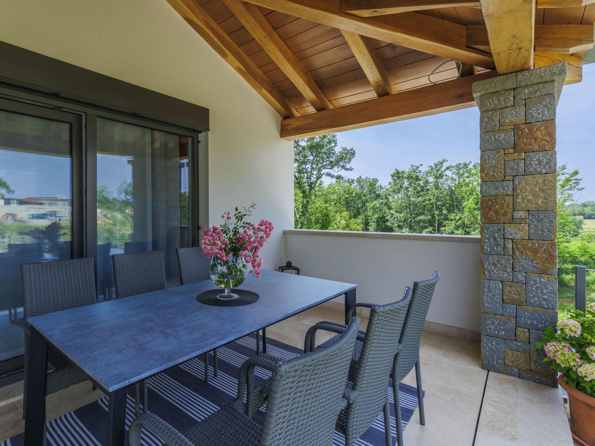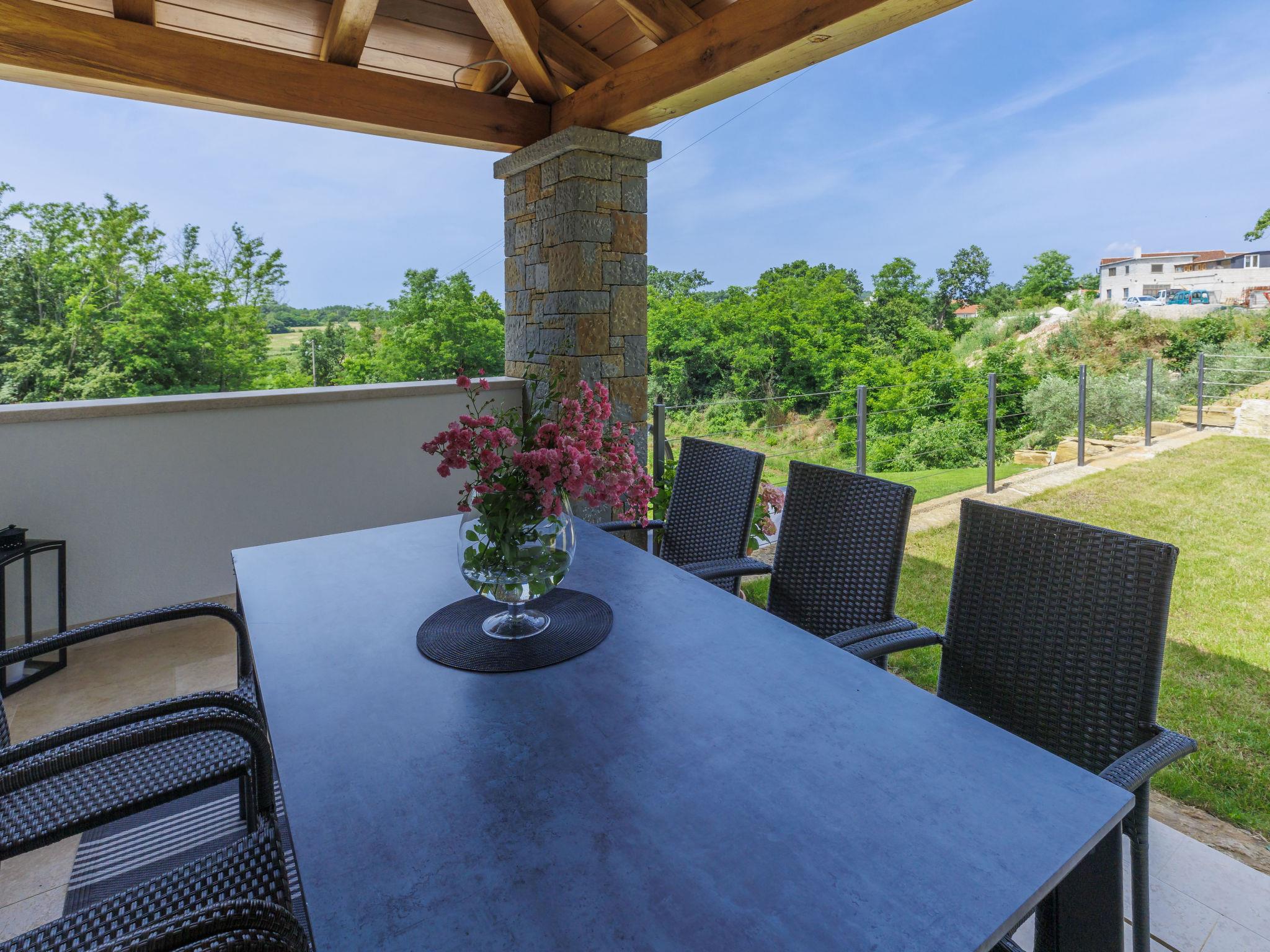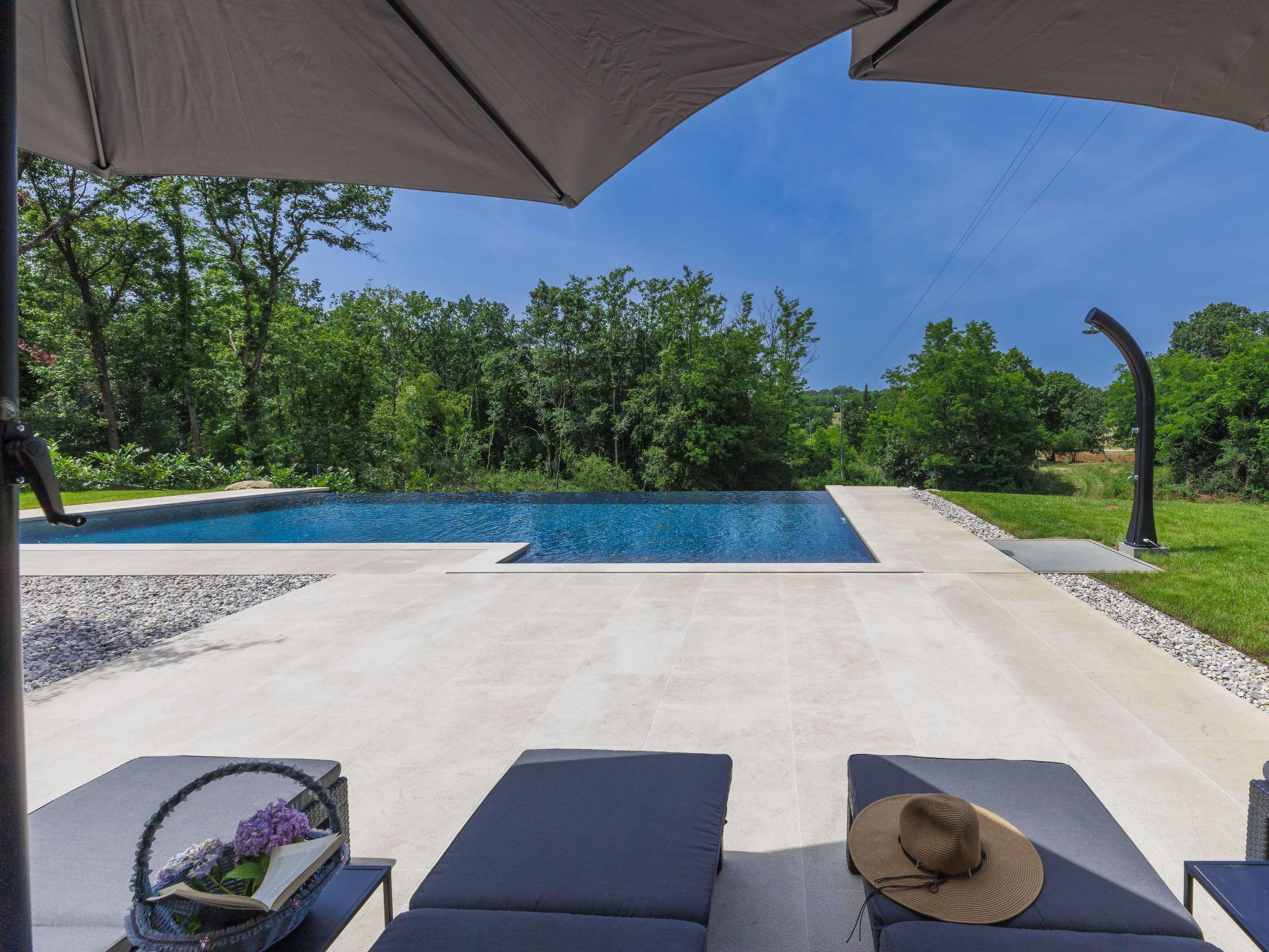 Karojba 4 km from Motovun: Very beautiful semi-detached house "Rokvilla", 2 storeys. In the hamlet Krizmani 4 km from the centre of Karojbe, in a sunny position, 20 km from the sea. Private: property 800 m2, garden with lawn, swimming pool angular (51 m2, depth 138 cm, seasonal availability: 01.May. - 15.Oct.) with internal staircase and salt-electrolysis pool-cleaning system. Outdoor shower, table tennis, terrace (10 m2), garden furniture, barbecue, pool maintenance by the owner/gardener. In the house: internet access, washing machine. Parking (for 2 cars) at the house on the premises. Shop 3 km, restaurant 4 km, bus stop 6.3 km, pebble beach 25 km, rocky beach 20 km. Please note: suitable for families. The owner does not accept any youth groups.