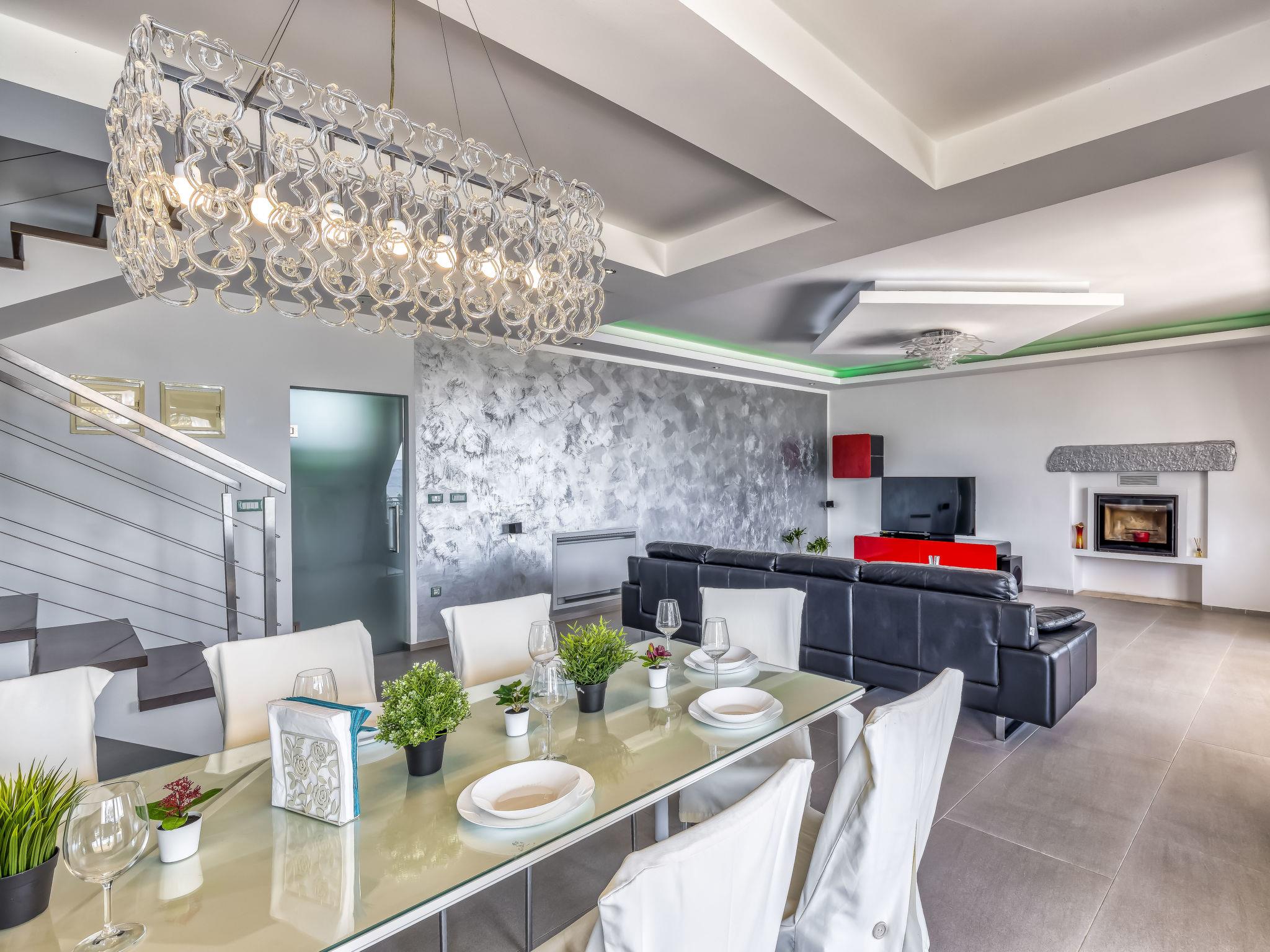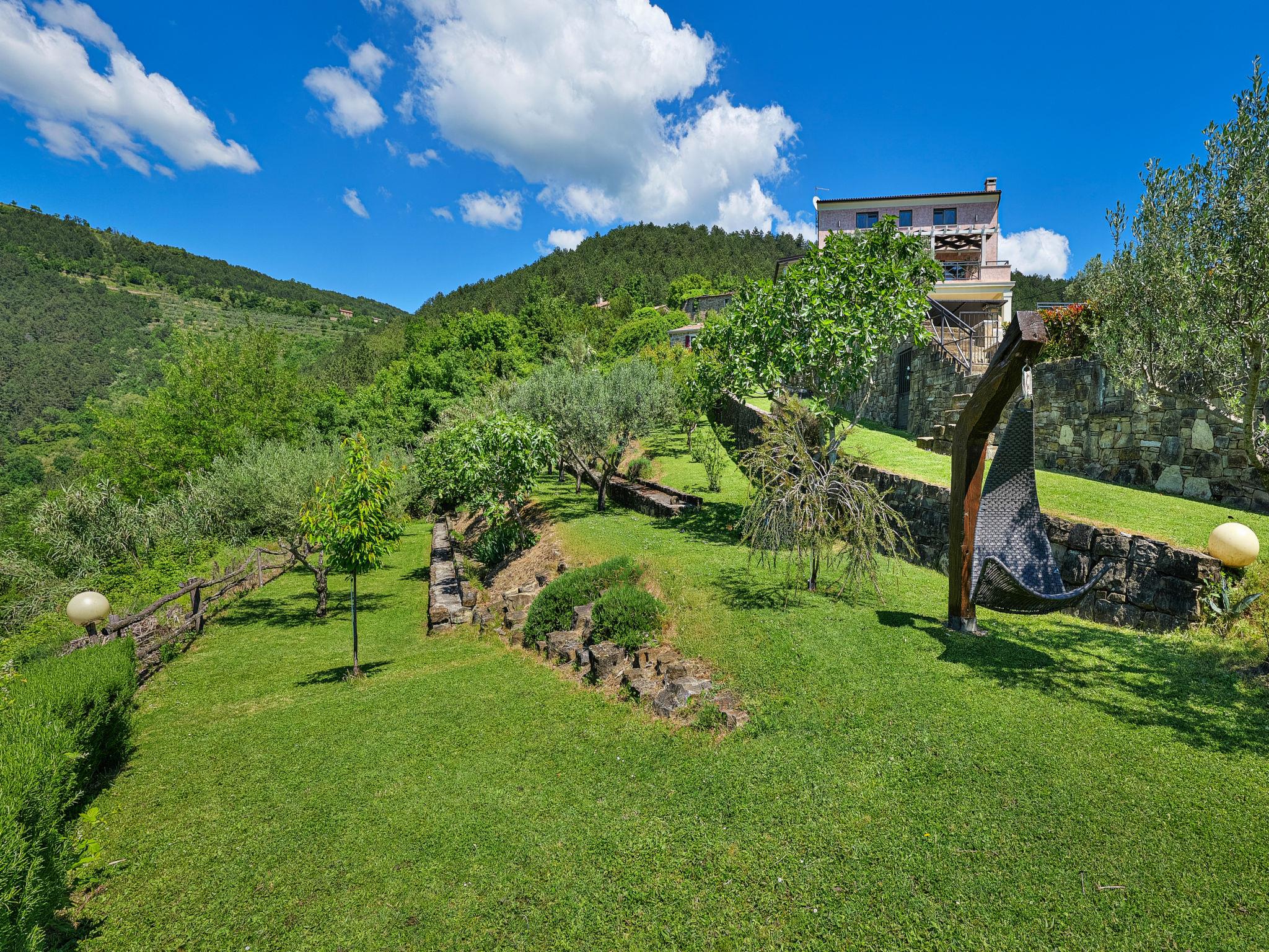 5-room villa 245 m2 on 3 levels. Comfortable and modern furnishings: open living/dining room with open-hearth fireplace (only for decoration), satellite TV and air conditioning. Exit to the garden, to the terrace, to the swimming pool. Open kitchen (oven, dishwasher, 4 ceramic glass hob hotplates, toaster, kettle, freezer, electric coffee machine). Shower/WC. Upper floor: 1 room with 1 french bed (180 cm, length 200 cm), shower/WC and double hand-basin. Exit to the terrace. 1 room with 1 french bed (160 cm, length 200 cm), air conditioning. Exit to the terrace. 2nd upper floor: 2 rooms, each room with 1 french bed (180 cm, length 200 cm), shower/WC and air conditioning. Electric heating. Terrace 50 m2, roofed, terrace 35 m2, roofed. Terrace furniture, deck chairs. Very beautiful panoramic view of the valley and the countryside. Facilities: safe, iron, children's high chair, baby cot, hair dryer. Internet (WiFi, free). Maximum 1 pet/ dog allowed.
