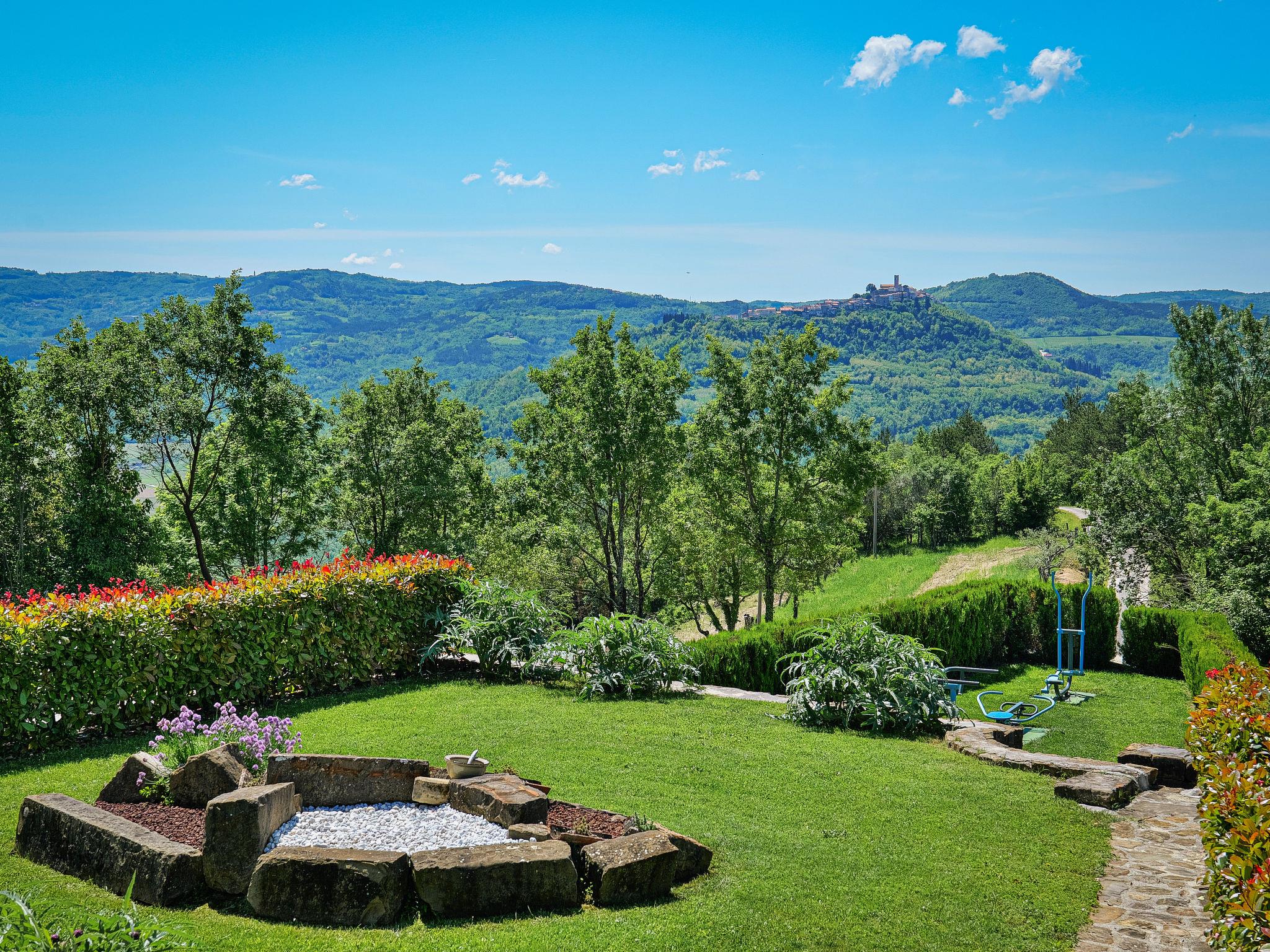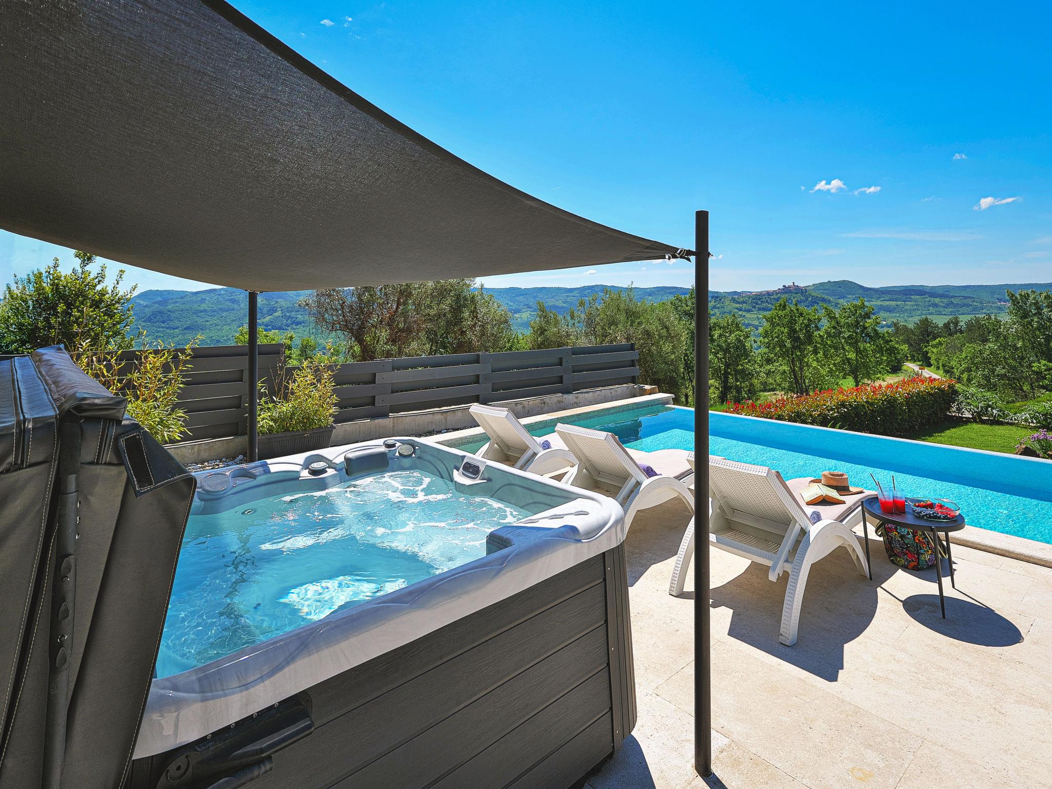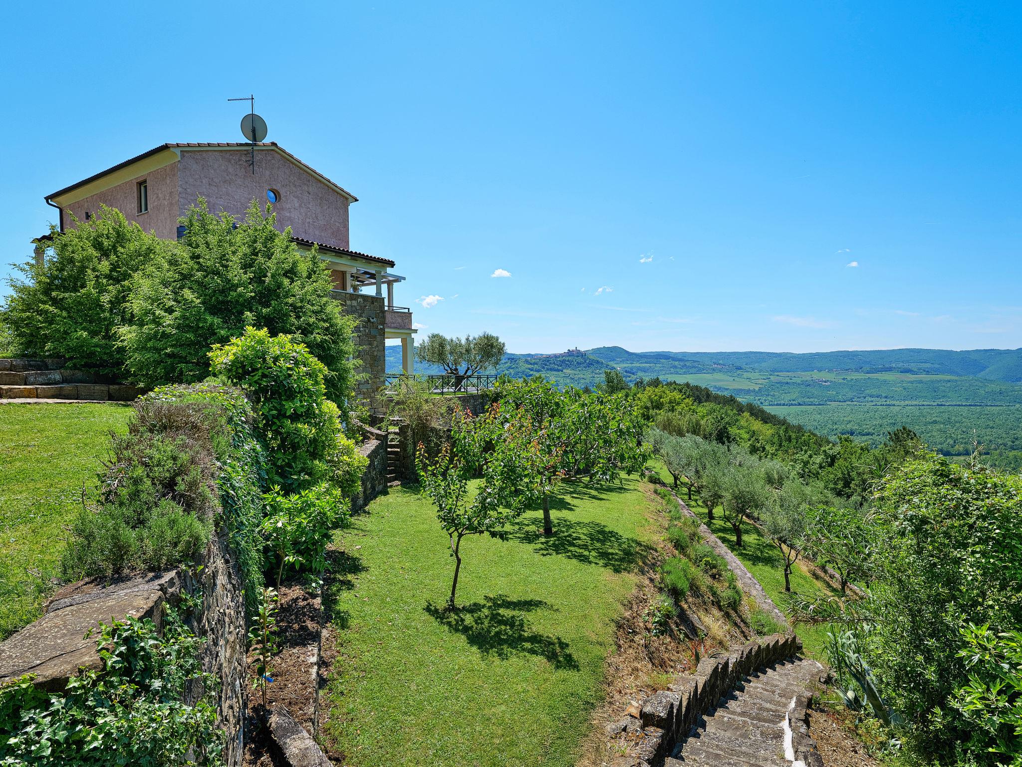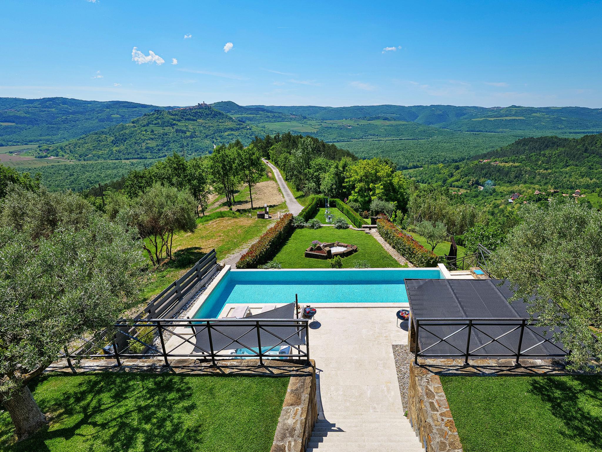 Very beautiful villa "Villa Over the Hilltop", 3 storeys, surrounded by trees and fields. In the hamlet Pašini 6 km from the centre of Motovun, 2.5 km from the centre of Livade, 23 km from the centre of Novigrad, in a quiet, sunny position on a slope, 22 km from the sea, 3 km from the river, in the countryside. Private: property 2'000 m2, well-kept terraced garden, swimming pool angular, heated (12 x 4 m, seasonal availability: 10.May. - 30.Sep.) with internal staircase. Outdoor shower, hot tub, garden furniture, barbecue, children's playground. In the house: internet access, central heating system, washing machine. Parking (for 2 cars) at the house on the premises. Shop 6 km, restaurant 2.5 km, bus stop 18 km, railway station 22 km, pebble beach 23 km, thermal baths 6 km. Sports centre 23 km. Groups of teenagers on request only. Swimming pool heated (extra).