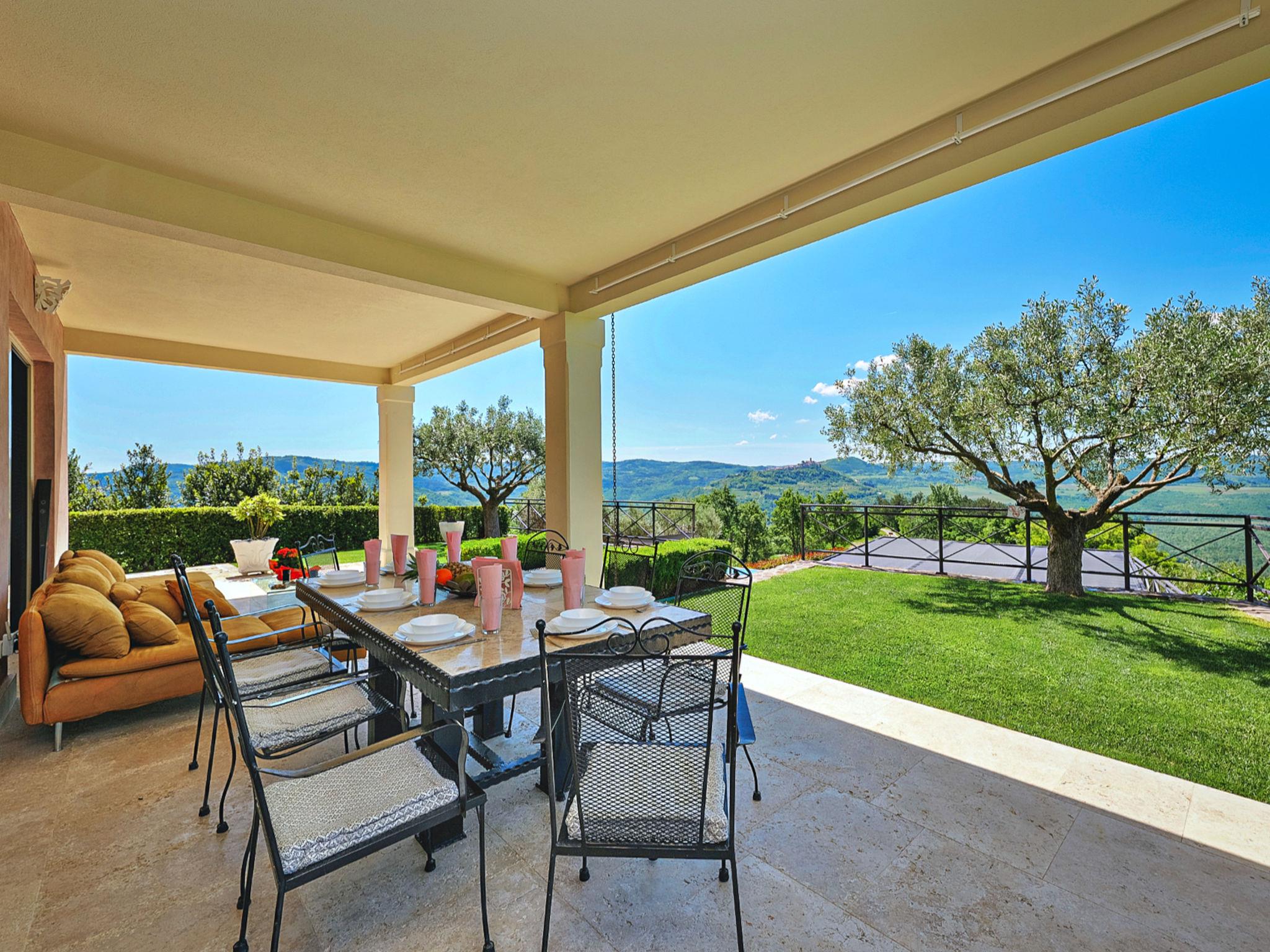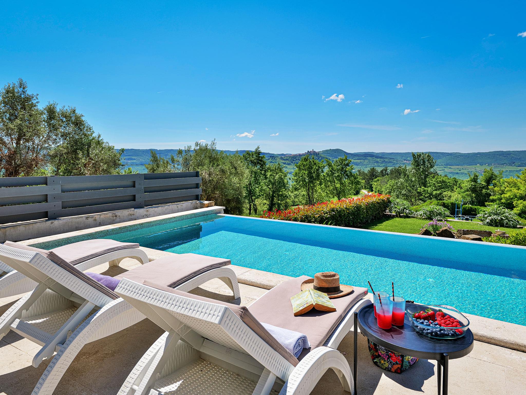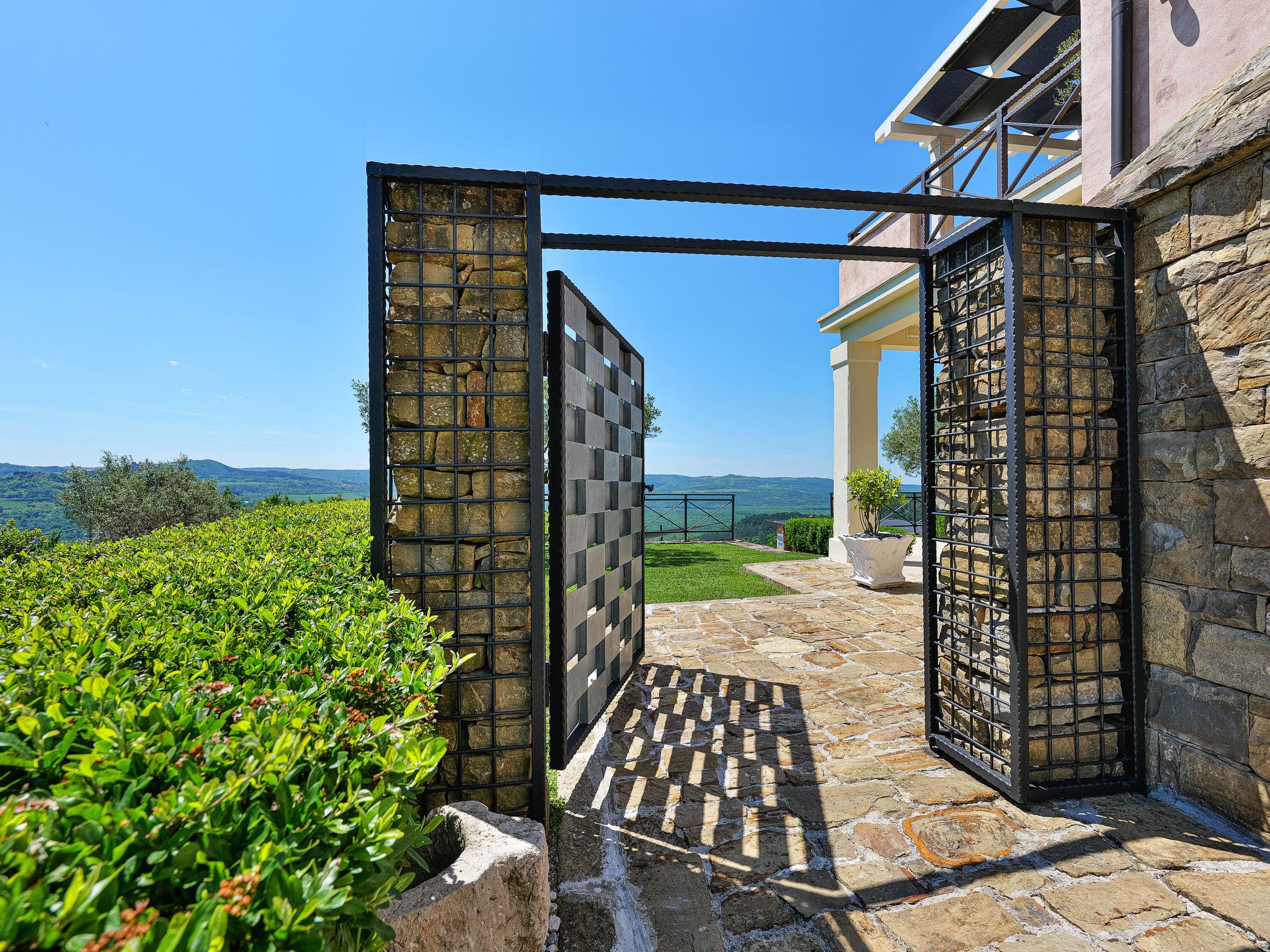 Very beautiful villa "Villa Over the Hilltop", 3 storeys, surrounded by trees and fields. In the hamlet Pašini 6 km from the centre of Motovun, 2.5 km from the centre of Livade, 23 km from the centre of Novigrad, in a quiet, sunny position on a slope, 22 km from the sea, 3 km from the river, in the countryside. Private: property 2'000 m2, well-kept terraced garden, swimming pool angular, heated (12 x 4 m, seasonal availability: 10.May. - 30.Sep.) with internal staircase. Outdoor shower, hot tub, garden furniture, barbecue, children's playground. In the house: internet access, central heating system, washing machine. Parking (for 2 cars) at the house on the premises. Shop 6 km, restaurant 2.5 km, bus stop 18 km, railway station 22 km, pebble beach 23 km, thermal baths 6 km. Sports centre 23 km. Groups of teenagers on request only. Swimming pool heated (extra).