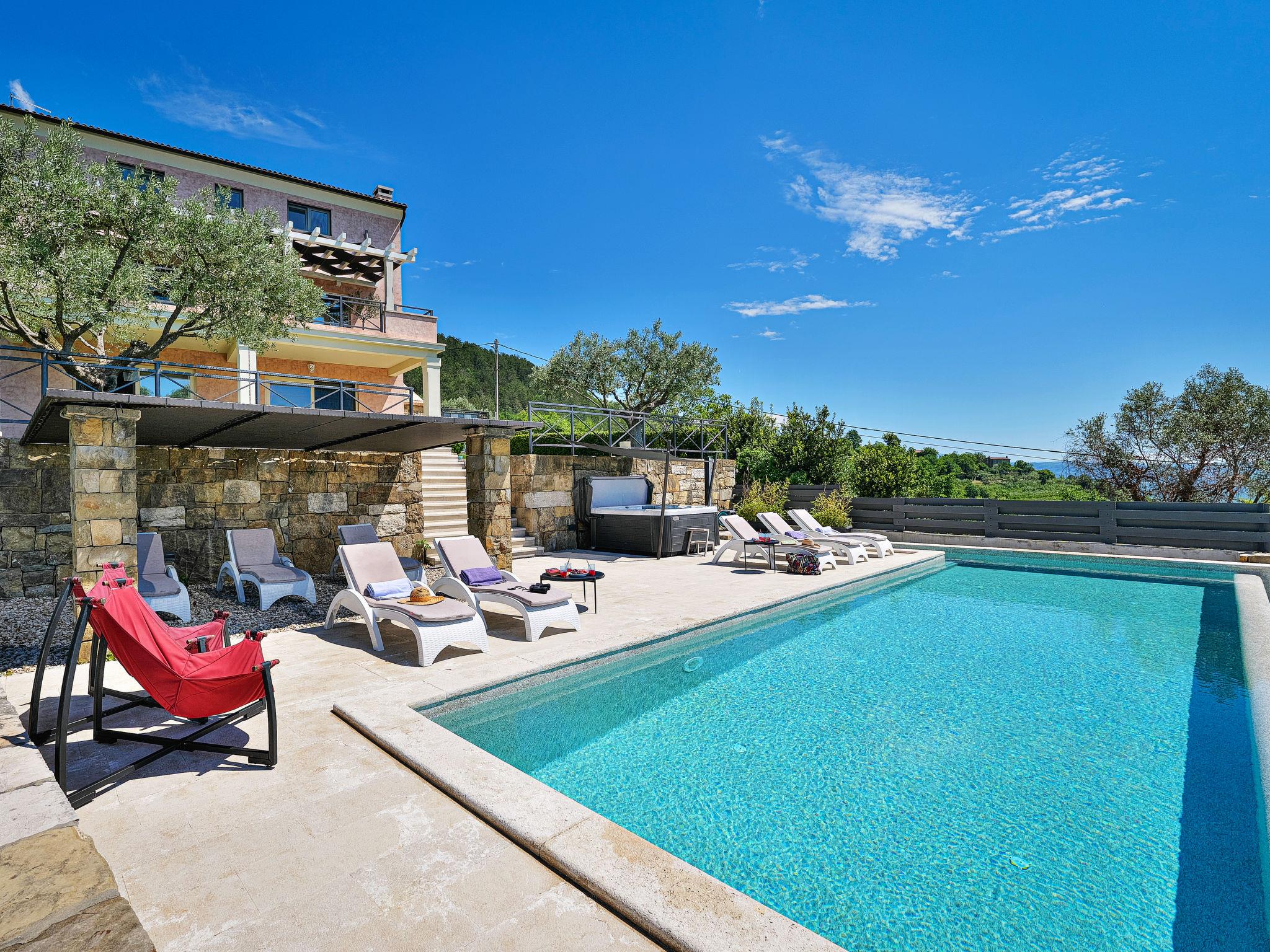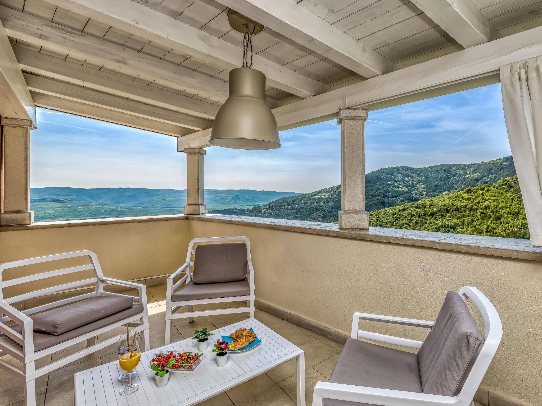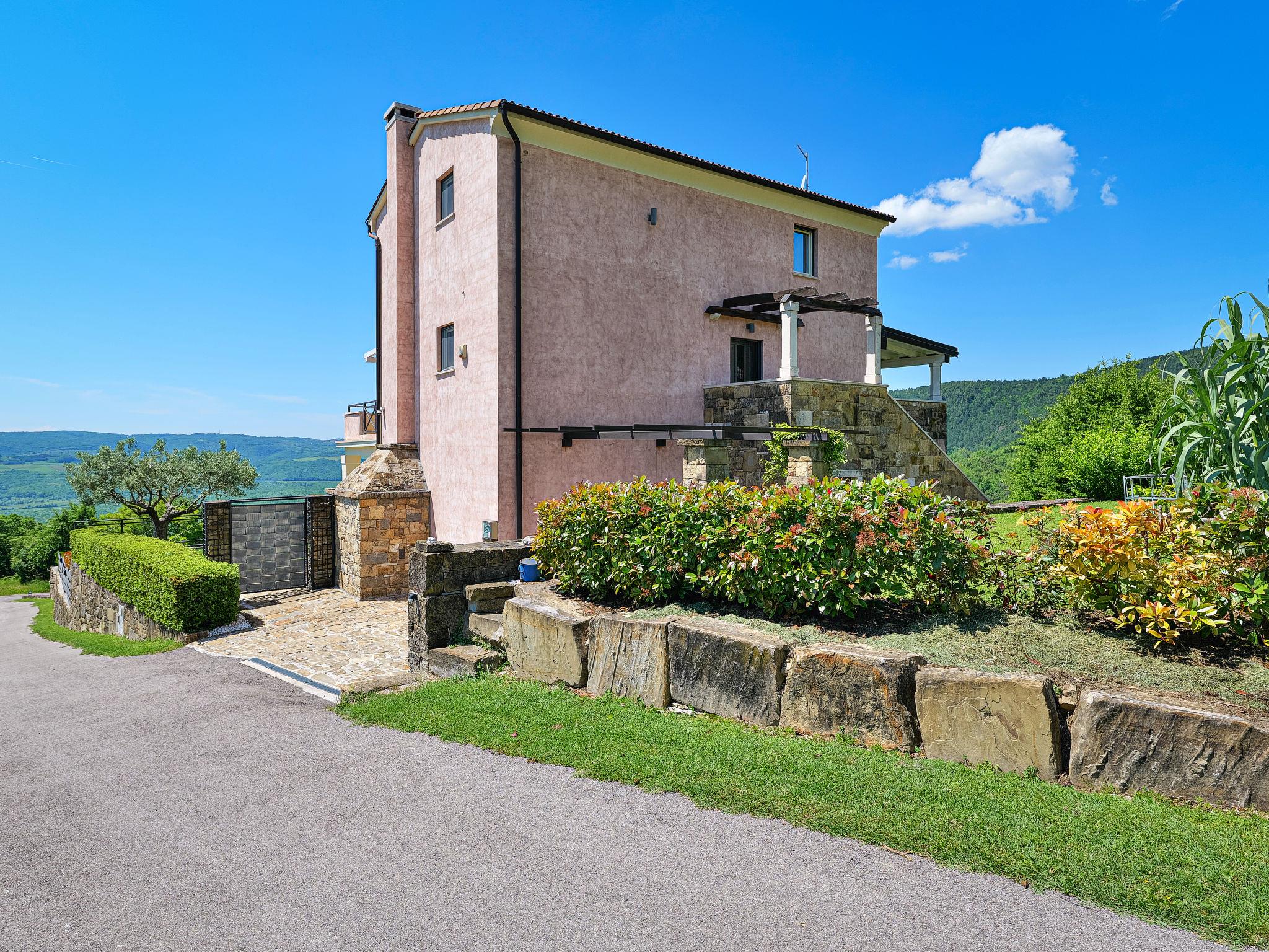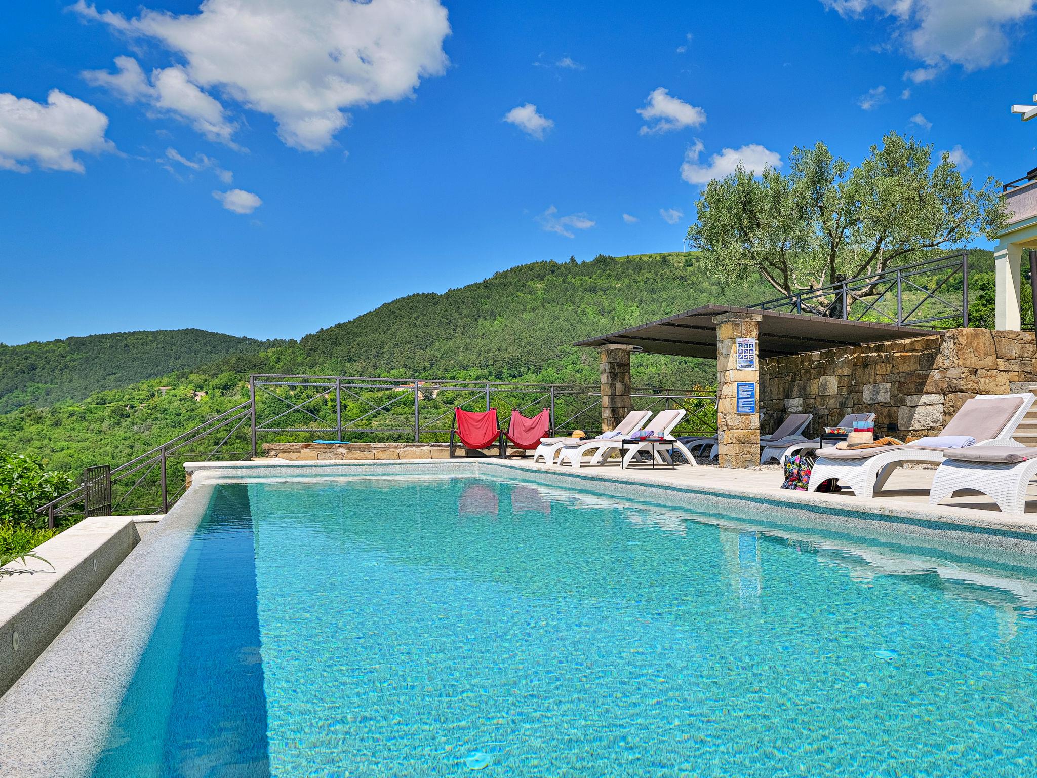 Very beautiful villa "Villa Over the Hilltop", 3 storeys, surrounded by trees and fields. In the hamlet Pašini 6 km from the centre of Motovun, 2.5 km from the centre of Livade, 23 km from the centre of Novigrad, in a quiet, sunny position on a slope, 22 km from the sea, 3 km from the river, in the countryside. Private: property 2'000 m2, well-kept terraced garden, swimming pool angular, heated (12 x 4 m, seasonal availability: 10.May. - 30.Sep.) with internal staircase. Outdoor shower, hot tub, garden furniture, barbecue, children's playground. In the house: internet access, central heating system, washing machine. Parking (for 2 cars) at the house on the premises. Shop 6 km, restaurant 2.5 km, bus stop 18 km, railway station 22 km, pebble beach 23 km, thermal baths 6 km. Sports centre 23 km. Groups of teenagers on request only. Swimming pool heated (extra).