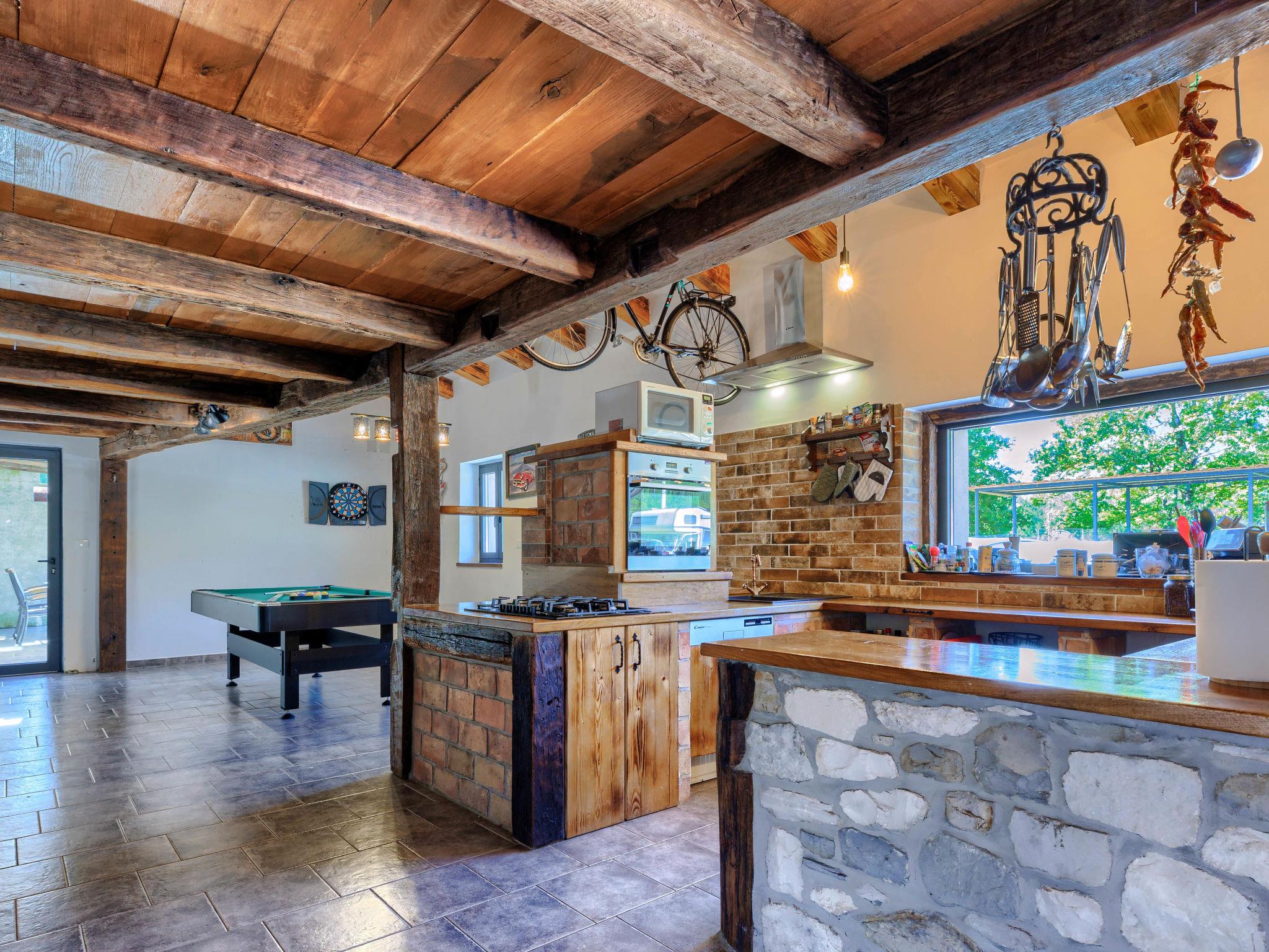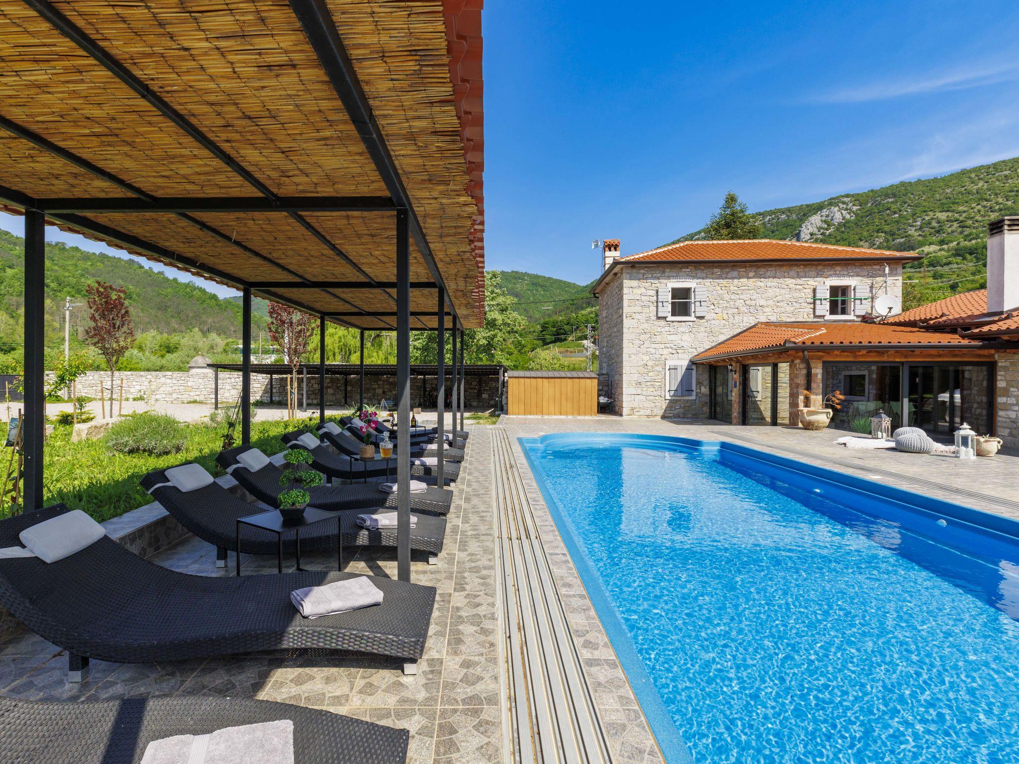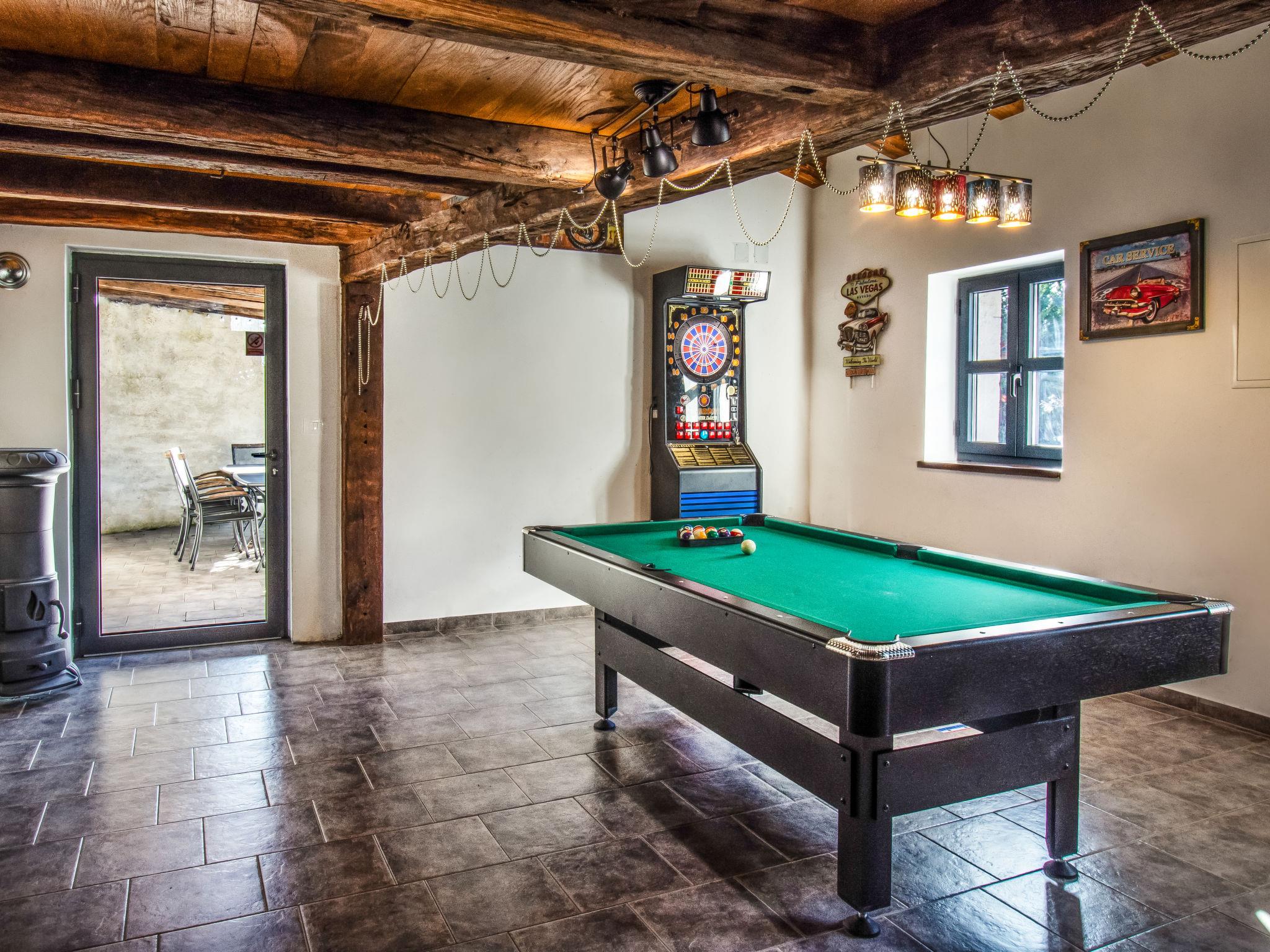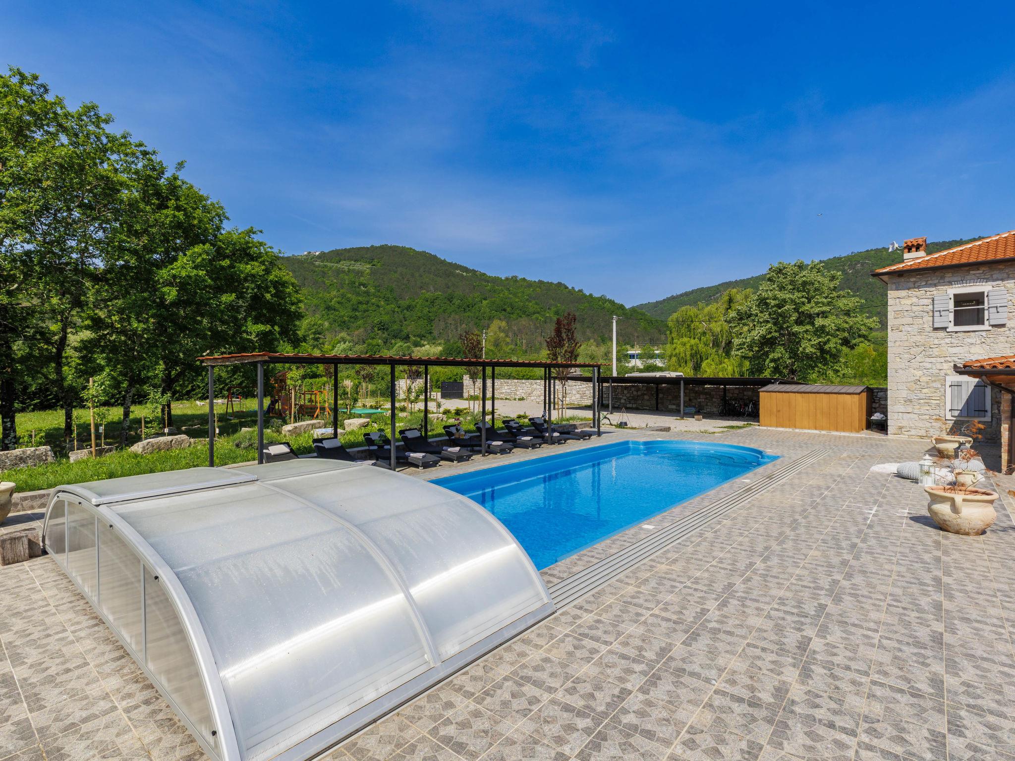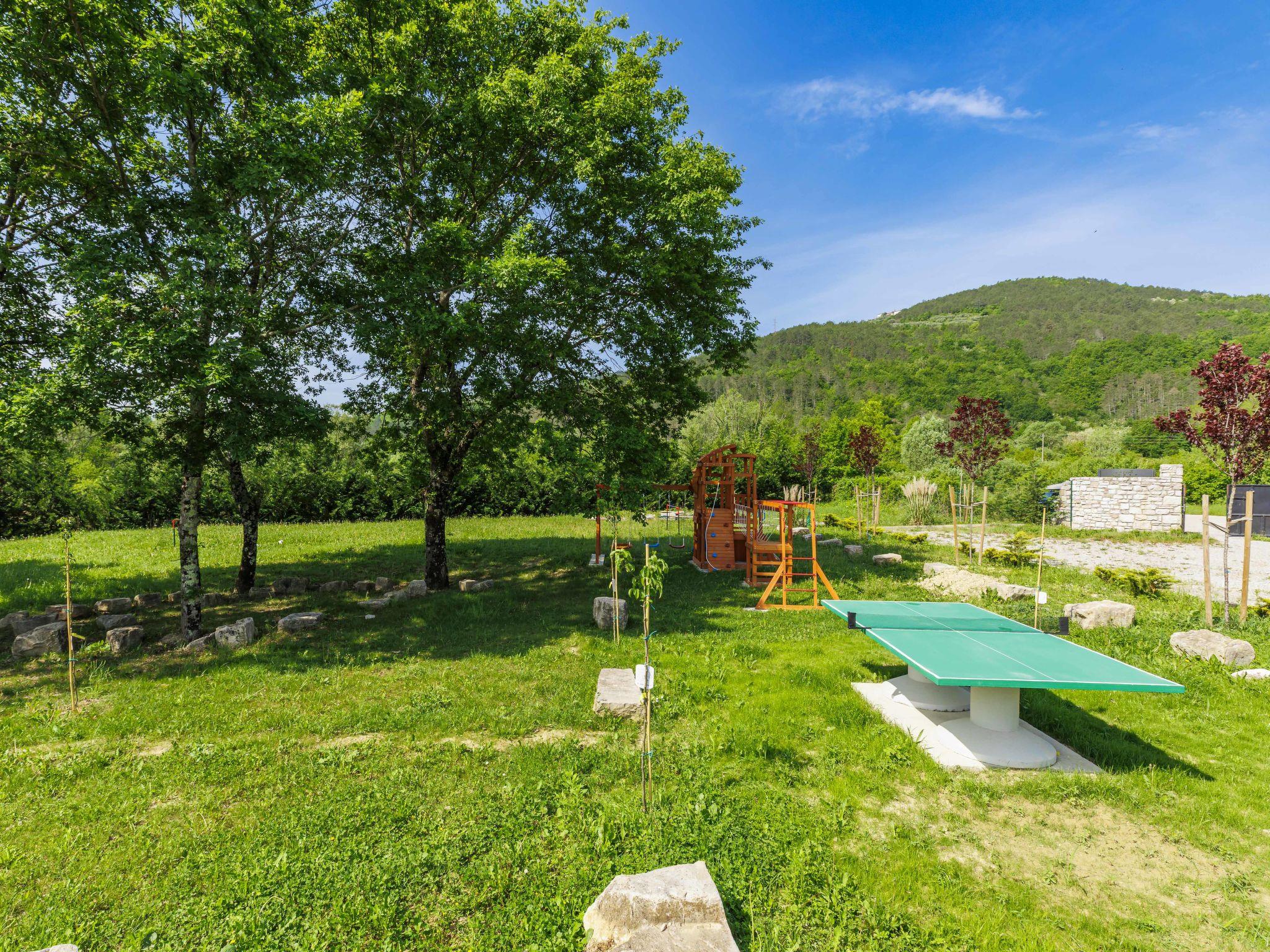 Gradinje 5 km from Motovun: Beautiful villa "Tina", 2 storeys. 10 km from the centre of Buzet, 30 km from the centre of Novigrad, in a quiet position, 30 km from the sea, in the countryside. Private: property 3'500 m2 (fenced), garden with lawn, swimming pool angular, heated (75 m2, depth 100 - 170 cm, seasonal availability: 01.Mar. - 01.Nov.) with internal staircase and shutter cover. Outdoor shower, terrace (25 m2), garden furniture, barbecue, children's playground (slide, swing). In the house: internet access, table tennis, billiard table, washing machine. Roofed, parking (for 6 cars) at the house on the premises. E-charging station. Shop 3.5 km, restaurant 400 m, bus stop 3.8 km. Walking paths from the house, cycle lane 100 m. Nearby attractions: Aquapark 14 km. Please note: airfield 30 km from the property. Bicycles on request (extra).