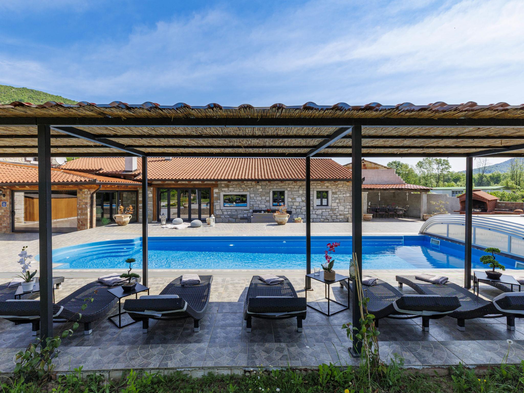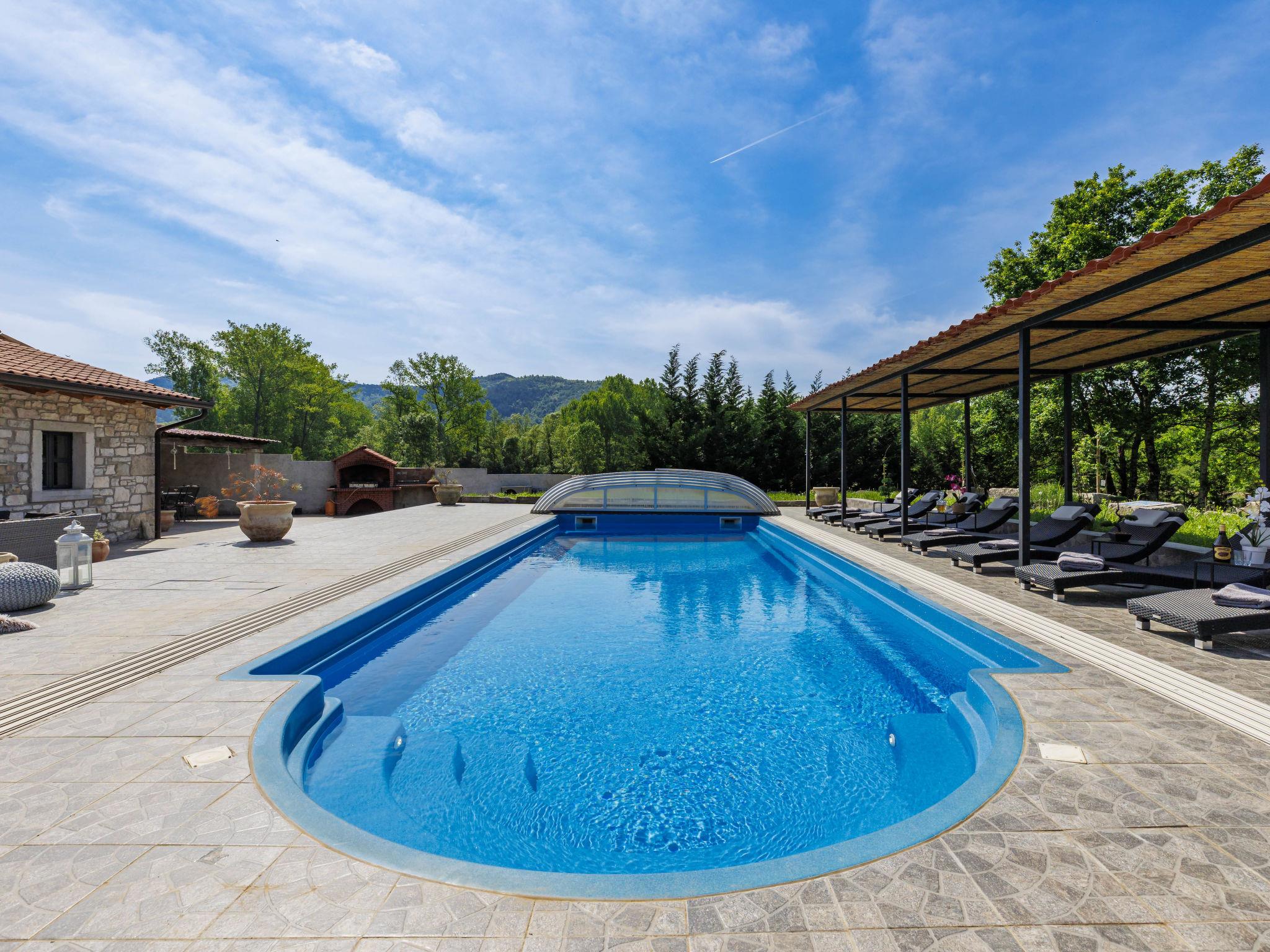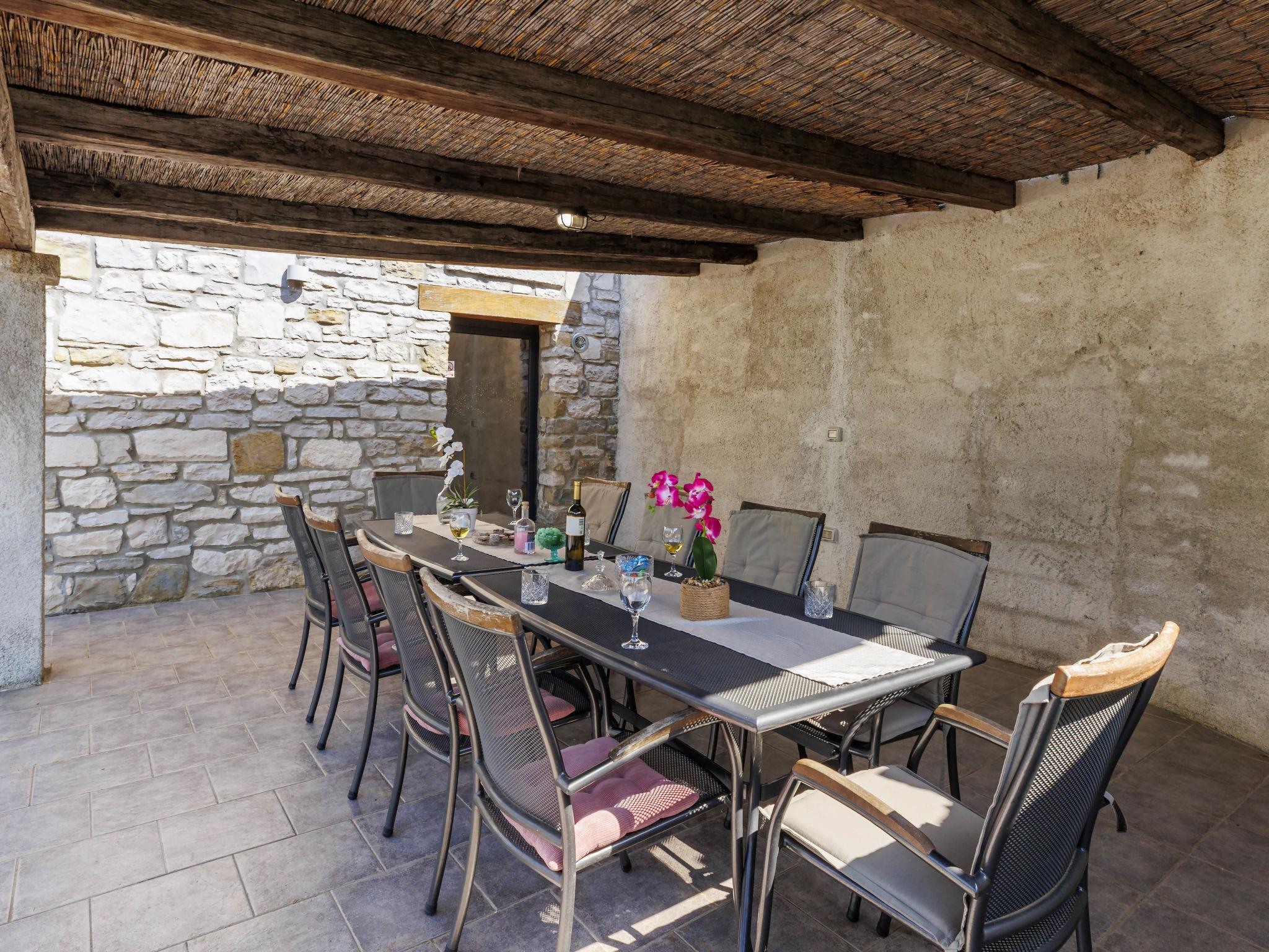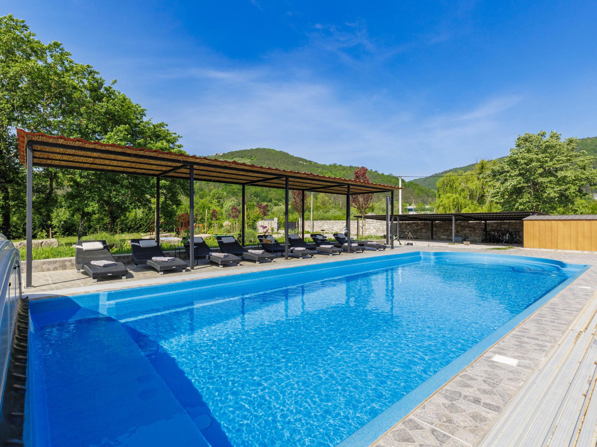 Gradinje 5 km from Motovun: Beautiful villa "Tina", 2 storeys. 10 km from the centre of Buzet, 30 km from the centre of Novigrad, in a quiet position, 30 km from the sea, in the countryside. Private: property 3'500 m2 (fenced), garden with lawn, swimming pool angular, heated (75 m2, depth 100 - 170 cm, seasonal availability: 01.Mar. - 01.Nov.) with internal staircase and shutter cover. Outdoor shower, terrace (25 m2), garden furniture, barbecue, children's playground (slide, swing). In the house: internet access, table tennis, billiard table, washing machine. Roofed, parking (for 6 cars) at the house on the premises. E-charging station. Shop 3.5 km, restaurant 400 m, bus stop 3.8 km. Walking paths from the house, cycle lane 100 m. Nearby attractions: Aquapark 14 km. Please note: airfield 30 km from the property. Bicycles on request (extra).