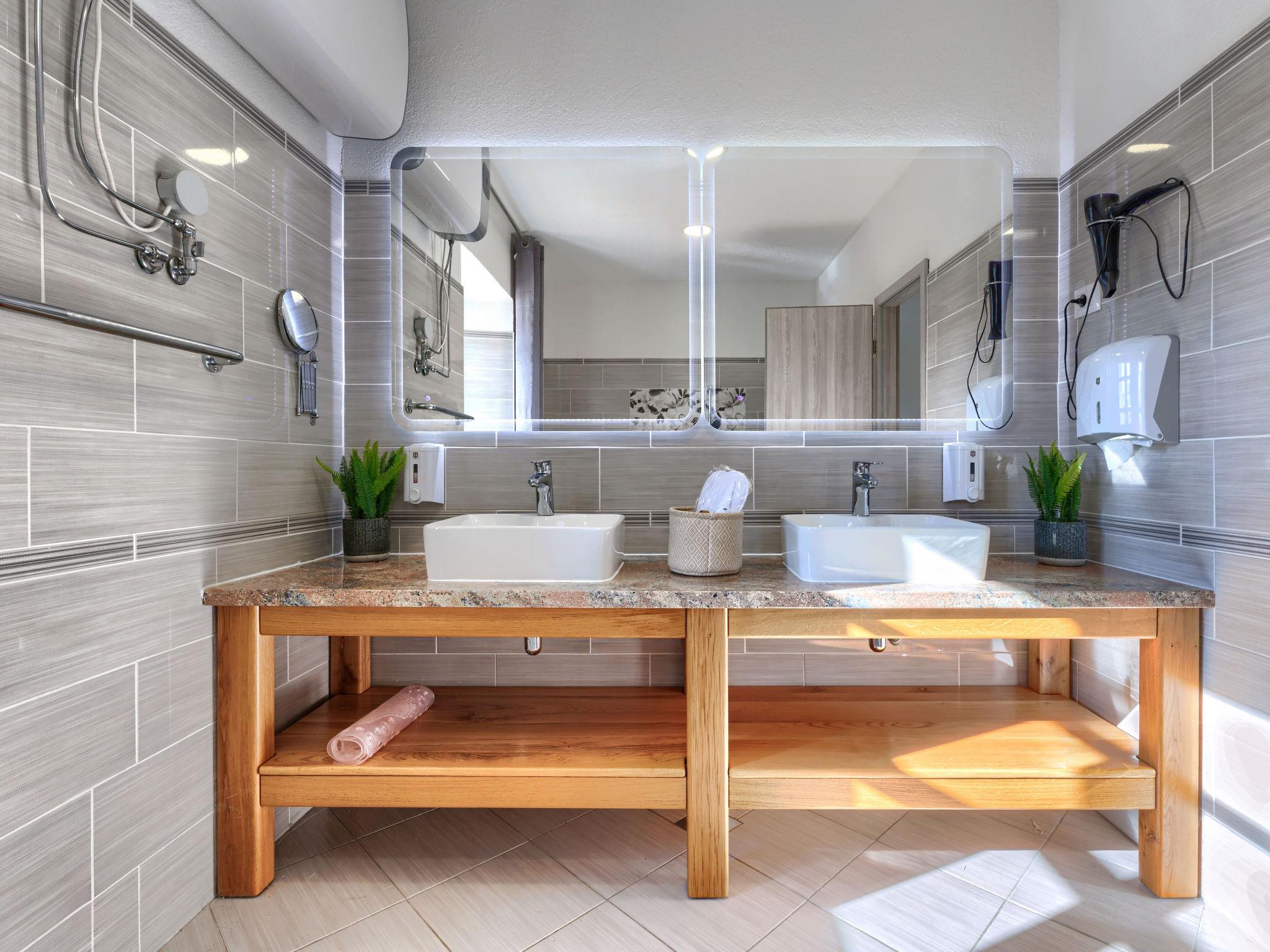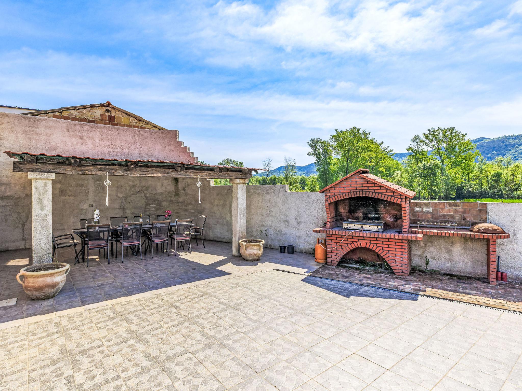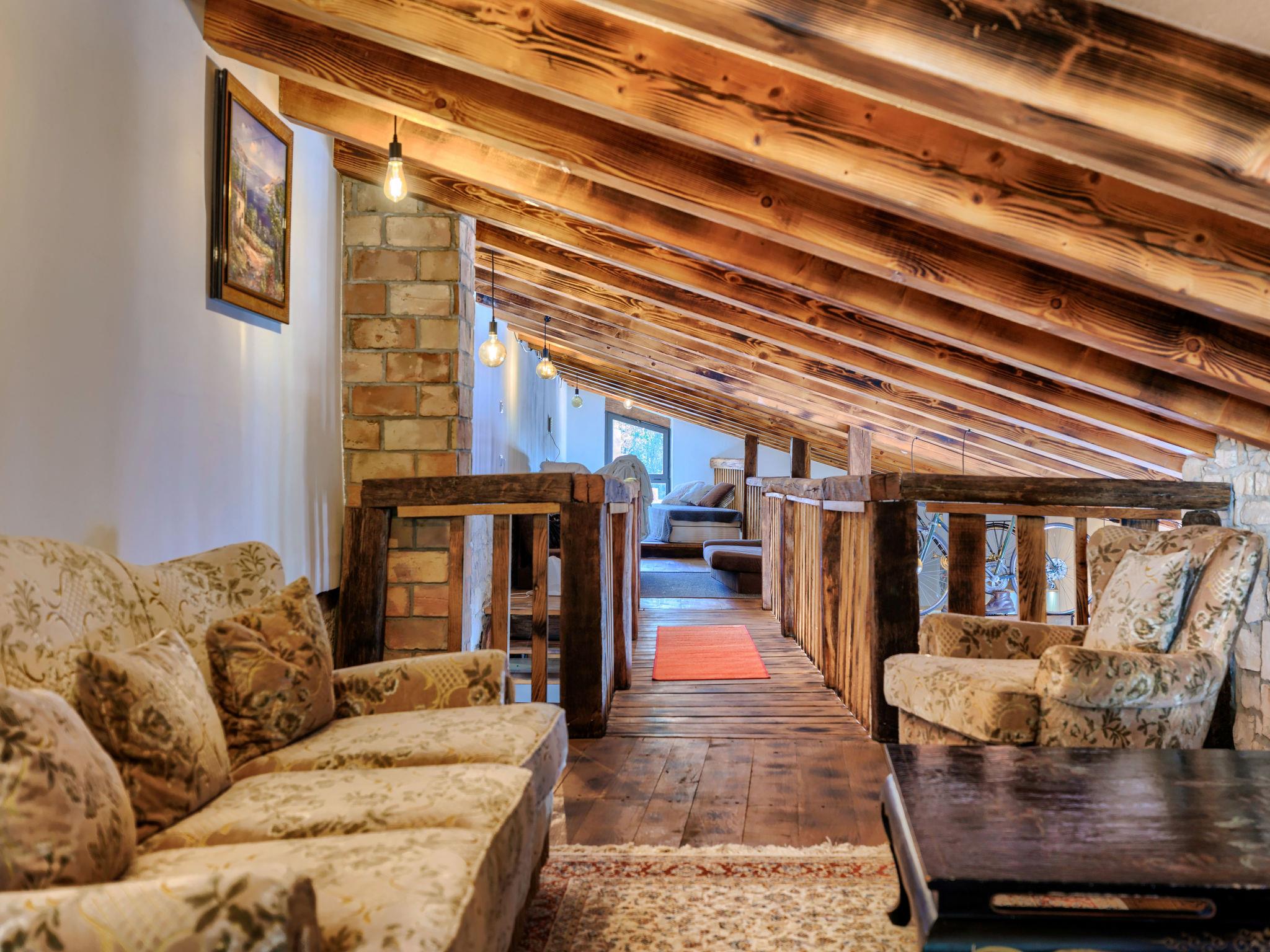 6-room villa 333 m2 on 2 levels. Rustic and cosy furnishings: living/dining room with satellite TV and air conditioning. Exit to the swimming pool. Gallery with 2 sofabeds (140 cm, length 200 cm), 2 sleeping facilities (90 cm, length 200 cm), separate WC. 2 rooms, each room with 2 beds (90 cm, length 200 cm), shower/WC, satellite TV and air conditioning. Open kitchen (oven, dishwasher, 5 gas rings, toaster, kettle, microwave, freezer, electric coffee machine). Upper floor: 2 rooms, each room with 1 french bed (160 cm, length 200 cm), bath/WC, satellite TV and air conditioning. Heating. Deck chairs. View of the countryside. Facilities: safe, children's high chair, baby cot, hair dryer. Internet (WiFi, free). Maximum 1 pet/ dog allowed.