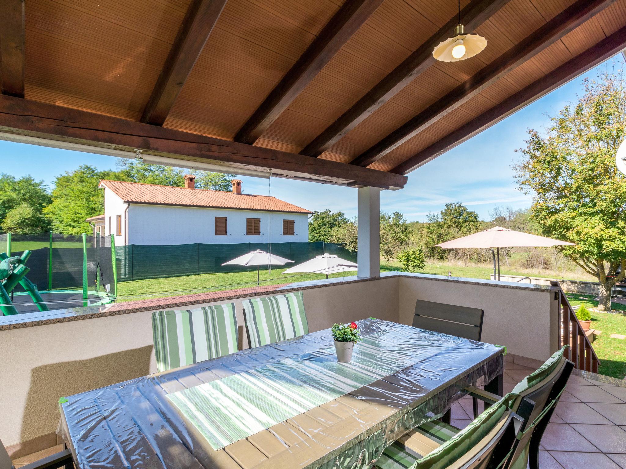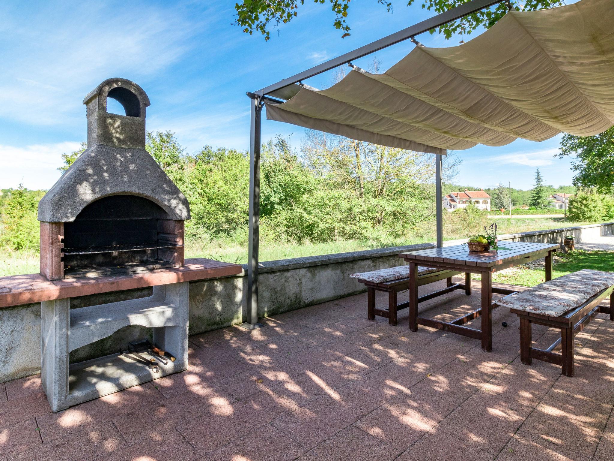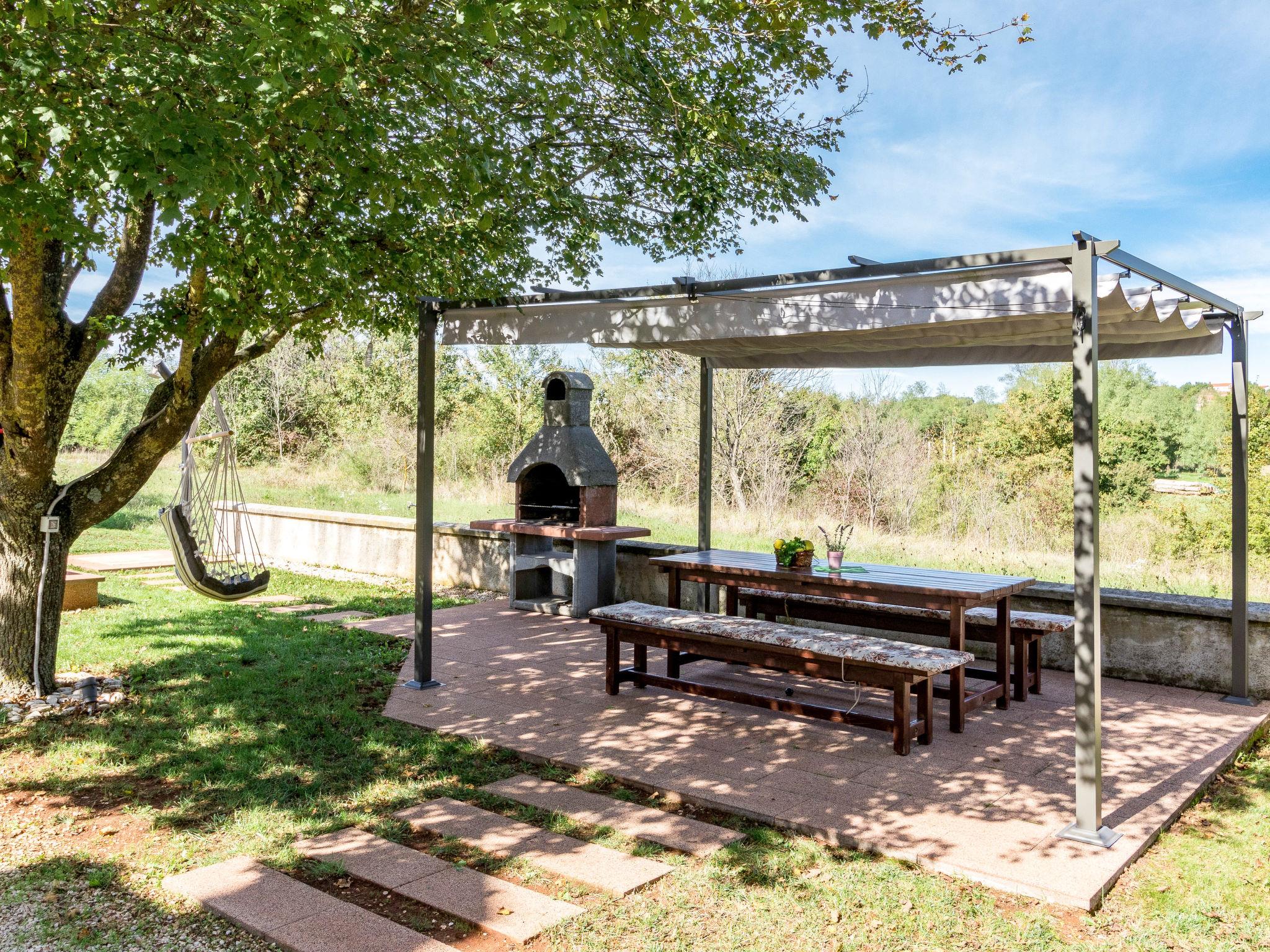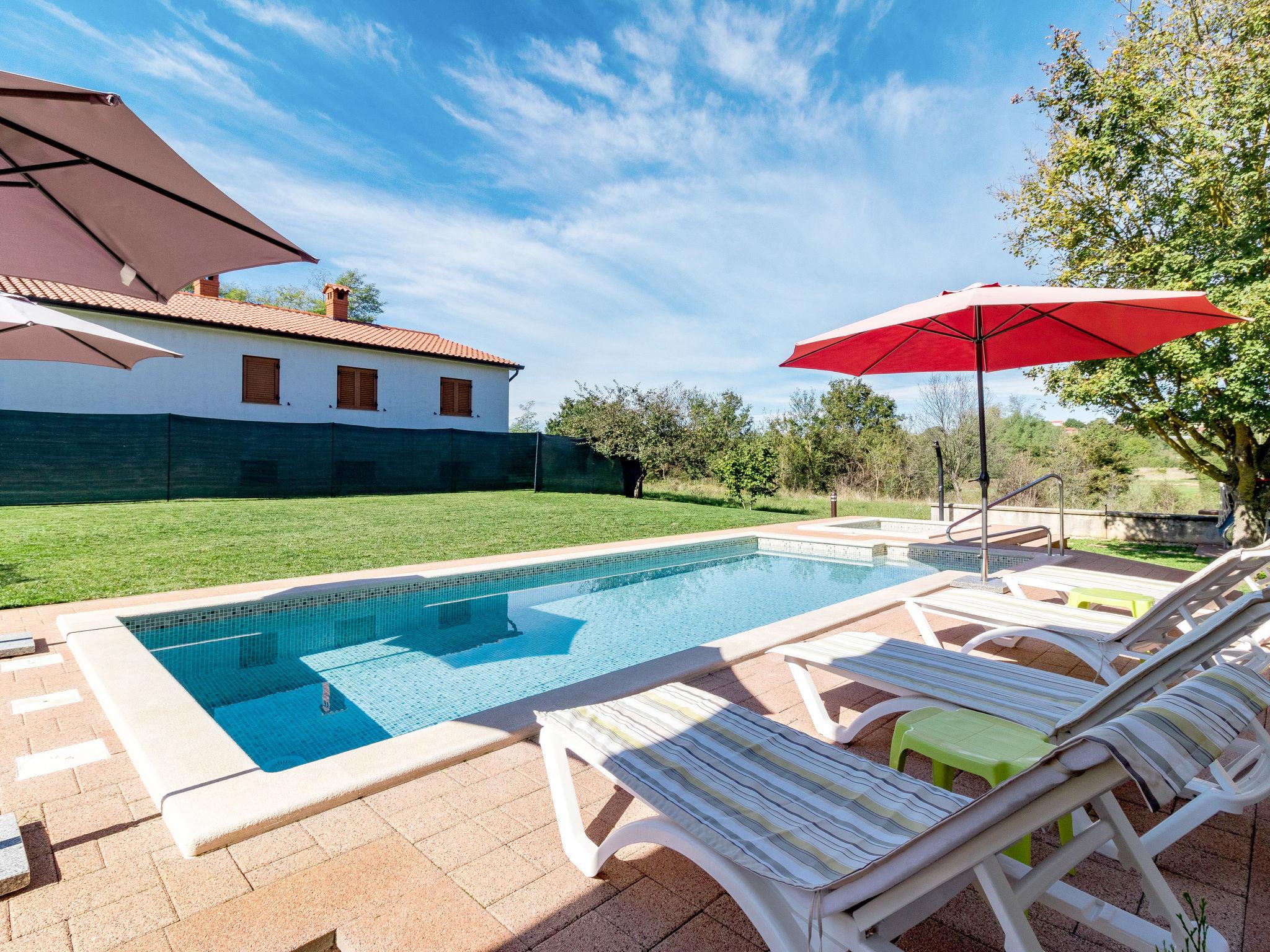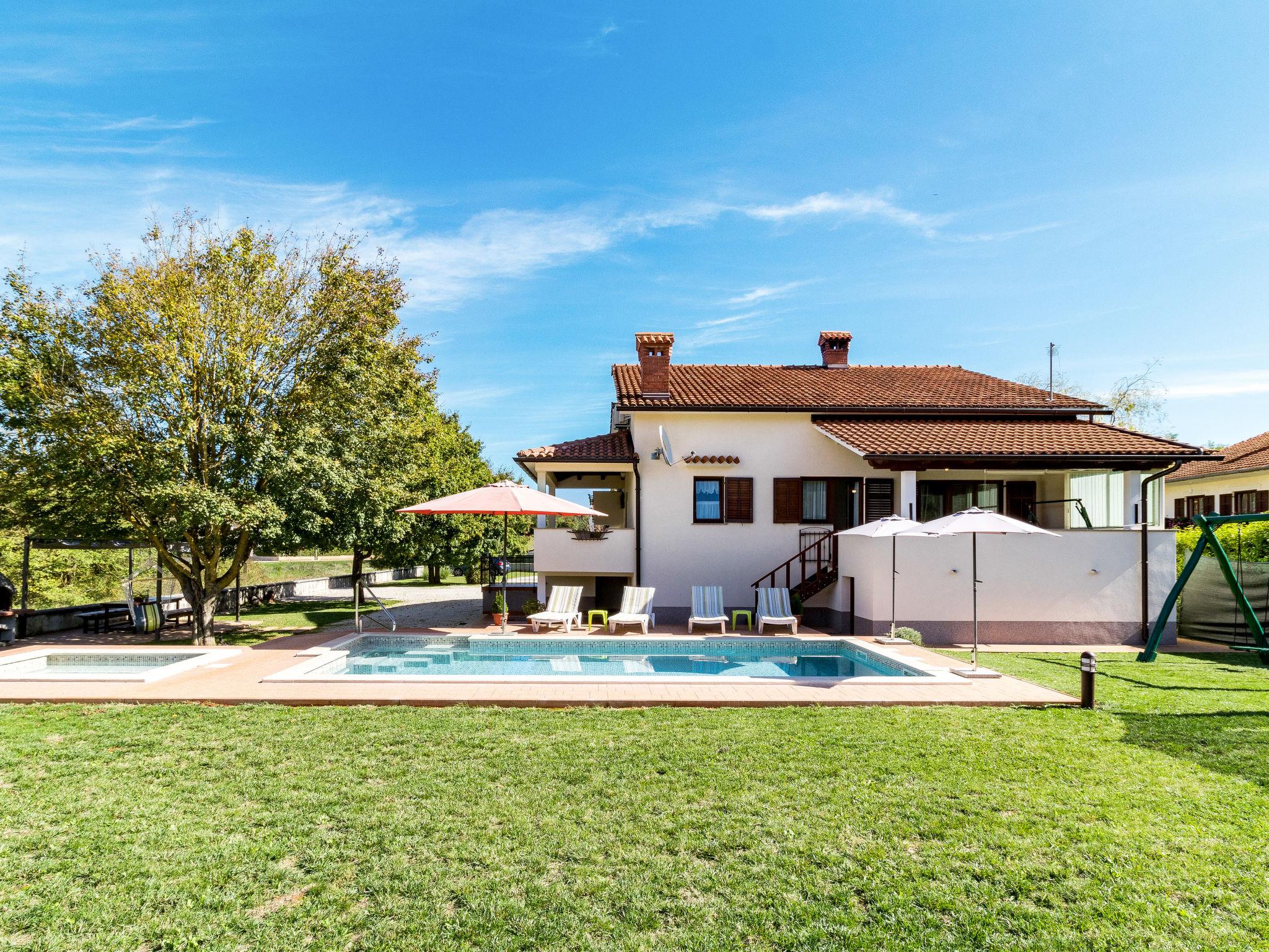 Semi-detached house "Poje", 3 storeys. In the hamlet Škropeti 3 km from the centre of Karojba, 9 km from the centre of Motovun, 27 km from the centre of Porec, 27 km from the sea. Private: property 1'200 m2 with lawn and trees, swimming pool angular (8 x 3 m, depth 135 cm, seasonal availability: 01.May. - 01.Oct.) with internal staircase. Paddling pool, outdoor shower, table tennis, terrace (9 m2), garden furniture, barbecue (swing), pool maintenance by the owner/gardener. In the house: internet access, washing machine. Parking (for 3 cars) on the premises. Shop 1 km, supermarket 10 km, restaurant 8 km, bus stop 12 km, railway station 12 km, rocky beach 27 km. Marina 27 km. The owner does not accept any youth groups. Please note: the owner lives on the same property.