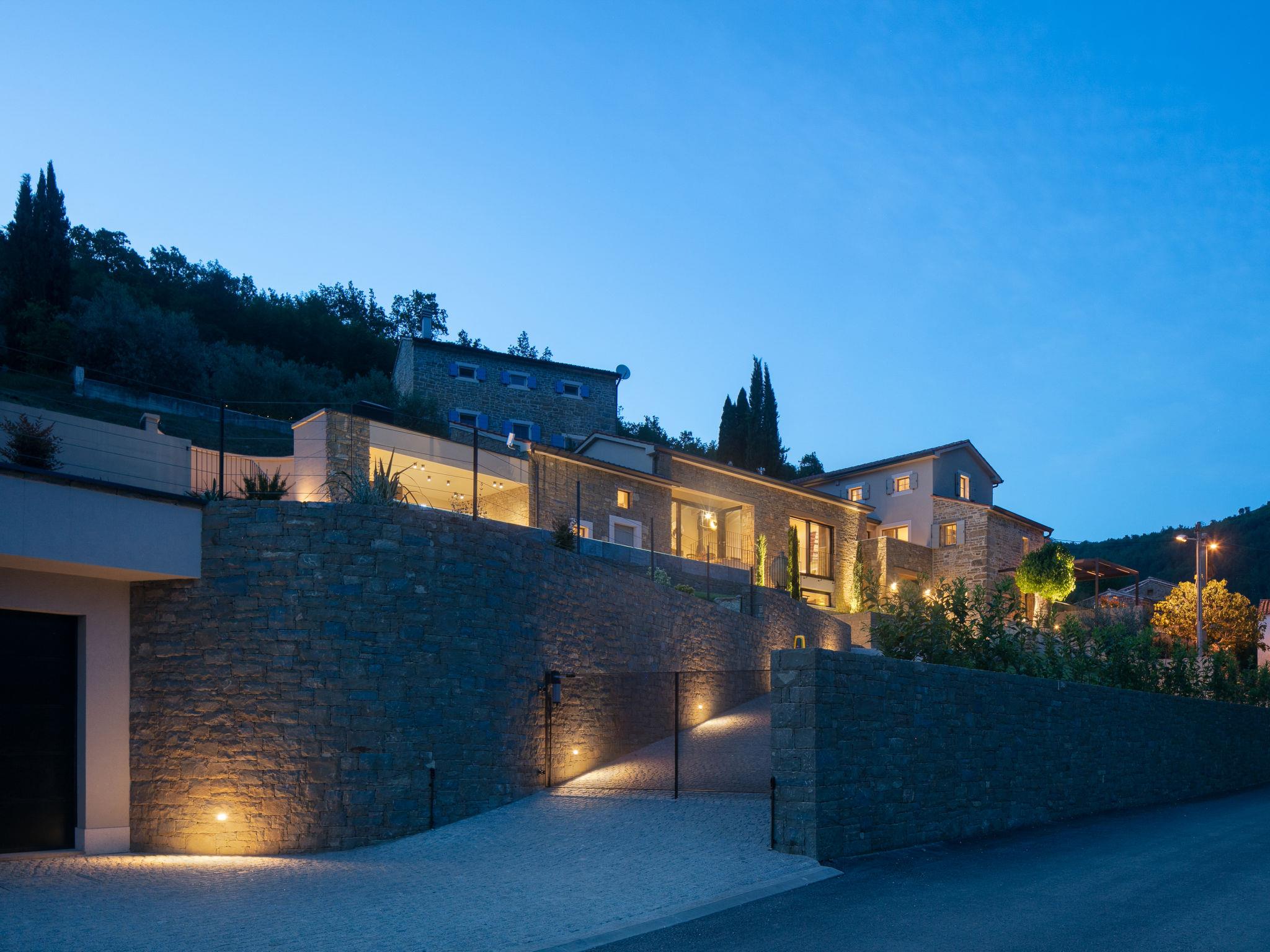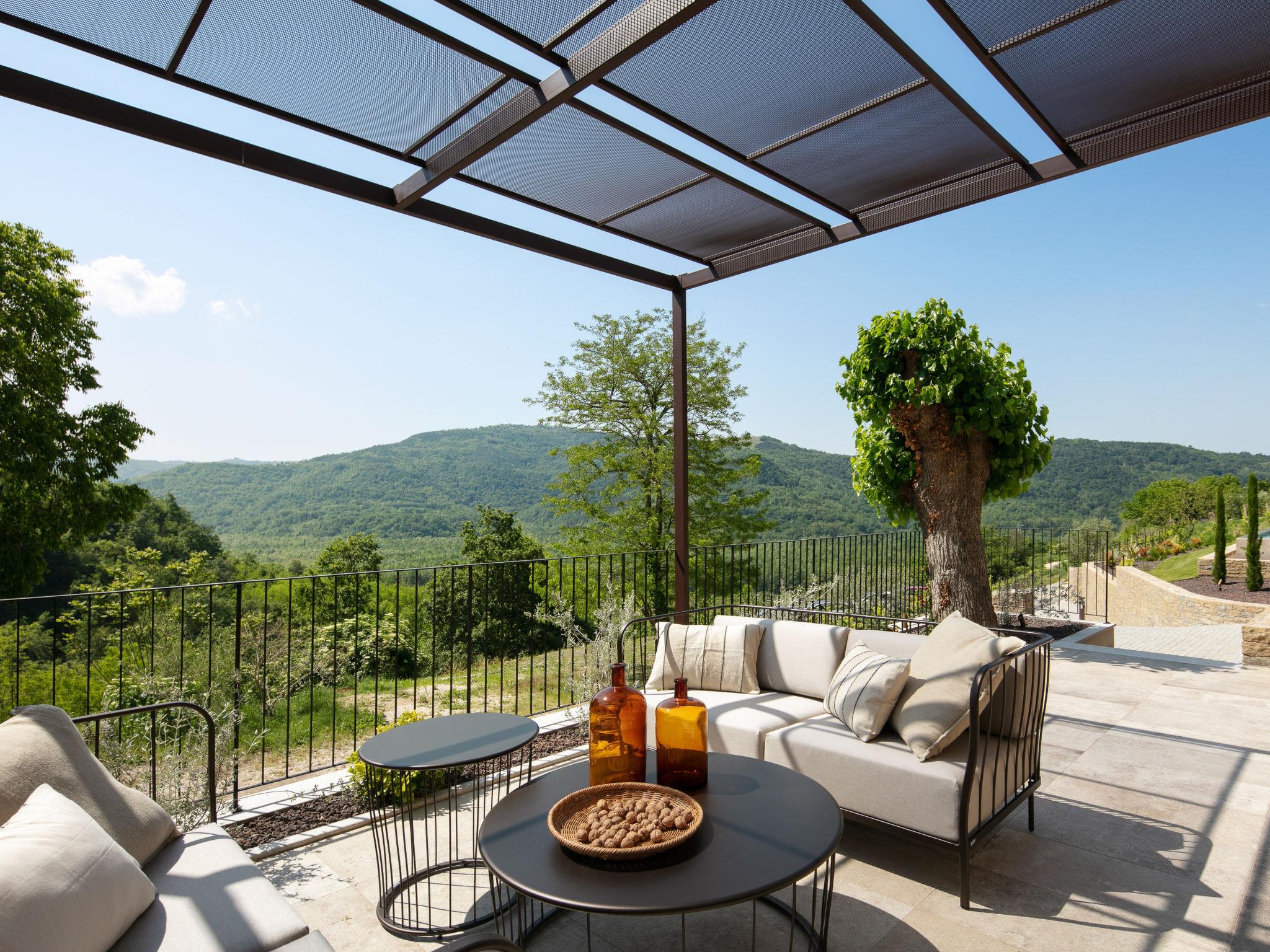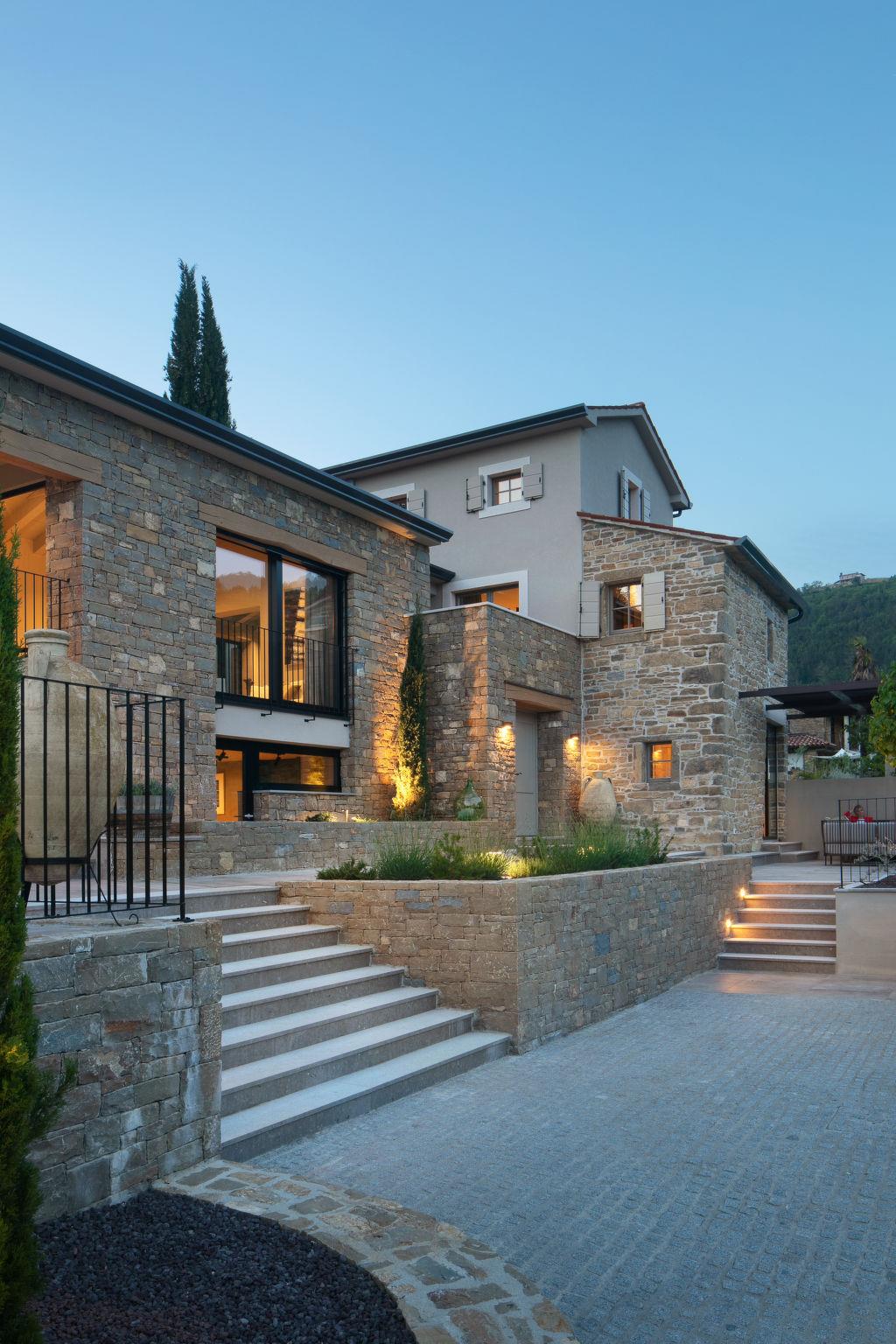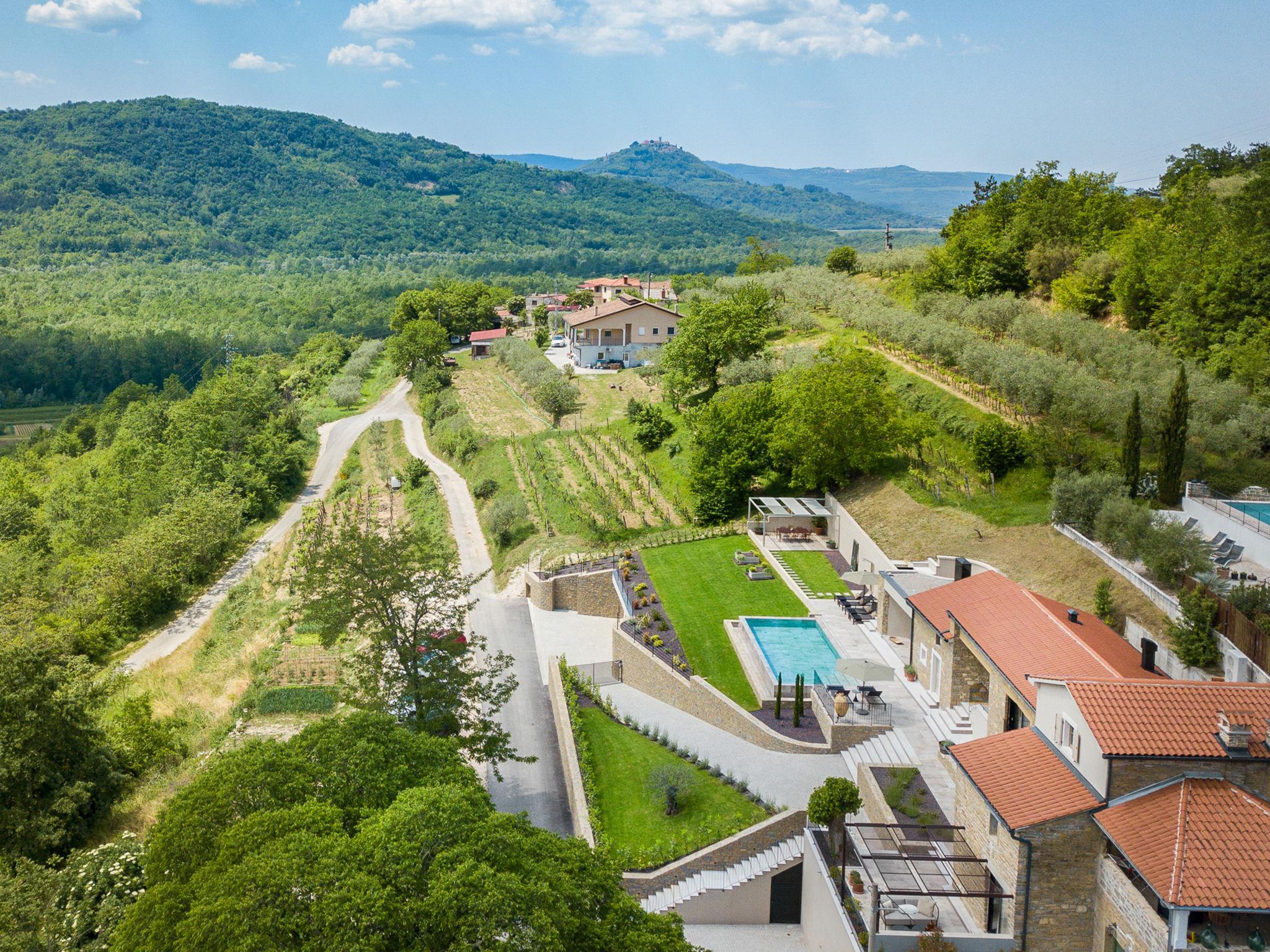 Beautiful villa "Panorama del Tartufo", 3 storeys, renovated in 2023. In the hamlet Žugani 8 km from the centre of Motovun, in a quiet, sunny position on a slope, 30 km from the sea, in the countryside. Private: property 1'200 m2, garden with lawn, swimming pool angular (10 x 4 m, depth 140 cm, seasonal availability: 01.May. - 30.Sep.) with internal staircase. Shower/WC in the pool area, outdoor shower, terrace (50 m2), garden furniture, barbecue. In the house: internet access, sauna, relaxation room, playroom, table football, trampoline, central heating system, air conditioning, washing machine. Parking (for 3 cars) at the house on the premises. Shop 8 km, supermarket 15 km, shopping centre 26 km, restaurant 4 km, bus stop 12 km, railway station 14 km, pebble beach 30 km, rocky beach 30 km, thermal baths 7 km. Walking paths from the house 50 m. The owner does not accept any youth groups. Please note: airfield 50 km from the property. Massage (extra) on request. Welcome pack with truffle products on arrival.