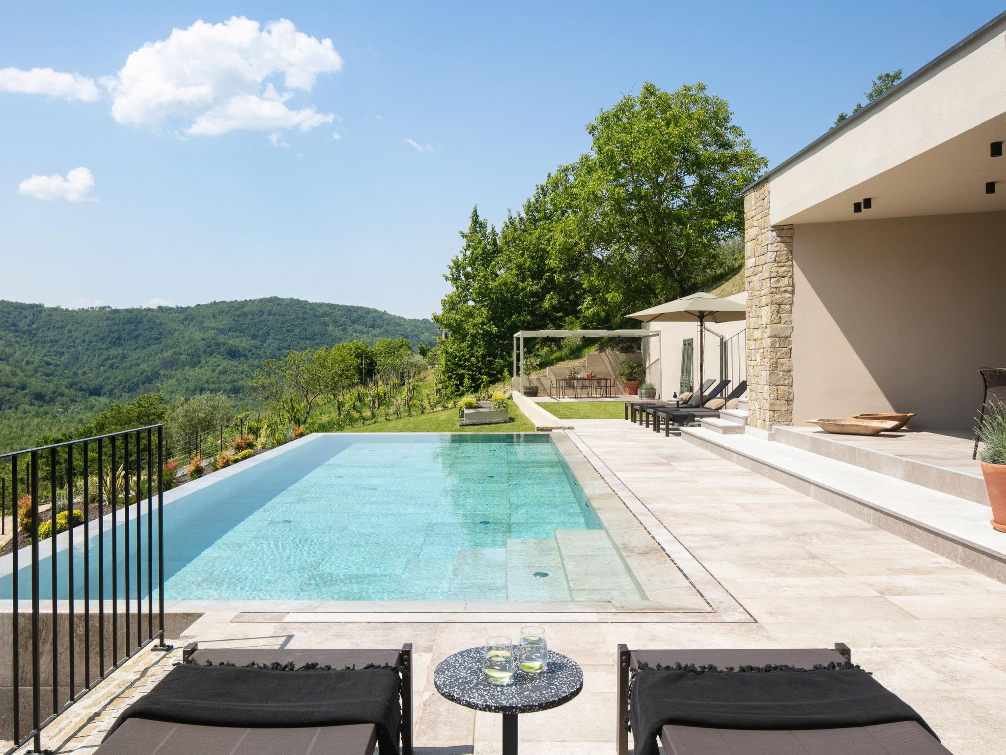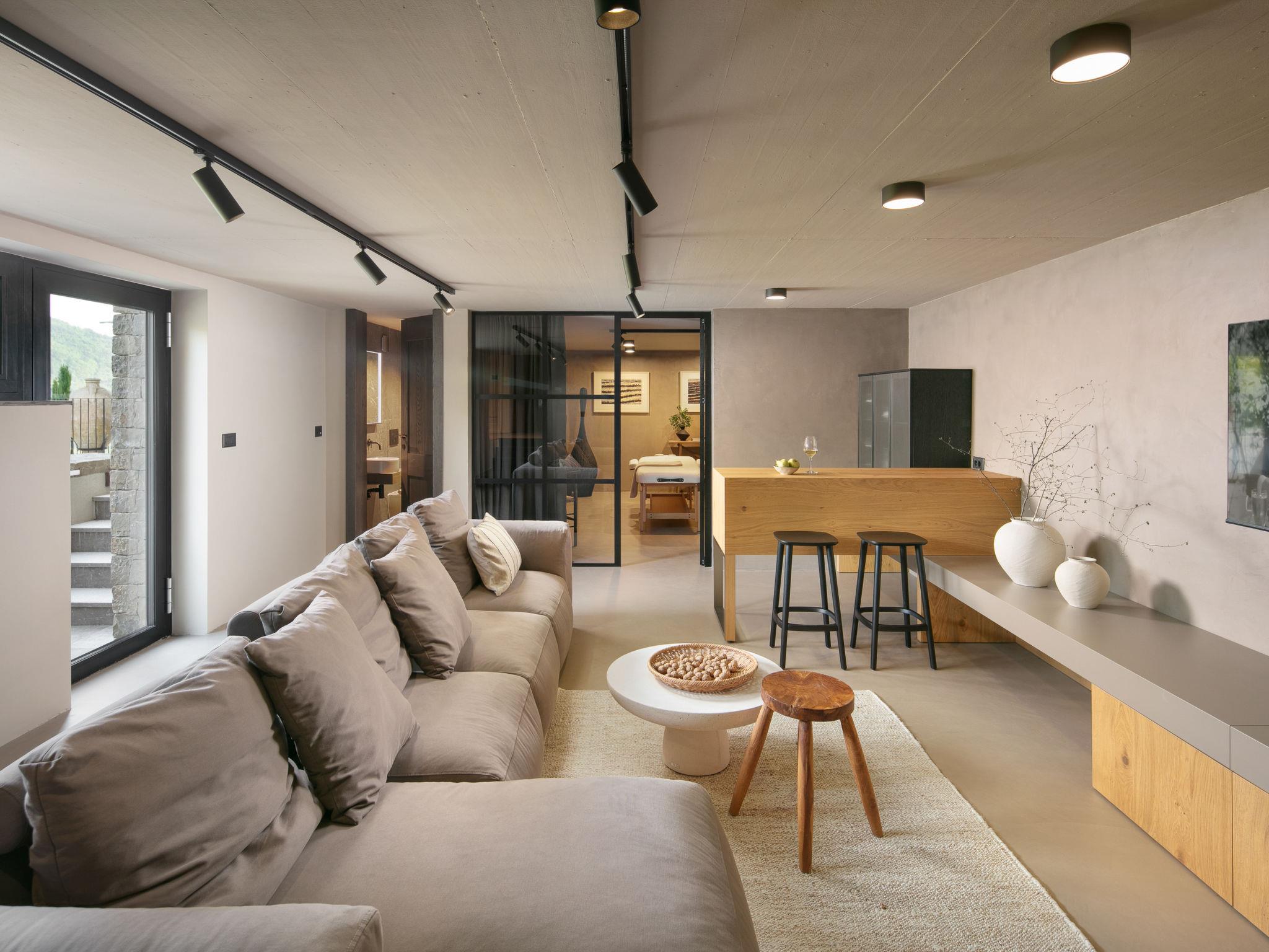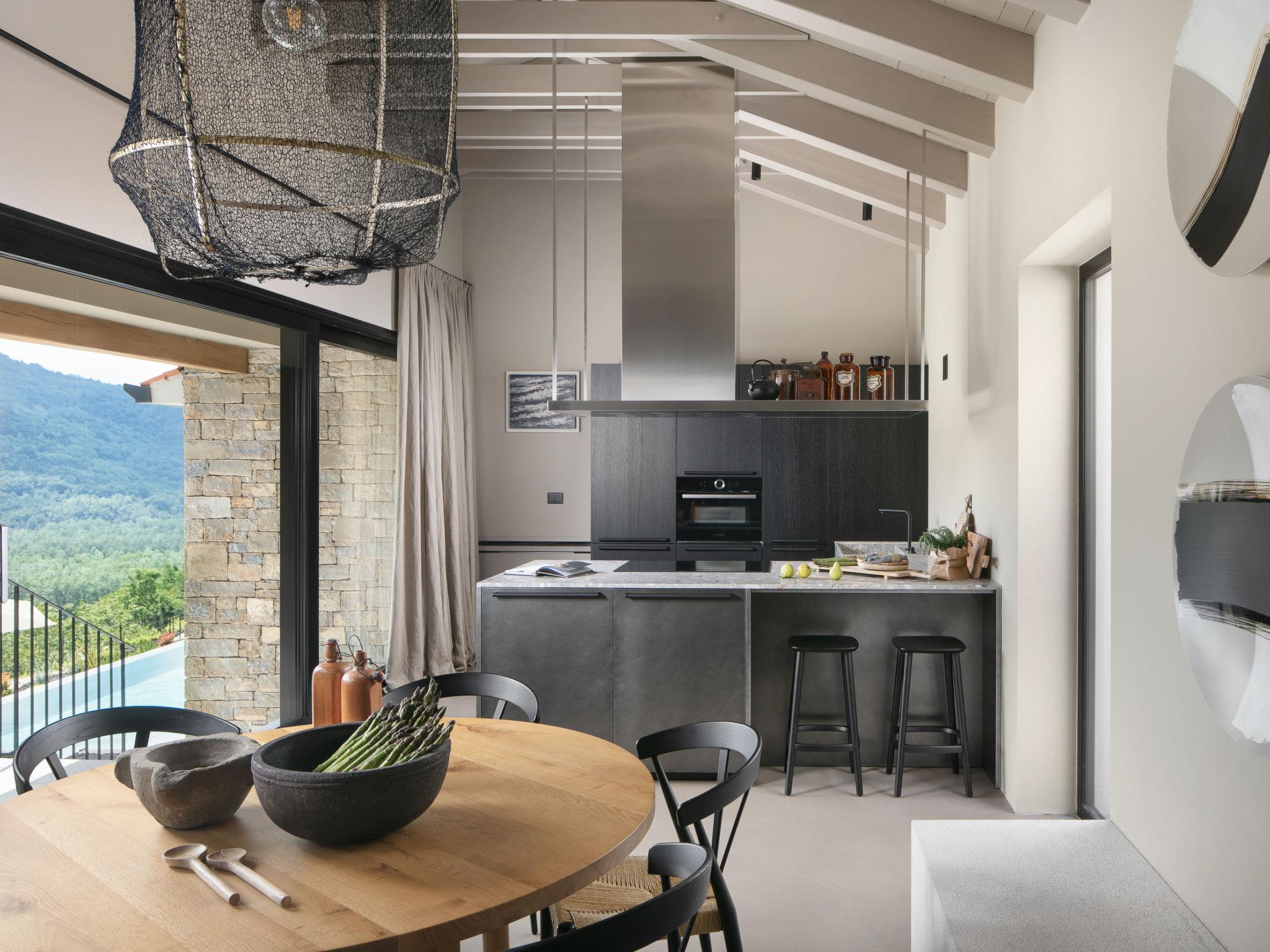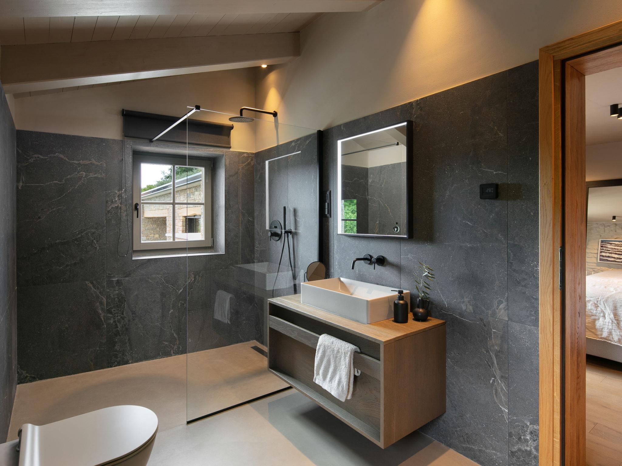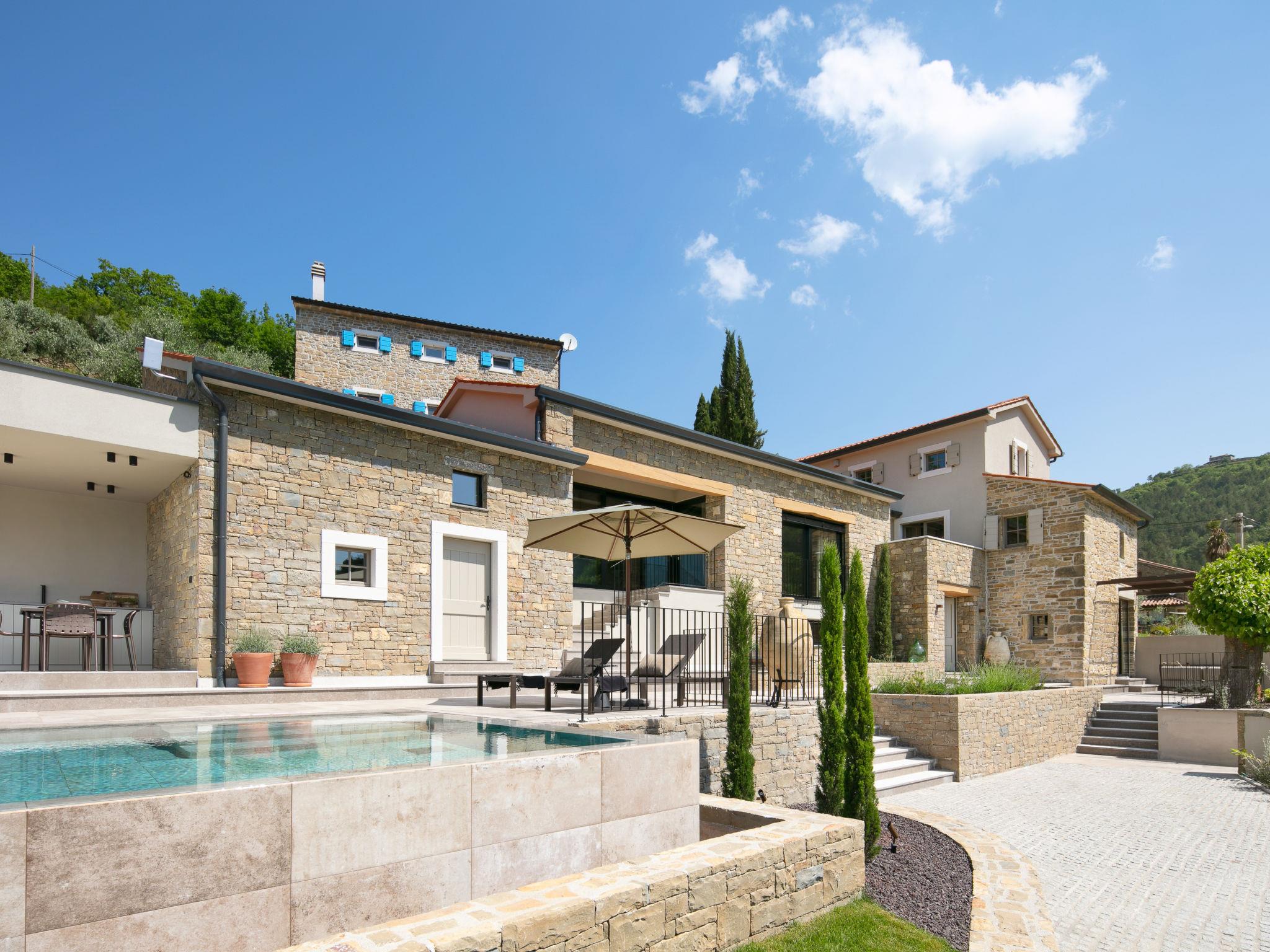 Beautiful villa "Panorama del Tartufo", 3 storeys, renovated in 2023. In the hamlet Žugani 8 km from the centre of Motovun, in a quiet, sunny position on a slope, 30 km from the sea, in the countryside. Private: property 1'200 m2, garden with lawn, swimming pool angular (10 x 4 m, depth 140 cm, seasonal availability: 01.May. - 30.Sep.) with internal staircase. Shower/WC in the pool area, outdoor shower, terrace (50 m2), garden furniture, barbecue. In the house: internet access, sauna, relaxation room, playroom, table football, trampoline, central heating system, air conditioning, washing machine. Parking (for 3 cars) at the house on the premises. Shop 8 km, supermarket 15 km, shopping centre 26 km, restaurant 4 km, bus stop 12 km, railway station 14 km, pebble beach 30 km, rocky beach 30 km, thermal baths 7 km. Walking paths from the house 50 m. The owner does not accept any youth groups. Please note: airfield 50 km from the property. Massage (extra) on request. Welcome pack with truffle products on arrival.