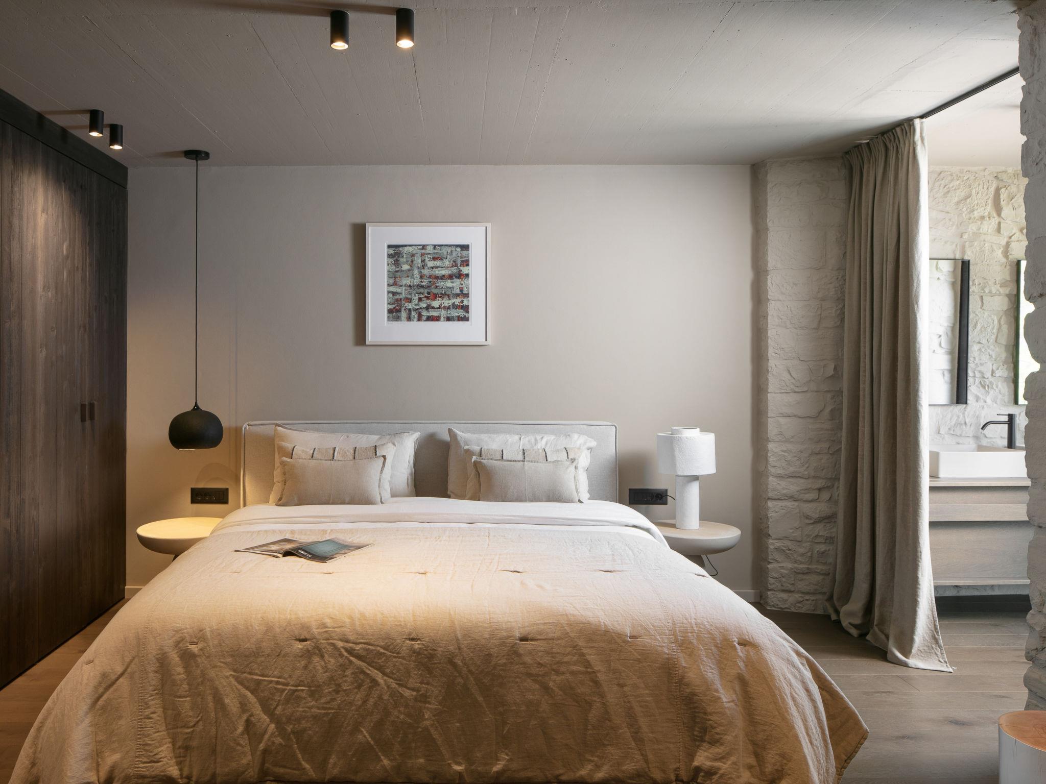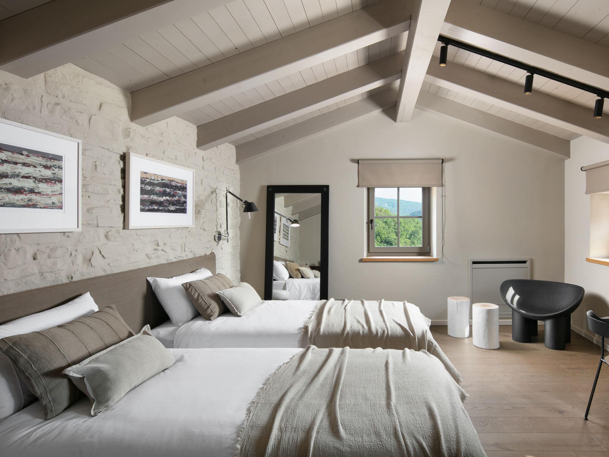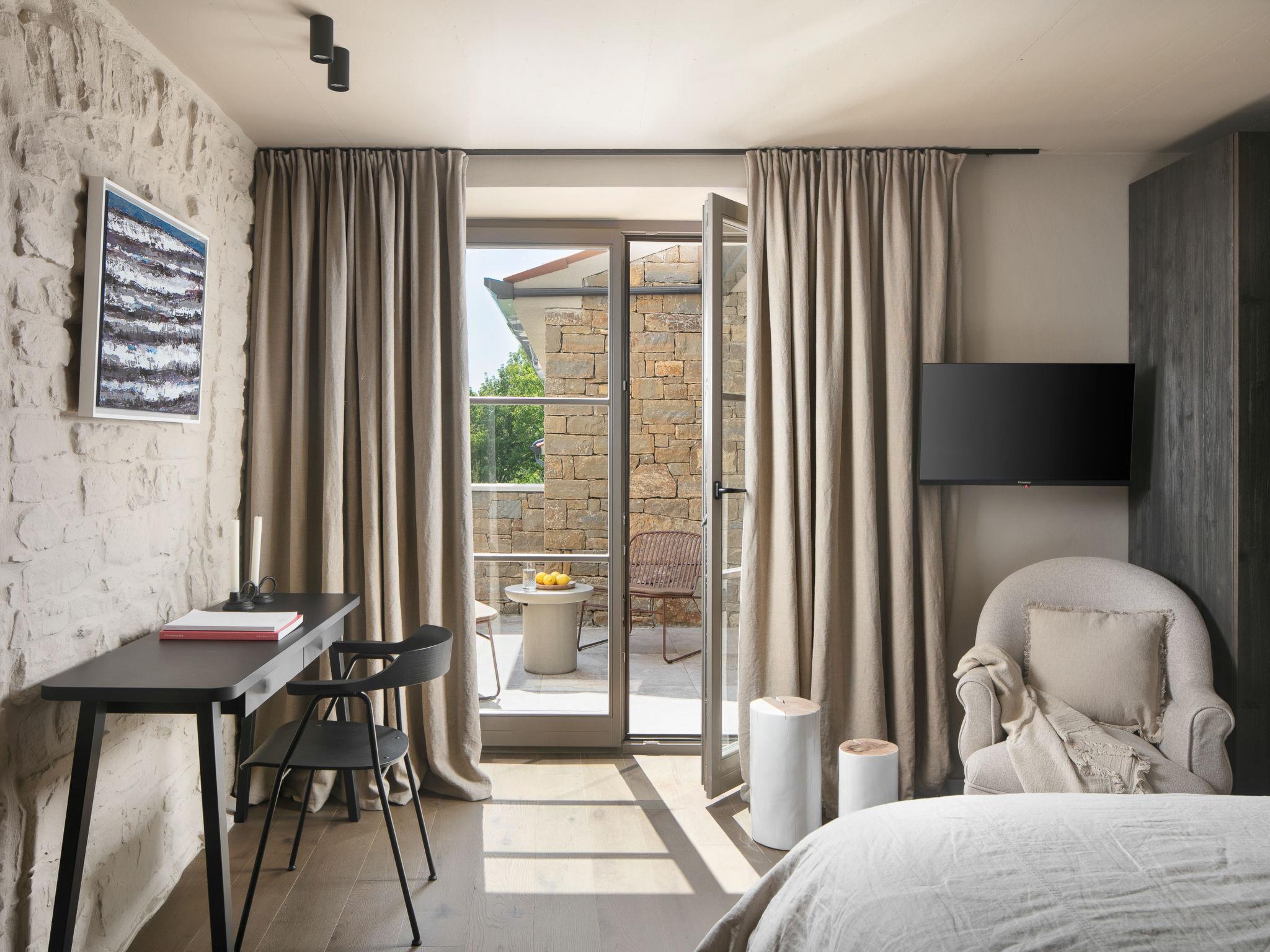 5-room villa 270 m2 on 3 levels. Living/dining room with satellite TV. Exit to the terrace, to the swimming pool. 1 room with 1 french bed (180 cm, length 200 cm), bath/shower/WC and satellite TV. Exit to the balcony. Open kitchen (oven, dishwasher, 6 induction hot plates, toaster, kettle, microwave, freezer, electric coffee machine). Sep. WC. On the lower ground floor: living room with satellite TV. Exit to the terrace. 1 room with 1 french bed (180 cm, length 200 cm), shower/WC, double hand-basin and satellite TV. Exit to the terrace. Sep. WC. Upper floor: 1 room with 2 beds (90 cm, length 200 cm), satellite TV. Shower/WC. Balcony 4 m2, terrace 10 m2. Terrace furniture, deck chairs. View of the countryside. Facilities: safe, children's high chair, baby cot, hair dryer. Internet (WiFi, free). Please note: non-smoking house.