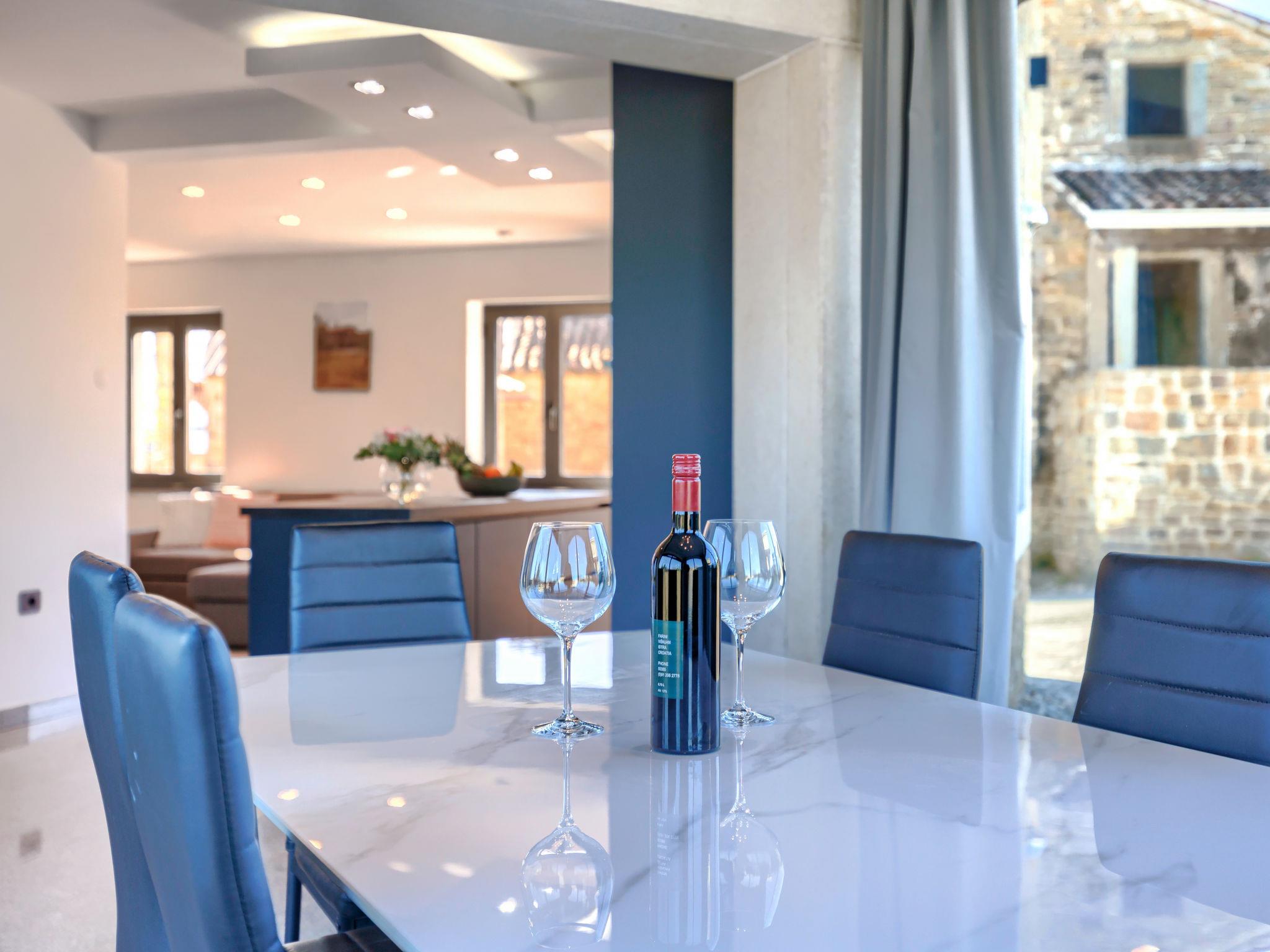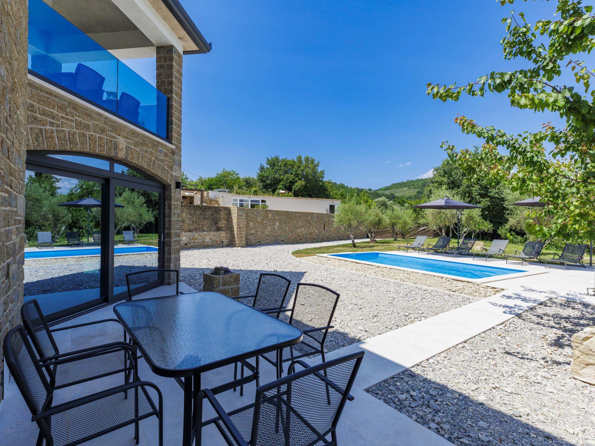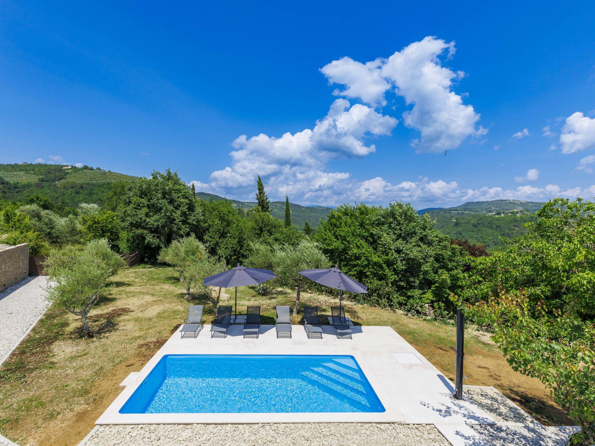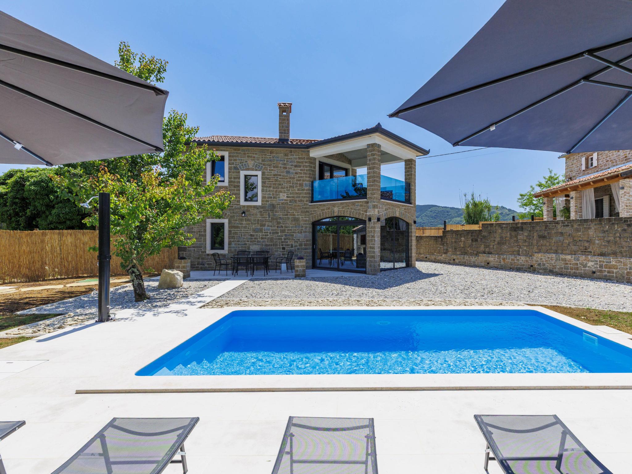 Beautiful, luxurious villa "Solaria", 2 storeys in 2024. In the hamlet Krti 8 km from the centre of Motovun, 15 km from the centre of Buzet, in a quiet position, 30 km from the sea. Private: property 450 m2 (fenced), swimming pool angular (3 x 6 m, depth 140 cm, seasonal availability: 15.Apr. - 01.Nov.) with internal staircase. Outdoor shower, terrace, garden furniture, barbecue. In the house: internet access, washing machine, tumble dryer. Parking (for 2 cars) at the house on the premises. Shop 7 km, supermarket 10 km, restaurant 7 km, bus stop 15 km, 5 km. Walking paths from the house 50 m. Nearby attractions: Winery 8 km. Please note: airfield 45 km from the property.