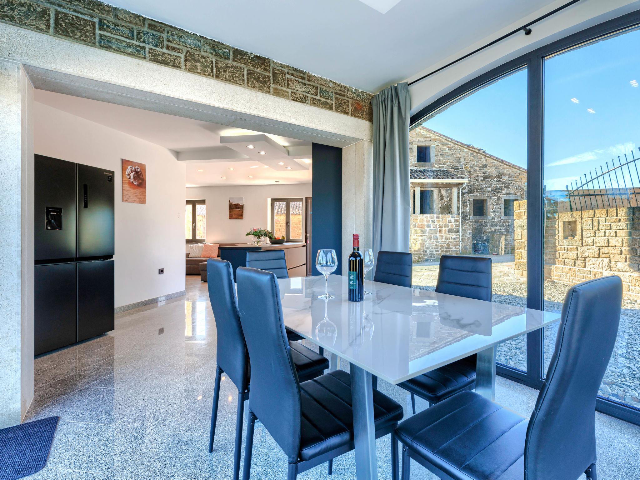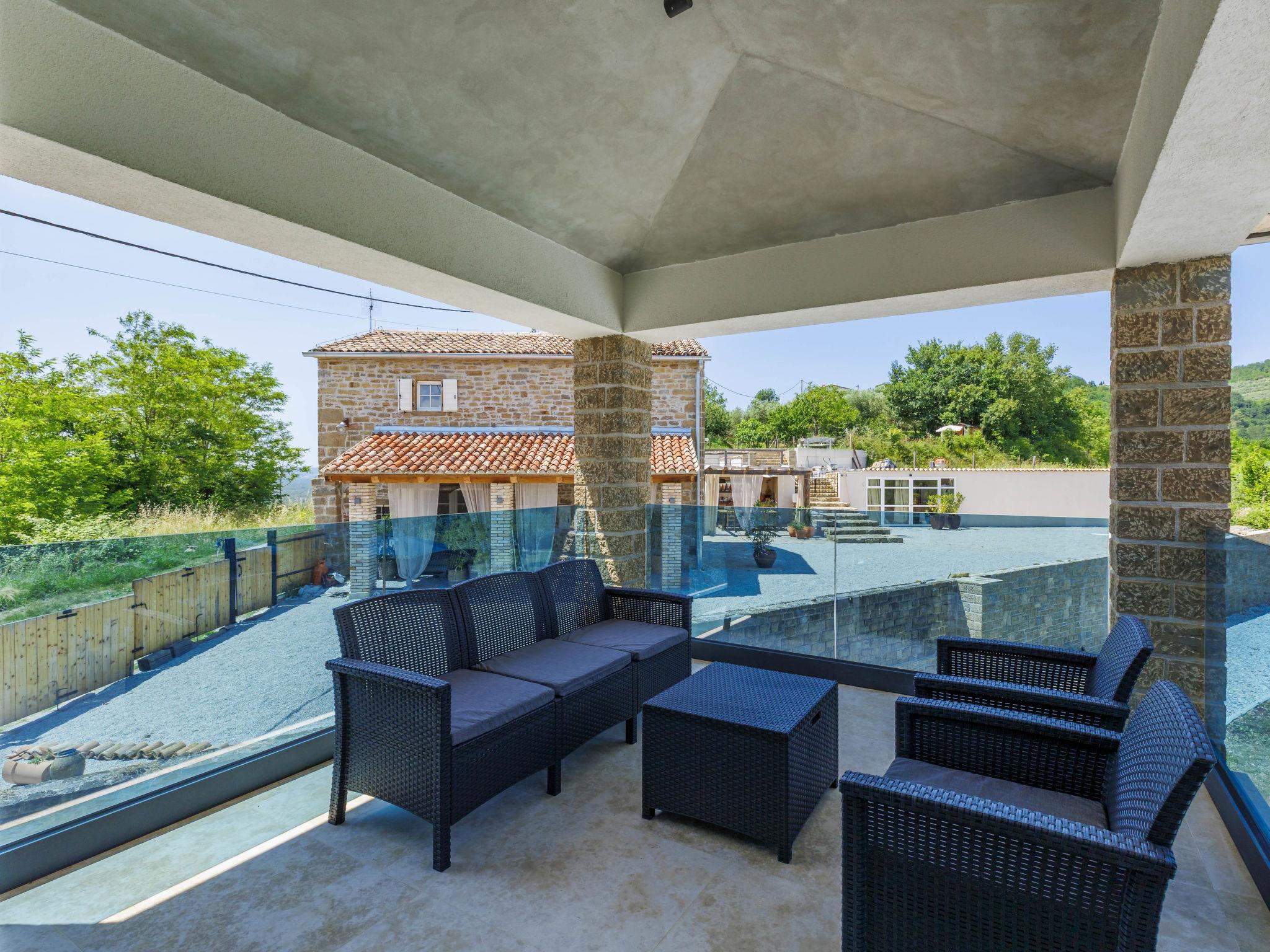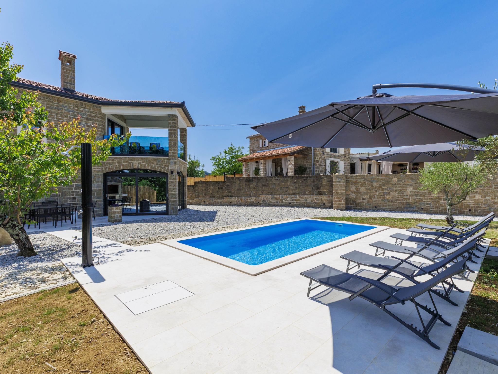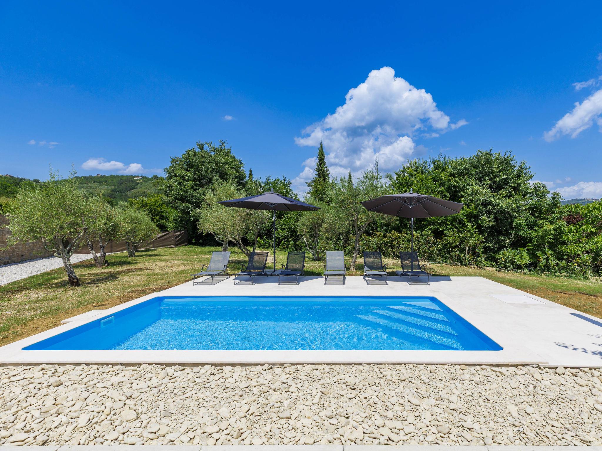 Beautiful, luxurious villa "Solaria", 2 storeys in 2024. In the hamlet Krti 8 km from the centre of Motovun, 15 km from the centre of Buzet, in a quiet position, 30 km from the sea. Private: property 450 m2 (fenced), swimming pool angular (3 x 6 m, depth 140 cm, seasonal availability: 15.Apr. - 01.Nov.) with internal staircase. Outdoor shower, terrace, garden furniture, barbecue. In the house: internet access, washing machine, tumble dryer. Parking (for 2 cars) at the house on the premises. Shop 7 km, supermarket 10 km, restaurant 7 km, bus stop 15 km, 5 km. Walking paths from the house 50 m. Nearby attractions: Winery 8 km. Please note: airfield 45 km from the property.