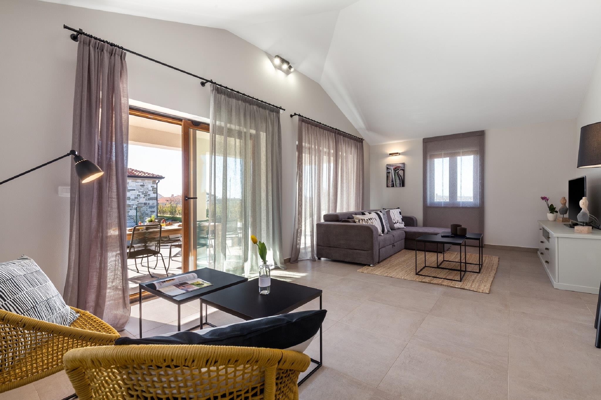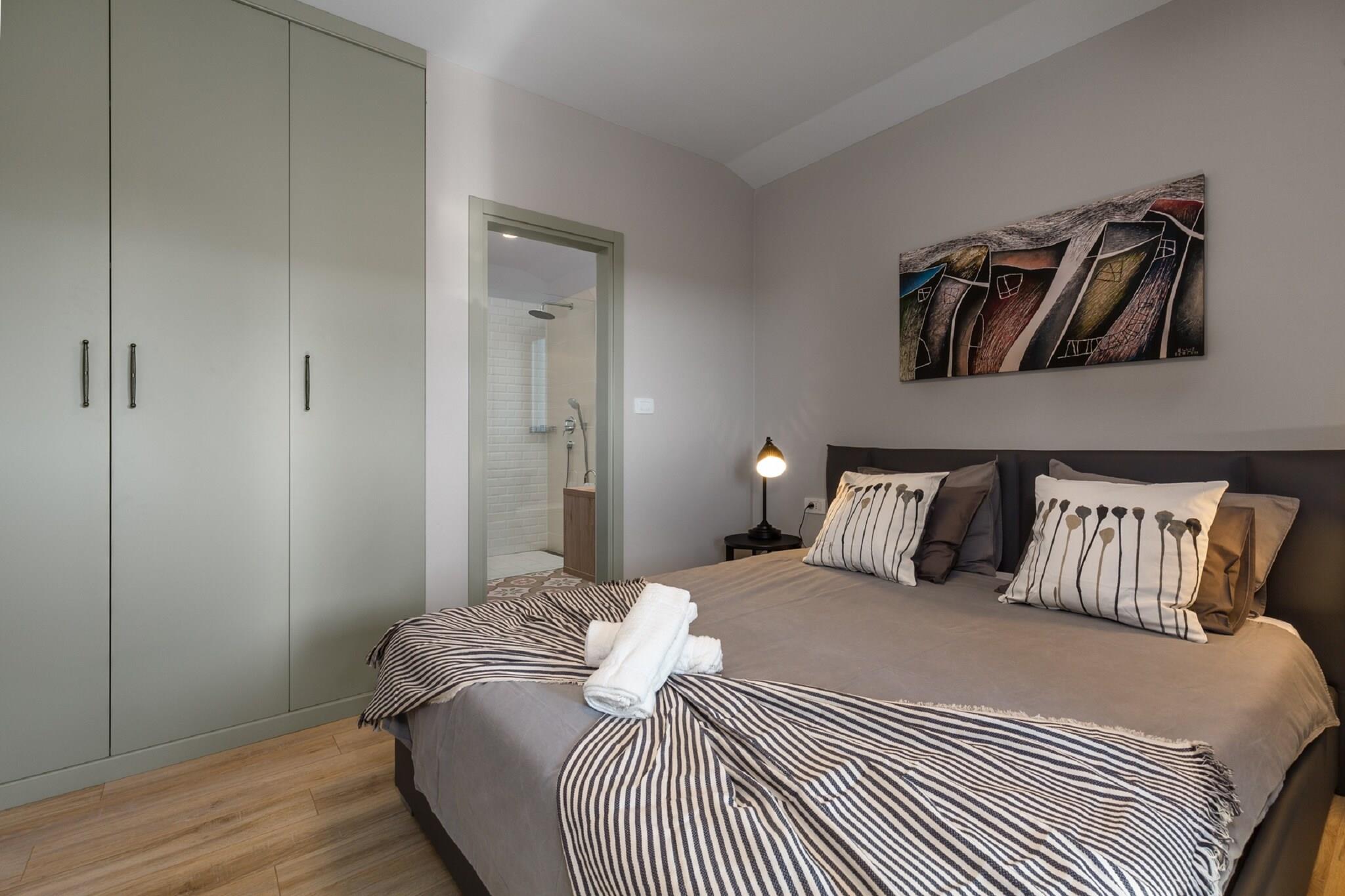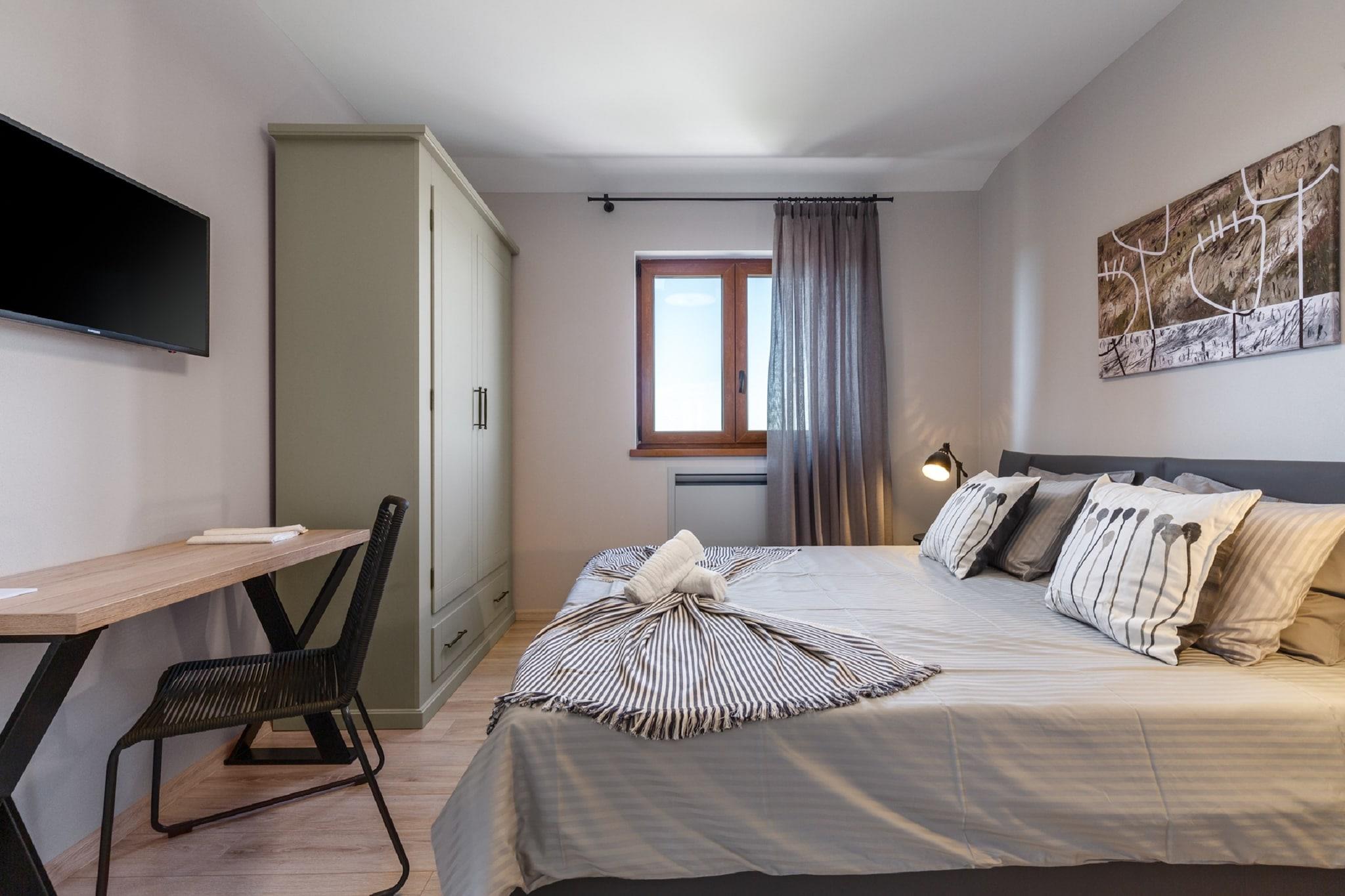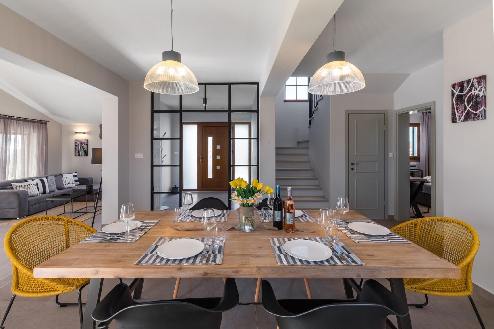 Denne villa til otte gæster ligger i det fredfyldte landskab i Motovun, Karojba, og tilbyder en luksuriøs oase med gratis WiFi og privat swimmingpool. Beliggende kun 8 km fra Motovun og 25 km fra havet, er dette tilflugtssted perfekt til dem, der søger afslapning og eventyr. Uanset om du slapper af på den private terrasse, nyder et måltid i den indhegnede gårdhave eller udforsker nærliggende attraktioner, garanterer denne villa et mindeværdigt ophold. Indenfor finder du i stueetagen en rummelig stue med en dobbelt sovesofa, satellit-tv og et hyggeligt siddeområde, en spisestue med et stort bord og et fuldt udstyret køkken med elkedel, brødrister, kaffemaskine, ovn, mikrobølgeovn, opvaskemaskine og køleskab med fryser. Første sal indeholder to soveværelser med eget badeværelse, et med en dobbeltseng og et andet med køjesenge, begge med satellit-tv og aircondition. Yderligere faciliteter inkluderer en udendørs bruser, vaskemaskine, strygebræt og et loungesæt til ultimativ afslapning. I nærheden tilbyder den bjergtopbefæstede gamle by Motovun en betagende udsigt og middelalderlig charme, mens Motovun-skoven er berømt for sine værdsatte hvide trøfler. Til spisning serverer Konoba Mondo udsøgte trøffelretter, mens Montona Gallery tilbyder middelhavssmage med en fantastisk udsigt. Uanset om du udforsker historie eller nyder lokale delikatesser, er denne villa det perfekte tilflugtssted.