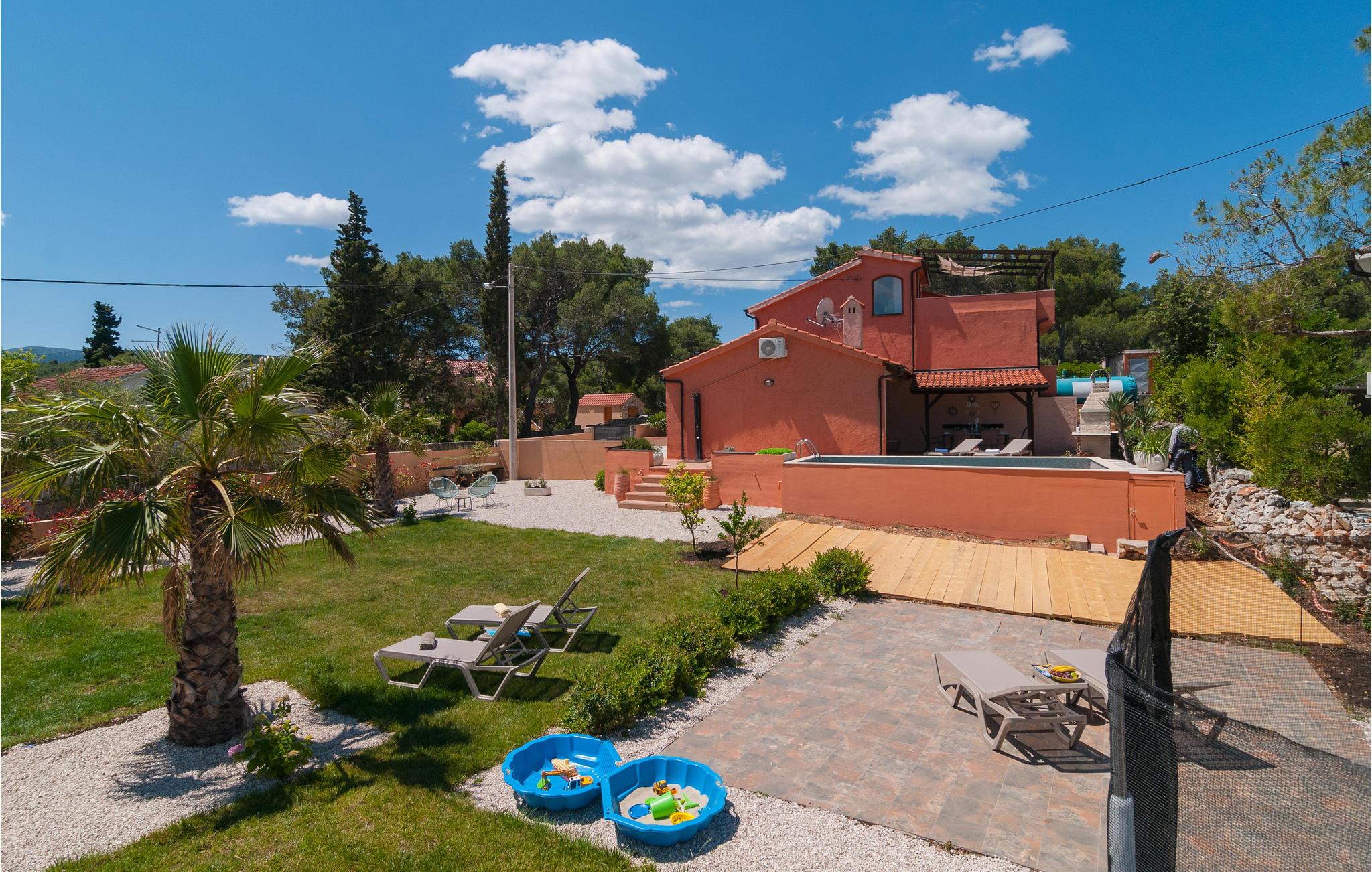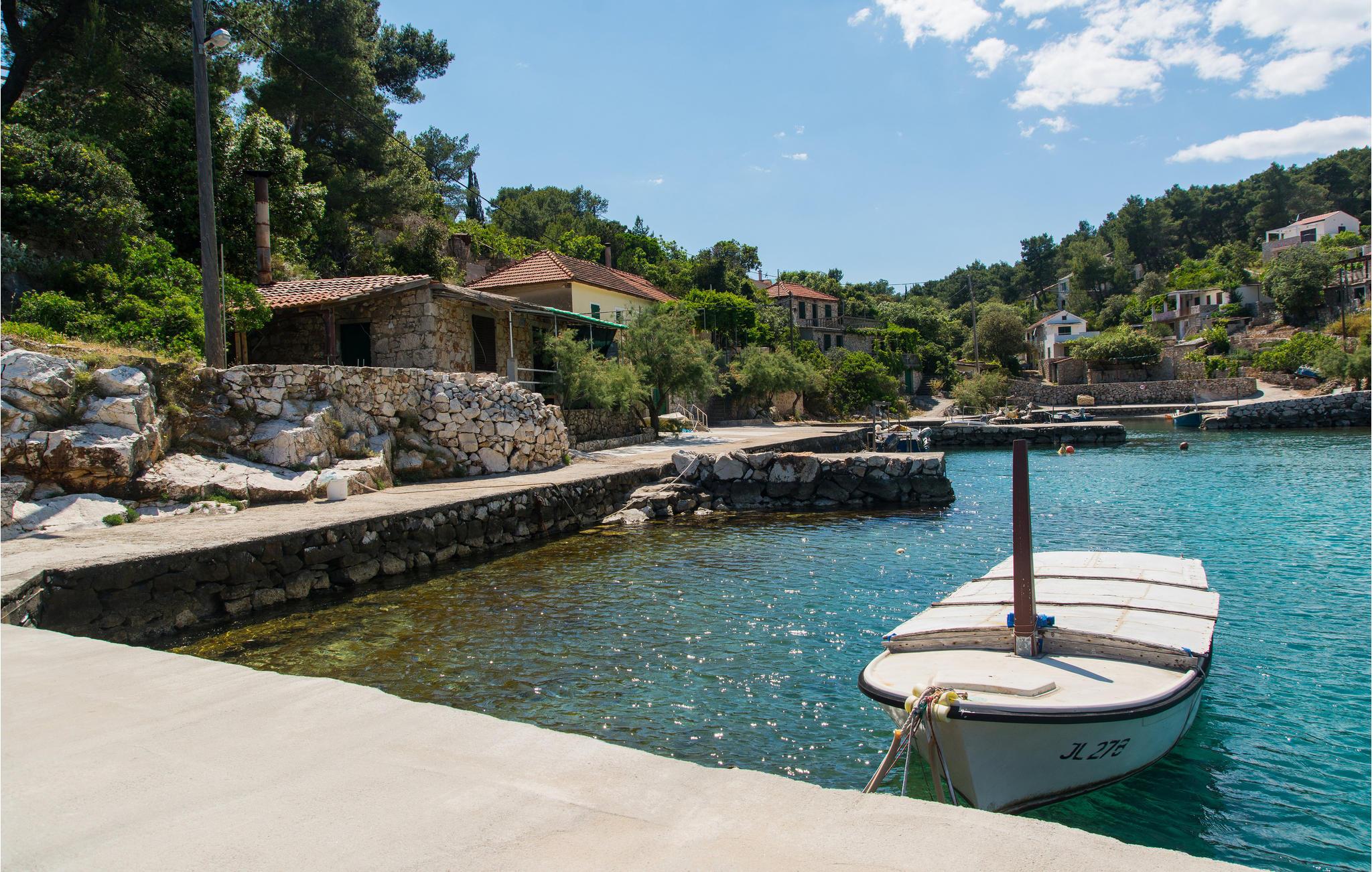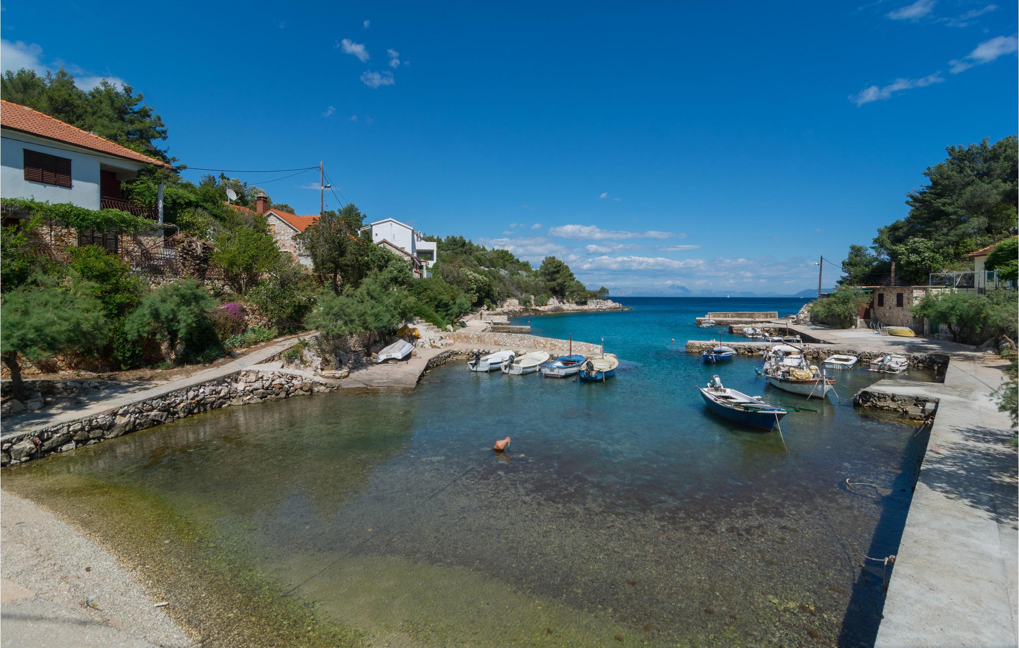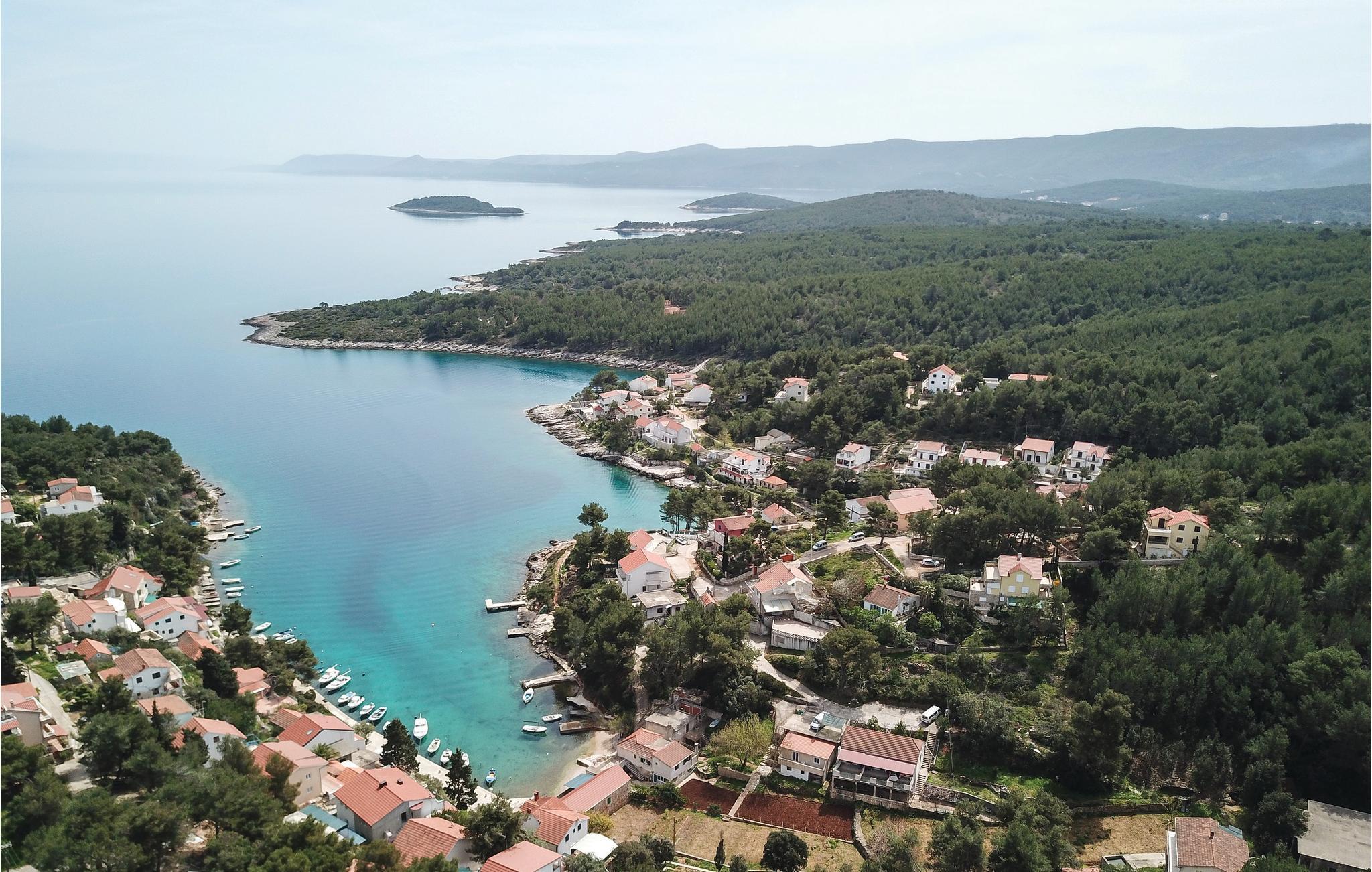 Dette dejlige feriehus ligger ud til bugten Mudri Dolac. Huset er omgivet af pinjetræer og middelhavsplanter, ideelt til en skøn familieferie. Til huset hører en terrasse med muret grill, hvor I kan slappe af efter en tur i den indbydende pool. Der er bordtennisbord til en frisk feriedyst og en trampolin til andre sportslige udfoldelser. I huset er der fire soveværelser, en sauna i tagetagen, hvorfra I når terrassen. Etagerne er forbundet med indendørs trapper. Kiselstranden ligger 150 m nede ad bjerget. Der er kun 5 km til den nærmeste største by på øen, omgivet af smuk natur, rig på kultur og historie, og hvor I kan smage på øens nationale retter på flere restauranter. På grund af beliggenheden er en bil oplagt.
