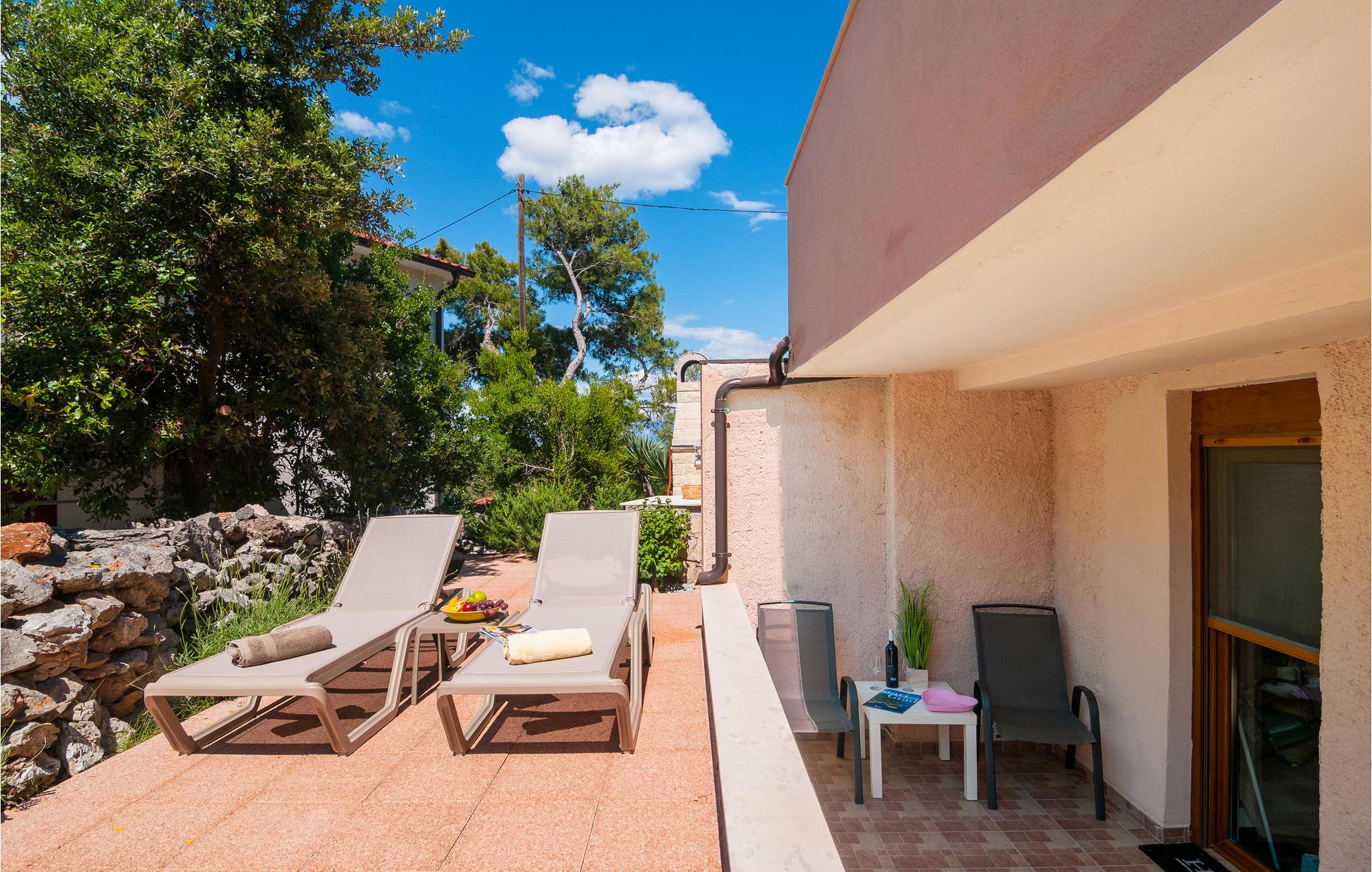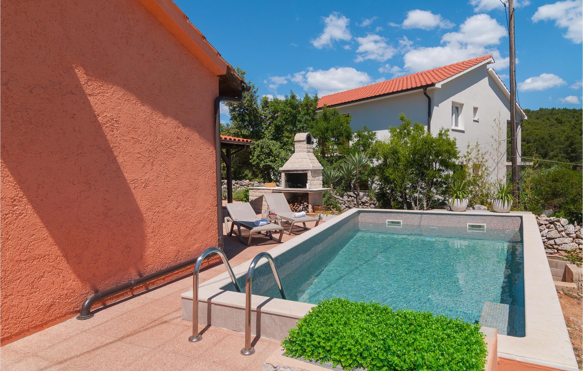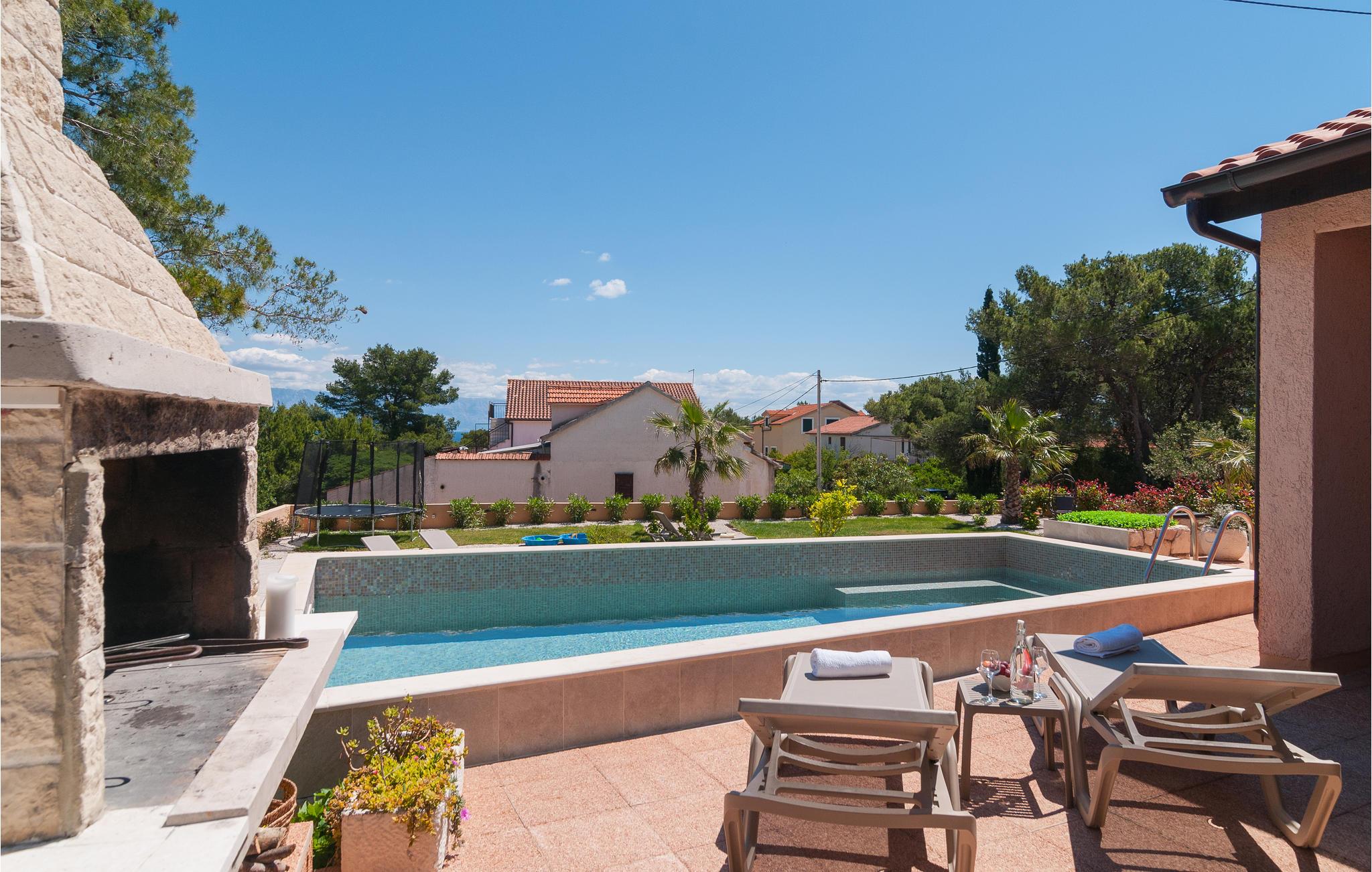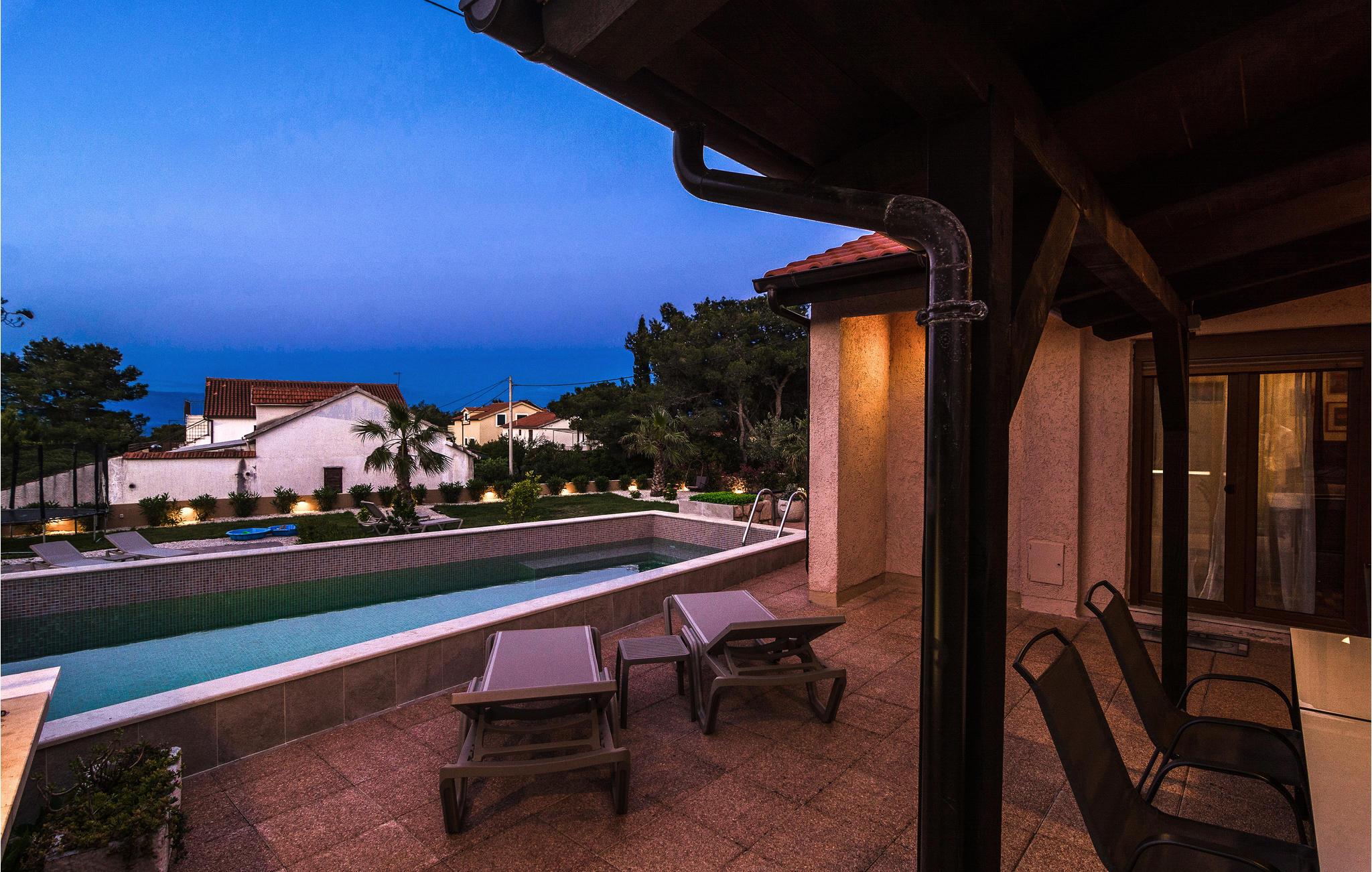 Dette dejlige feriehus ligger ud til bugten Mudri Dolac. Huset er omgivet af pinjetræer og middelhavsplanter, ideelt til en skøn familieferie. Til huset hører en terrasse med muret grill, hvor I kan slappe af efter en tur i den indbydende pool. Der er bordtennisbord til en frisk feriedyst og en trampolin til andre sportslige udfoldelser. I huset er der fire soveværelser, en sauna i tagetagen, hvorfra I når terrassen. Etagerne er forbundet med indendørs trapper. Kiselstranden ligger 150 m nede ad bjerget. Der er kun 5 km til den nærmeste største by på øen, omgivet af smuk natur, rig på kultur og historie, og hvor I kan smage på øens nationale retter på flere restauranter. På grund af beliggenheden er en bil oplagt.