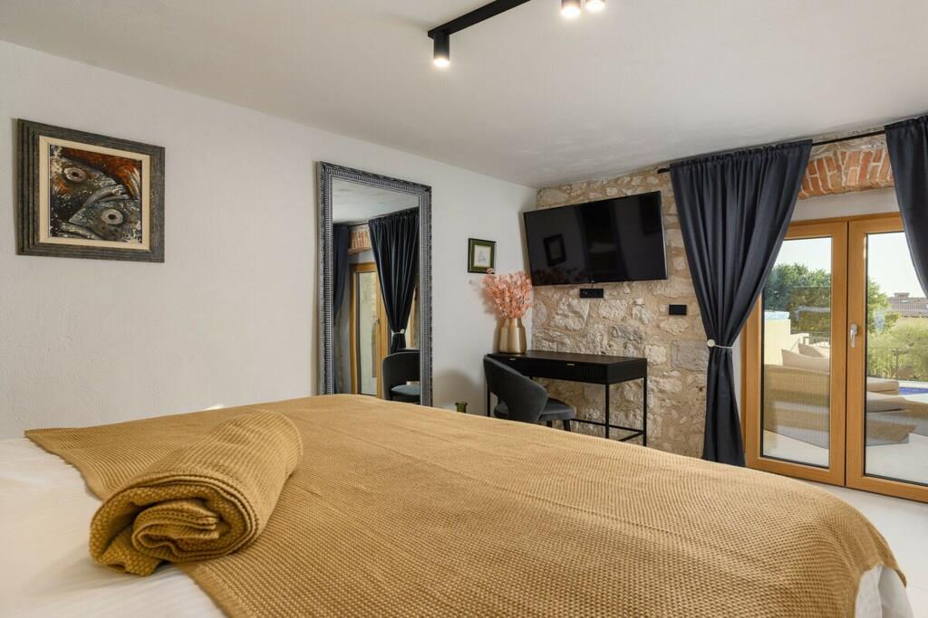 Casa Mar i Mugeba, Istrien, er en nyrestaureret istrisk stenvilla med en fantastisk havudsigt. Den har en charmerende have med privat pool, grillplads og parkering på stedet. Den består af en stue, spisestue, køkken og badeværelse med bruser på øverste etage samt to dobbeltværelser og et badeværelse med bruser i stueetagen. I et af soveværelserne kan dobbeltsengen laves om til to enkeltsenge. Havens hovedtræk er poolen og siddeområdet foran den, men også strandområdet, et andet område i nærheden af soveværelserne og en balkon ved indgangsdøren. Hvert område er separat, hvis du har brug for et roligt hjørne, men stadig tæt nok på til at være tæt på. Casa Mar ligger i den lille landsby Mugeba nær Porec med udsigt over Zelena Laguna. Det er tæt på Aquacolors, et vandland i Porec. De nærmeste strande, samt en skilift, adskillige barer og restauranter, ligger i Zelena Laguna. Uanset om du leder efter en romantisk getaway eller en familieferie, lover Casa Mar en uforglemmelig oplevelse i Istrien. Slap af i dette traditionelle istriske stenhus, og nyd den smukke Adriaterhavskyst. Dit istriske eventyr begynder på Casa Mar!