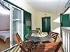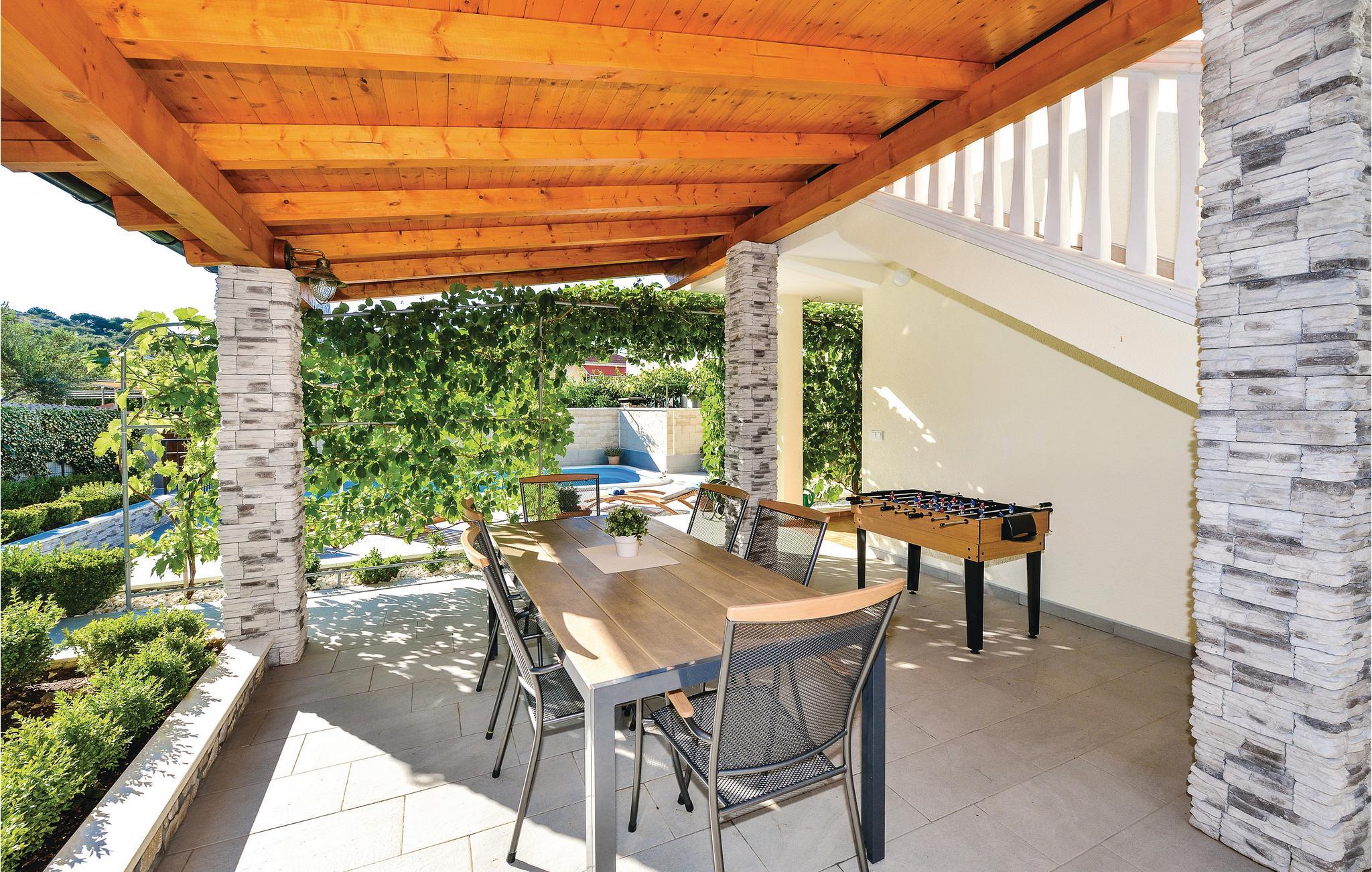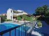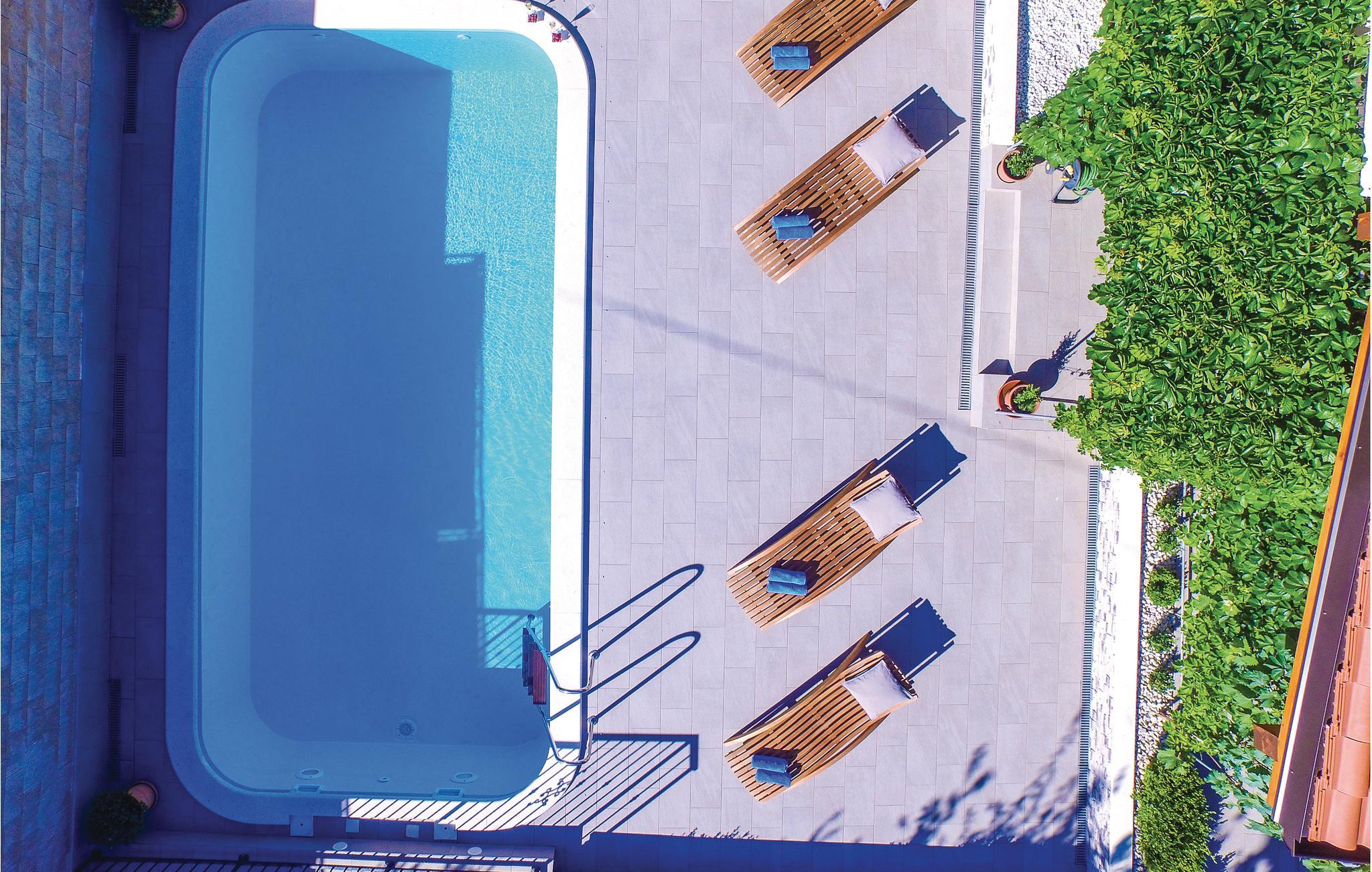 Dette smagfuldt indrettede feriehus med pool er fordelt på to etager, der er forbundet med udendørs trapper.