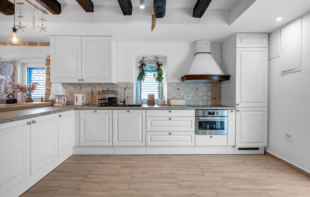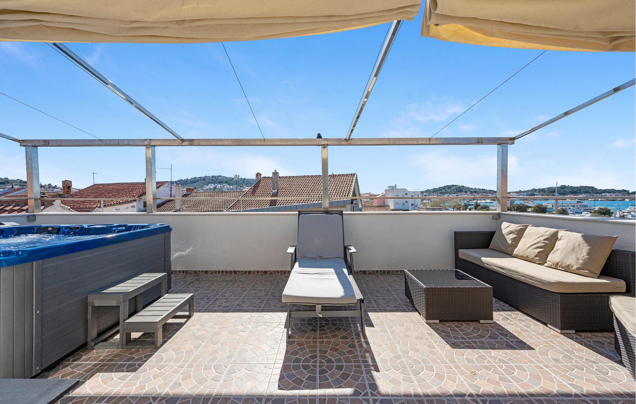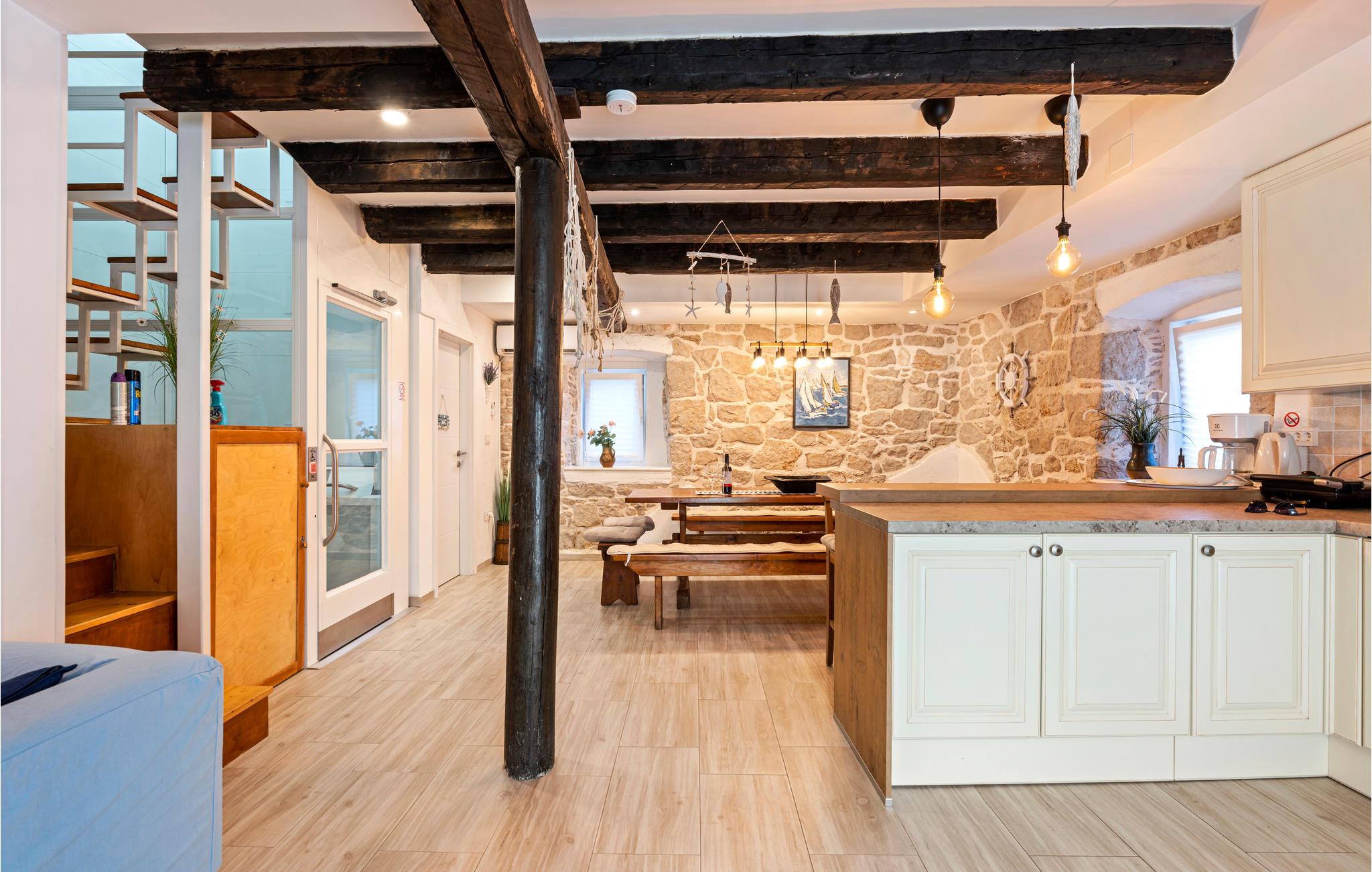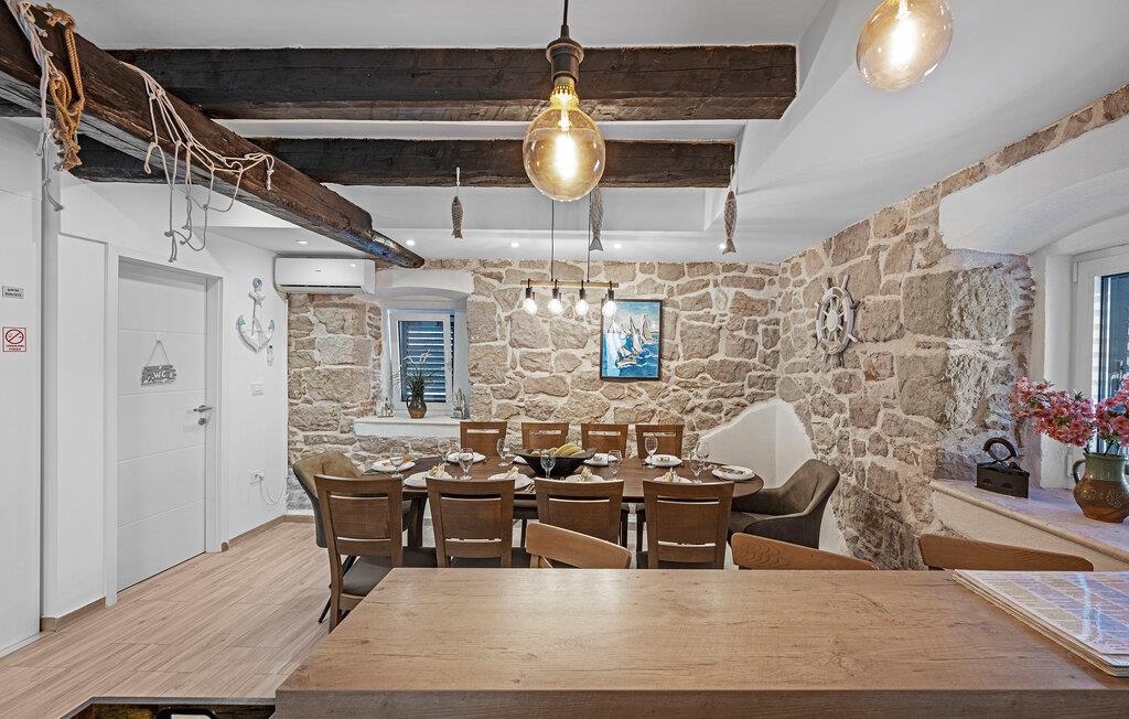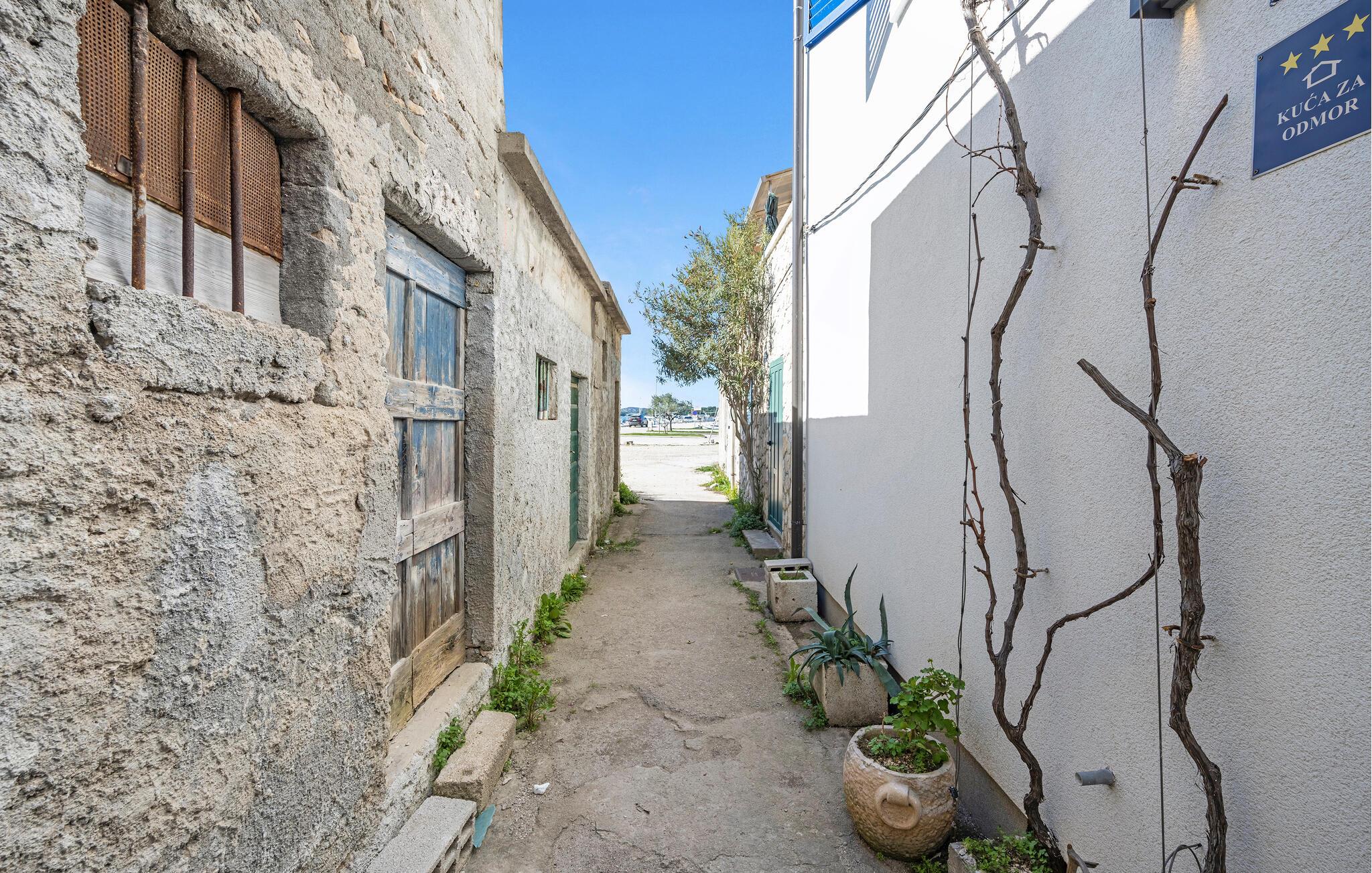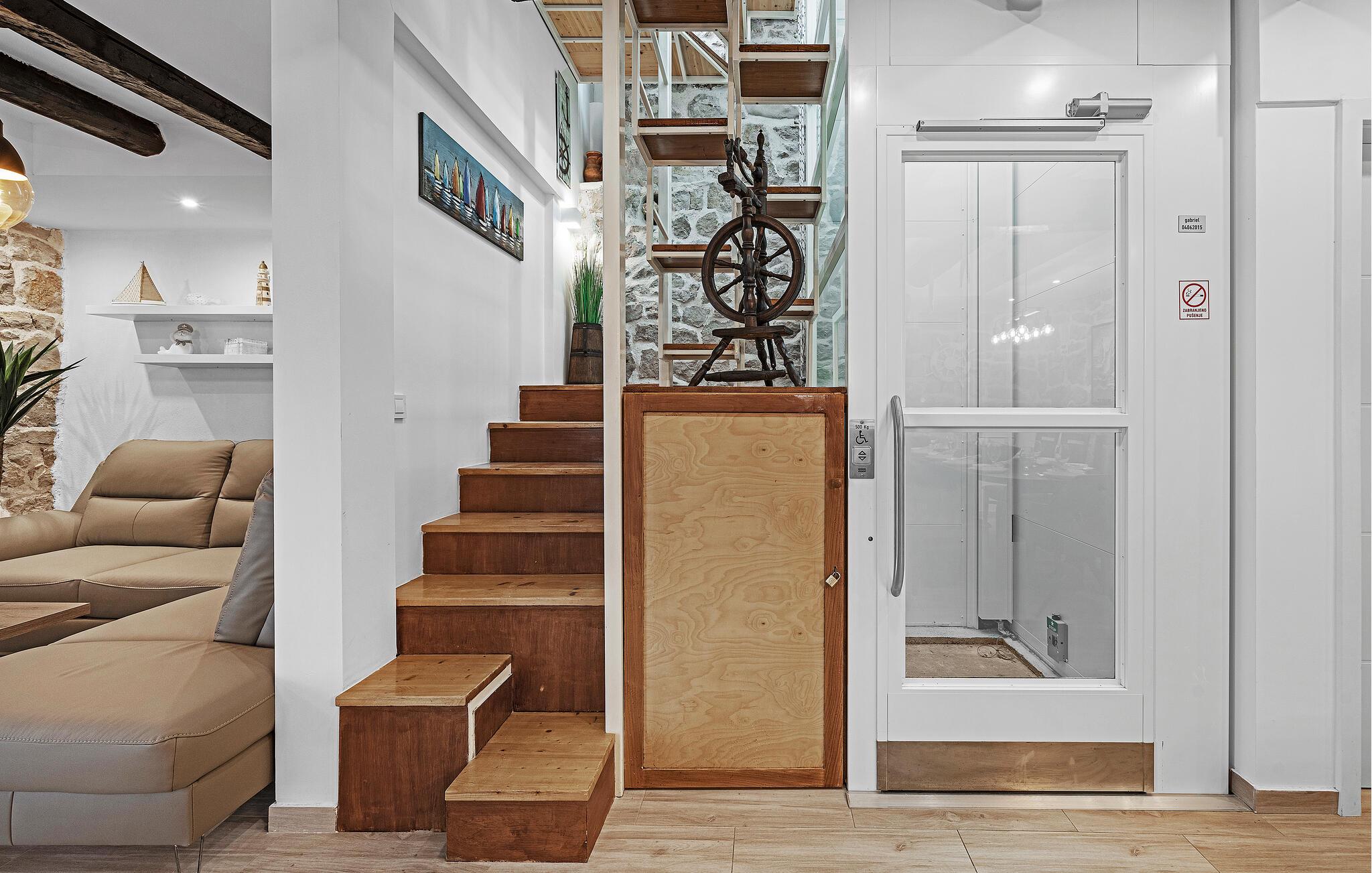En kombination af moderne arkitektur og smukke gamle mure venter jer i dette smagfuldt indrettede feriehus, der ligger lige ud til havet i byen Murter. Øen af samme navn er forbundet med bro til fastlandet. Halvdelen af dobbelthuset strækker sig over tre etager og er både forbundet af en udendørs trappe og af en elevator. Dermed er huset velegnet til alle der har et ganghandicap – to soveværelser og et badeværelse er specialindrettet. Nyd den ferielivet på den store tagterrasse med whirlpool og udsigt ud over havet og byen. Øen er kendt for sine skønne strande og nærheden til Nationalparken Kornati. Smag de lækre lokale specialiteter på øens restauranter og konobaer og oplev den ægte dalmatiske charme.