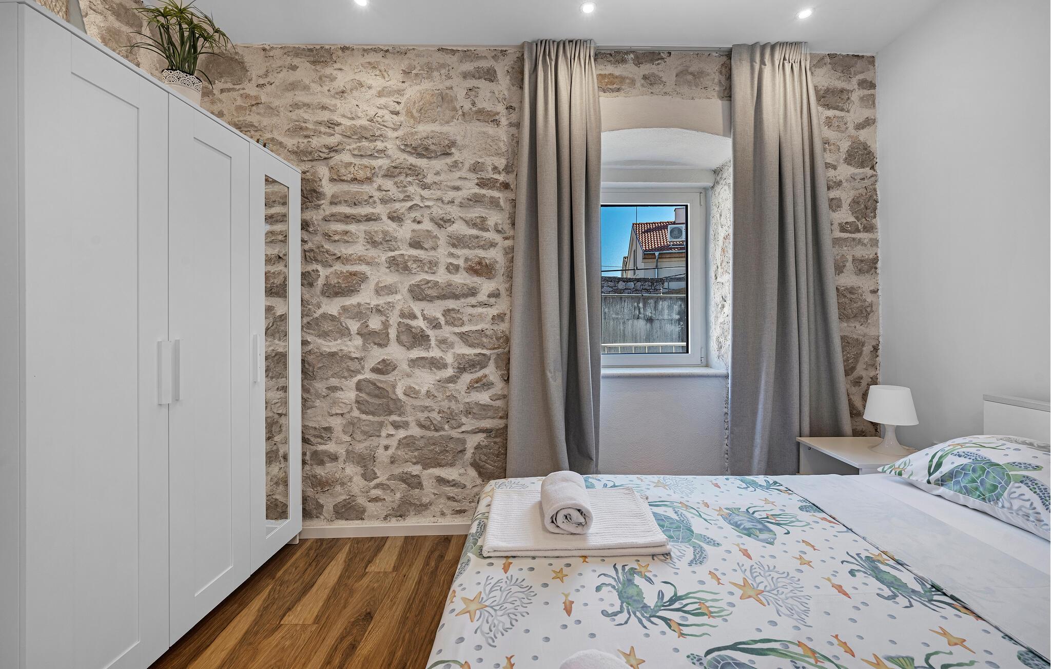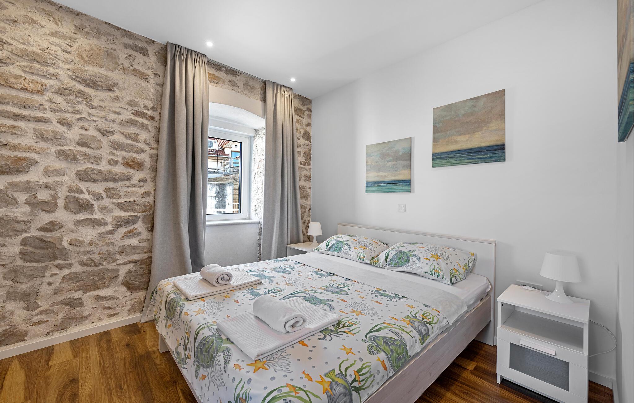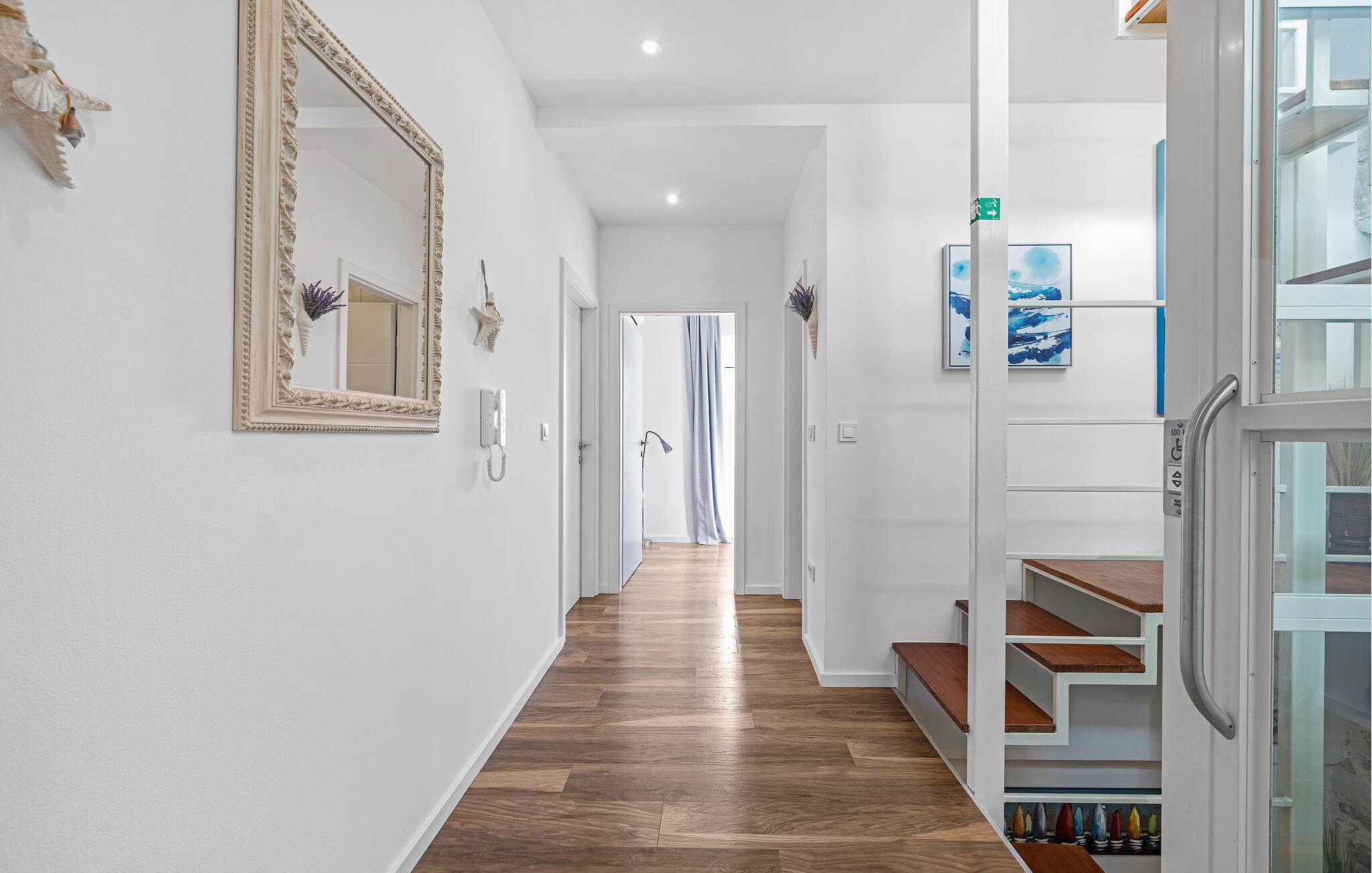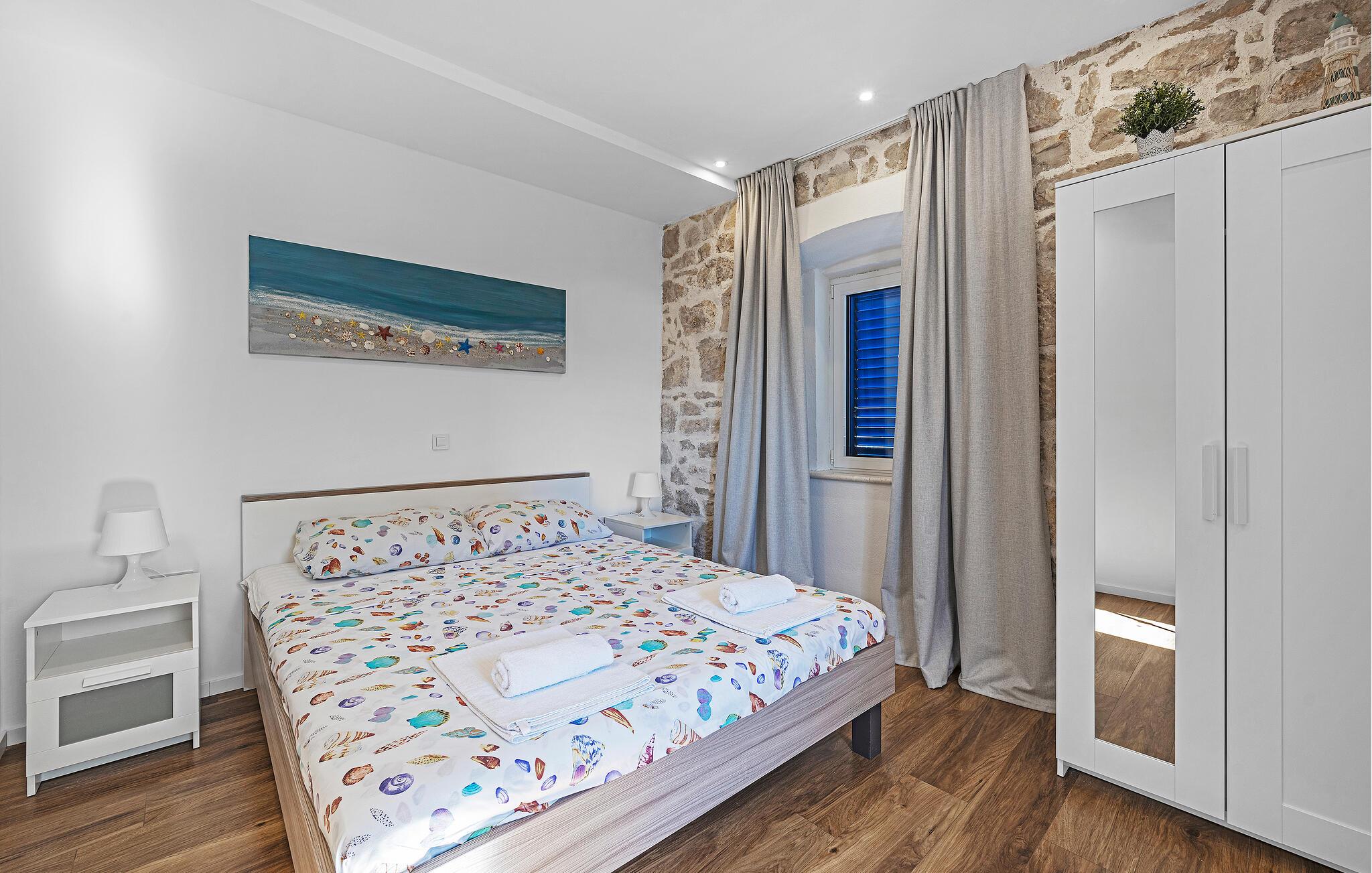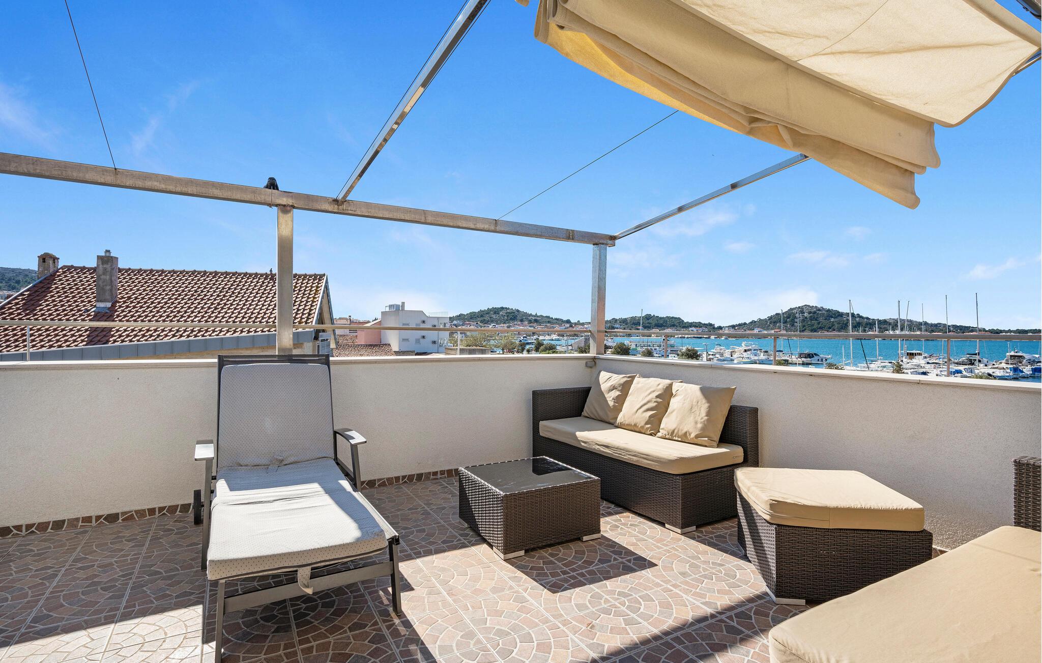 En kombination af moderne arkitektur og smukke gamle mure venter jer i dette smagfuldt indrettede feriehus, der ligger lige ud til havet i byen Murter. Øen af samme navn er forbundet med bro til fastlandet. Halvdelen af dobbelthuset strækker sig over tre etager og er både forbundet af en udendørs trappe og af en elevator. Dermed er huset velegnet til alle der har et ganghandicap – to soveværelser og et badeværelse er specialindrettet. Nyd den ferielivet på den store tagterrasse med whirlpool og udsigt ud over havet og byen. Øen er kendt for sine skønne strande og nærheden til Nationalparken Kornati. Smag de lækre lokale specialiteter på øens restauranter og konobaer og oplev den ægte dalmatiske charme.