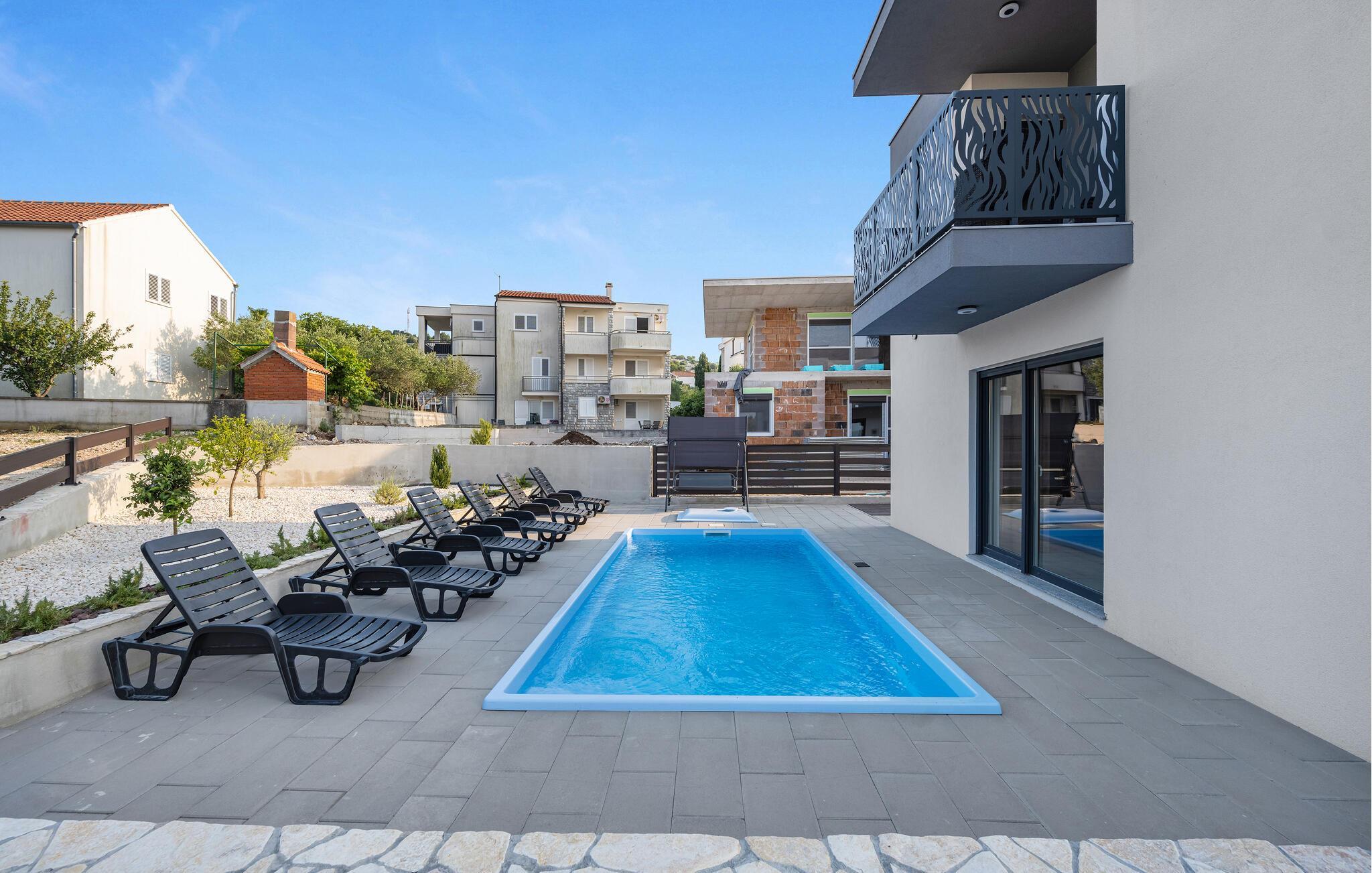Nyd en drømmeferie i dette fantastiske feriehus med pool og havudsigt. Velkommen til denne moderne og rummelige villa, hvor en stilfuld og højkvalitets atmosfære venter jer. Glæd jer til at lave mad i det indbydende køkken og nyde harmoniske måltider i den lyse spisestue. Snak om svundne tider i sofagruppen, og stream jeres yndlingsserier efter en lang dag. Jeres private pool inviterer jer til at tilbringe lange solbadninger under den blå himmel. Nyd en afslappet svømmetur her som det første om morgenen, og slap af på en liggestol. Oplev den dalmatiske kysts skønhed ved at tage en kajaktur til de nærliggende Kornati-øer, hvor I kan snorkle i skjulte bugter og nyde den uberørte natur. Besøg Krka Nationalpark med dens spektakulære vandfald, udforsk den charmerende by Šibenik med dens UNESCO-beskyttede katedral og livlige gamle bydel, eller slentr gennem den historiske fæstning i Zadar, mens I lytter til de berømte lyde fra Havorglet.