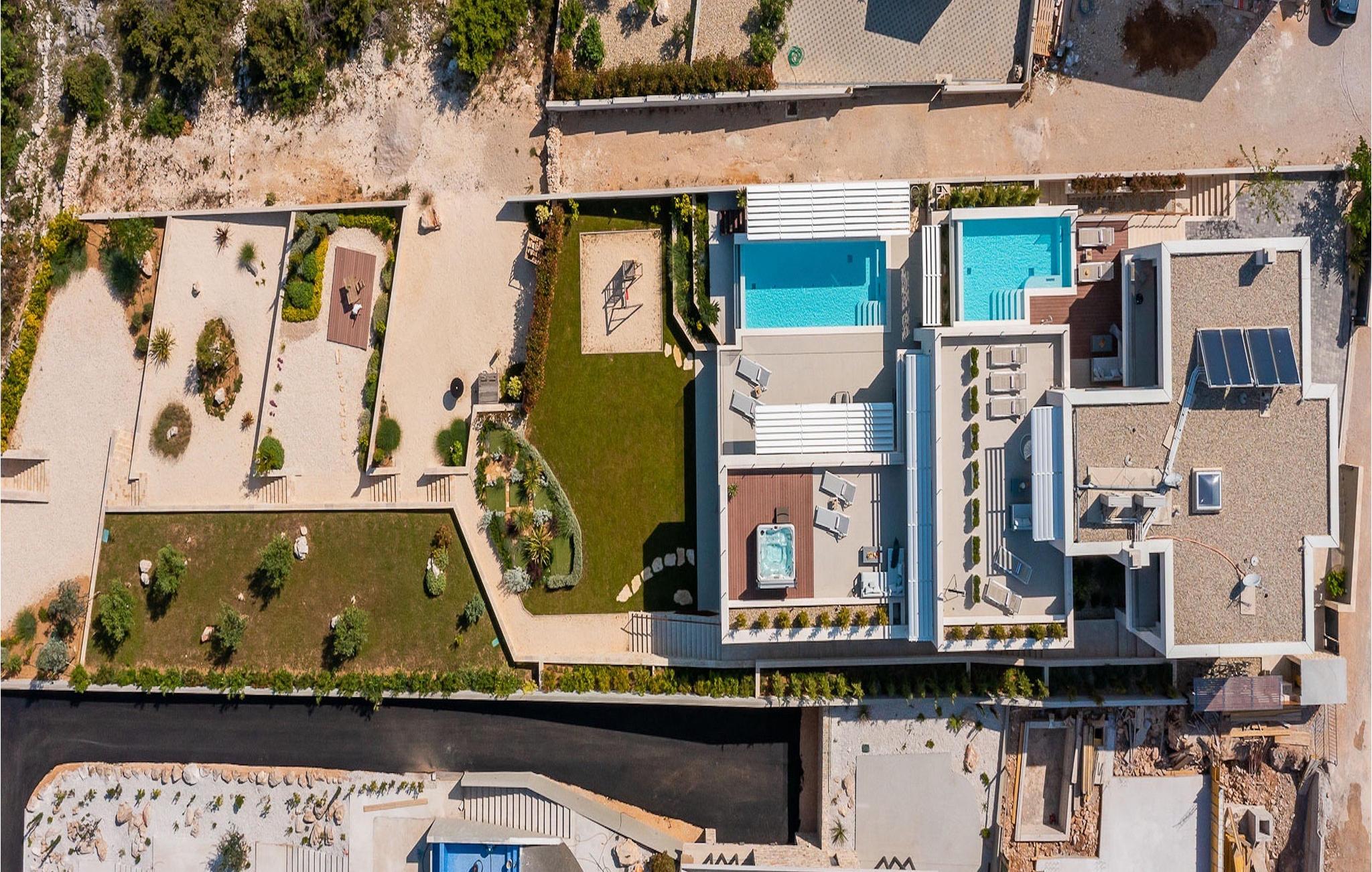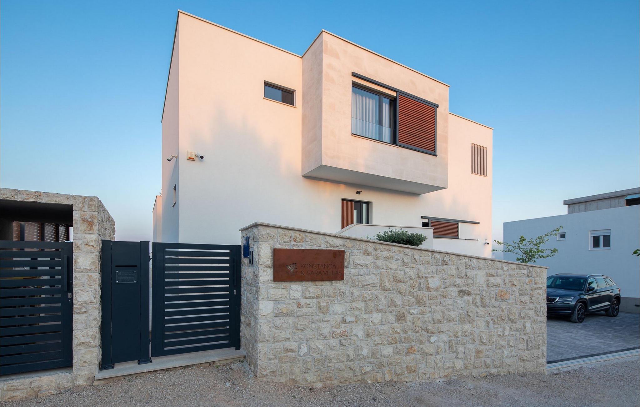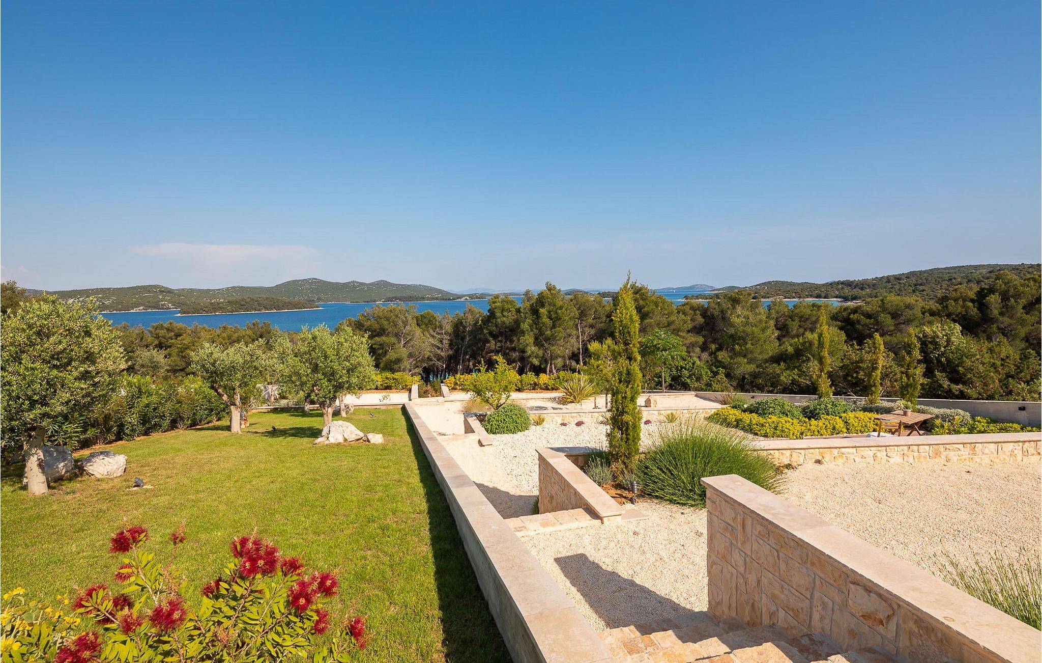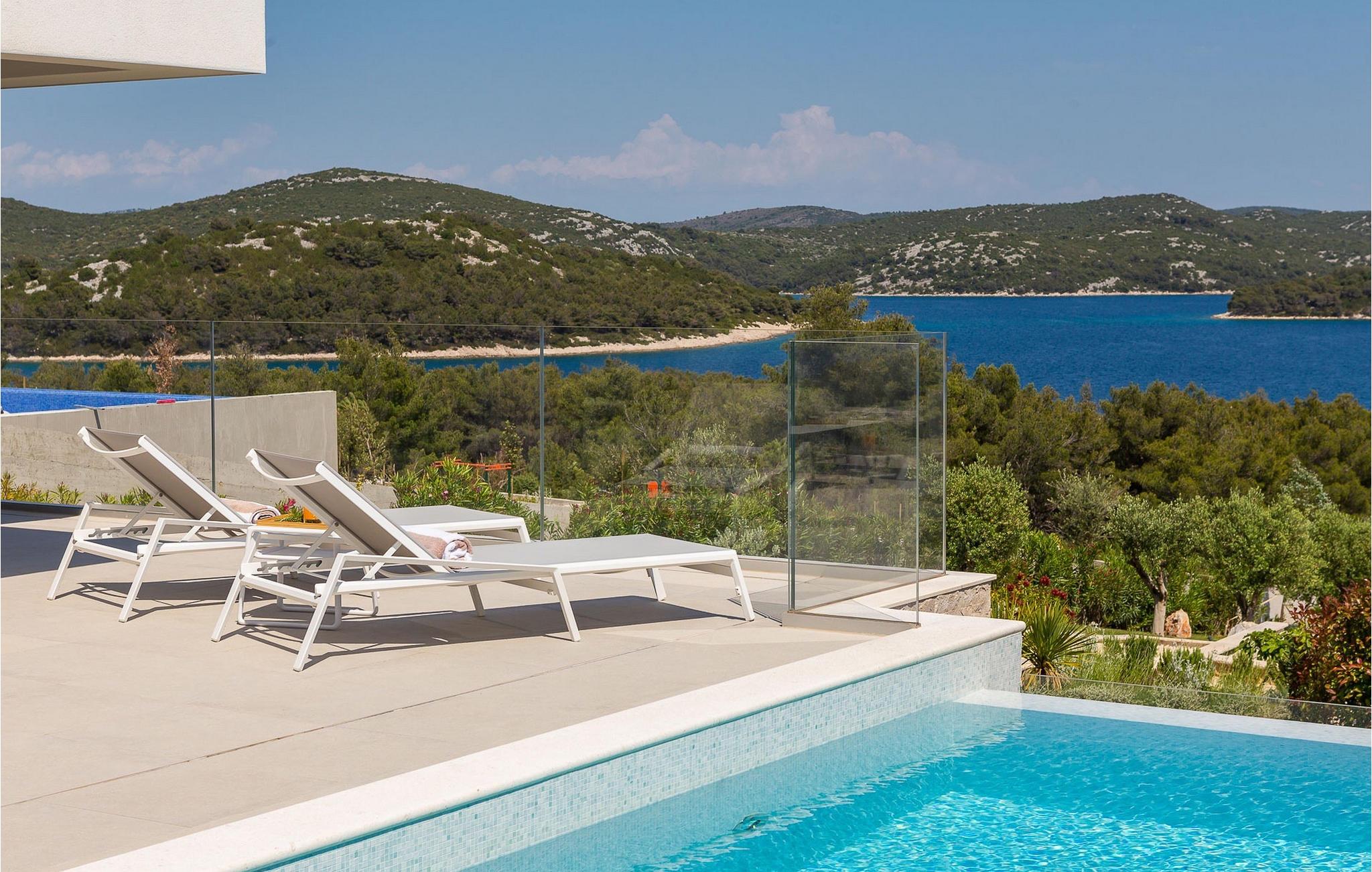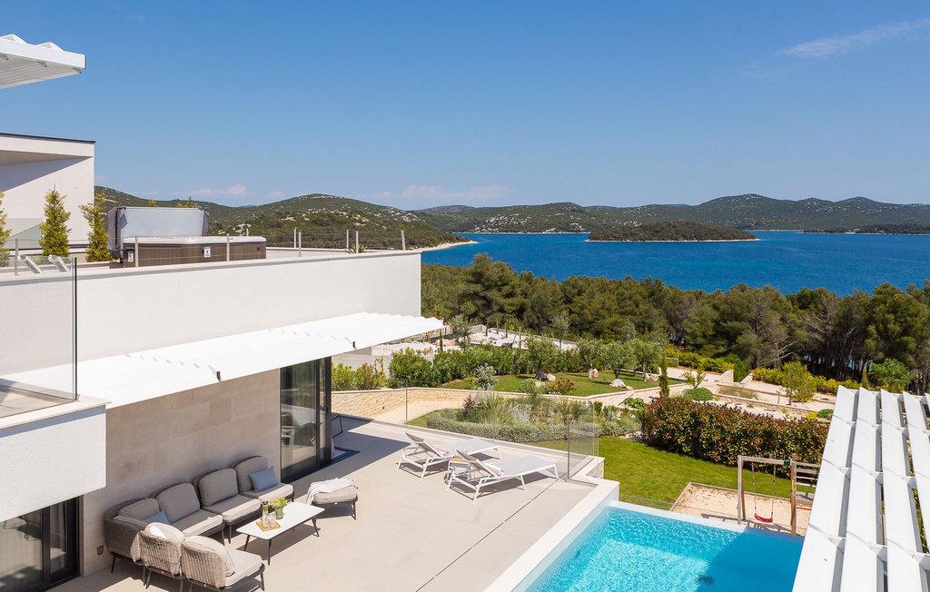 Oplev en all-round afslappende ferie for 8+1 personer i Villa Konstanca med en smuk havudsigt. Denne moderne villa er opdelt i tre etager, dog er kælderen/stueetagen ikke synlig fra villaens bagside, da den ligger i haveniveau. Her er også to soveværelser med eget badeværelse placeret, mens alle andre soveværelser også nyder godt af bekvemmeligheden ved deres badeværelse. Så nyd privatlivets fred i disse soveværelser med udsigt over havet og grønne områder og direkte udgang til haven. De yngste vil være særligt glade for at bo i et af disse værelser, fordi den anlagte have indeholder en gynge. Du kan klatre op til den "høje stueetage" med en indvendig eller udvendig trappe, hvor en rummelig terrasse med swimmingpool venter på dig. Køl ned fra sommervarmen ved at hoppe i poolen med hydromassage eller få en drink, mens du solbader på liggestolene, mulighederne er uendelige. Og selv et udendørs måltid sidst på dagen er et must ved det store spisebord ved poolen. Den åbne stue, køkken og spisestue er et sandt billede på harmonisk design. Trædetaljer findes også i udsmykningen af fitnesscenteret og saunaen på dette niveau. En af de direkte udsigter og udgange er også fra træningscenteret - forestil dig bare hvilken motivation for motion udsigten over havet vil give! Bagefter skal du selvfølgelig ikke springe den velfortjente afslapning i saunaen over. Du finder to smukt og upåklageligt indrettede soveværelser på første sal, og det er svært at afgøre, hvilket af dem der har flere faciliteter. Du har helt sikkert mulighed for at vågne op med udsigt over havet i begge, fordi den ene har sin balkon, og den anden åbner direkte ud til den øverste terrasse. Selve den øverste terrasse tilbyder dig et sted at nyde en udendørs jacuzzi, havemøbler og liggestole. Kan du forestille dig et bedre sted at se solnedgangen med et glas af din yndlingsdrink? Villa Konstanca har en nabovilla Sara Murter. Selvom de blev bygget som én bygning, udlejes villaerne Sara og Konstanca som to separate villaer. Villa Sara Murter ligger i anden halvdel af samme bygning, på et højere niveau end Villa Konstanca. Begge villaer er helt indhegnet, så gæsternes privatliv er sikret. Hvis du kommer med din familie eller venner som en stor gruppe, er det muligt at booke Villa Sara og Konstanca sammen. Luksusvillaen Konstanca ligger i Jezera, på den smukke ø Murter, som er en del af Šibenik-øgruppen. Kun få skridt fra villaen ligger en promenade, der løber langs havet hele vejen fra Jezera til Tisno. Promenaden er 2 km lang og ideel til morgenløbeture eller romantiske gåture for to ved solnedgang. Langs promenaden finder du adskillige sten- og klippestrande omgivet af fyrreskove. For alle elskere af en aktiv ferie er der offentlige sportsbaner for tennis, basketball og fodbold i nærheden af villaen. Cykler er også tilgængelige, ideelle til at udforske det omkringliggende område. Hvis du gerne vil opdage de andre øer i Šibenik-øgruppen, de mange skjulte bugter og strande, anbefaler vi at leje en båd i den nærliggende lystbådehavn og begive dig ud på et uforglemmeligt eventyr med din familie. Besøg også Kornati National Park, en gruppe af øer omgivet af uberørt natur og krystalklart hav, og Krka National Park med dens talrige vandfald. En uforglemmelig udflugt er bestemt et besøg i byen Šibenik, kendt for sin katedral og talrige fæstninger, der tilbyder en unik udsigt over byen. Rejser du med en større gruppe, kan denne ejendom også lejes i kombination med Villa Sara Murter.