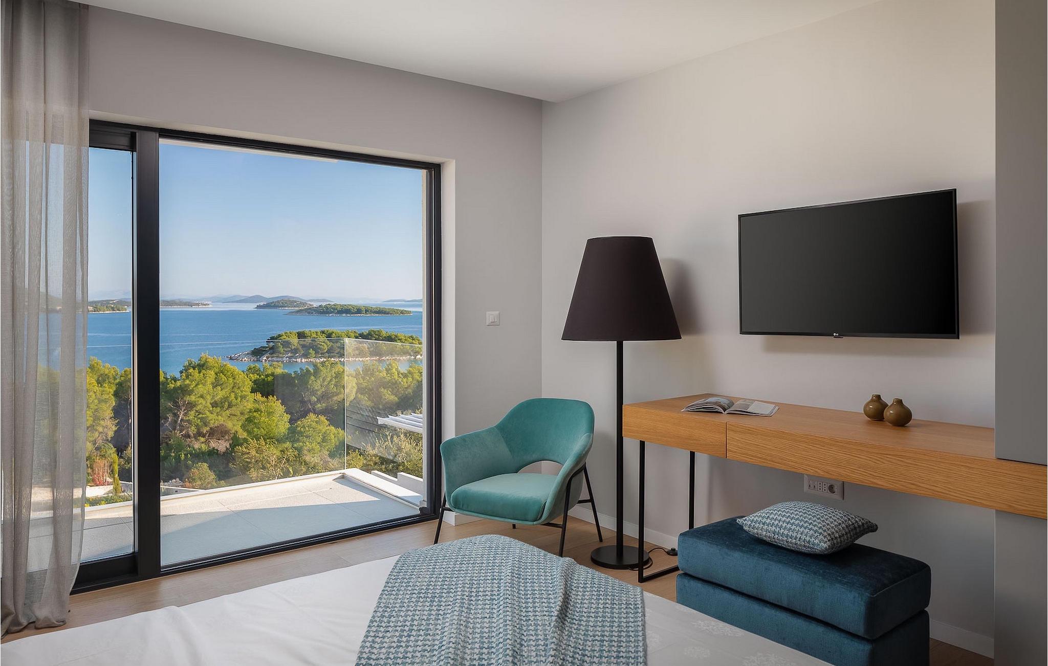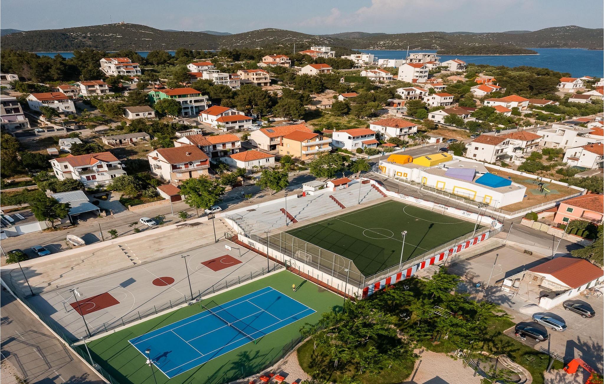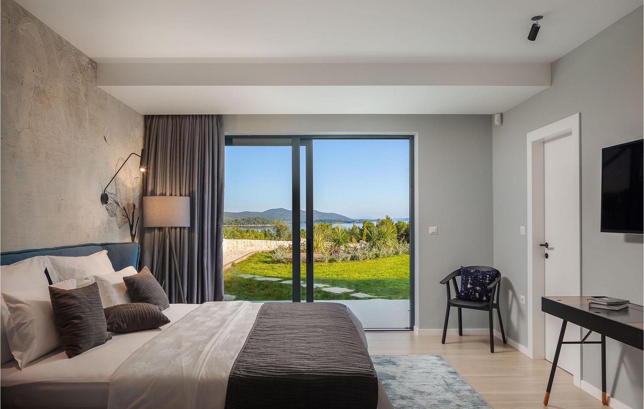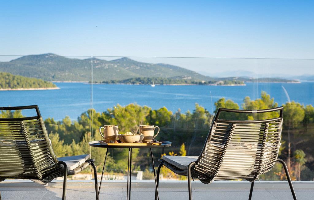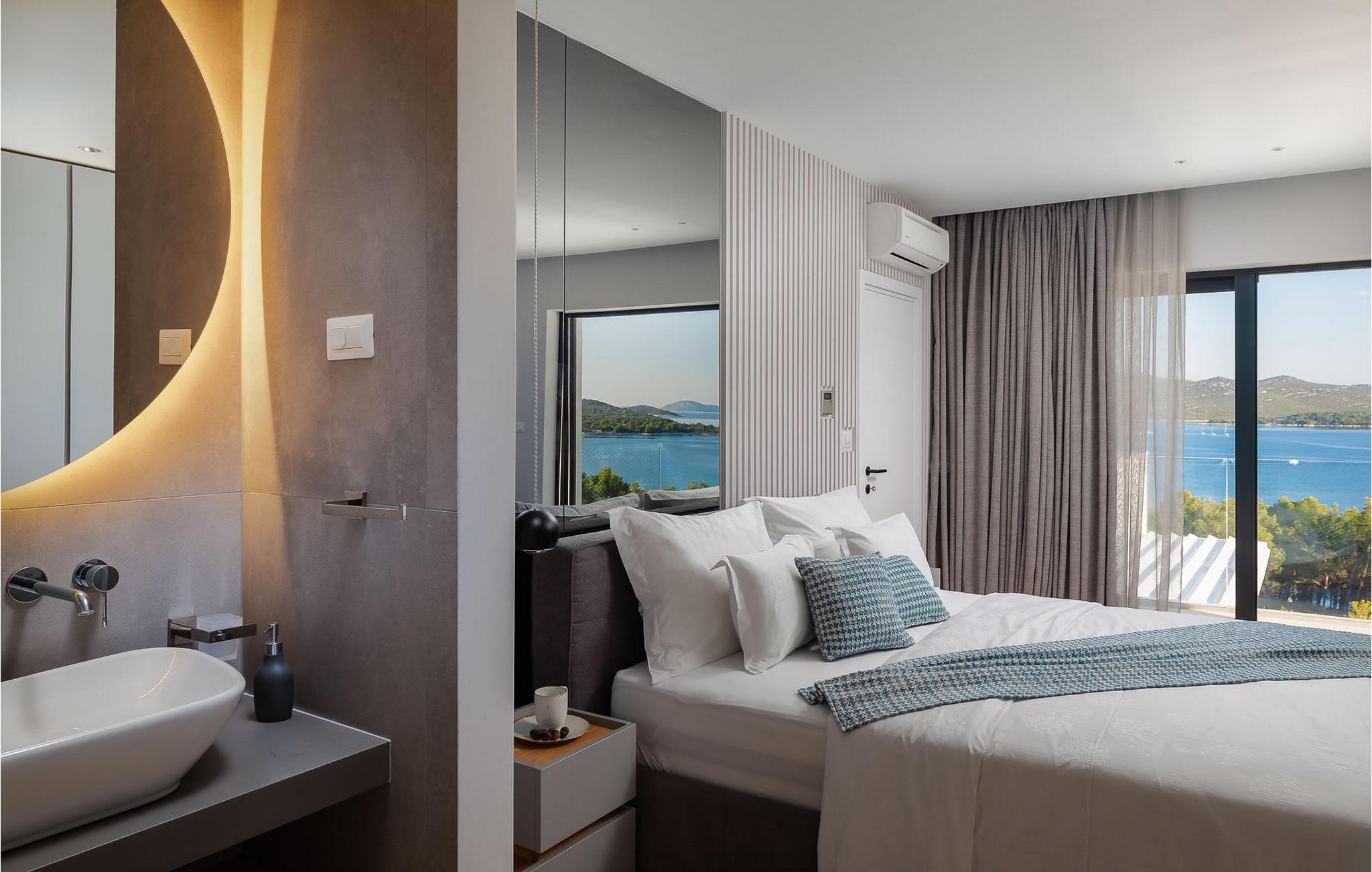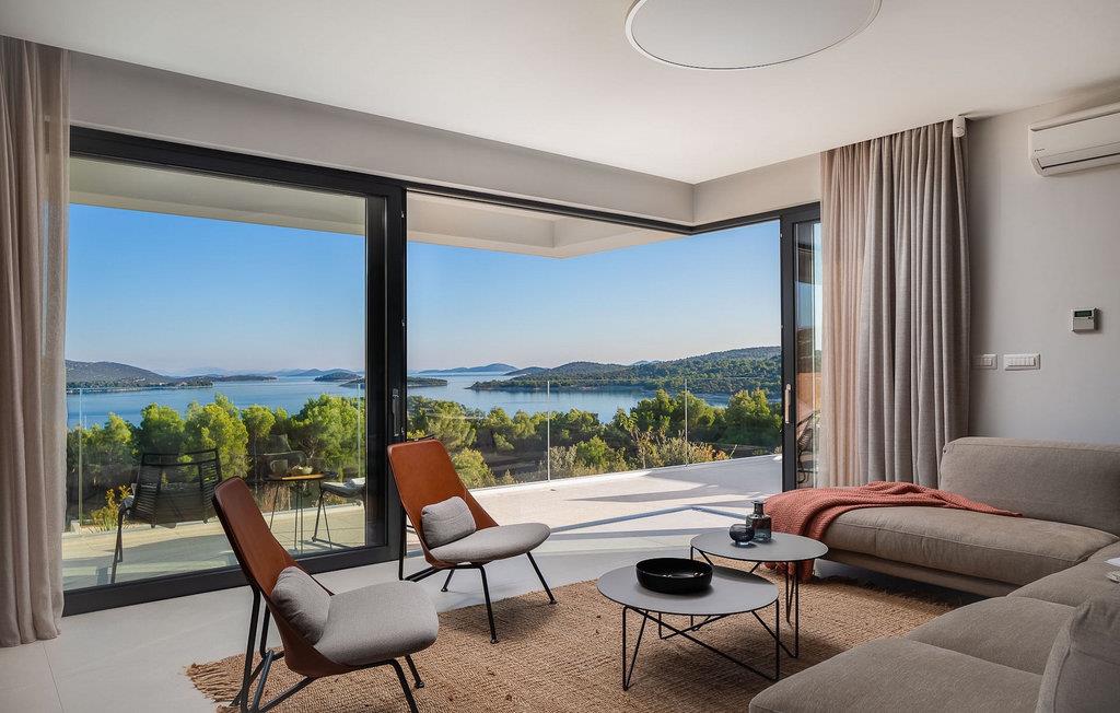 Oplev en all-round afslappende ferie for 8+1 personer i Villa Konstanca med en smuk havudsigt. Denne moderne villa er opdelt i tre etager, dog er kælderen/stueetagen ikke synlig fra villaens bagside, da den ligger i haveniveau. Her er også to soveværelser med eget badeværelse placeret, mens alle andre soveværelser også nyder godt af bekvemmeligheden ved deres badeværelse. Så nyd privatlivets fred i disse soveværelser med udsigt over havet og grønne områder og direkte udgang til haven. De yngste vil være særligt glade for at bo i et af disse værelser, fordi den anlagte have indeholder en gynge. Du kan klatre op til den "høje stueetage" med en indvendig eller udvendig trappe, hvor en rummelig terrasse med swimmingpool venter på dig. Køl ned fra sommervarmen ved at hoppe i poolen med hydromassage eller få en drink, mens du solbader på liggestolene, mulighederne er uendelige. Og selv et udendørs måltid sidst på dagen er et must ved det store spisebord ved poolen. Den åbne stue, køkken og spisestue er et sandt billede på harmonisk design. Trædetaljer findes også i udsmykningen af fitnesscenteret og saunaen på dette niveau. En af de direkte udsigter og udgange er også fra træningscenteret - forestil dig bare hvilken motivation for motion udsigten over havet vil give! Bagefter skal du selvfølgelig ikke springe den velfortjente afslapning i saunaen over. Du finder to smukt og upåklageligt indrettede soveværelser på første sal, og det er svært at afgøre, hvilket af dem der har flere faciliteter. Du har helt sikkert mulighed for at vågne op med udsigt over havet i begge, fordi den ene har sin balkon, og den anden åbner direkte ud til den øverste terrasse. Selve den øverste terrasse tilbyder dig et sted at nyde en udendørs jacuzzi, havemøbler og liggestole. Kan du forestille dig et bedre sted at se solnedgangen med et glas af din yndlingsdrink? Villa Konstanca har en nabovilla Sara Murter. Selvom de blev bygget som én bygning, udlejes villaerne Sara og Konstanca som to separate villaer. Villa Sara Murter ligger i anden halvdel af samme bygning, på et højere niveau end Villa Konstanca. Begge villaer er helt indhegnet, så gæsternes privatliv er sikret. Hvis du kommer med din familie eller venner som en stor gruppe, er det muligt at booke Villa Sara og Konstanca sammen. Luksusvillaen Konstanca ligger i Jezera, på den smukke ø Murter, som er en del af Šibenik-øgruppen. Kun få skridt fra villaen ligger en promenade, der løber langs havet hele vejen fra Jezera til Tisno. Promenaden er 2 km lang og ideel til morgenløbeture eller romantiske gåture for to ved solnedgang. Langs promenaden finder du adskillige sten- og klippestrande omgivet af fyrreskove. For alle elskere af en aktiv ferie er der offentlige sportsbaner for tennis, basketball og fodbold i nærheden af villaen. Cykler er også tilgængelige, ideelle til at udforske det omkringliggende område. Hvis du gerne vil opdage de andre øer i Šibenik-øgruppen, de mange skjulte bugter og strande, anbefaler vi at leje en båd i den nærliggende lystbådehavn og begive dig ud på et uforglemmeligt eventyr med din familie. Besøg også Kornati National Park, en gruppe af øer omgivet af uberørt natur og krystalklart hav, og Krka National Park med dens talrige vandfald. En uforglemmelig udflugt er bestemt et besøg i byen Šibenik, kendt for sin katedral og talrige fæstninger, der tilbyder en unik udsigt over byen. Rejser du med en større gruppe, kan denne ejendom også lejes i kombination med Villa Sara Murter.