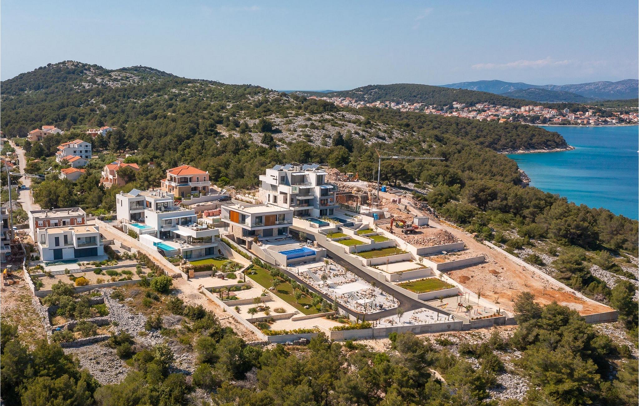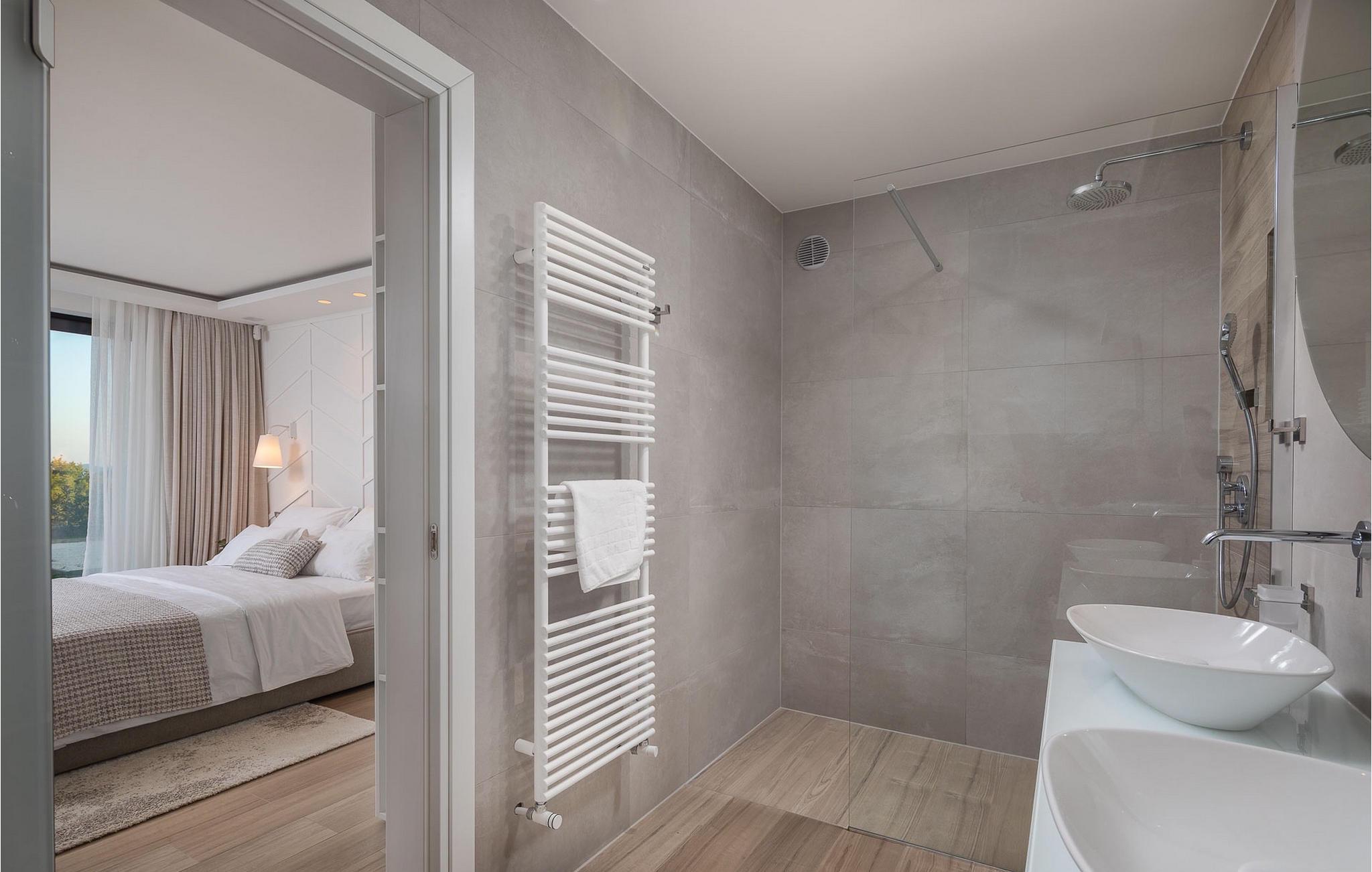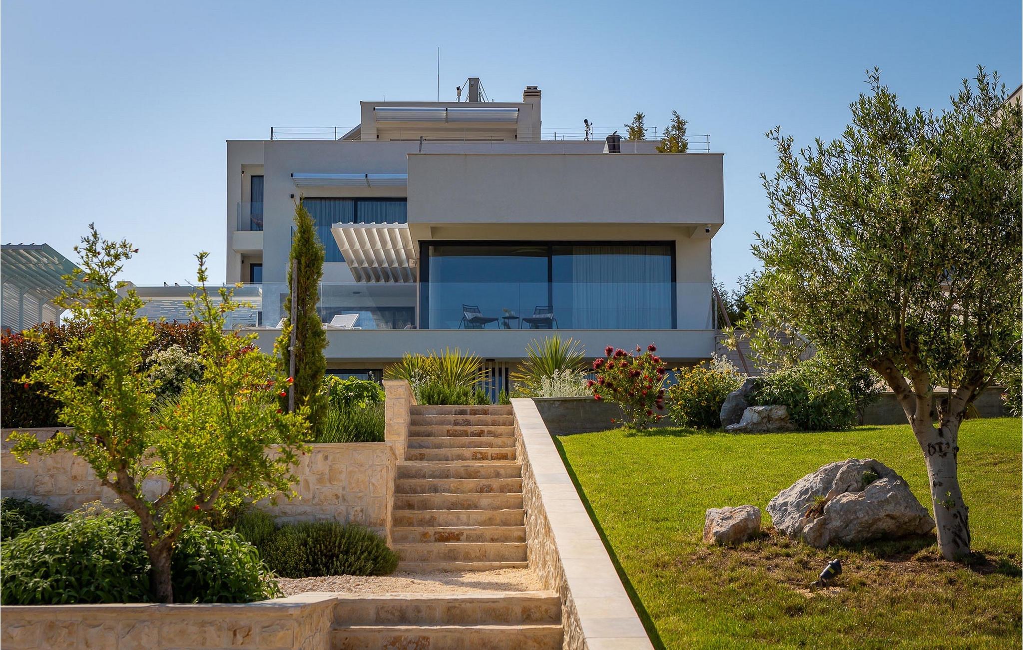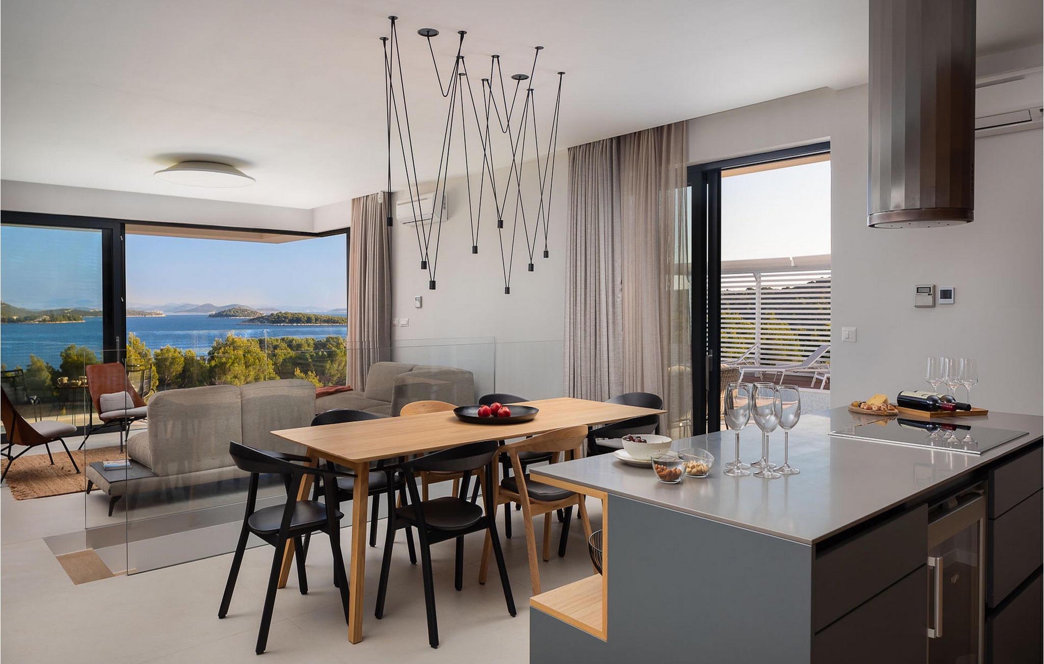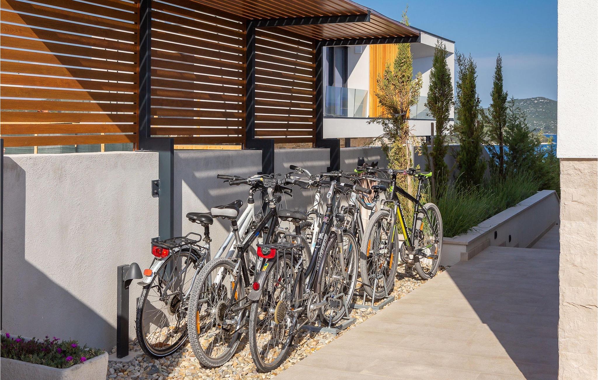 Oplev en all-round afslappende ferie for 8+1 personer i Villa Konstanca med en smuk havudsigt. Denne moderne villa er opdelt i tre etager, dog er kælderen/stueetagen ikke synlig fra villaens bagside, da den ligger i haveniveau. Her er også to soveværelser med eget badeværelse placeret, mens alle andre soveværelser også nyder godt af bekvemmeligheden ved deres badeværelse. Så nyd privatlivets fred i disse soveværelser med udsigt over havet og grønne områder og direkte udgang til haven. De yngste vil være særligt glade for at bo i et af disse værelser, fordi den anlagte have indeholder en gynge. Du kan klatre op til den "høje stueetage" med en indvendig eller udvendig trappe, hvor en rummelig terrasse med swimmingpool venter på dig. Køl ned fra sommervarmen ved at hoppe i poolen med hydromassage eller få en drink, mens du solbader på liggestolene, mulighederne er uendelige. Og selv et udendørs måltid sidst på dagen er et must ved det store spisebord ved poolen. Den åbne stue, køkken og spisestue er et sandt billede på harmonisk design. Trædetaljer findes også i udsmykningen af fitnesscenteret og saunaen på dette niveau. En af de direkte udsigter og udgange er også fra træningscenteret - forestil dig bare hvilken motivation for motion udsigten over havet vil give! Bagefter skal du selvfølgelig ikke springe den velfortjente afslapning i saunaen over. Du finder to smukt og upåklageligt indrettede soveværelser på første sal, og det er svært at afgøre, hvilket af dem der har flere faciliteter. Du har helt sikkert mulighed for at vågne op med udsigt over havet i begge, fordi den ene har sin balkon, og den anden åbner direkte ud til den øverste terrasse. Selve den øverste terrasse tilbyder dig et sted at nyde en udendørs jacuzzi, havemøbler og liggestole. Kan du forestille dig et bedre sted at se solnedgangen med et glas af din yndlingsdrink? Villa Konstanca har en nabovilla Sara Murter. Selvom de blev bygget som én bygning, udlejes villaerne Sara og Konstanca som to separate villaer. Villa Sara Murter ligger i anden halvdel af samme bygning, på et højere niveau end Villa Konstanca. Begge villaer er helt indhegnet, så gæsternes privatliv er sikret. Hvis du kommer med din familie eller venner som en stor gruppe, er det muligt at booke Villa Sara og Konstanca sammen. Luksusvillaen Konstanca ligger i Jezera, på den smukke ø Murter, som er en del af Šibenik-øgruppen. Kun få skridt fra villaen ligger en promenade, der løber langs havet hele vejen fra Jezera til Tisno. Promenaden er 2 km lang og ideel til morgenløbeture eller romantiske gåture for to ved solnedgang. Langs promenaden finder du adskillige sten- og klippestrande omgivet af fyrreskove. For alle elskere af en aktiv ferie er der offentlige sportsbaner for tennis, basketball og fodbold i nærheden af villaen. Cykler er også tilgængelige, ideelle til at udforske det omkringliggende område. Hvis du gerne vil opdage de andre øer i Šibenik-øgruppen, de mange skjulte bugter og strande, anbefaler vi at leje en båd i den nærliggende lystbådehavn og begive dig ud på et uforglemmeligt eventyr med din familie. Besøg også Kornati National Park, en gruppe af øer omgivet af uberørt natur og krystalklart hav, og Krka National Park med dens talrige vandfald. En uforglemmelig udflugt er bestemt et besøg i byen Šibenik, kendt for sin katedral og talrige fæstninger, der tilbyder en unik udsigt over byen. Rejser du med en større gruppe, kan denne ejendom også lejes i kombination med Villa Sara Murter.
