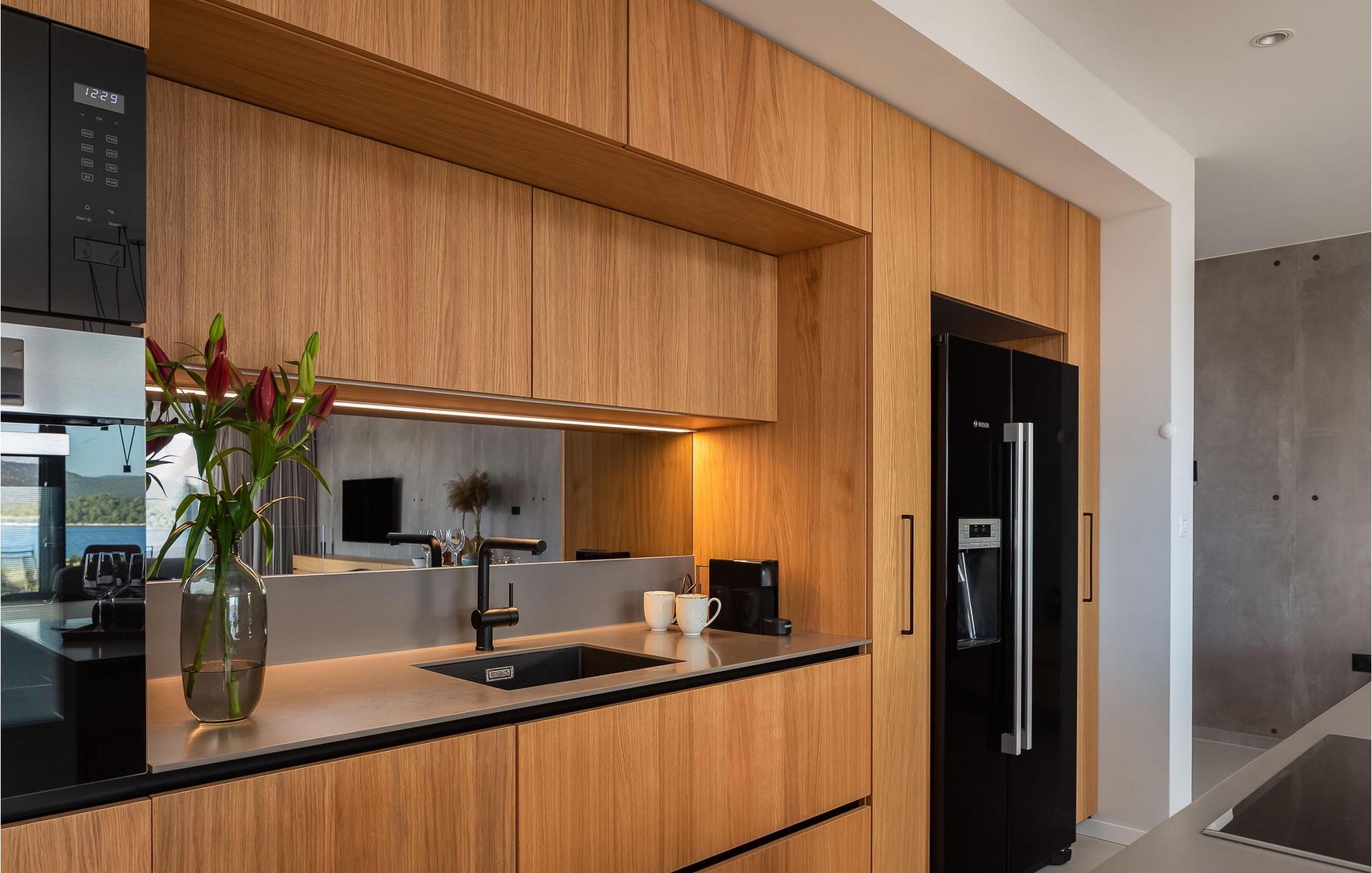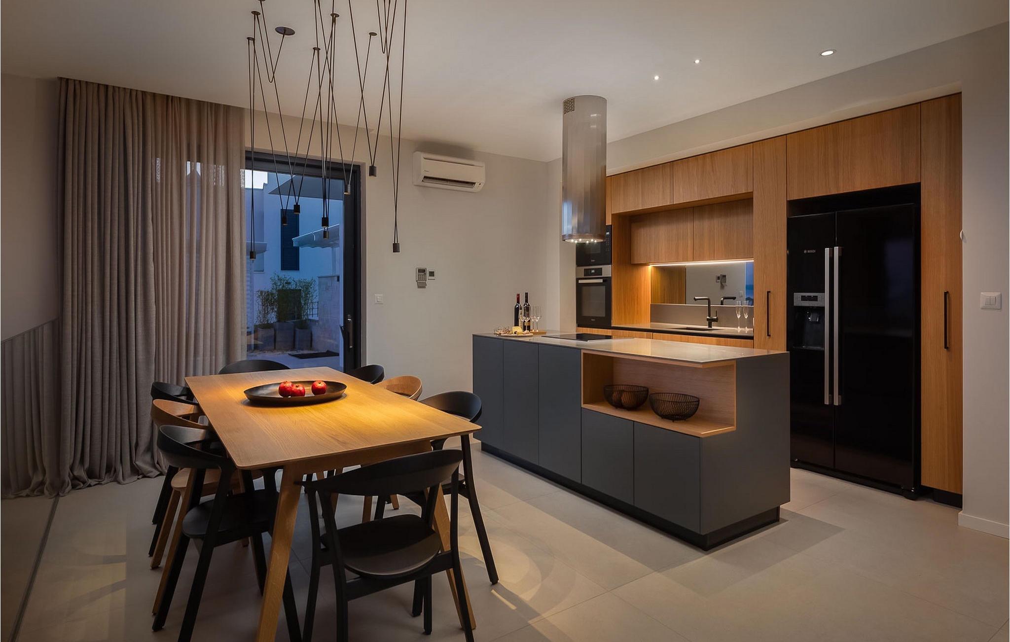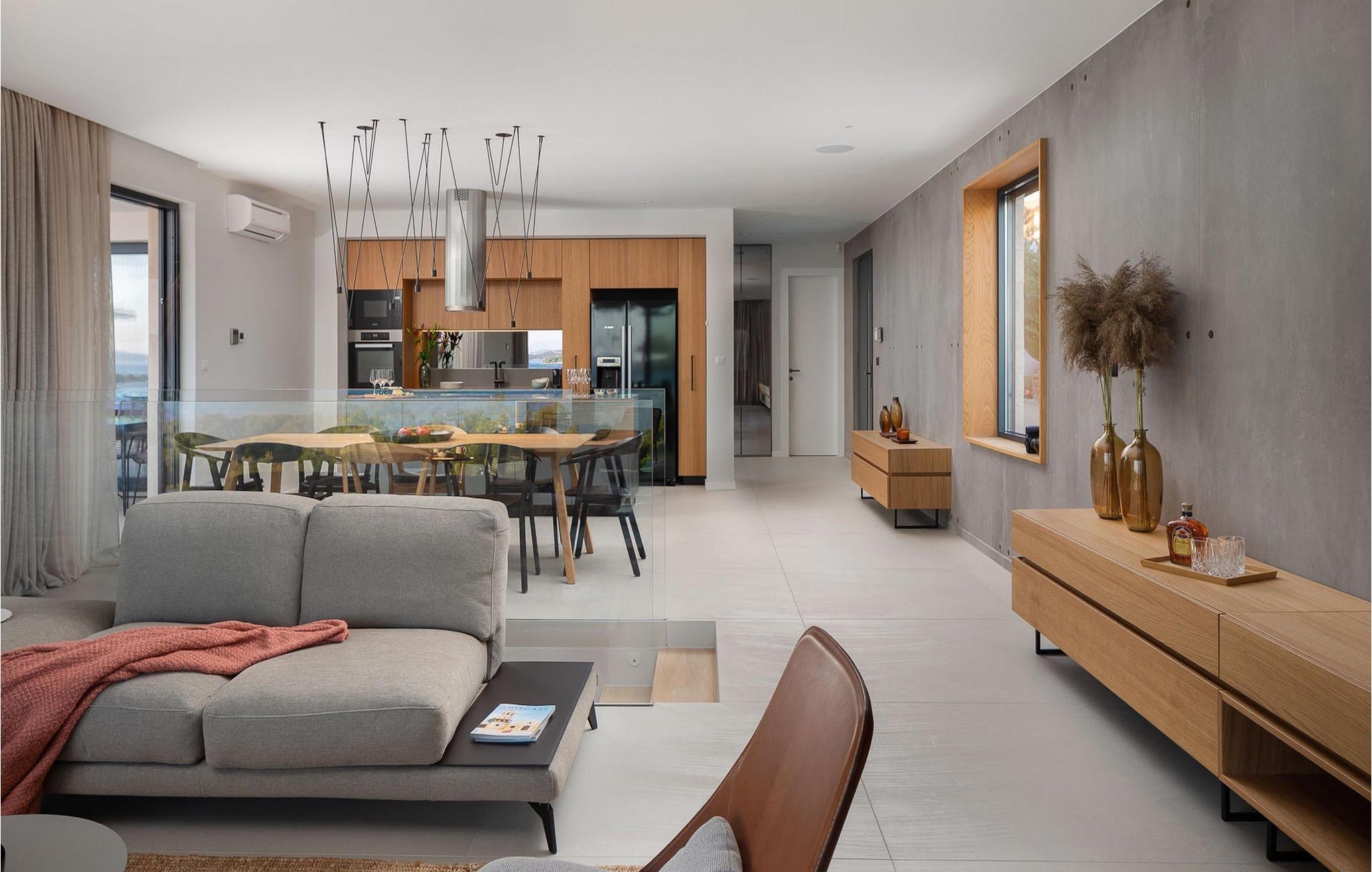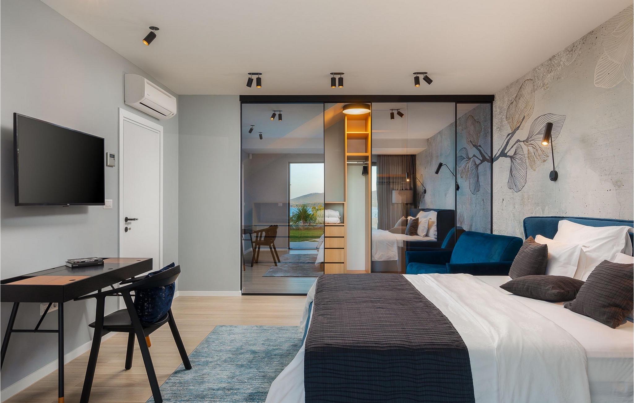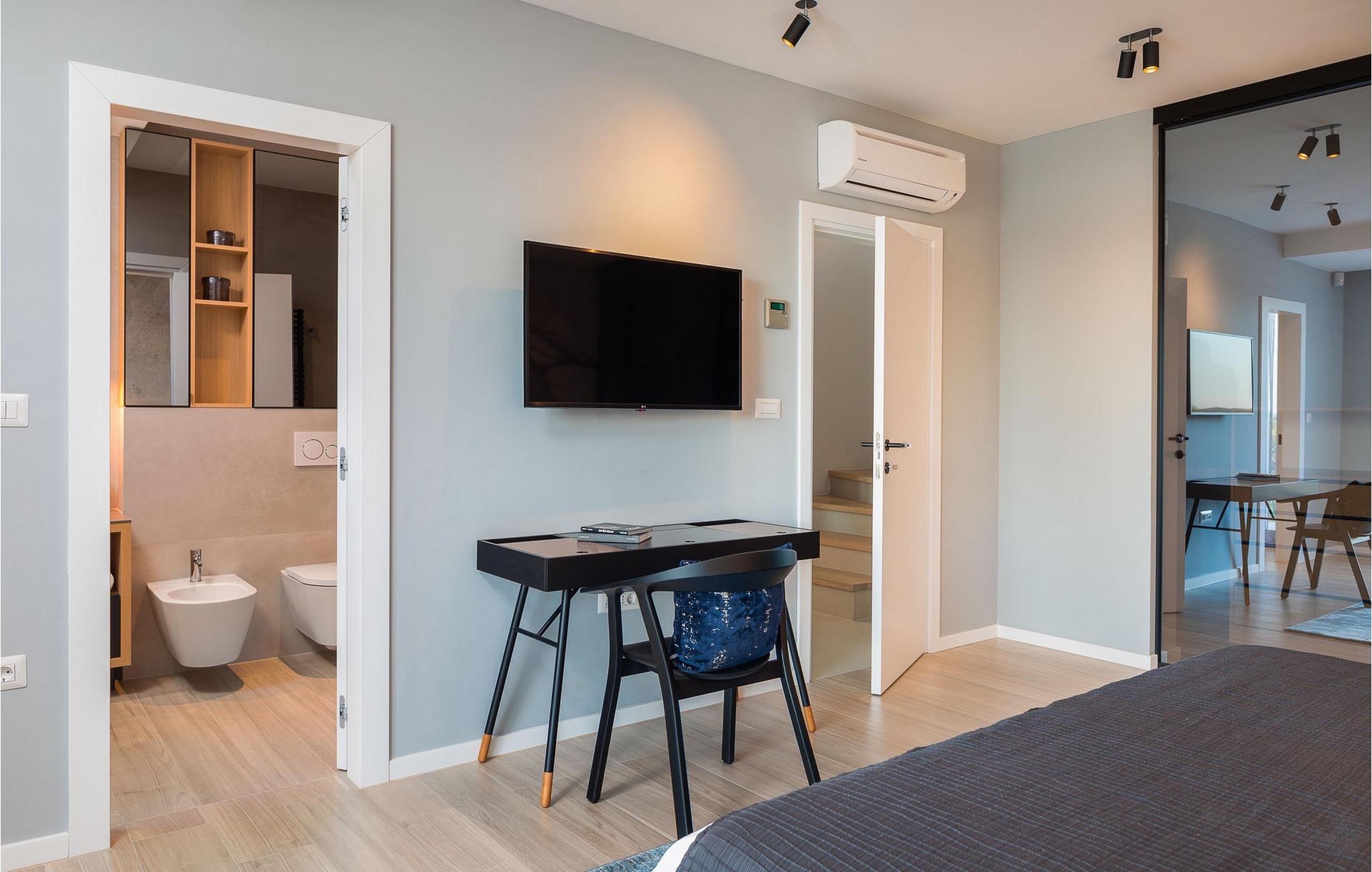 Oplev en all-round afslappende ferie for 8+1 personer i Villa Konstanca med en smuk havudsigt. Denne moderne villa er opdelt i tre etager, dog er kælderen/stueetagen ikke synlig fra villaens bagside, da den ligger i haveniveau. Her er også to soveværelser med eget badeværelse placeret, mens alle andre soveværelser også nyder godt af bekvemmeligheden ved deres badeværelse. Så nyd privatlivets fred i disse soveværelser med udsigt over havet og grønne områder og direkte udgang til haven. De yngste vil være særligt glade for at bo i et af disse værelser, fordi den anlagte have indeholder en gynge. Du kan klatre op til den "høje stueetage" med en indvendig eller udvendig trappe, hvor en rummelig terrasse med swimmingpool venter på dig. Køl ned fra sommervarmen ved at hoppe i poolen med hydromassage eller få en drink, mens du solbader på liggestolene, mulighederne er uendelige. Og selv et udendørs måltid sidst på dagen er et must ved det store spisebord ved poolen. Den åbne stue, køkken og spisestue er et sandt billede på harmonisk design. Trædetaljer findes også i udsmykningen af fitnesscenteret og saunaen på dette niveau. En af de direkte udsigter og udgange er også fra træningscenteret - forestil dig bare hvilken motivation for motion udsigten over havet vil give! Bagefter skal du selvfølgelig ikke springe den velfortjente afslapning i saunaen over. Du finder to smukt og upåklageligt indrettede soveværelser på første sal, og det er svært at afgøre, hvilket af dem der har flere faciliteter. Du har helt sikkert mulighed for at vågne op med udsigt over havet i begge, fordi den ene har sin balkon, og den anden åbner direkte ud til den øverste terrasse. Selve den øverste terrasse tilbyder dig et sted at nyde en udendørs jacuzzi, havemøbler og liggestole. Kan du forestille dig et bedre sted at se solnedgangen med et glas af din yndlingsdrink? Villa Konstanca har en nabovilla Sara Murter. Selvom de blev bygget som én bygning, udlejes villaerne Sara og Konstanca som to separate villaer. Villa Sara Murter ligger i anden halvdel af samme bygning, på et højere niveau end Villa Konstanca. Begge villaer er helt indhegnet, så gæsternes privatliv er sikret. Hvis du kommer med din familie eller venner som en stor gruppe, er det muligt at booke Villa Sara og Konstanca sammen. Luksusvillaen Konstanca ligger i Jezera, på den smukke ø Murter, som er en del af Šibenik-øgruppen. Kun få skridt fra villaen ligger en promenade, der løber langs havet hele vejen fra Jezera til Tisno. Promenaden er 2 km lang og ideel til morgenløbeture eller romantiske gåture for to ved solnedgang. Langs promenaden finder du adskillige sten- og klippestrande omgivet af fyrreskove. For alle elskere af en aktiv ferie er der offentlige sportsbaner for tennis, basketball og fodbold i nærheden af villaen. Cykler er også tilgængelige, ideelle til at udforske det omkringliggende område. Hvis du gerne vil opdage de andre øer i Šibenik-øgruppen, de mange skjulte bugter og strande, anbefaler vi at leje en båd i den nærliggende lystbådehavn og begive dig ud på et uforglemmeligt eventyr med din familie. Besøg også Kornati National Park, en gruppe af øer omgivet af uberørt natur og krystalklart hav, og Krka National Park med dens talrige vandfald. En uforglemmelig udflugt er bestemt et besøg i byen Šibenik, kendt for sin katedral og talrige fæstninger, der tilbyder en unik udsigt over byen. Rejser du med en større gruppe, kan denne ejendom også lejes i kombination med Villa Sara Murter.