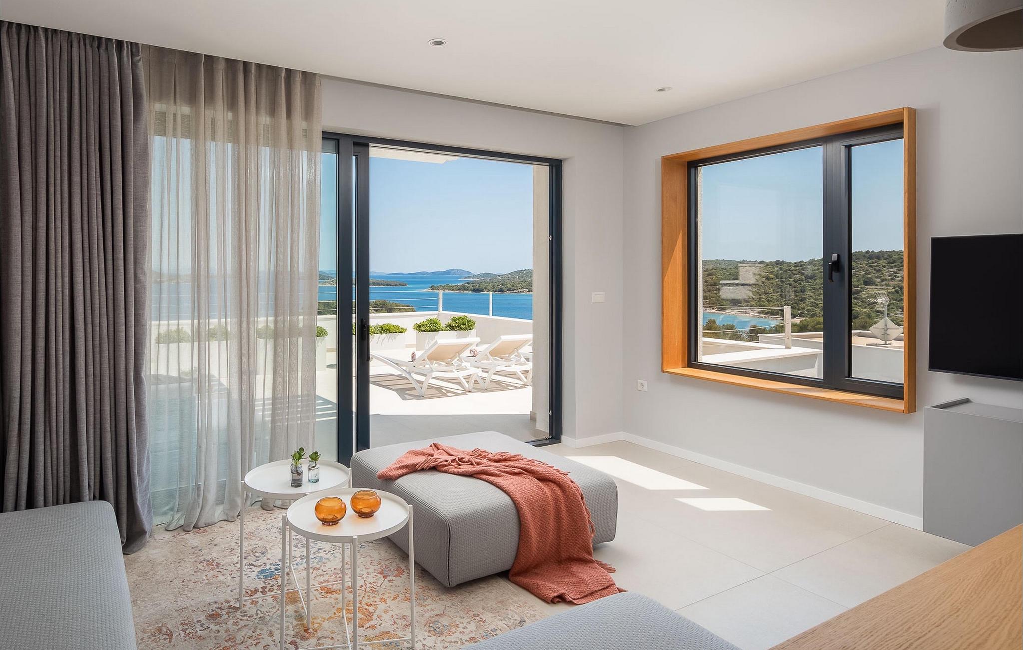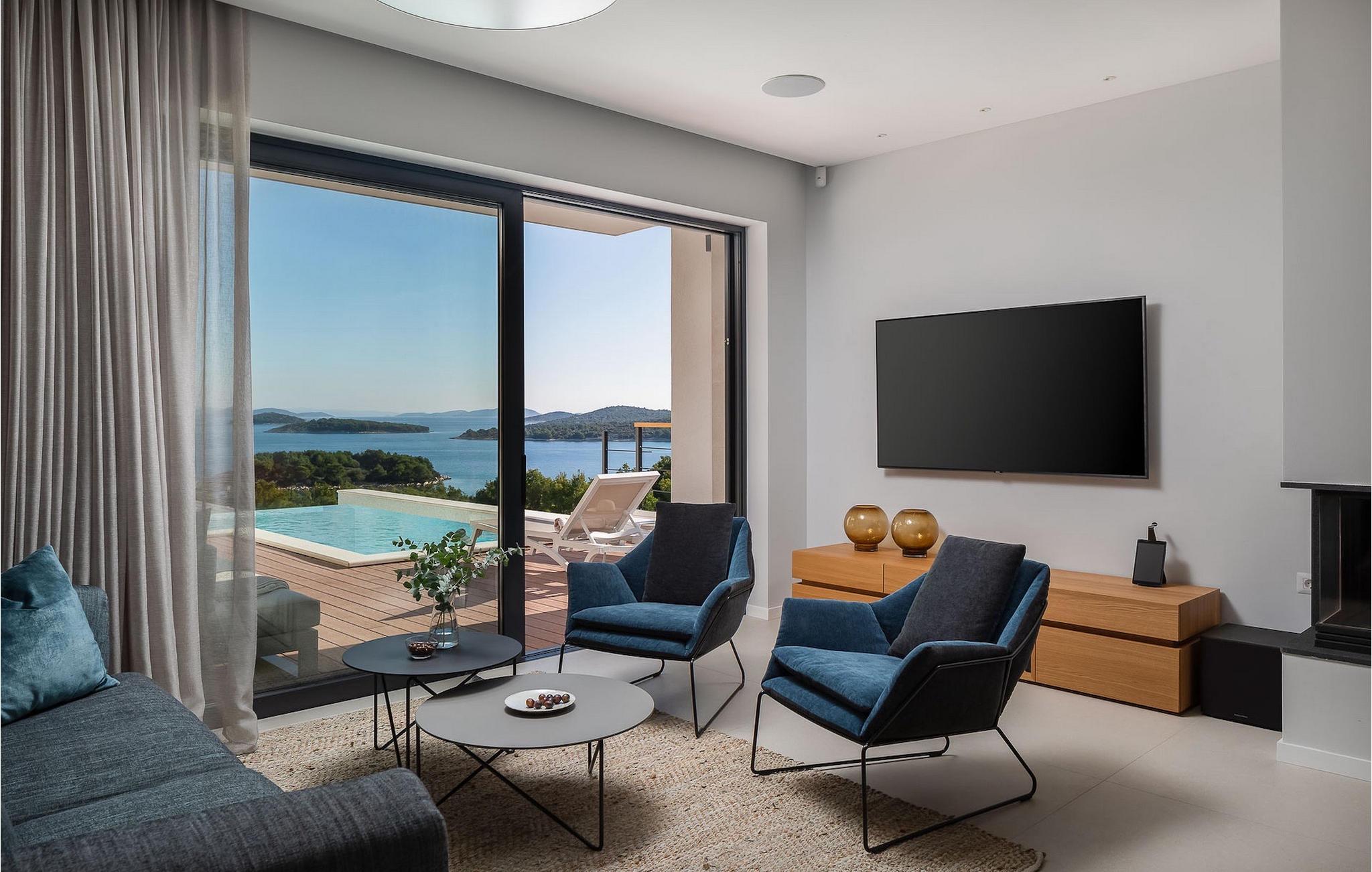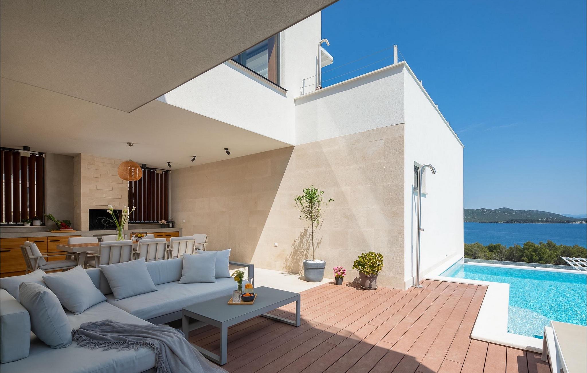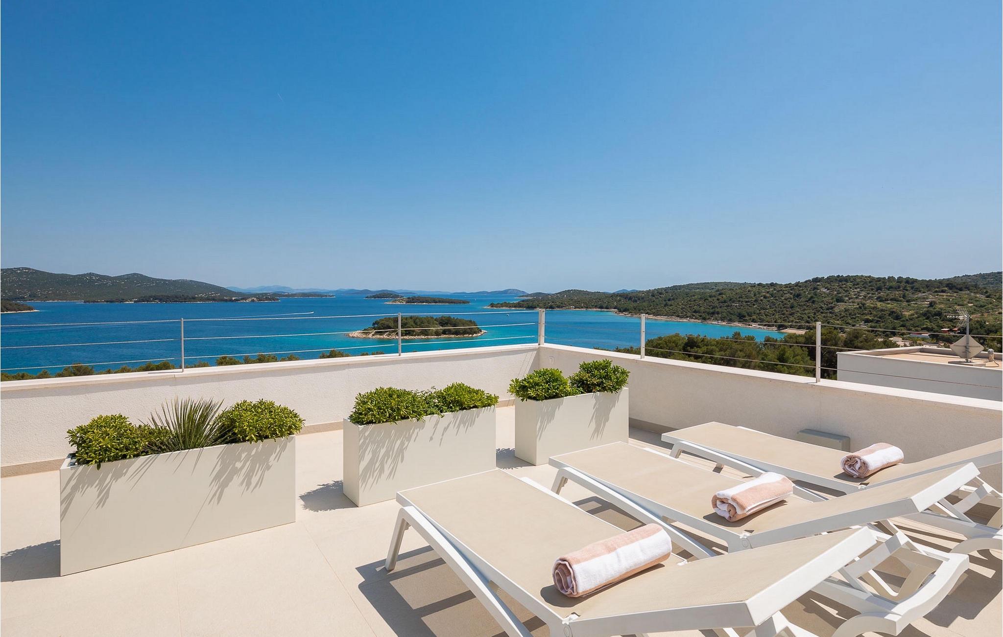 Villa Sara Murter er en luksuriøs og moderne villa til 8 personer, der kombinerer alle charme ved privat indkvartering og bekvemmelighederne ved at bo på et hotel. I stueetagen kan du nyde den private swimmingpool med hydromassage og en iøjnefaldende havudsigt. Efter afkøling kan du solbade på liggestolene eller hvile på havemøblerne. Om dagen eller om aftenen er terrassen ved poolen med et stort spisebord perfekt til at nyde fælles måltider, som du kan tilberede med det samme i det udstyrede udendørs køkken. Trædetaljer og farveaccenter ledsager denne villas udsmykning, især stueetagens åbne grundplan med stue, køkken og spisestue. Der er direkte udgang fra stuen til den udendørs terrasse. Familier med børn vil også være glade for muligheden for et soveværelse i stueetagen for mere praktisk og komfort. Det er vigtigt at bemærke, at selv tre soveværelser i denne villa har ensuite badeværelser for maksimal komfort under dit ophold, mens et separat badeværelse og 2 yderligere toiletter også er tilgængelige. Denne villa vil glæde dig med sin indretning, fordi der er endnu en smagfuldt indrettet stue med et moderne køkken og en ø perfekt til morgenmad på første sal. Der er også direkte udgang til terrassen med havemøbler, som er ideel til en drink ved solnedgang. De resterende tre soveværelser er placeret på første sal, og to har endda deres altaner. Men det store soveværelse er en særlig fornøjelse med sin unikke indretning, store badekar og betagende udsigt. Der er ingen ende på de særlige funktioner her, fordi du også finder adskillige aktiviteter i kælderen, såsom et spillerum og et fitnesscenter. Og for afslapning på højeste niveau, ligesom at bo på et wellness-hotel, kan du nyde spa-rummet med sauna og jacuzzi. Villa Sara Murter har en nabovilla Konstanca. Selvom de blev bygget som én bygning, udlejes villaerne Sara og Konstanca som to separate villaer. Villa Sara Murter ligger i anden halvdel af samme bygning, på et højere niveau end Villa Konstanca. Begge villaer er helt indhegnet, så gæsternes privatliv er sikret. Hvis du kommer med din familie eller venner som en stor gruppe, er det muligt at booke Villa Sara og Konstanca sammen. Den luksuriøse villa Sara Murter ligger i Jezera på den fantastiske ø Murter, som er en del af Sibenik-øgruppen. Villaen ligger tæt på en promenade, der løber langs kysten fra Jezera til Tisno. Den 2 kilometer lange promenade er ideel til morgenløbeture eller aftenture med en partner. Langs promenaden er der talrige grus- og klippestrande omgivet af fyrreskove. Der er offentlige tennis-, basketball- og fodboldbaner i nærheden for alle, der leder efter en aktiv ferie. Cykler er også tilgængelige til brug, som er ideelle til at udforske det omkringliggende område. Vi anbefaler at leje en båd fra den nærliggende lystbådehavn og starte på et uforglemmeligt familieeventyr for at udforske de andre øer i Sibenik-øgruppen samt de mange skjulte bugter og strande. Besøg Kornati National Park, som består af en gruppe øer omgivet af uberørt natur og krystalklart hav, samt Krka National Park, som er hjemsted for flere vandfald. En tur til Sibenik, kendt for sin katedral og talrige fæstninger, der giver en unik udsigt over byen, er uden tvivl mindeværdig. Rejser du med en større gruppe, kan denne ejendom også lejes i kombination med Villa Konstanca.