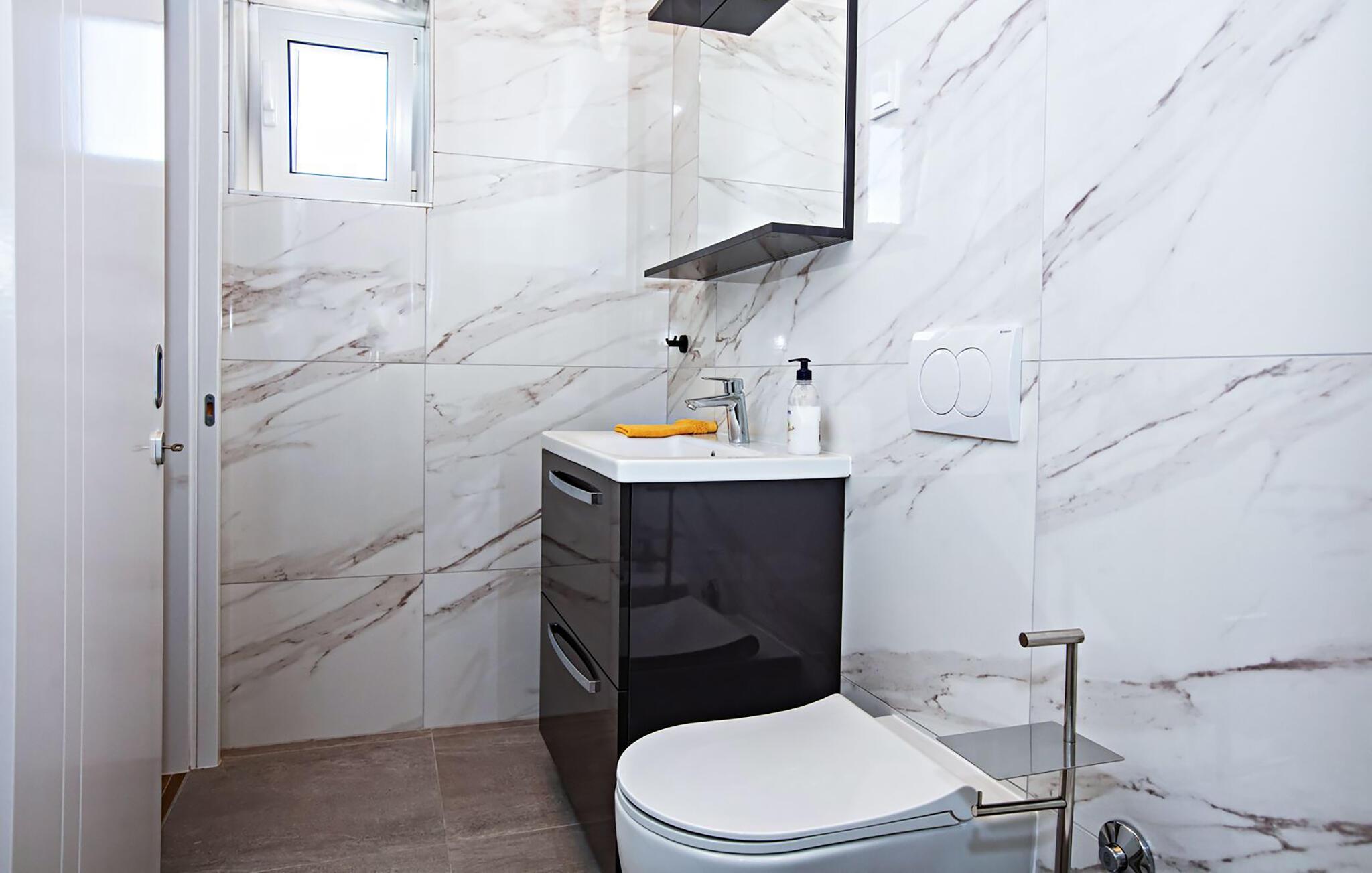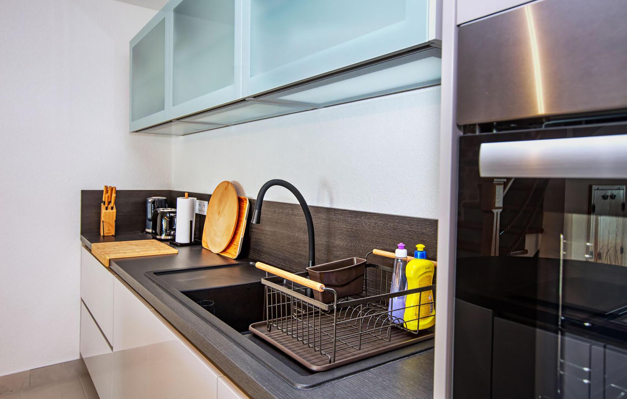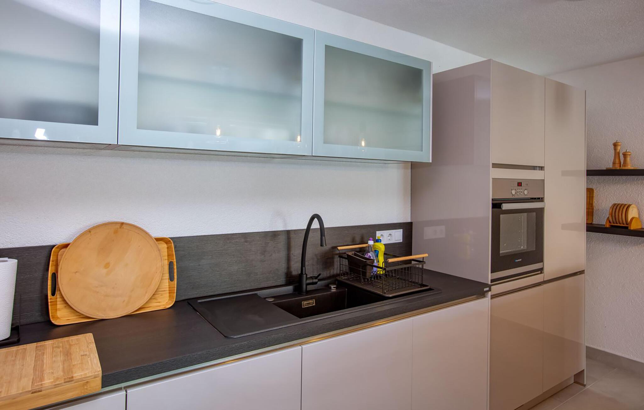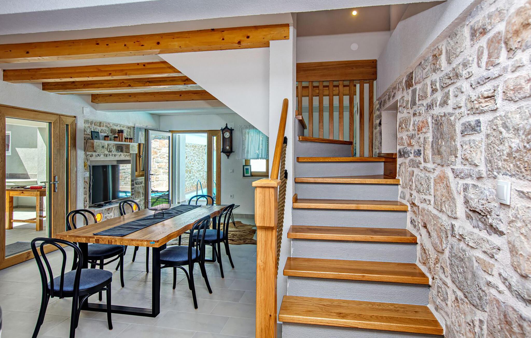 Dette charmerende tilflugtssted tilbyder et indbydende interiør med en smuk blanding af rustik sten og elegant design. Læn jer tilbage i den komfortable stue med en hyggelig sofa og tv eller nyd måltider sammen ved spisebordet med udsigt over poolen. Det moderne køkken er noget særligt, da det har apparater af høj kvalitet og en stilfuld atmosfære - et godt sted til at lave mad sammen og afslutte dagen i en afslappet atmosfære.