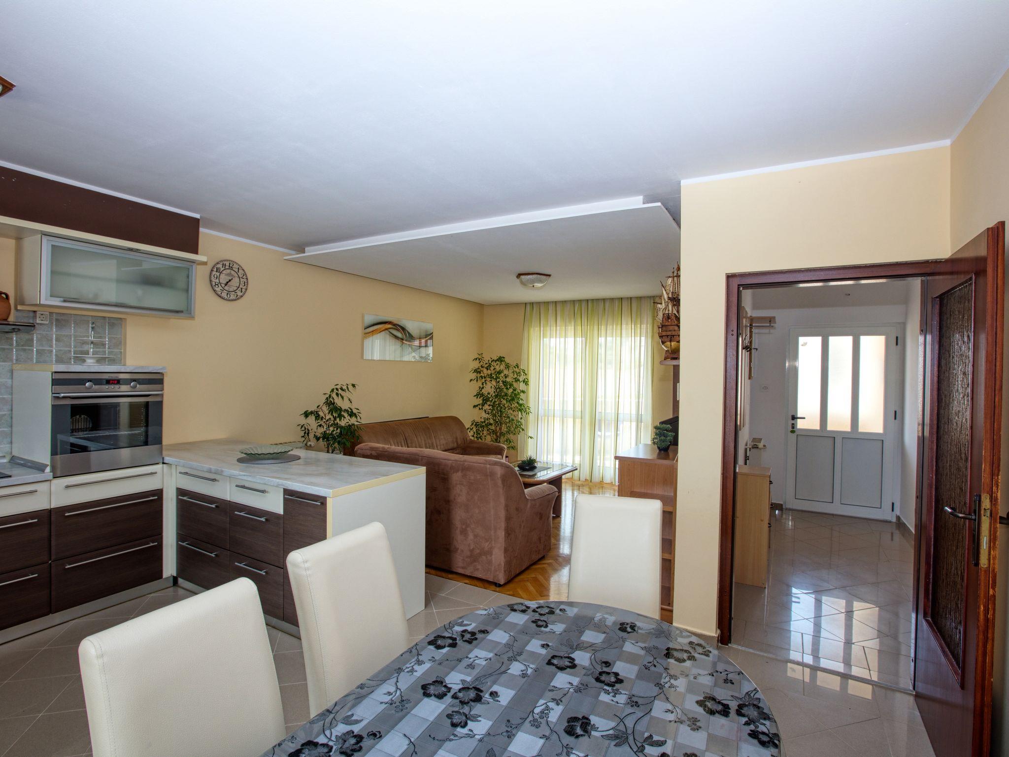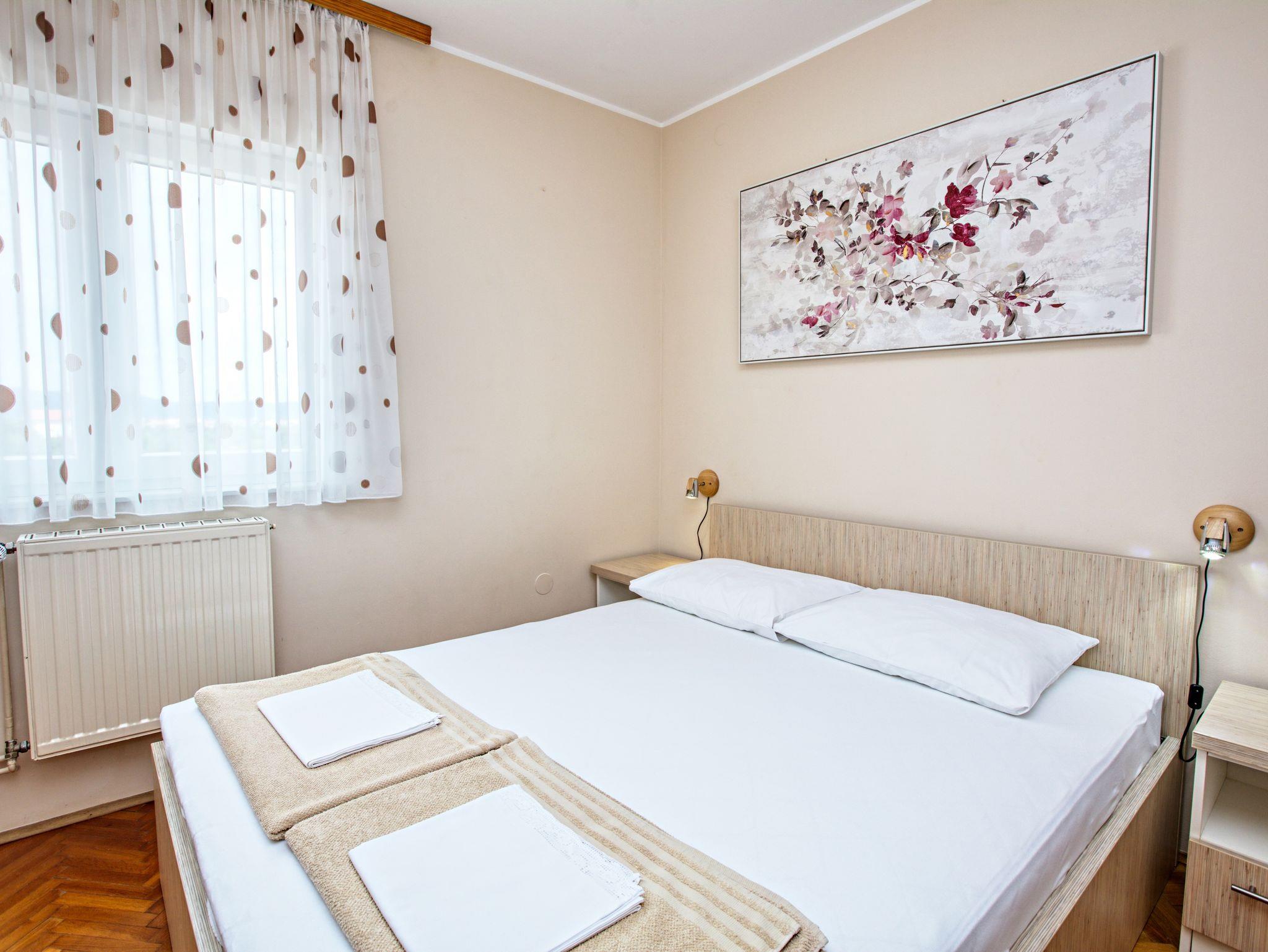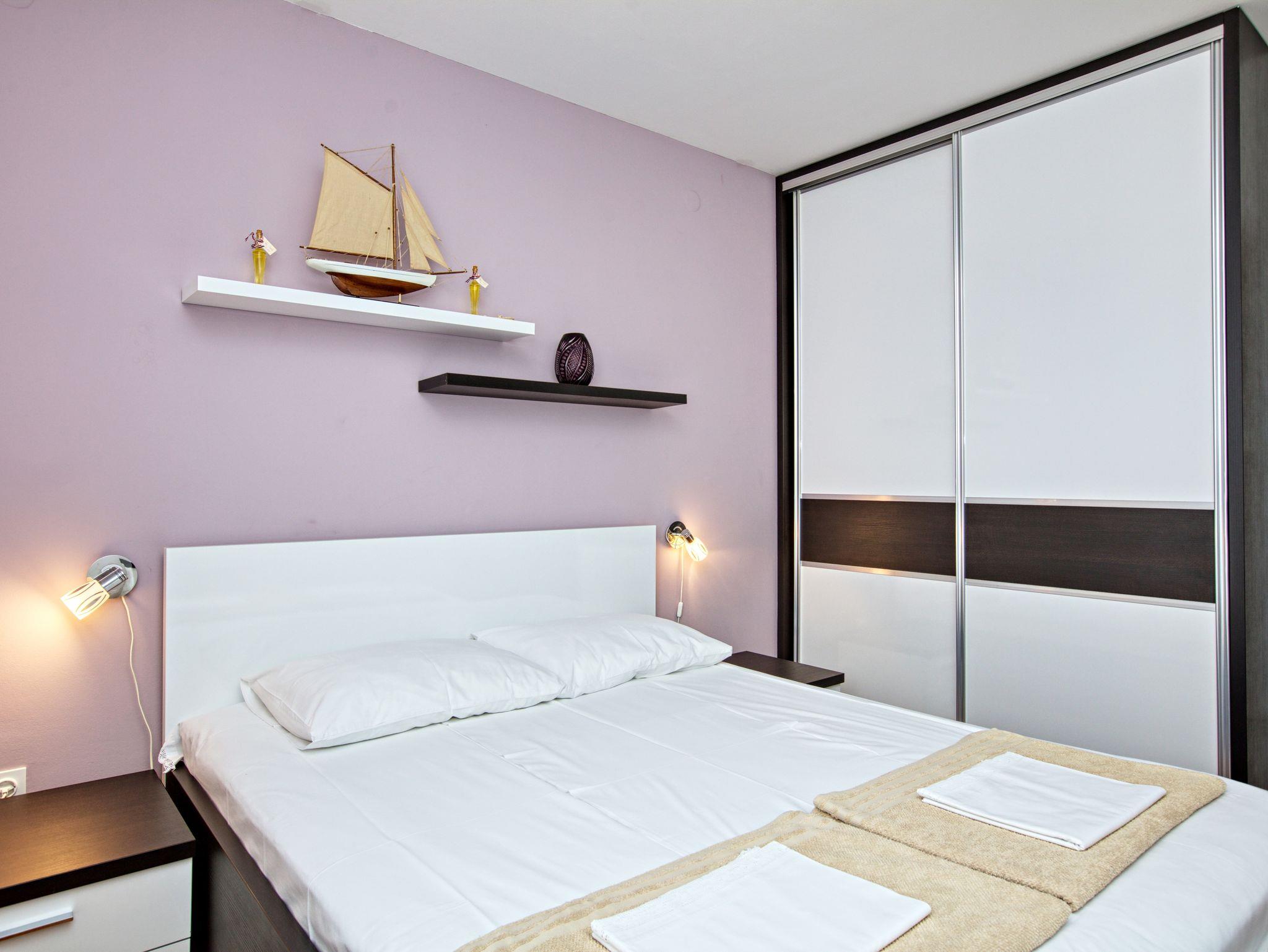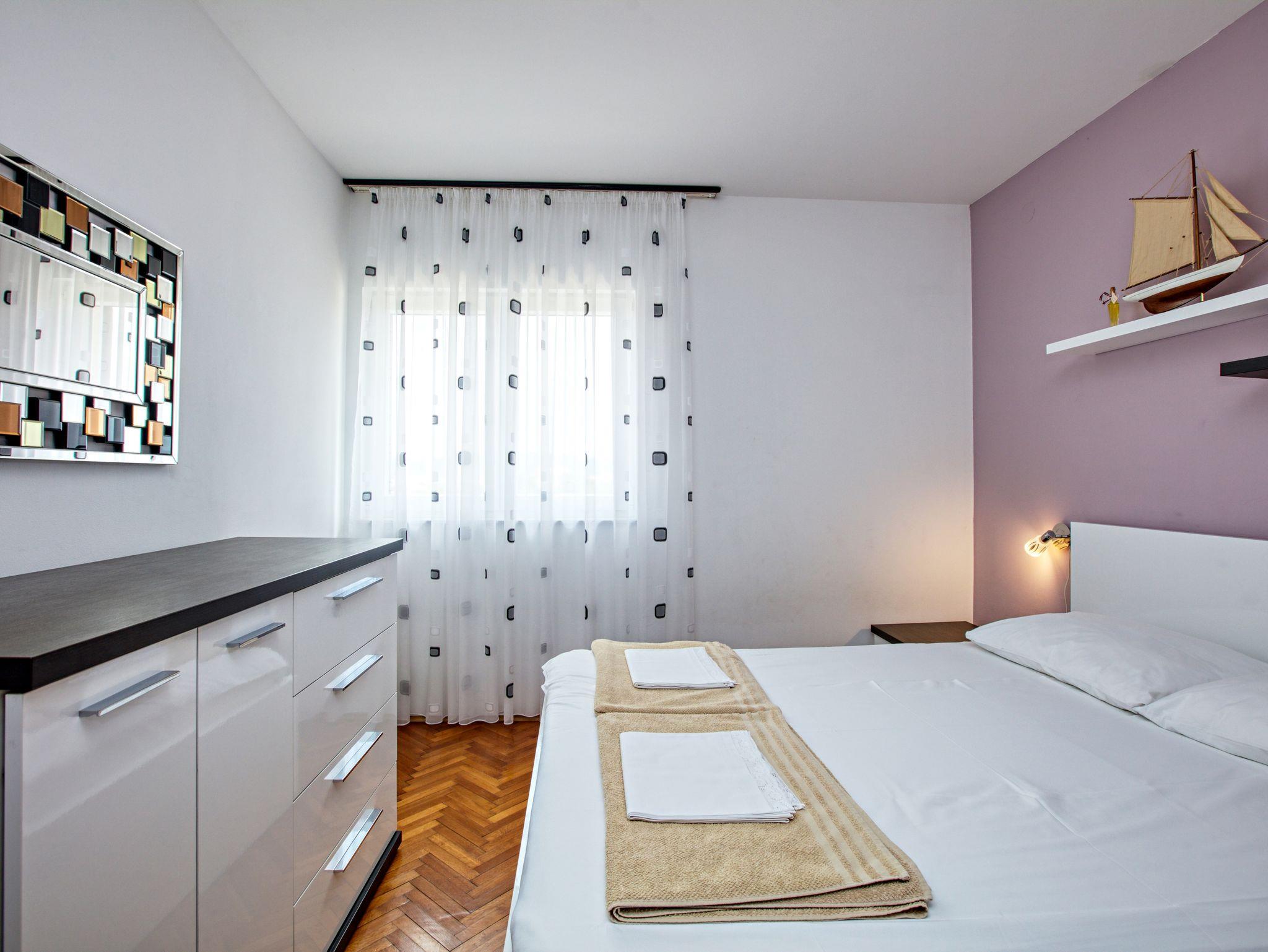 Ferienwohnung bietet Platz für 8 Gäste. Die Betten sind in Schlafzimmern, die es 3 gibt, und in Wohnzimmer, innerhalb einer Gesamtfläche von 78m2, angeordnet. Die Gäste haben eine eigene Terrasse zur Verfügung, auf der sie in warmen Sommernächten genießen können. Das Apartment bietet Meerblick. Es ist erlaubt, Speisen auf dem Gemeinschafts-Grill vorzubereiten. In der Unterkunftseinheit besteht die Möglichkeit des Mitbringens von Haustieren gegen Aufpreis. IM PREIS INBEGRIFFEN: Kurtaxe, Endreinigung, Klimatisierung, Zentralheizung, Parkplatz, Internet, Bügeleisen, Bügelbrett, Föhn. VERBINDLICHE ZUSÄTZLICHE KOSTEN: Aufzahlung für Kurzaufenthalte (prozentualer Zuschlag pro Nächtigungsanzahl: 30% - 1, 20% - 2, 10% - 3). UNVERBINDLICHE ZUSÄTZLICHE KOSTEN: Wäschewaschen (5,00 € Waschen), Haustiere (20,00 € pro Nacht). Die Verfügbarkeit zusätzlicher Dienstleistungen in Ihrem reservierten Termin und die Preise derselben (falls nicht aufgeführt) müssen im Voraus überprüft werden. Zusätzliche Dienstleistungen die in der Zahlungsaufforderung nicht aufgeführt sind werden direkt beim Vermieter bezahlt, angenommen der Gast nutzt auch diese.