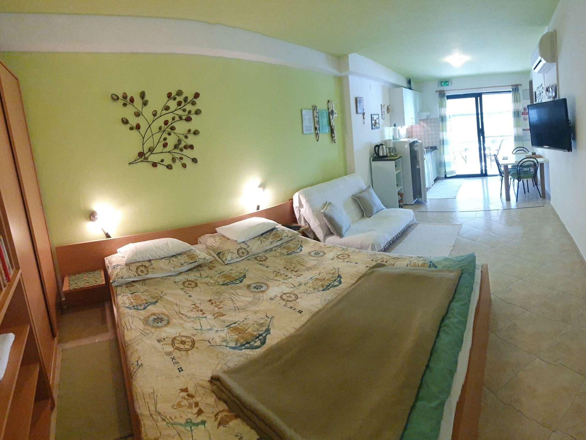 Studio bietet Platz für 3 Gäste. Die Betten sind in Schlafzimmern, die es 1 gibt, und in Wohnzimmer, innerhalb einer Gesamtfläche von 35m2, angeordnet. Die Gäste haben eine eigene Terrasse zur Verfügung, auf der sie in warmen Sommernächten genießen können. Das Studio-Apartment bietet Meerblick. Es ist erlaubt, Speisen auf dem Gemeinschafts-Grill vorzubereiten. IM PREIS INBEGRIFFEN: Kurtaxe, Endreinigung, Klimatisierung, Parkplatz, Internet, Kinderbett, Bügeleisen, Bügelbrett, Föhn, Sonnenschirm. VERBINDLICHE ZUSÄTZLICHE KOSTEN: Aufzahlung für Kurzaufenthalte (prozentualer Zuschlag pro Nächtigungsanzahl: 30% - 1, 20% - 2, 10% - 3). Die Verfügbarkeit zusätzlicher Dienstleistungen in Ihrem reservierten Termin und die Preise derselben (falls nicht aufgeführt) müssen im Voraus überprüft werden. Zusätzliche Dienstleistungen die in der Zahlungsaufforderung nicht aufgeführt sind werden direkt beim Vermieter bezahlt, angenommen der Gast nutzt auch diese.