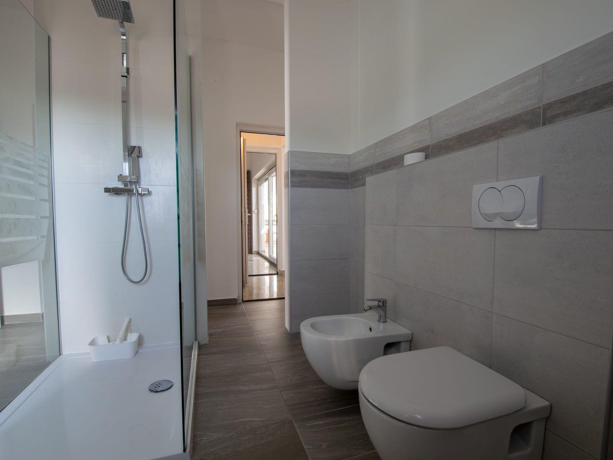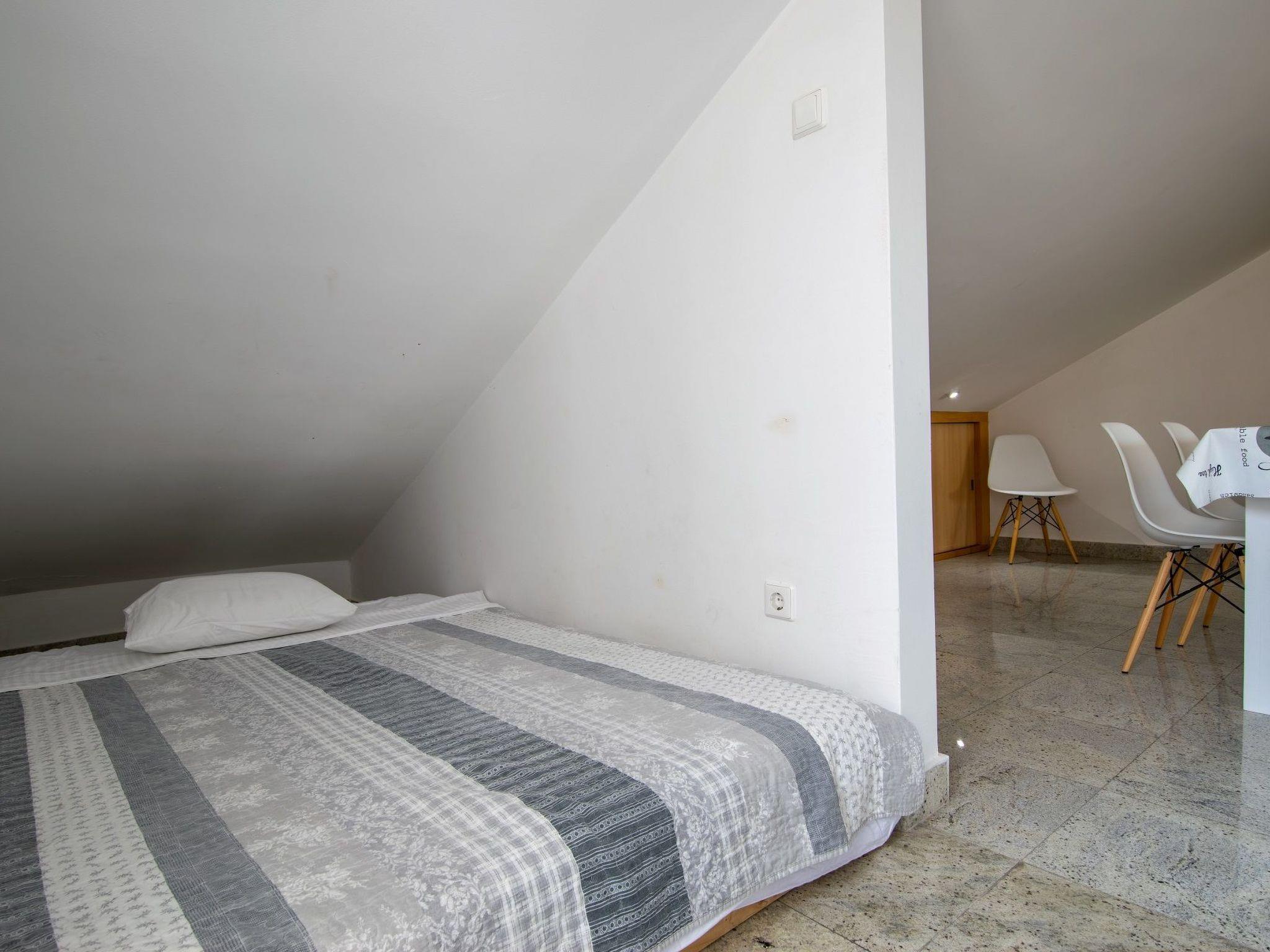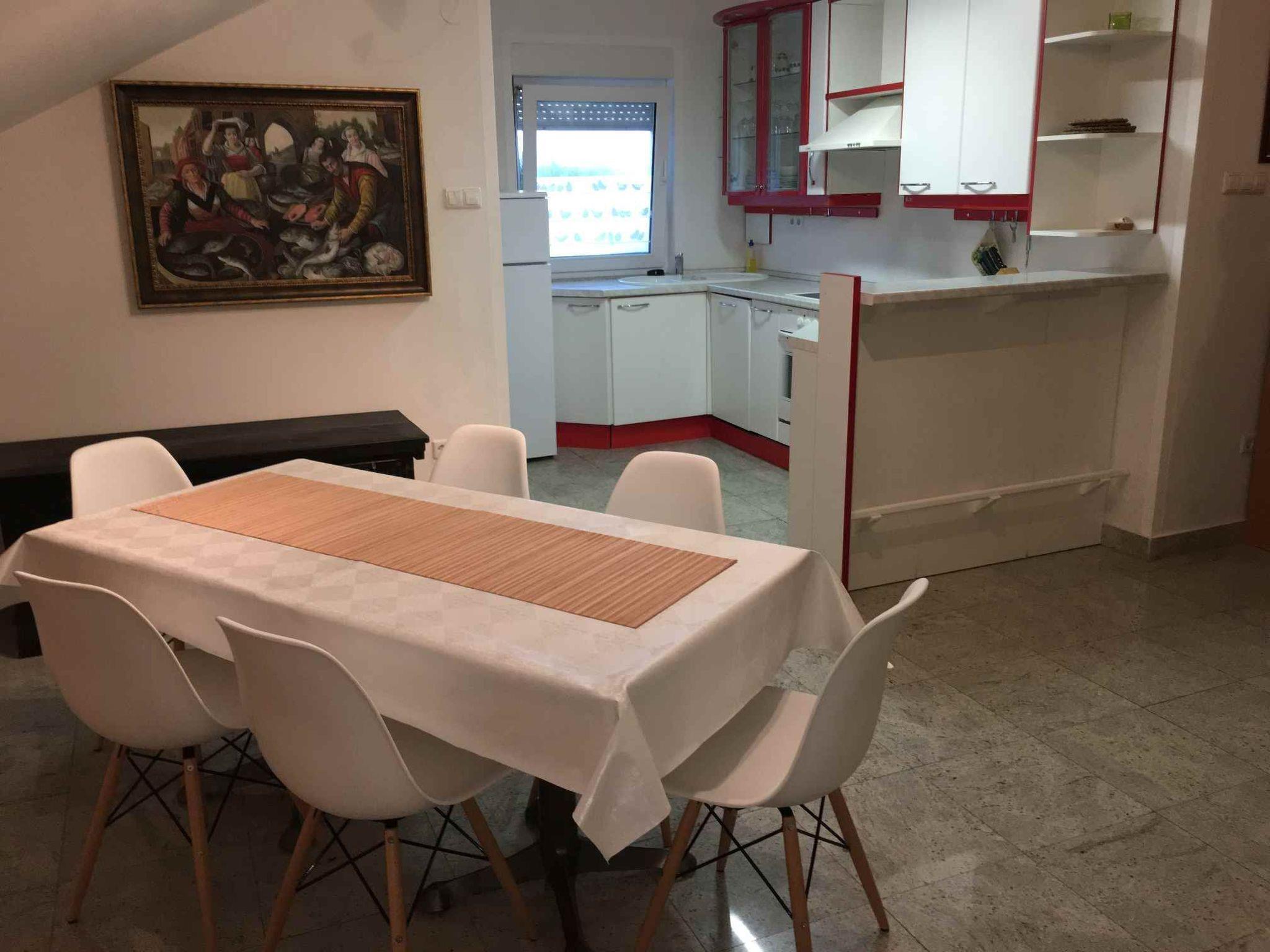 The holiday flat is located on the top floor of the three-storey house. It offers a large living and dining area with two extra beds, a fully equipped kitchen, two large bedrooms with king-size beds, a bathroom with shower/WC, an additional WC, a TV and air conditioning. Towels for the flat are included. There is also free WiFi internet access.