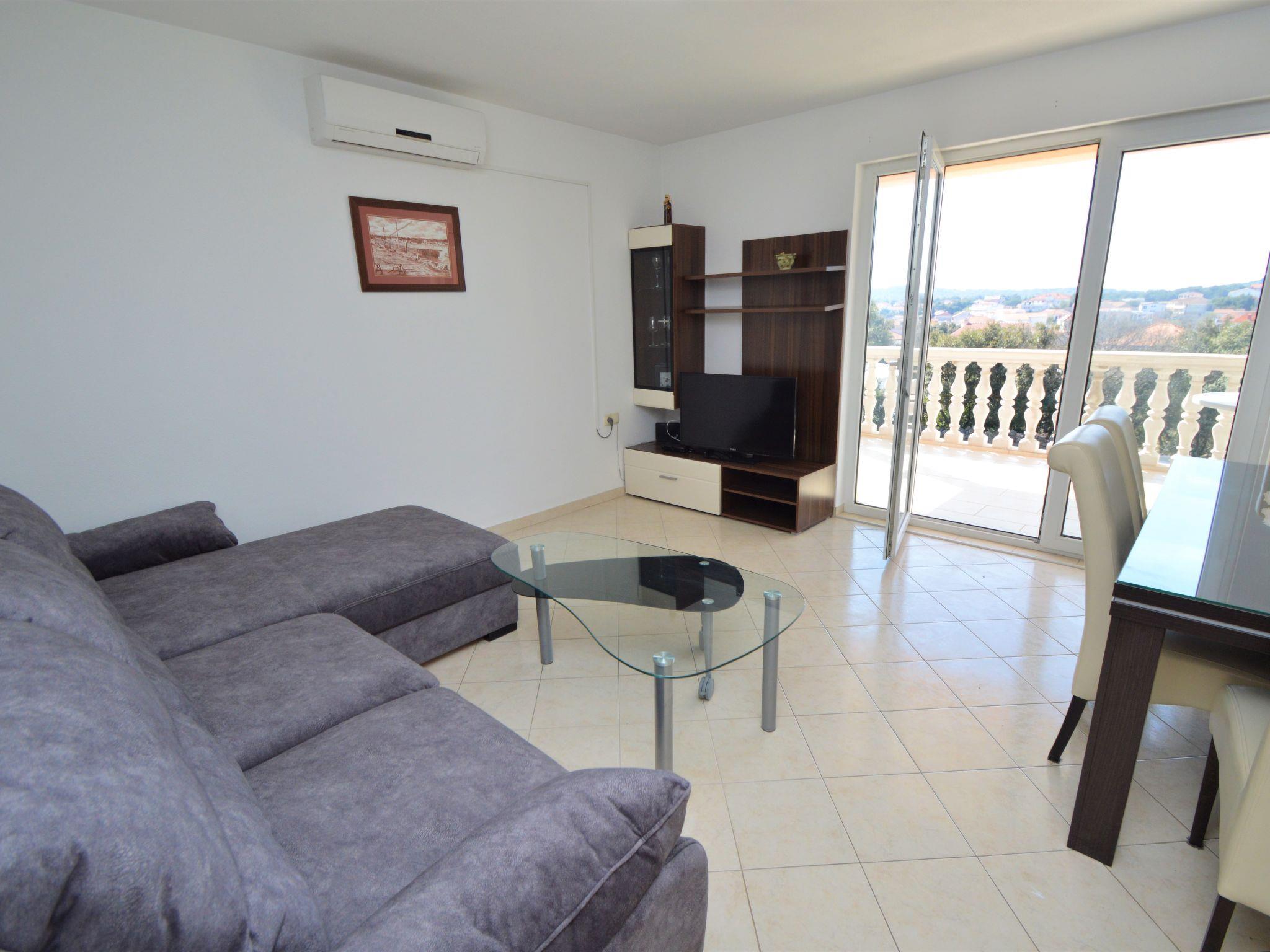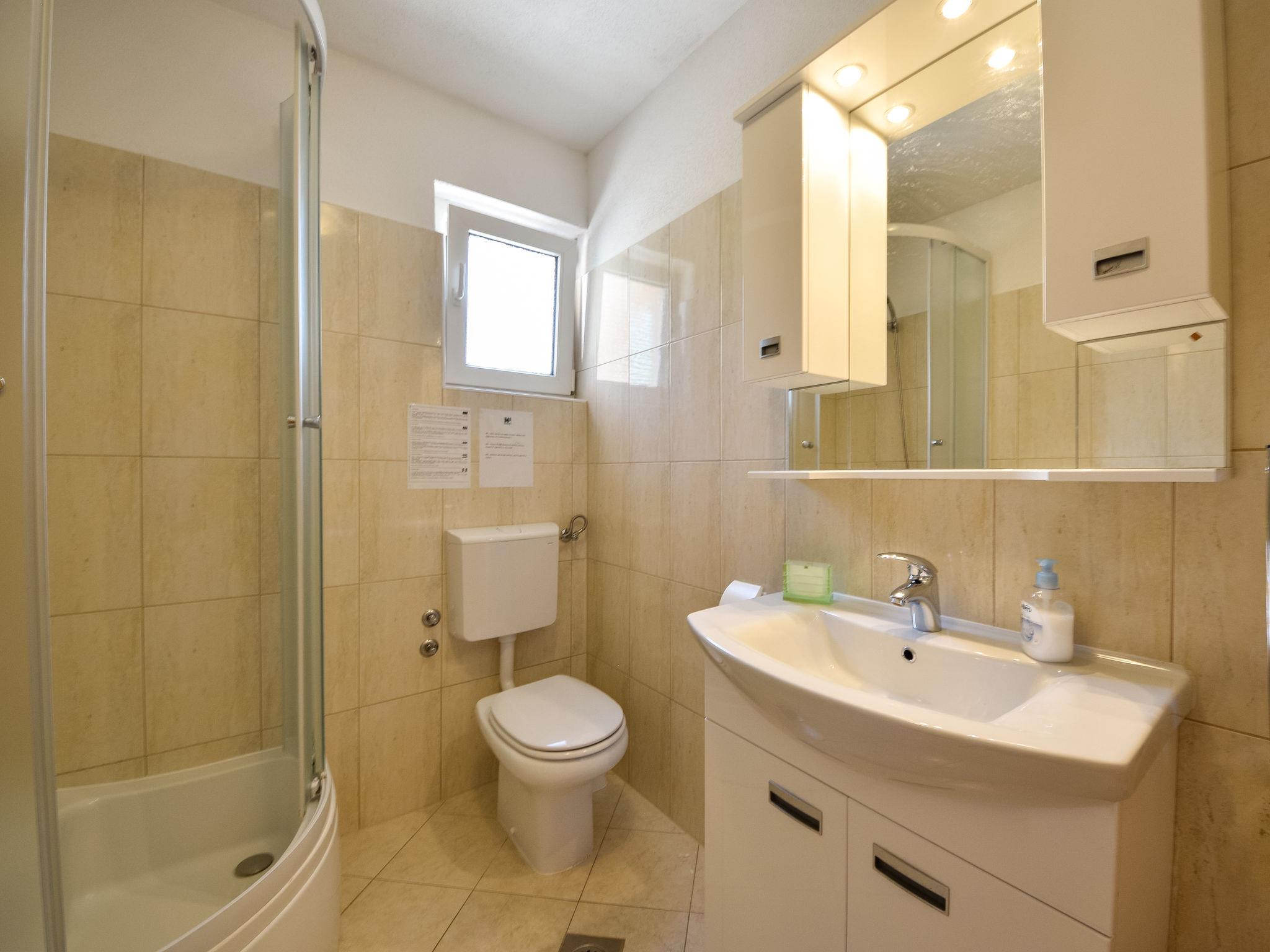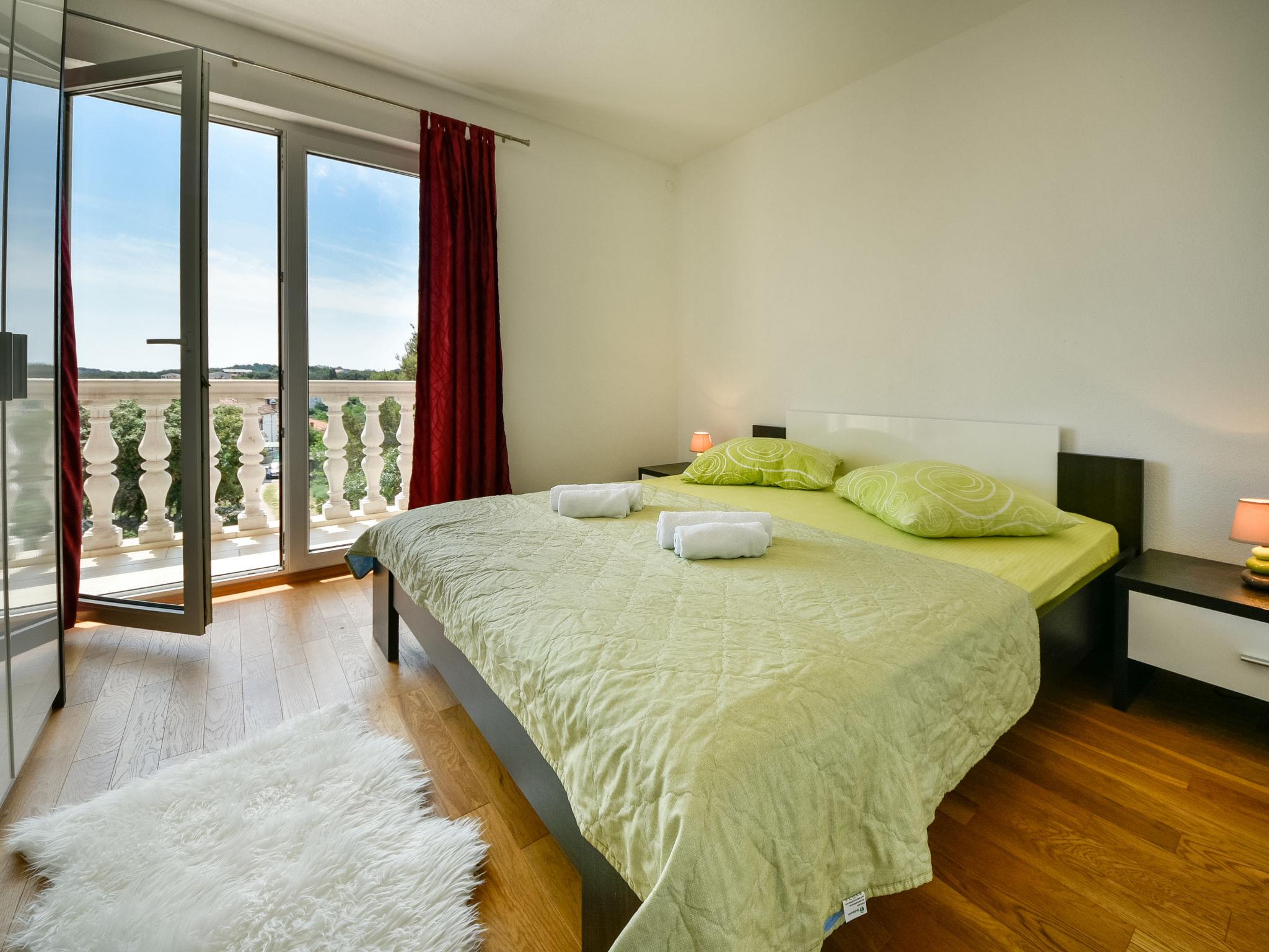 4-room apartment 95 m2 on 2nd floor, south-west facing position. Living/dining room 30 m2 with satellite TV (flat screen), air conditioning. Exit to the terrace. 1 room with 1 french bed (180 cm, length 200 cm). Exit to the terrace. 1 room with 1 french bed (160 cm, length 200 cm). 1 room with 1 french bed (180 cm, length 200 cm). Open kitchen (4 hot plates, oven, dishwasher, microwave, freezer, electric coffee machine). Shower/WC, sep. WC. No heating option. Terrace 20 m2, roofed. Terrace furniture. Distant view of the sea. Facilities: Internet (WiFi, free). Please note: non-smoking house.