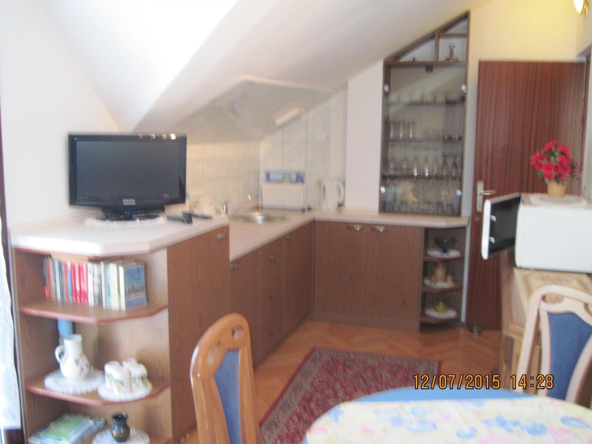 This is a small flat for two adults and one child. The shower, washbasin, WC and bathroom cabinet are located in a separate room. In the living area there is a beautiful fitted kitchen with a two-ring hob, fridge with freezer compartment, microwave and dining table with four chairs. German digital television is available for your entertainment. Naturally, you can also enjoy air conditioning. There are two single beds (1.00 m x 2.00 m) in the bedroom and a sofa bed (1.40 m x 2.00 m) in the living room. Bath and bed linen as well as kitchen towels are provided.