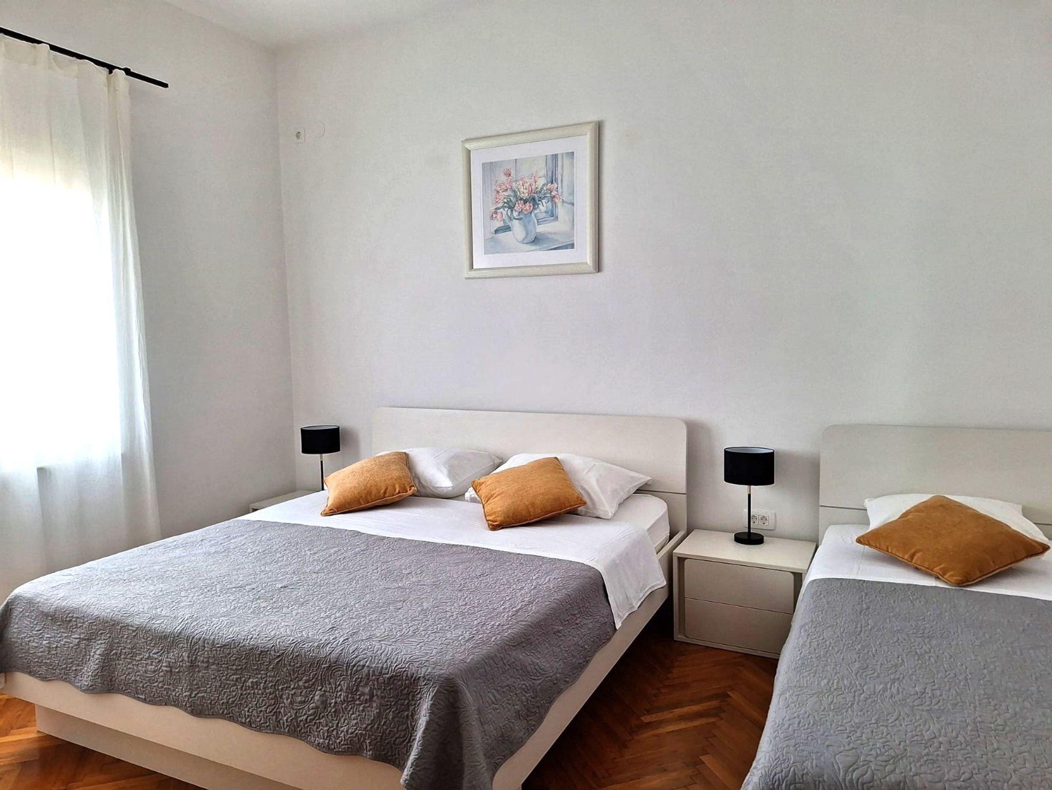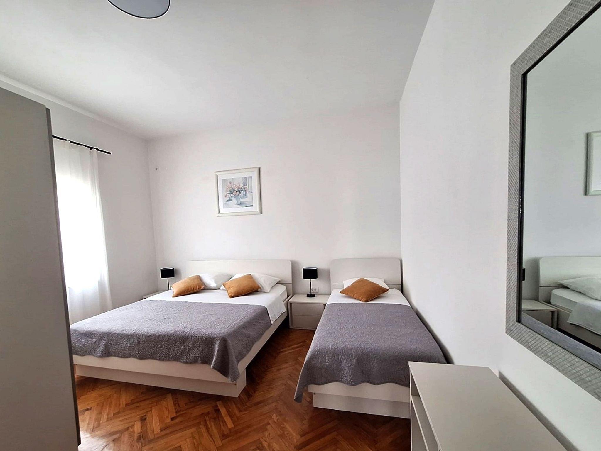Ferienwohnung bietet Platz für 3 Gäste. Die Betten sind in Schlafzimmern, die es 1 gibt, innerhalb einer Gesamtfläche von 41m2, angeordnet. Die Gäste haben einen eigenen Balkon zur Verfügung, auf der sie in warmen Sommernächten genießen können. Das Apartment bietet Meerblick. Es ist erlaubt, Speisen auf dem Gemeinschafts-Grill vorzubereiten. IM PREIS INBEGRIFFEN: Kurtaxe, Endreinigung, Klimatisierung, Parkplatz, Internet, Bootsanlegeplatz, tragbarer Grill. VERBINDLICHE ZUSÄTZLICHE KOSTEN: Aufzahlung für Kurzaufenthalte (prozentualer Zuschlag pro Nächtigungsanzahl: 30% - 1, 20% - 2, 10% - 3). Die Verfügbarkeit zusätzlicher Dienstleistungen in Ihrem reservierten Termin und die Preise derselben (falls nicht aufgeführt) müssen im Voraus überprüft werden. Zusätzliche Dienstleistungen die in der Zahlungsaufforderung nicht aufgeführt sind werden direkt beim Vermieter bezahlt, angenommen der Gast nutzt auch diese.