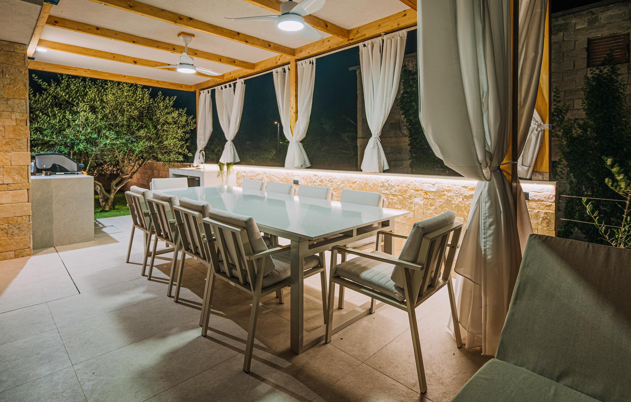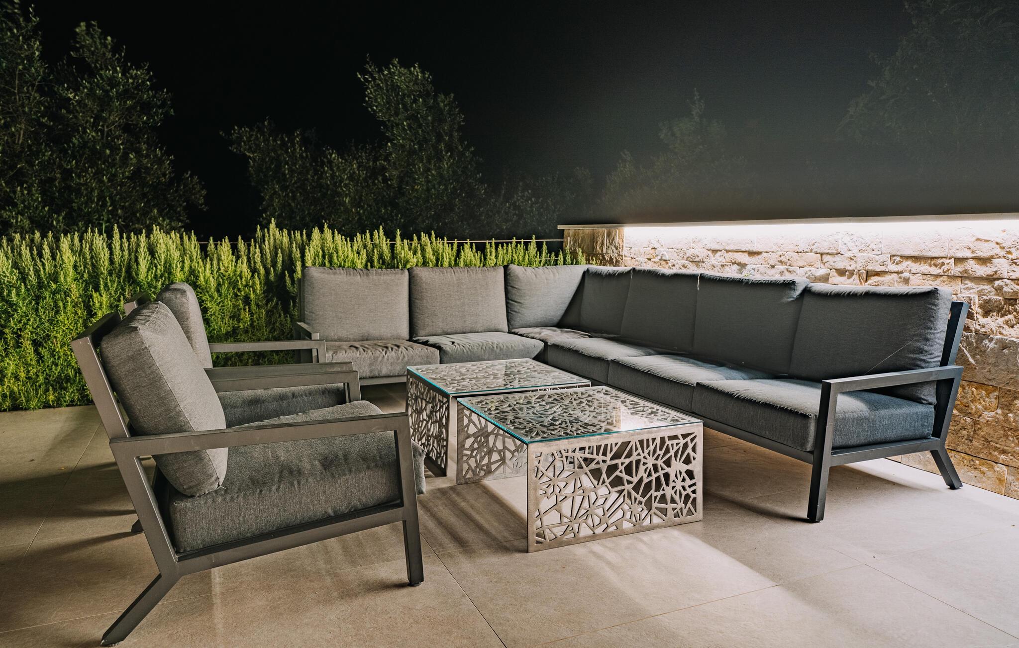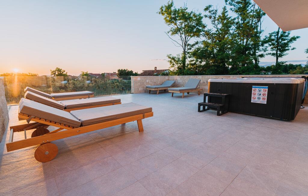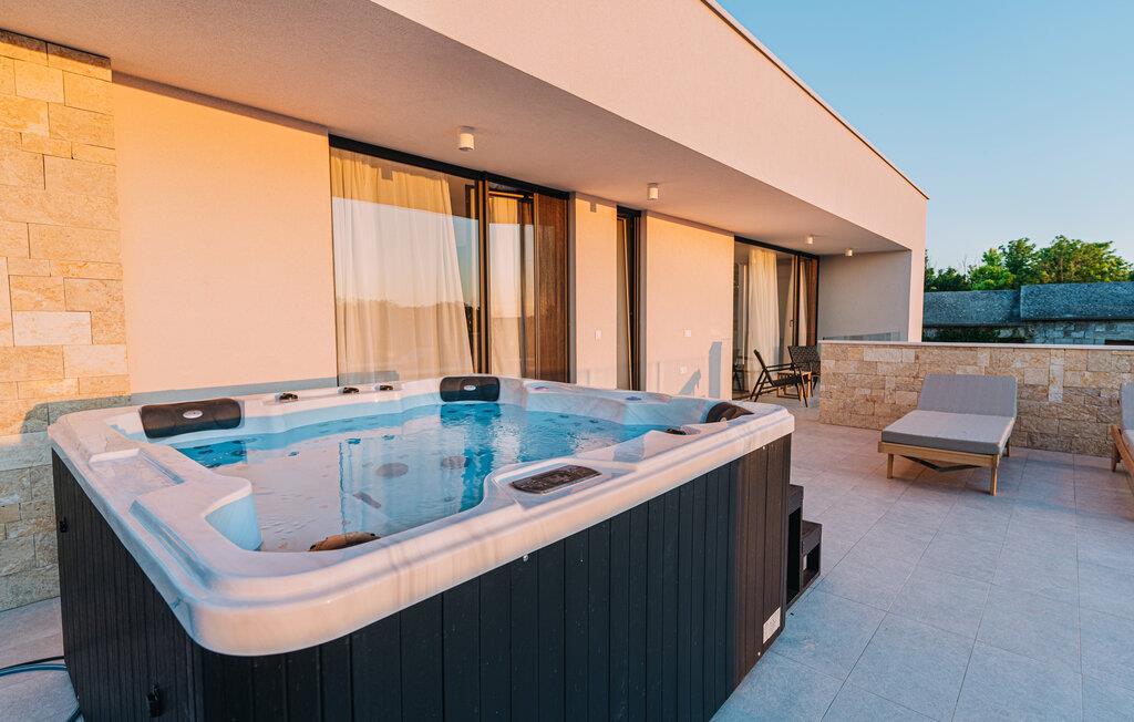 Den imponerende udendørszone er lige så generøs. Tilbring lange dage i solen på de behagelige liggestole, og nyd en forfriskende dukkert i den oplyste pool på varme sommeraftener. Forkæl jer selv ved solnedgang med afslappende øjeblikke i whirlpoolen, og saml jer om et lækkert barbecue-måltid tilberedt på den førsteklasses gasgrill.
