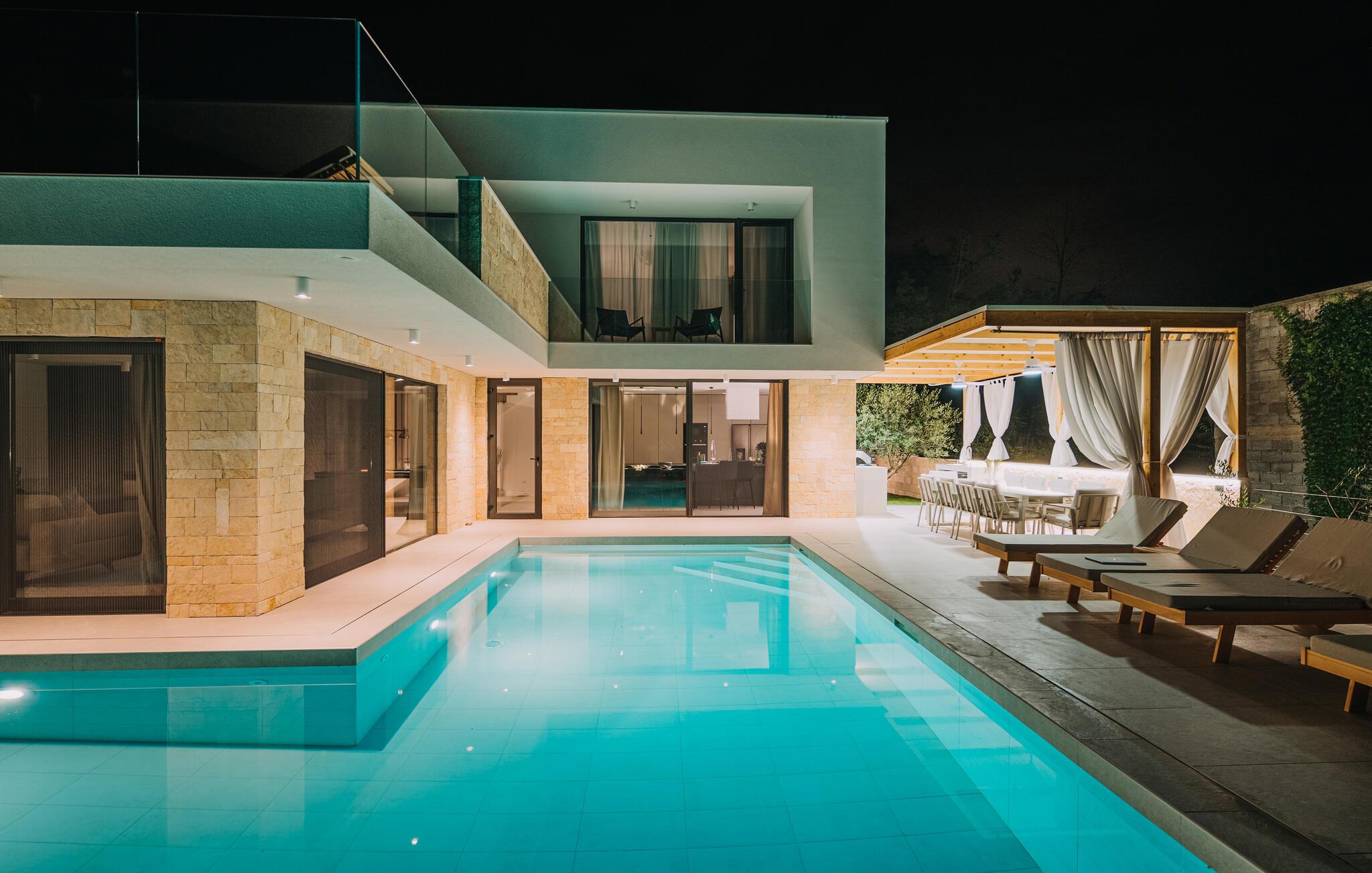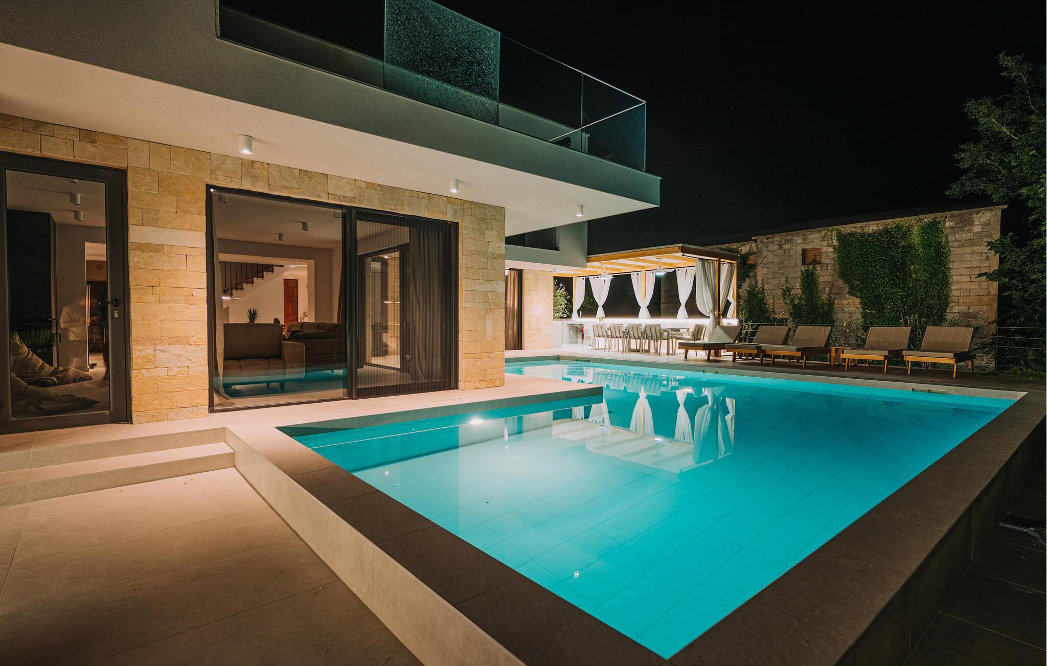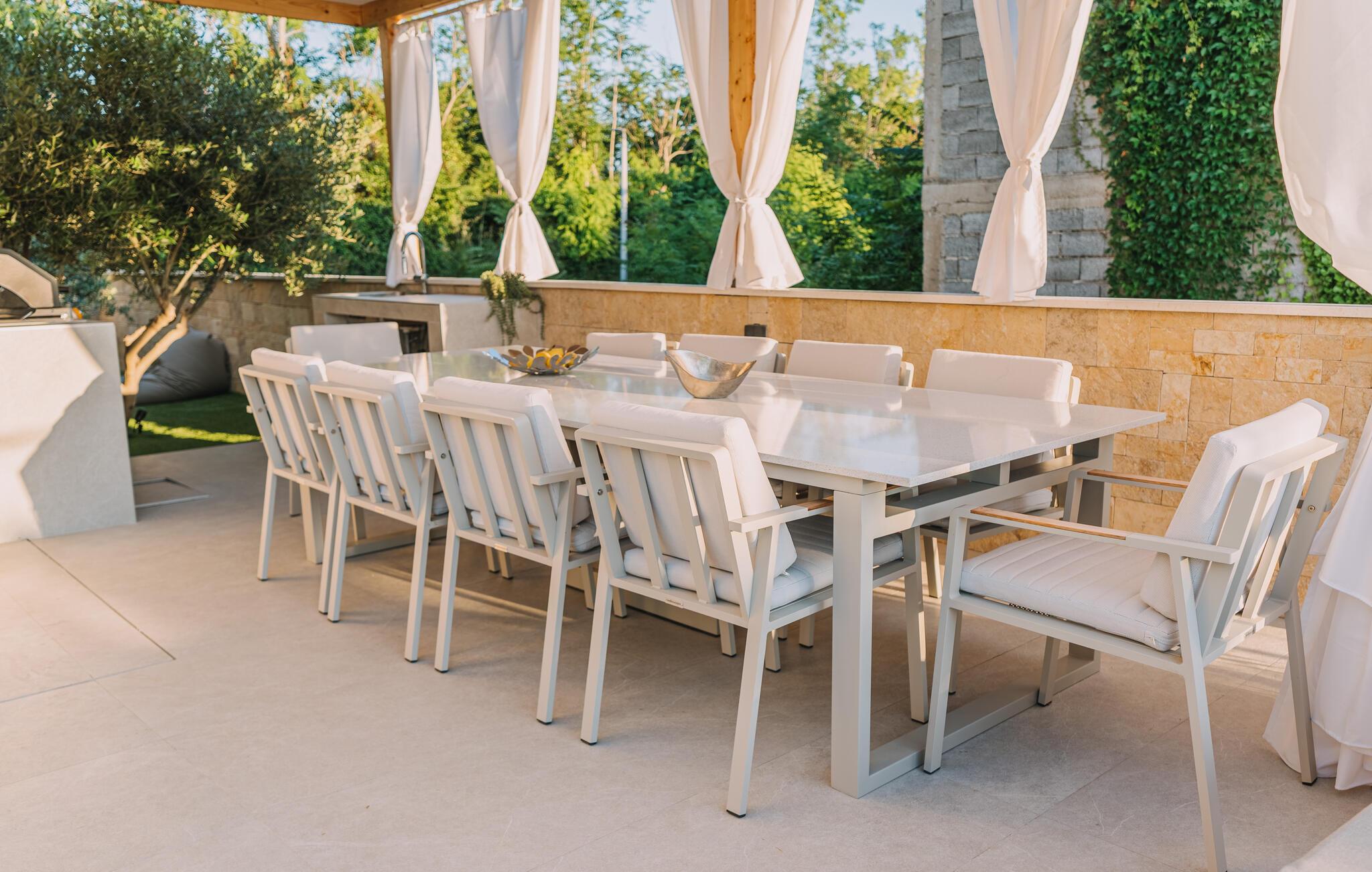 Den imponerende udendørszone er lige så generøs. Tilbring lange dage i solen på de behagelige liggestole, og nyd en forfriskende dukkert i den oplyste pool på varme sommeraftener. Forkæl jer selv ved solnedgang med afslappende øjeblikke i whirlpoolen, og saml jer om et lækkert barbecue-måltid tilberedt på den førsteklasses gasgrill.