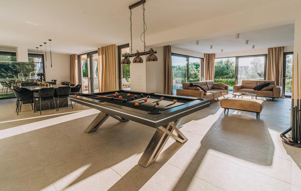 Glæd jer til masser af plads, en smagfuld topmoderne indretning og et væld af ekstra faciliteter i denne eksklusive bolig. Træd ind i den rummelige, moderne køkken og nyd hyggelige madlavningsaftener sammen. Server jeres kulinariske mesterværker ved det stilfuldt belyste spisebord. Udfordr hinanden ved billardbordet, slap af på den komfortable sofagruppe med Smart-TV, Netflix og en designerpejs, og oplev aftener fyldt med hygge.