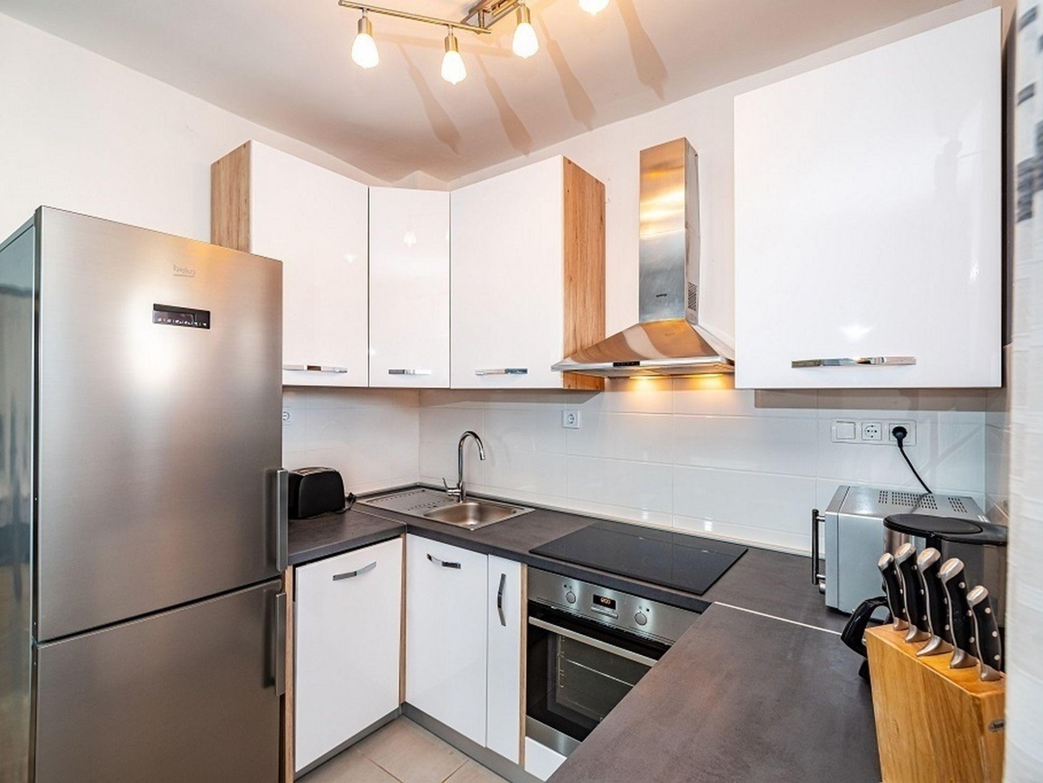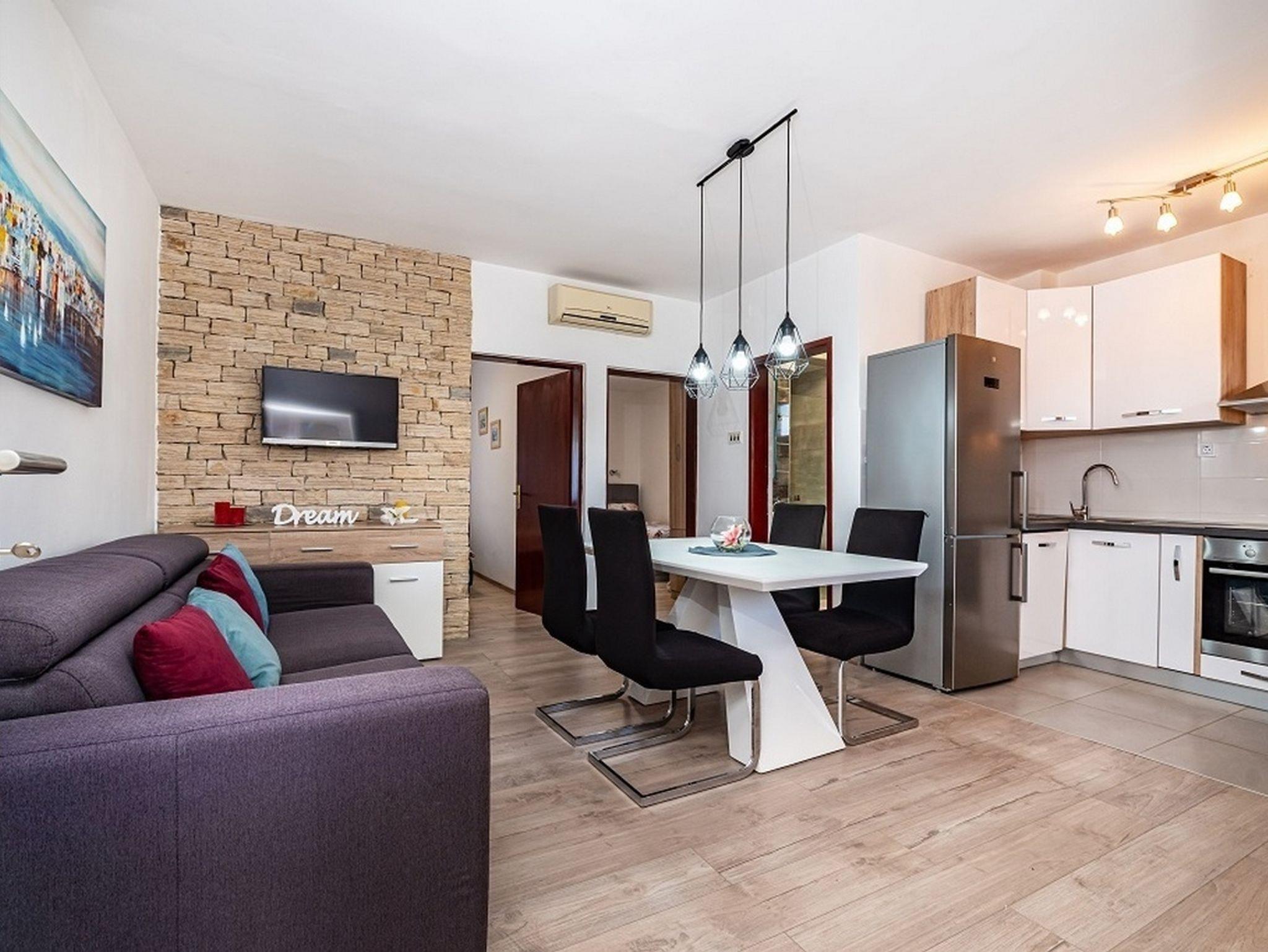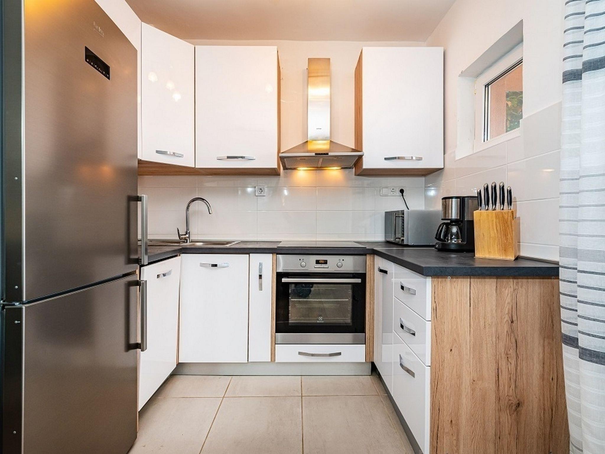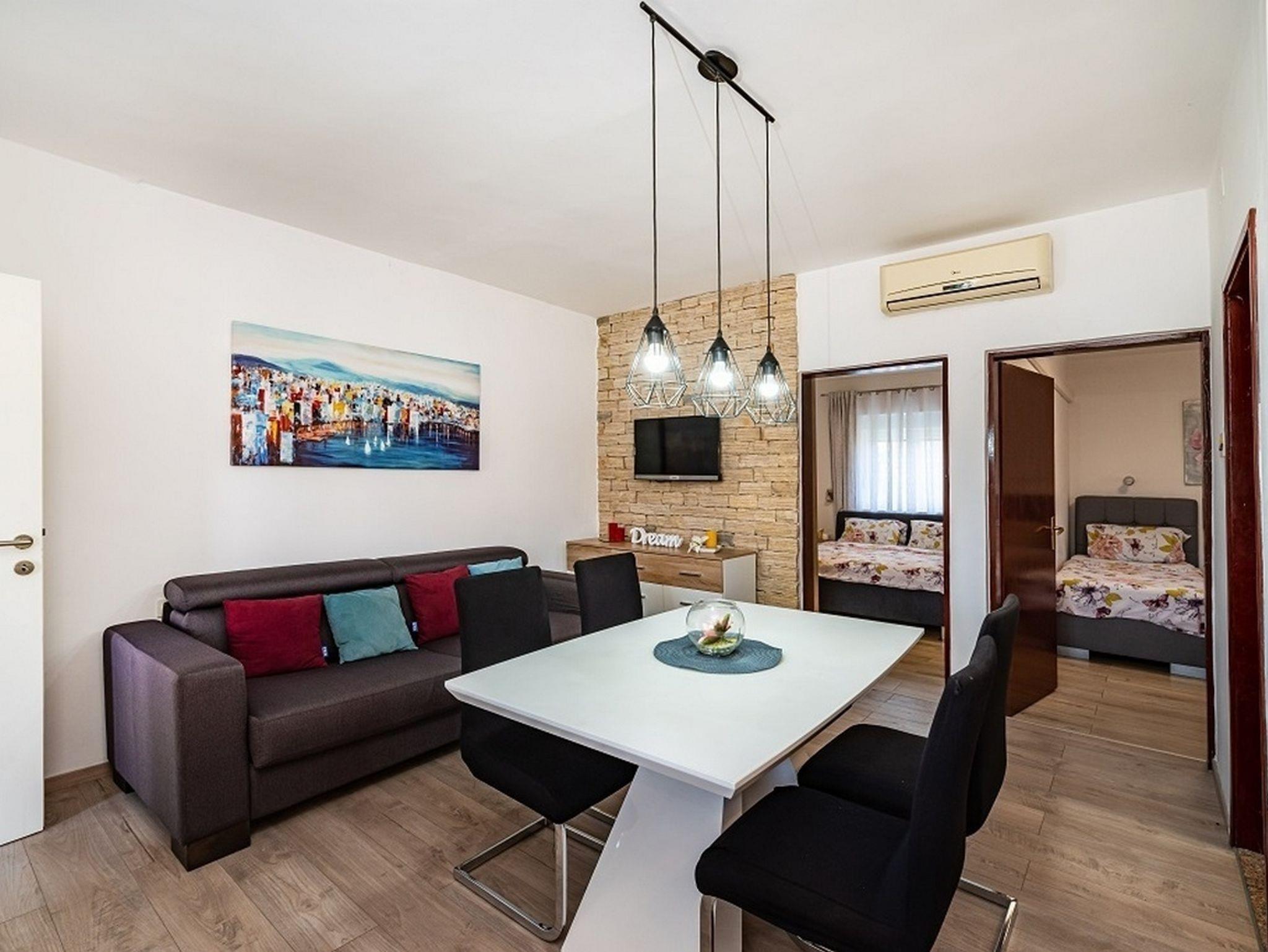 Ferienwohnung bietet Platz für 5 Gäste. Die Betten sind in Schlafzimmern, die es 2 gibt, und in Wohnzimmer, innerhalb einer Gesamtfläche von 41m2, angeordnet. Die Gäste haben eine eigene Terrasse zur Verfügung, auf der sie in warmen Sommernächten genießen können. Es ist erlaubt, Speisen auf dem Gemeinschafts-Grill vorzubereiten. IM PREIS INBEGRIFFEN: Kurtaxe, Endreinigung, Klimatisierung, Parkplatz, Internet, Kinderbett. VERBINDLICHE ZUSÄTZLICHE KOSTEN: Aufzahlung für Kurzaufenthalte (prozentualer Zuschlag pro Nächtigungsanzahl: 30% - 1, 20% - 2, 10% - 3). UNVERBINDLICHE ZUSÄTZLICHE KOSTEN: Wäschewaschen (3,00 € Waschen). Die Verfügbarkeit zusätzlicher Dienstleistungen in Ihrem reservierten Termin und die Preise derselben (falls nicht aufgeführt) müssen im Voraus überprüft werden. Zusätzliche Dienstleistungen die in der Zahlungsaufforderung nicht aufgeführt sind werden direkt beim Vermieter bezahlt, angenommen der Gast nutzt auch diese.