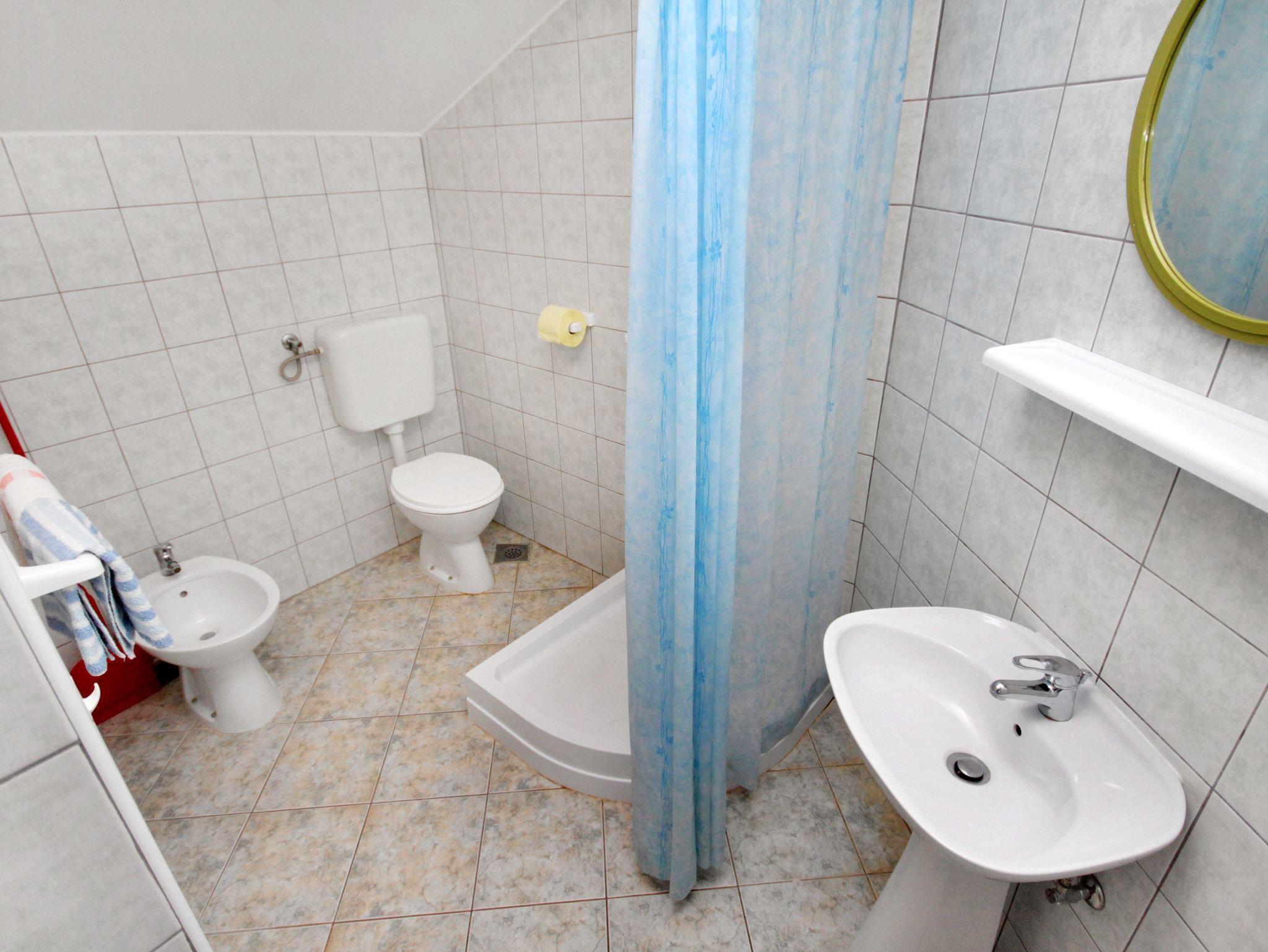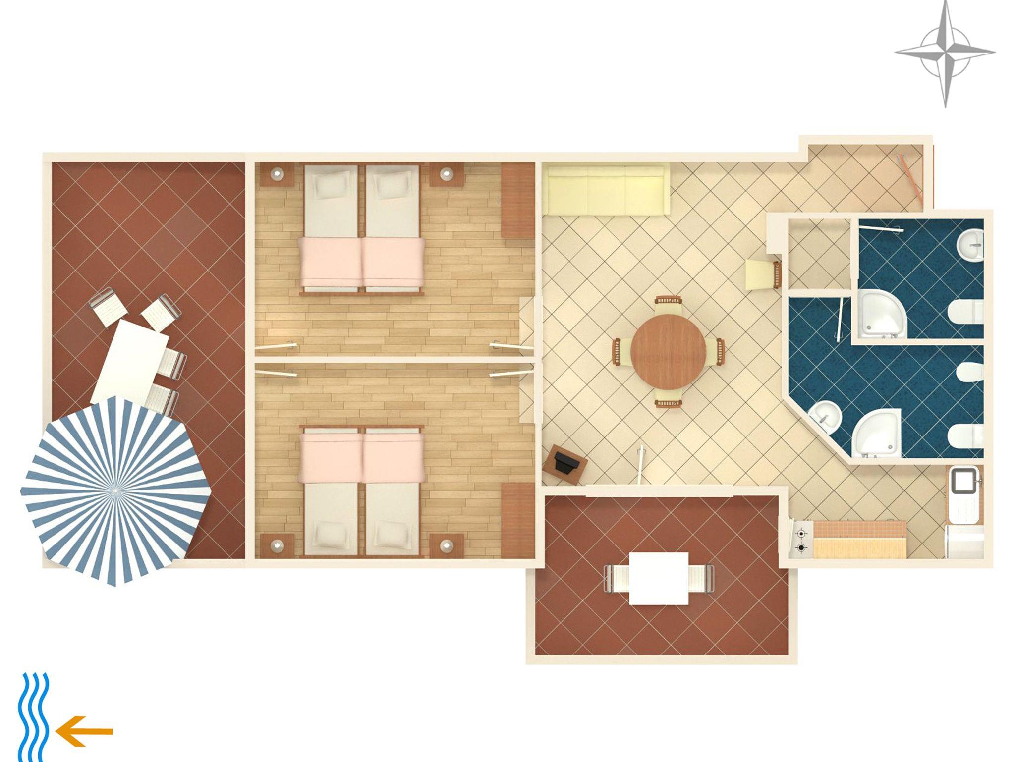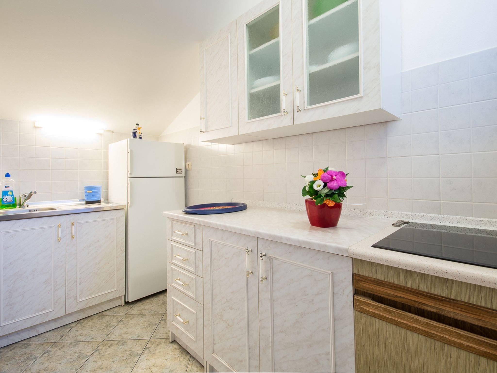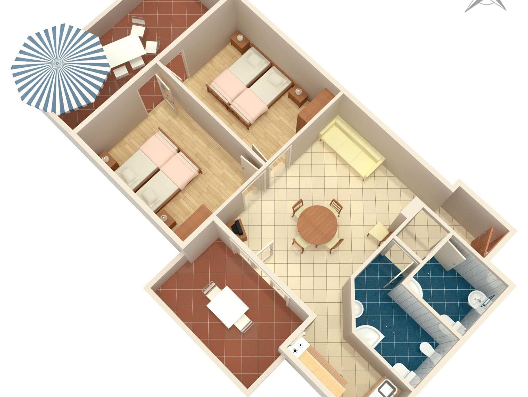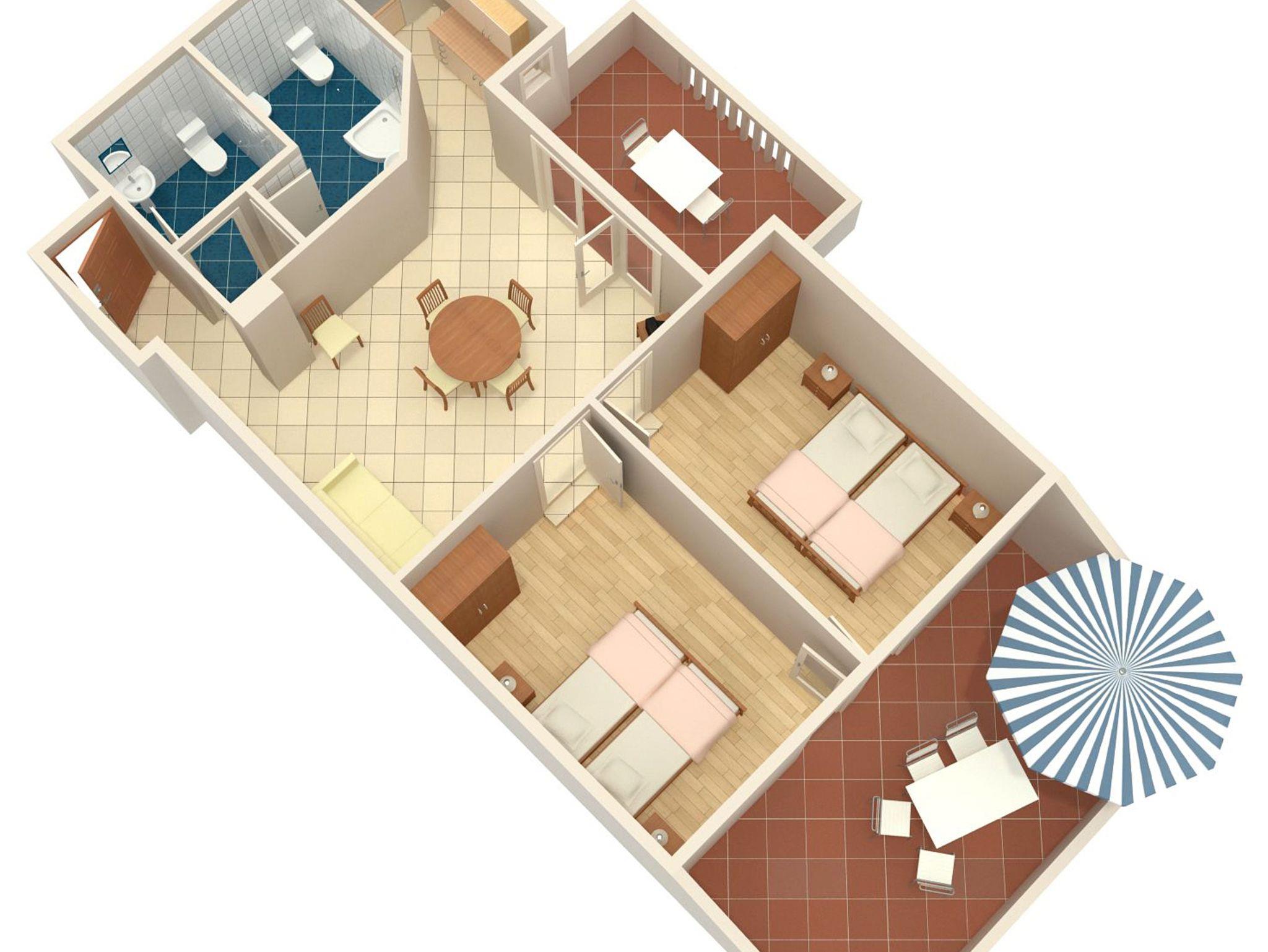 Ferienwohnung bietet Platz für 5 Gäste. Die Betten sind in Schlafzimmern, die es 2 gibt, und in Esszimmer, innerhalb einer Gesamtfläche von 59m2, angeordnet. Die Gäste haben eine eigene Terrasse zur Verfügung, auf der sie in warmen Sommernächten genießen können. Das Apartment bietet Meerblick. Es ist erlaubt, Speisen auf dem Gemeinschafts-Grill vorzubereiten. IM PREIS INBEGRIFFEN: Kurtaxe, Endreinigung, Klimatisierung, Parkplatz, Internet, Kinderbett, Bügeleisen, Föhn. VERBINDLICHE ZUSÄTZLICHE KOSTEN: Aufzahlung für Kurzaufenthalte (prozentualer Zuschlag pro Nächtigungsanzahl: 30% - 1, 20% - 2, 10% - 3). UNVERBINDLICHE ZUSÄTZLICHE KOSTEN: Wäschewaschen (5,00 € Waschen), Zusatzbett (5,00 € pro Nacht). Die Verfügbarkeit zusätzlicher Dienstleistungen in Ihrem reservierten Termin und die Preise derselben (falls nicht aufgeführt) müssen im Voraus überprüft werden. Zusätzliche Dienstleistungen die in der Zahlungsaufforderung nicht aufgeführt sind werden direkt beim Vermieter bezahlt, angenommen der Gast nutzt auch diese. Ermäßigung auf den Grundpreis: Gratistag 14=13 (bei einem Aufenthalt von 14 Tagen oder mehr erhalten Sie einen Gratistag für den Aufenthalt bis 31.12.26).